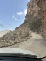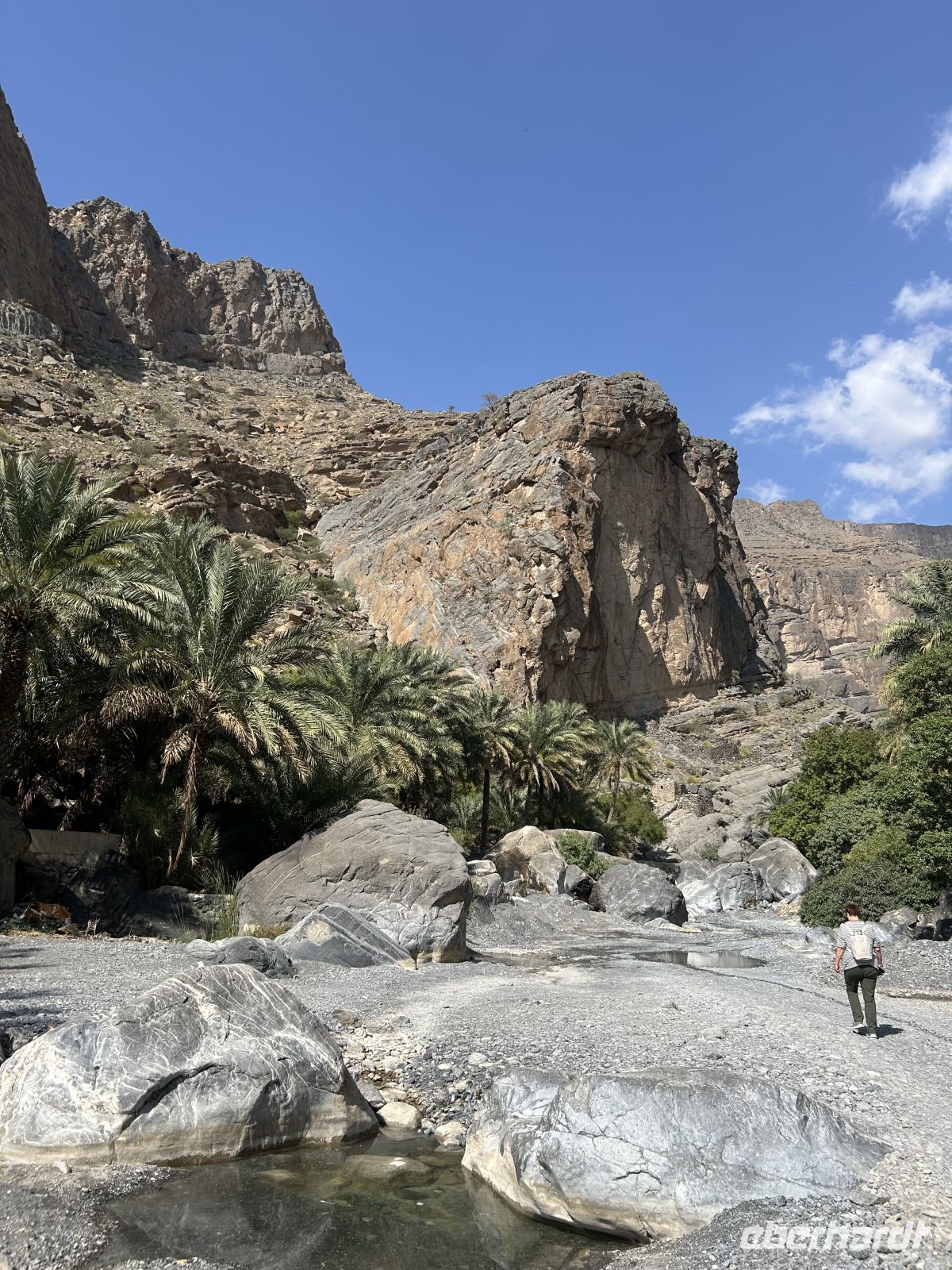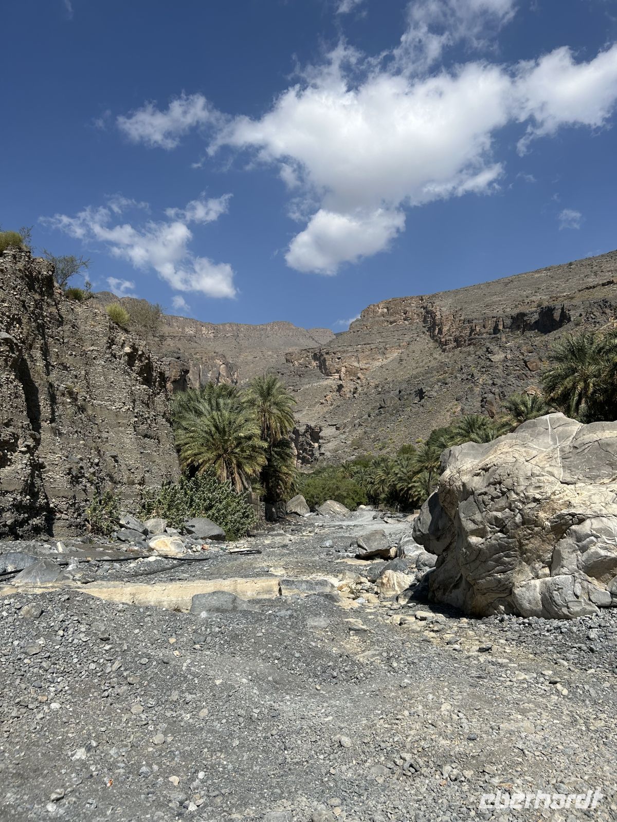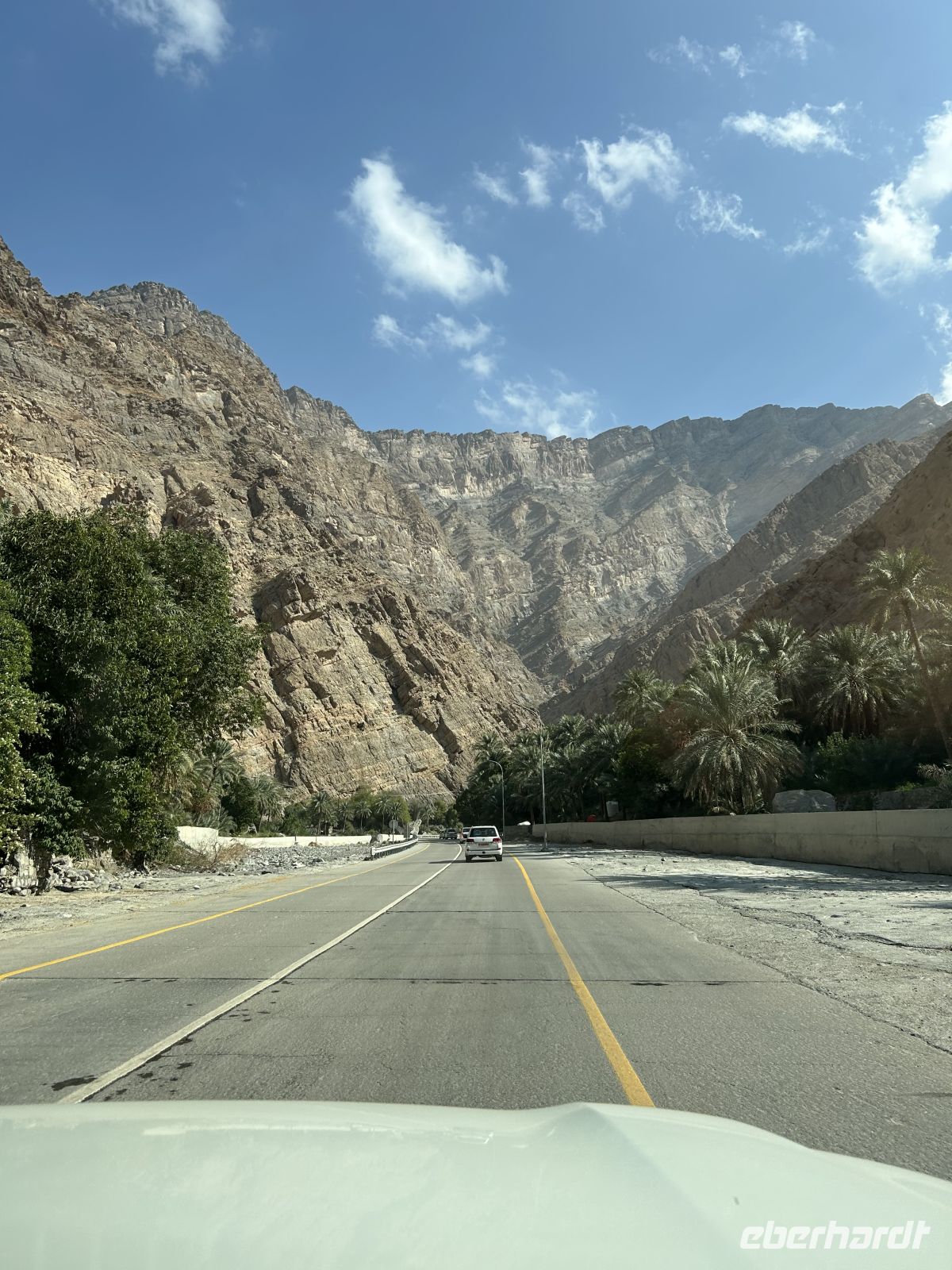 Dann beginnt unser Weg in die Berge. Die Straße wechselt von Asphalt zu Beton – und schließlich zu einer echten Abenteuerpiste. Wir fahren hinein ins spektakuläre Wadi Bani Awf, dessen schroffe Felswände und schmale Passagen uns immer wieder zum Staunen bringen.