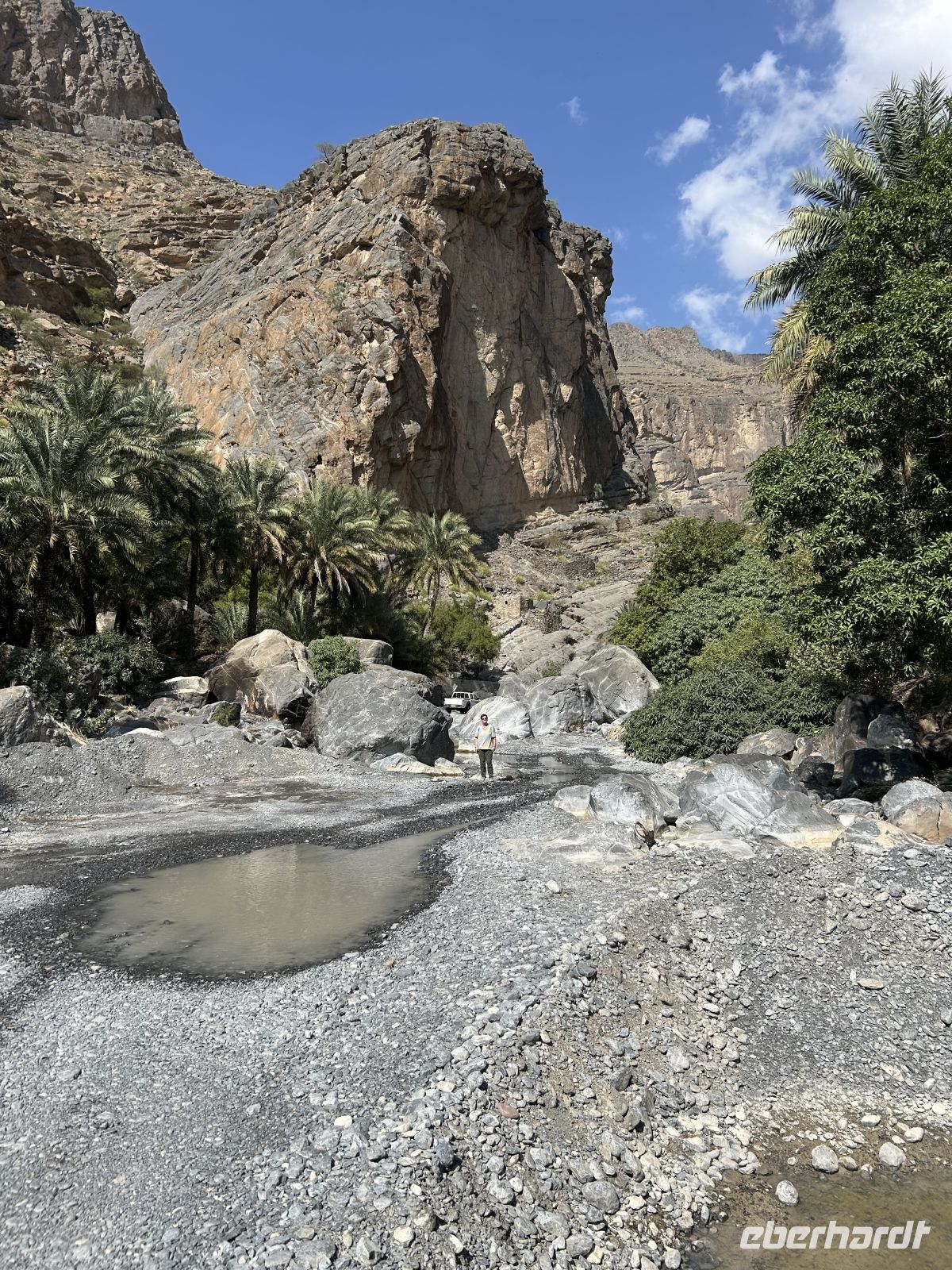 Dann rumpeln wir die Schotterpiste hinunter Richtung Al Hamra. Ein erster Fotostopp eröffnet uns den Blick auf die verlassene Siedlung Ghul, deren alte Lehmhäuser am Eingang des Wadi Nakhr stehen wie stumme Zeugen vergangener Jahrhunderte. Wir fahren ein Stück hinein ins Wadi und spazieren in die Schlucht. Von hier unten wirken die Canyonwände noch mächtiger – ein völlig neuer Blick auf die Dimensionen dieses Naturwunders.