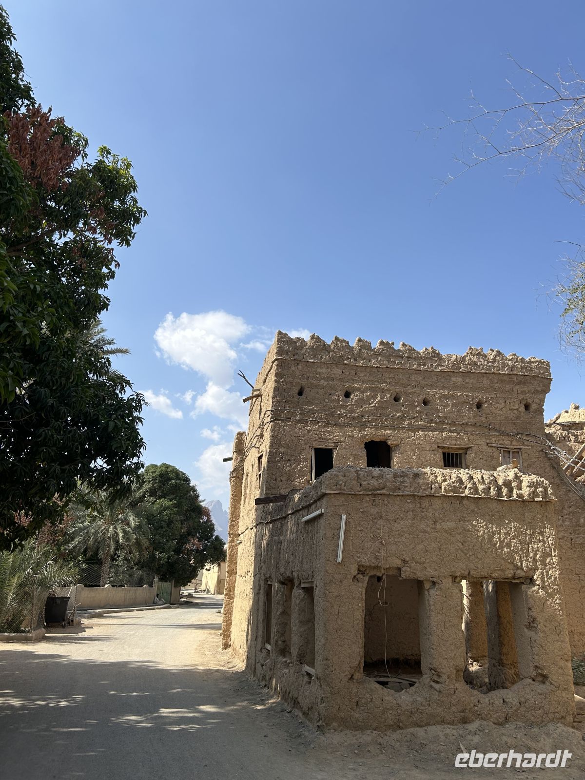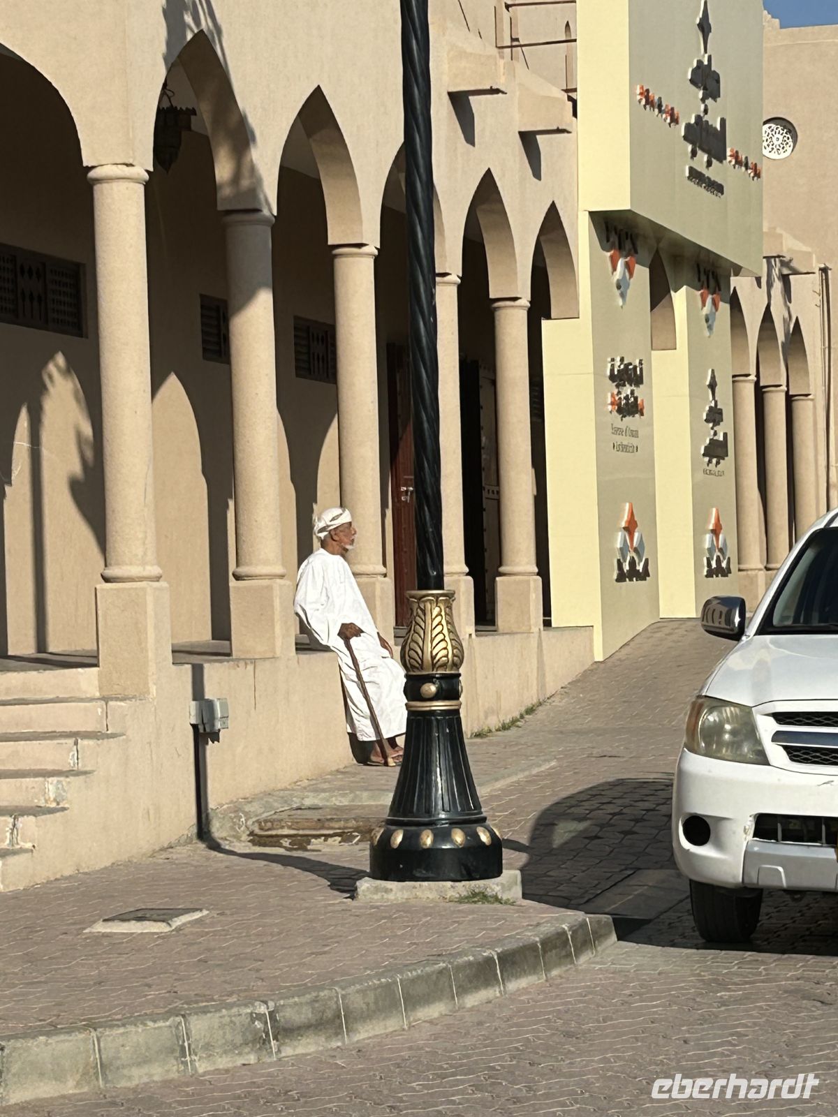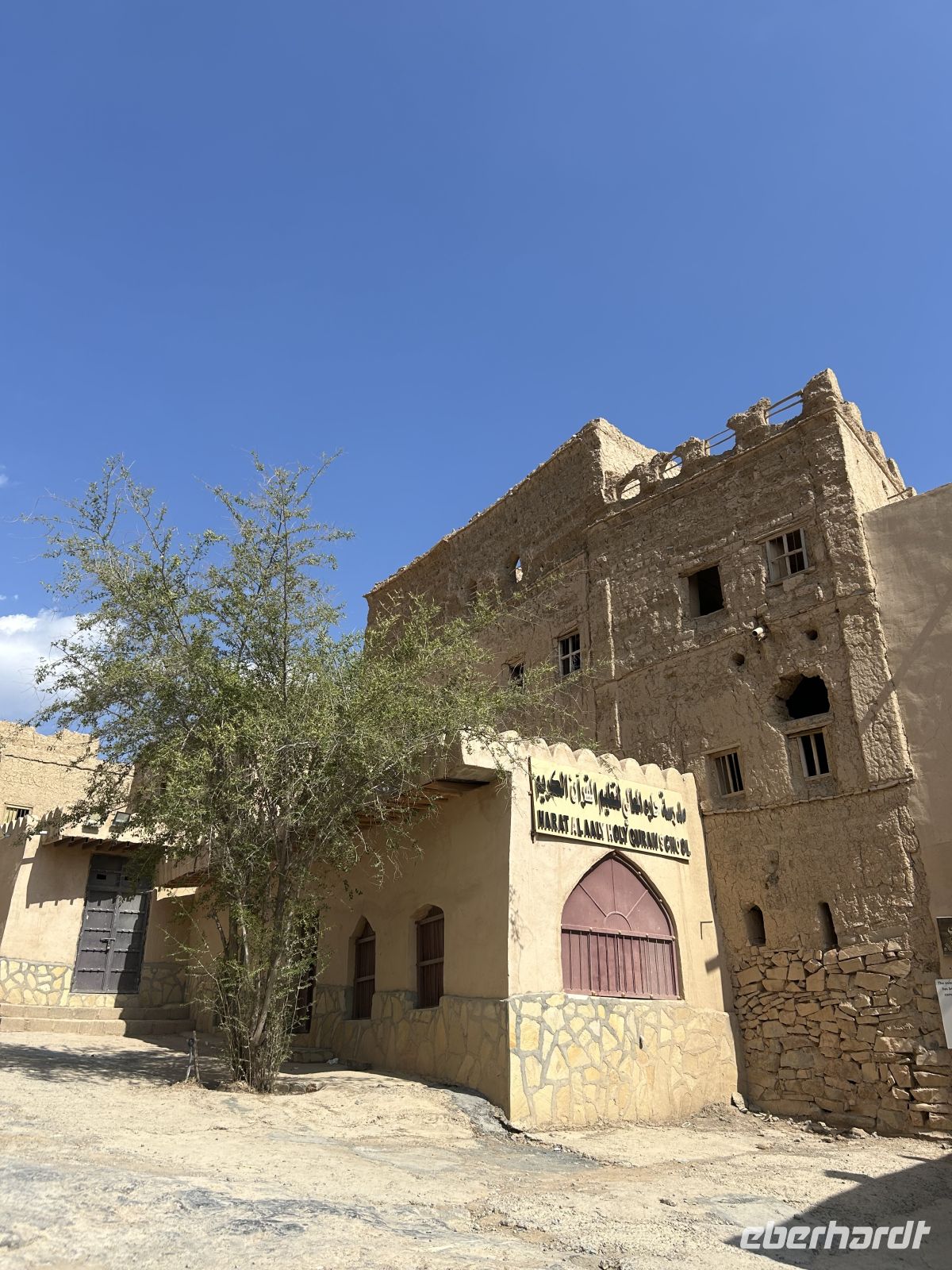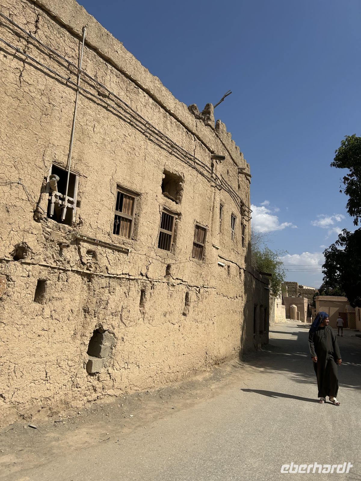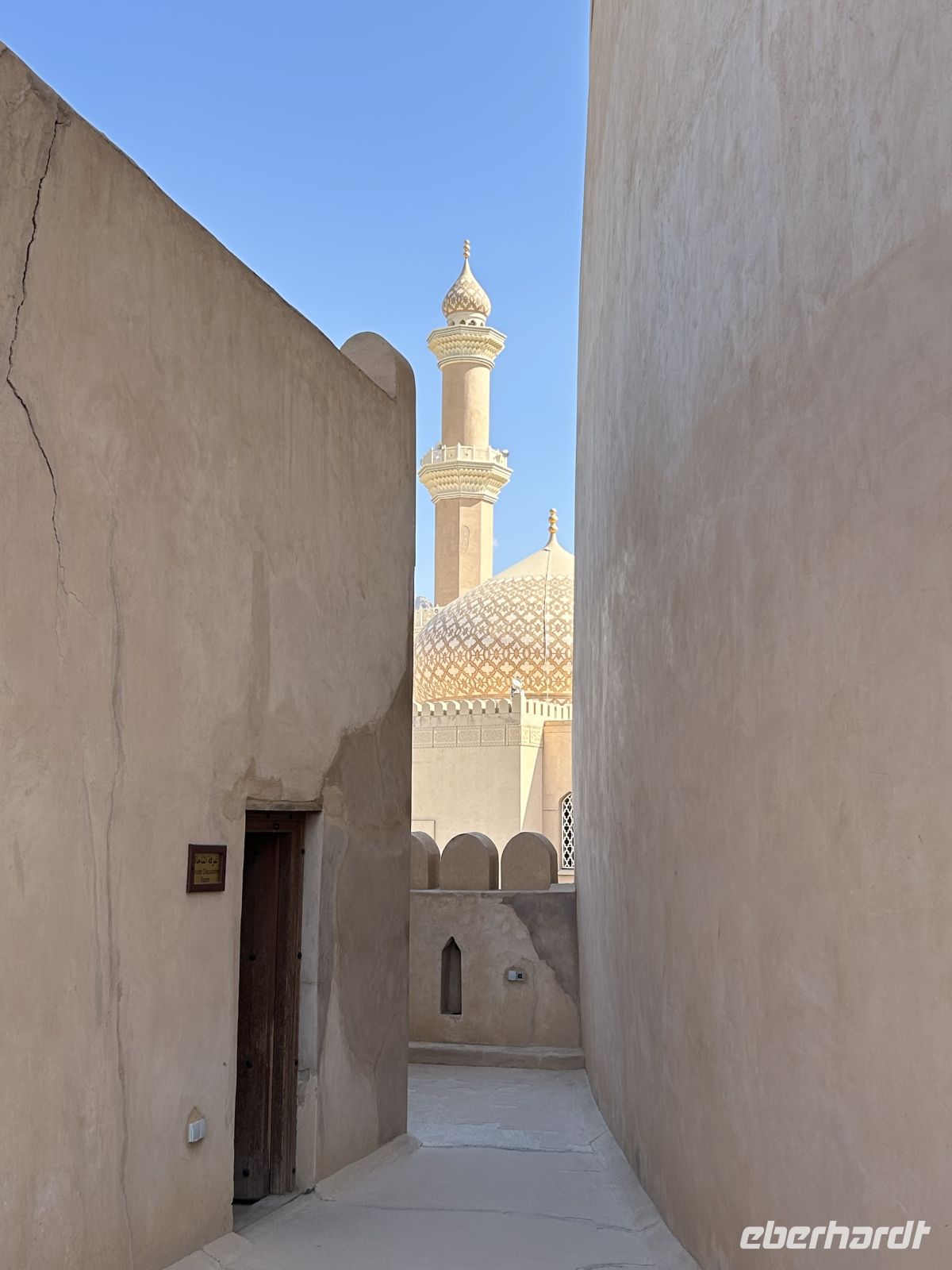 Weiter geht’s nach Al Hamra. Von einem Aussichtspunkt blicken wir über die Oase: tausende Dattelpalmen, dahinter die historische Lehmsiedlung – ein Bild wie von einer Postkarte. Beim Spaziergang durch das alte Zentrum, dessen Häuser vor wenigen Jahrzehnten noch bewohnt waren, spüren wir Geschichte auf Schritt und Tritt.