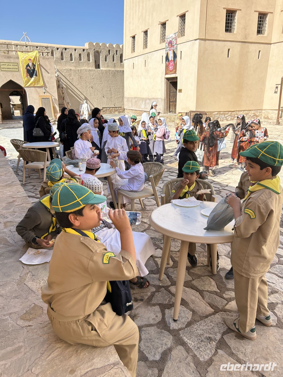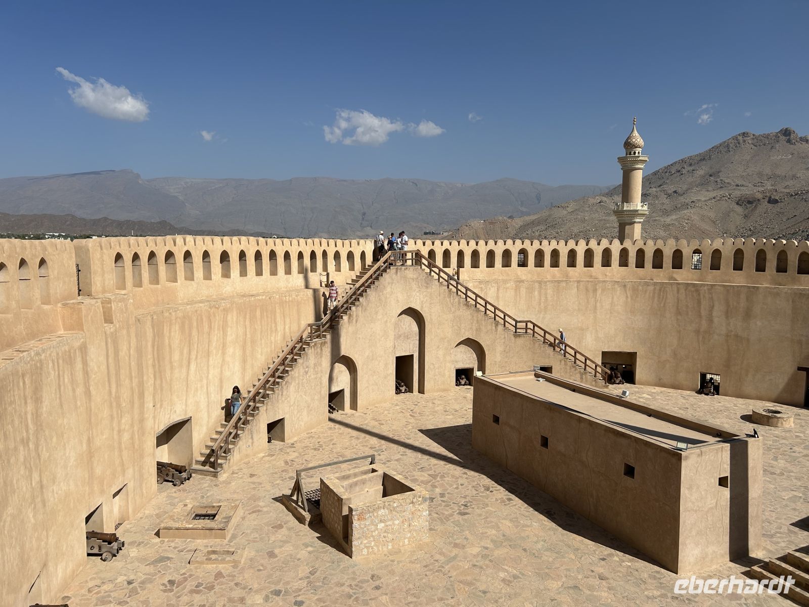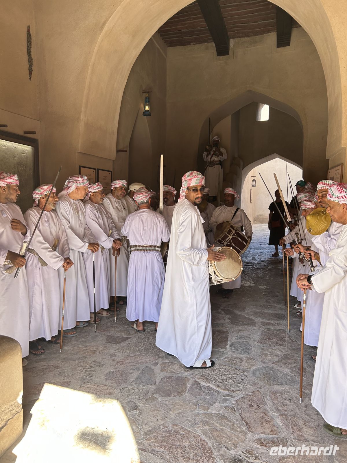 Im Anschluss besichtigen wir das markante Nizwa Fort. Im Innenhof erleben wir eine kleine Folklore-Darbietung traditioneller Tänze, begleitet von Trommeln und Gesängen. Ein Stück omanische Kultur hautnah. Von der großen Rundterrasse genießen wir den weiten Blick über Stadt, Palmenoase und Berge.