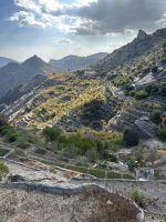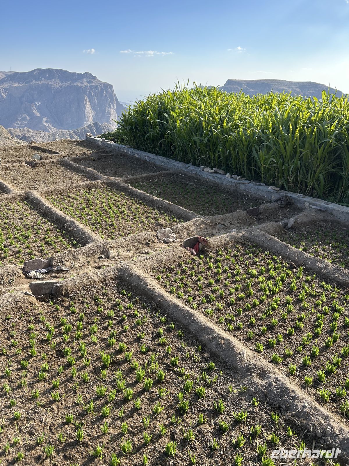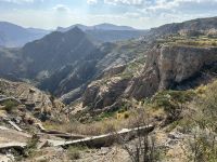 Dann beginnt der Aufstieg auf den Jebel Akhdar, den „Grünen Berg“. Die Serpentinen schrauben sich Meter für Meter nach oben, und die Landschaft wird immer beeindruckender. Oben angekommen, genießen wir unser Picknick inmitten der frischen Bergluft, umgeben von Felsen, Terrassenfeldern und Stille.