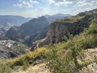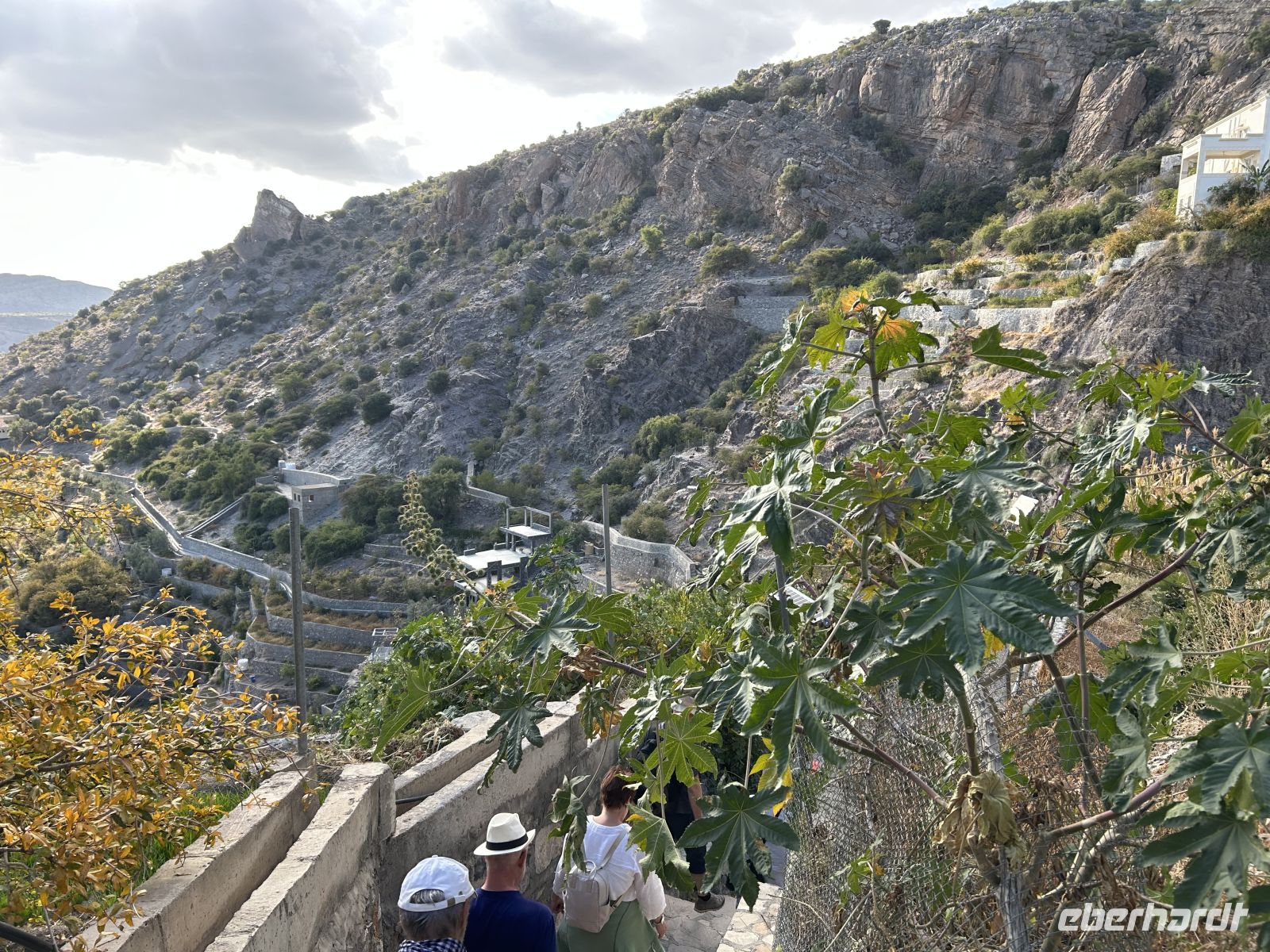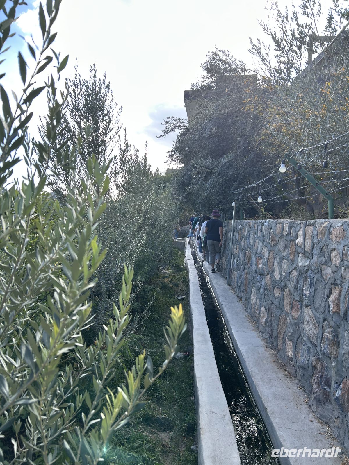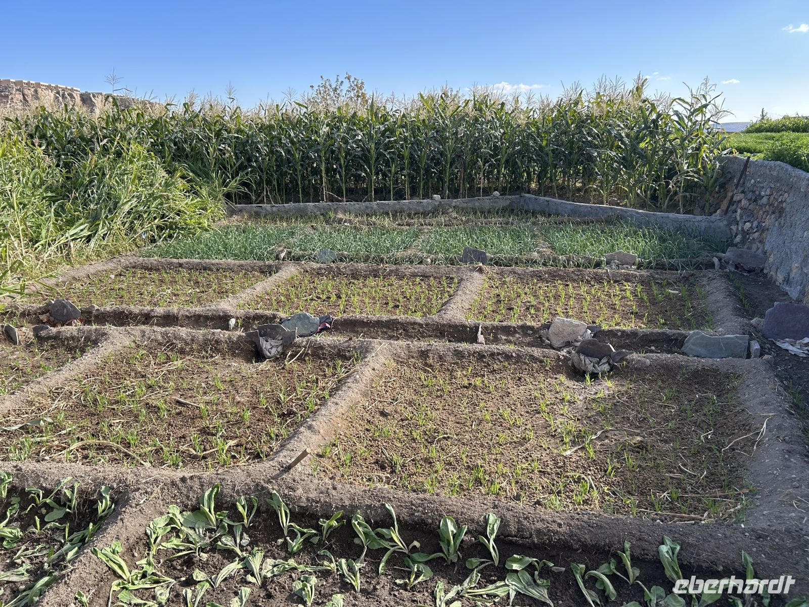 Der erste Abschnitt ist gleich eine kleine Herausforderung: Wir überqueren ein trockenes Flussbett – der Untergrund ist uneben, die Steine lose, und man muss gut hinschauen, wo man hintritt. Doch gemeinsam meistern wir es, und danach führt der Weg auf schmalen Pfaden entlang alter Bewässerungskanäle, vorbei an Gärten, Feldern und Häusern, die sich an den Fels lehnen. Immer wieder öffnen sich grandiose Ausblicke über die grünen Terrassen und tief eingeschnittenen Täler.