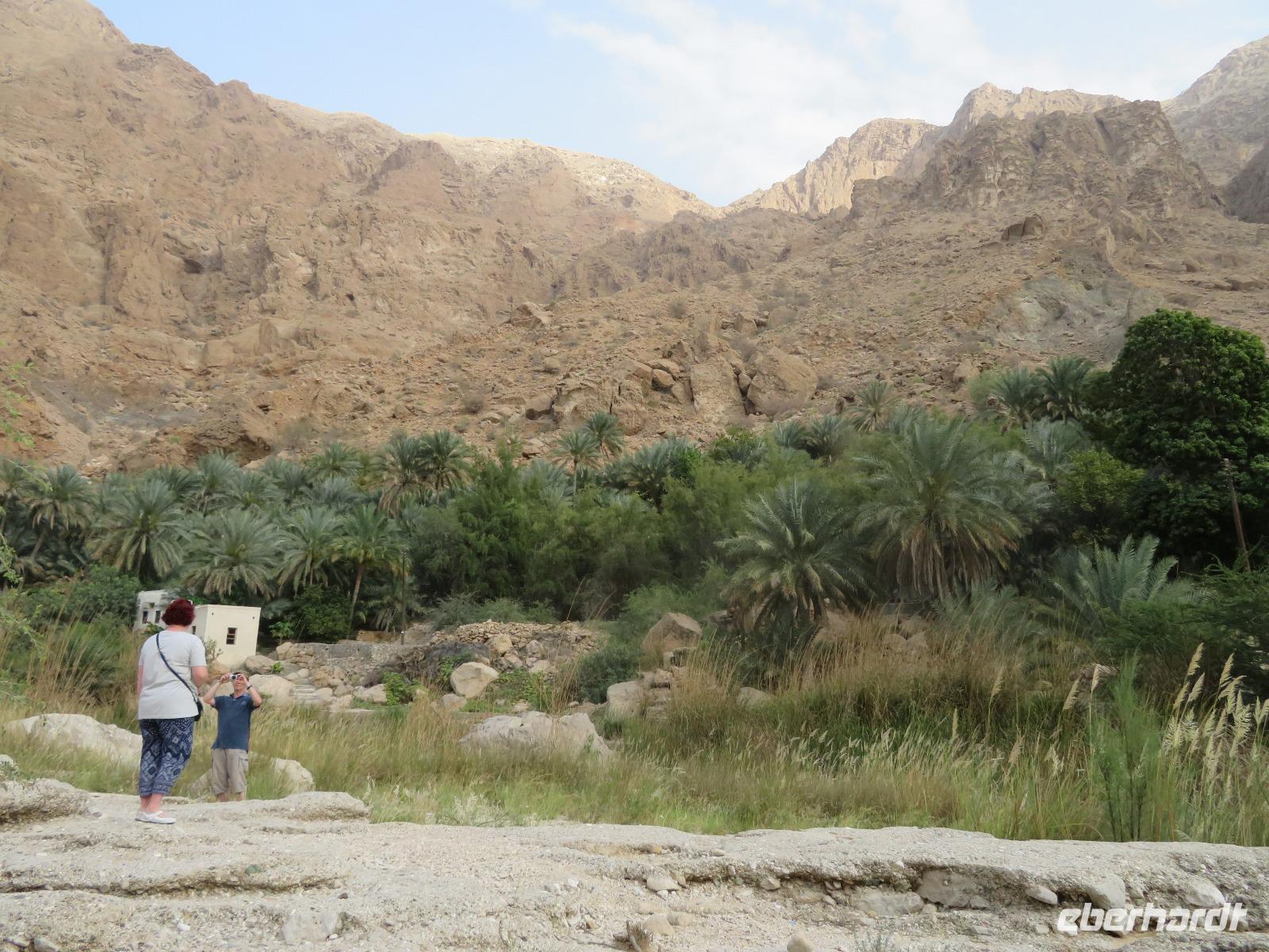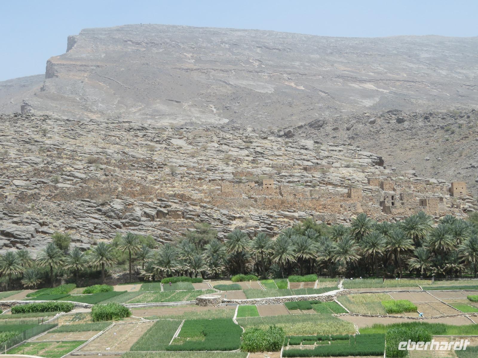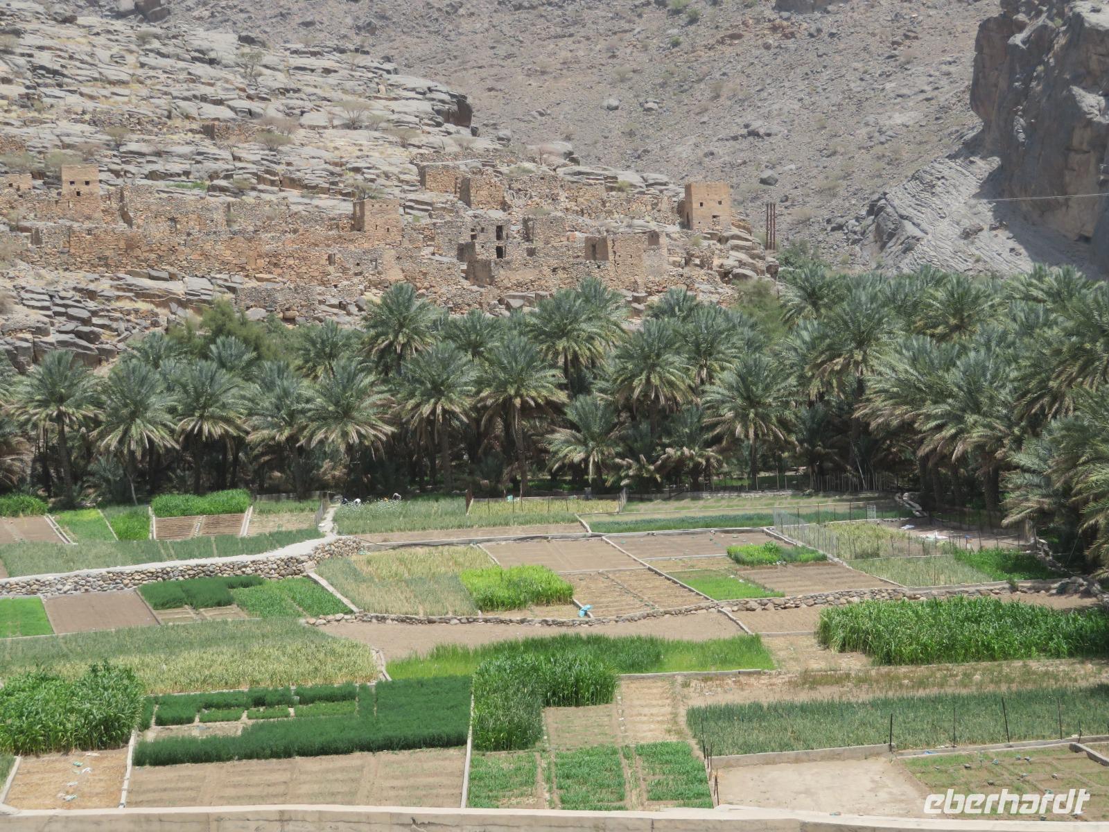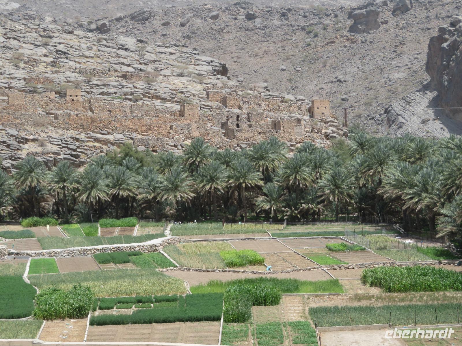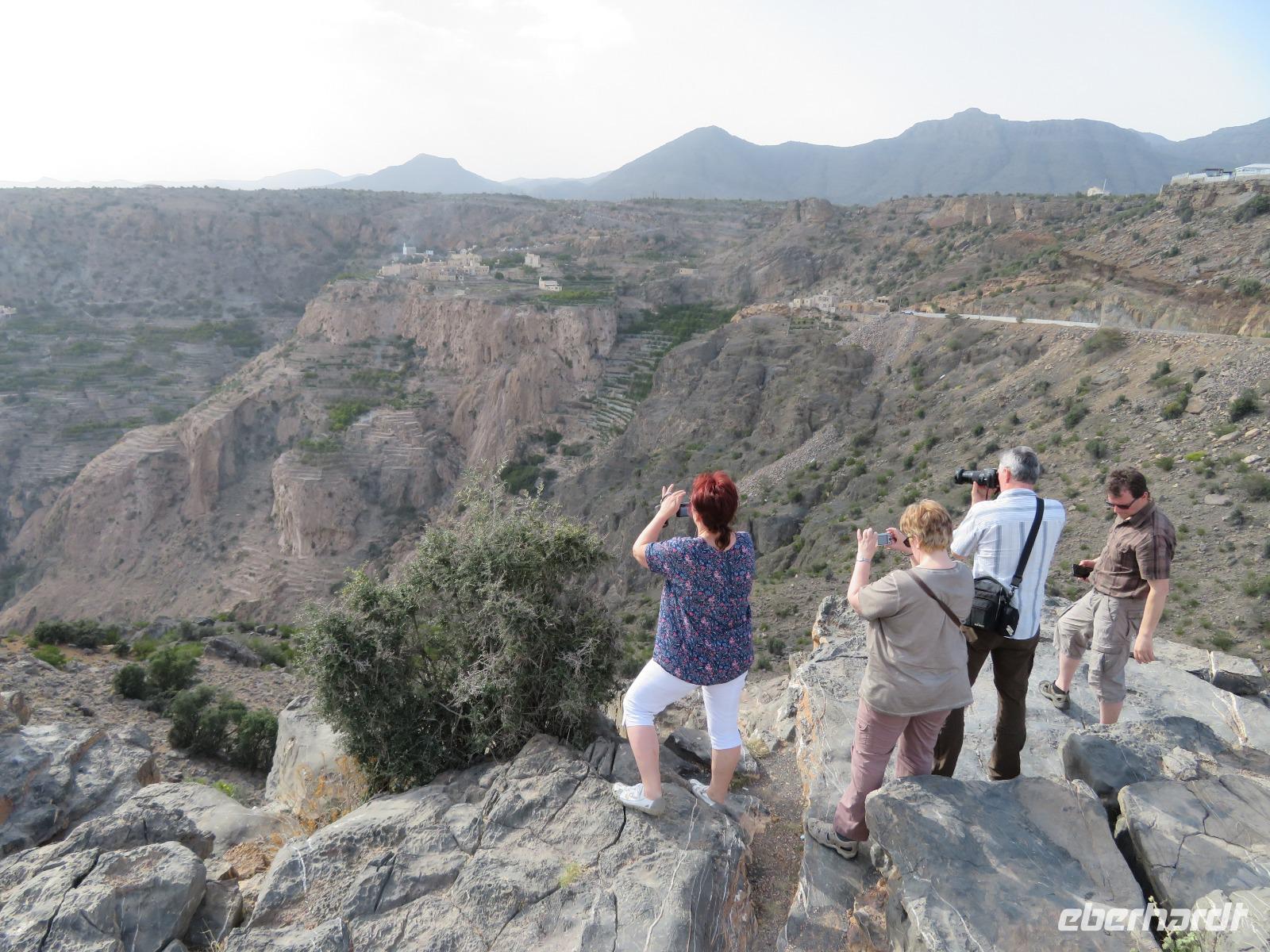 Nachdem alles ausgiebig fotografiert und besichtigt ist, starten wir mit unseren Jeeps ins Jebel Akhbar - Gebirge zum drittgrößten Canyon der Welt. Unterwegs ein kurzer Fotostopp mit Blick auf das alte Lehmdorf Guhl, welches bis Anfang der 1980er Jahre noch bewohnt, dann aber völlig aufgegeben und dem Verfall preisegegeben wurde. Im alten Flussbett gedeiht noch heute ein Palmenhain und auf kleinen Feldern werden Nutzpflanzen angebaut.