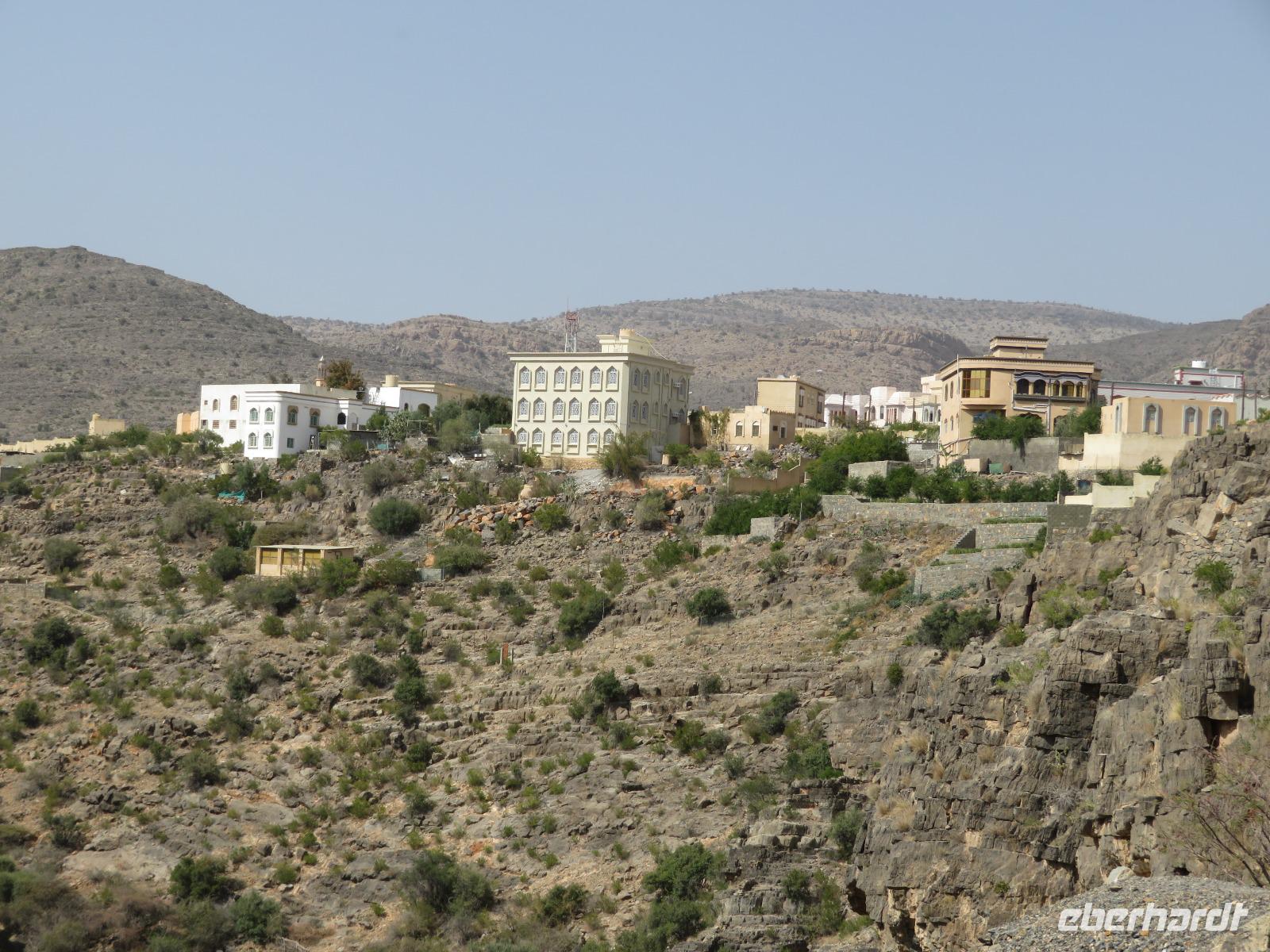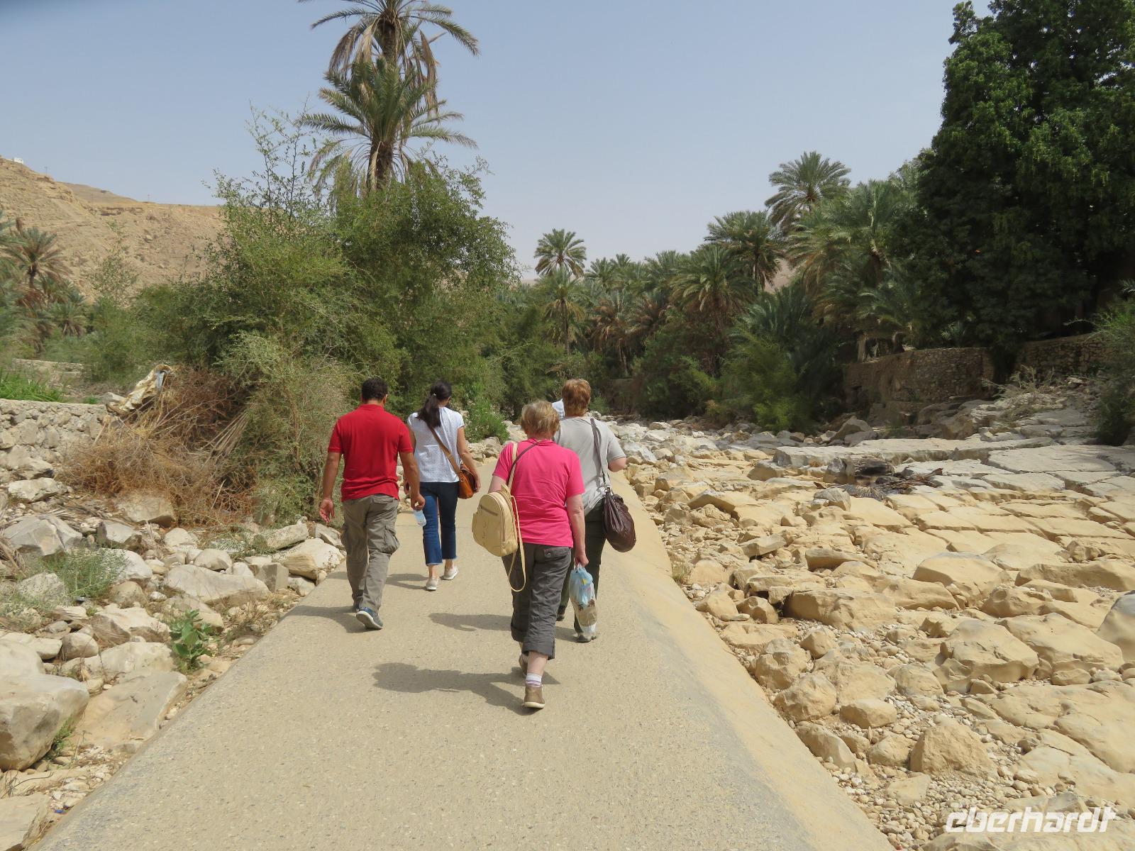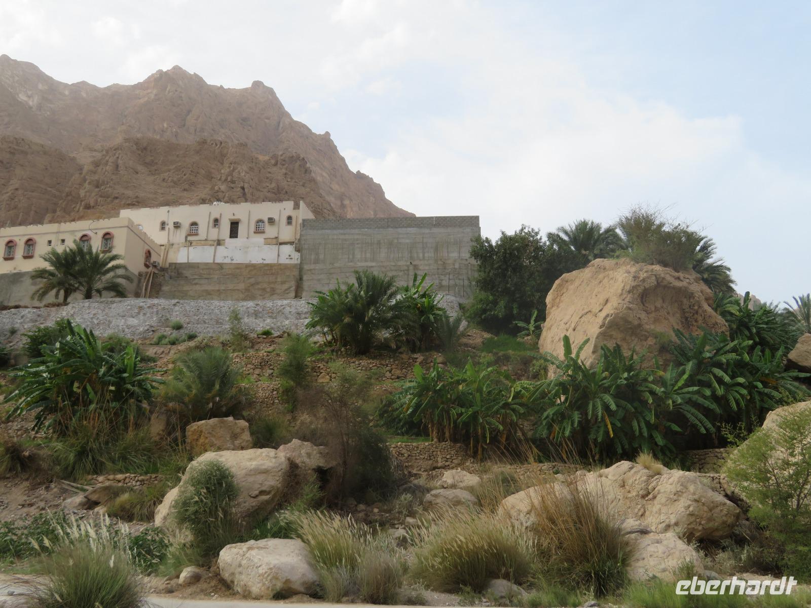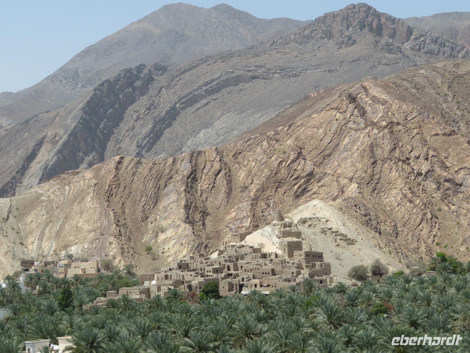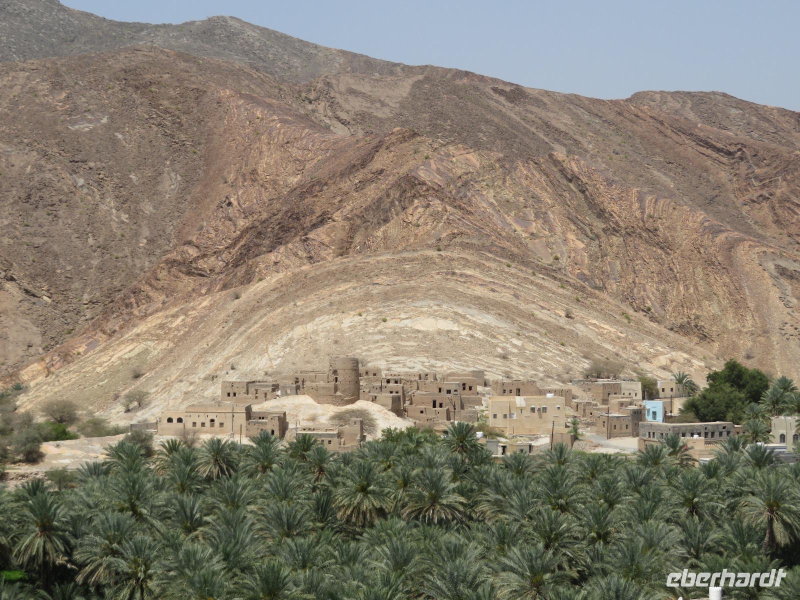 Nachdem alles ausgiebig fotografiert und besichtigt ist, starten wir mit unseren Jeeps ins Jebel Akhbar - Gebirge zum drittgrößten Canyon der Welt. Unterwegs ein kurzer Fotostopp mit Blick auf das alte Lehmdorf Guhl, welches bis Anfang der 1980er Jahre noch bewohnt, dann aber völlig aufgegeben und dem Verfall preisegegeben wurde. Im alten Flussbett gedeiht noch heute ein Palmenhain und auf kleinen Feldern werden Nutzpflanzen angebaut.