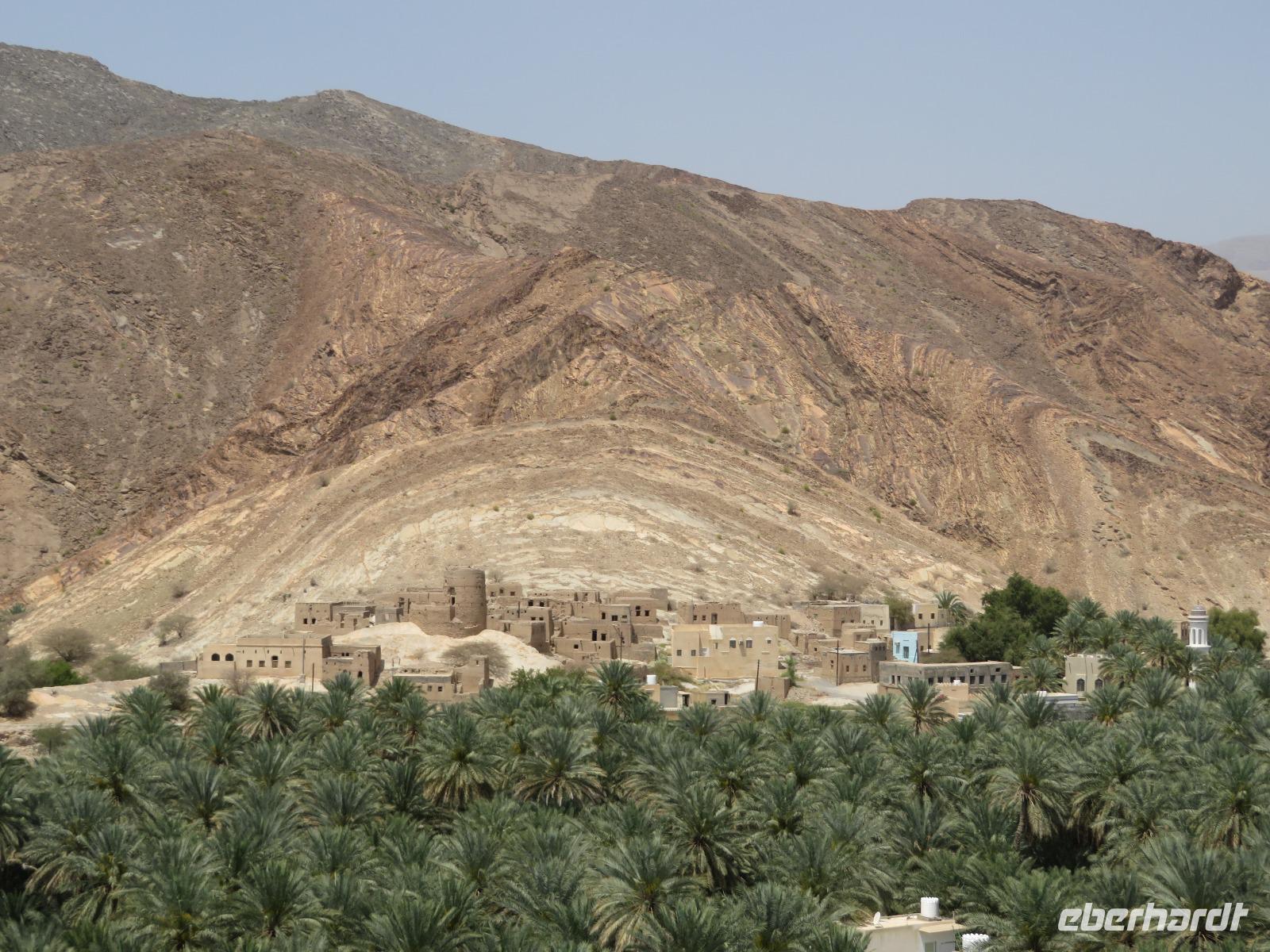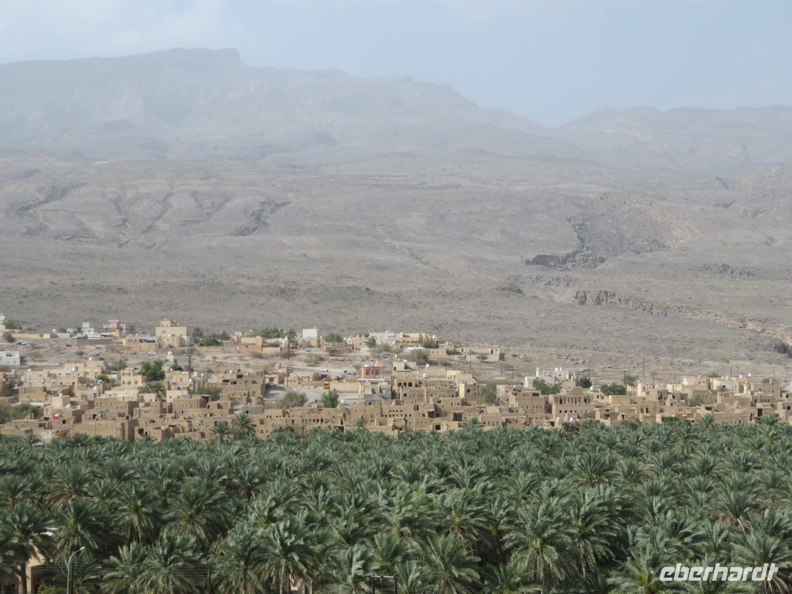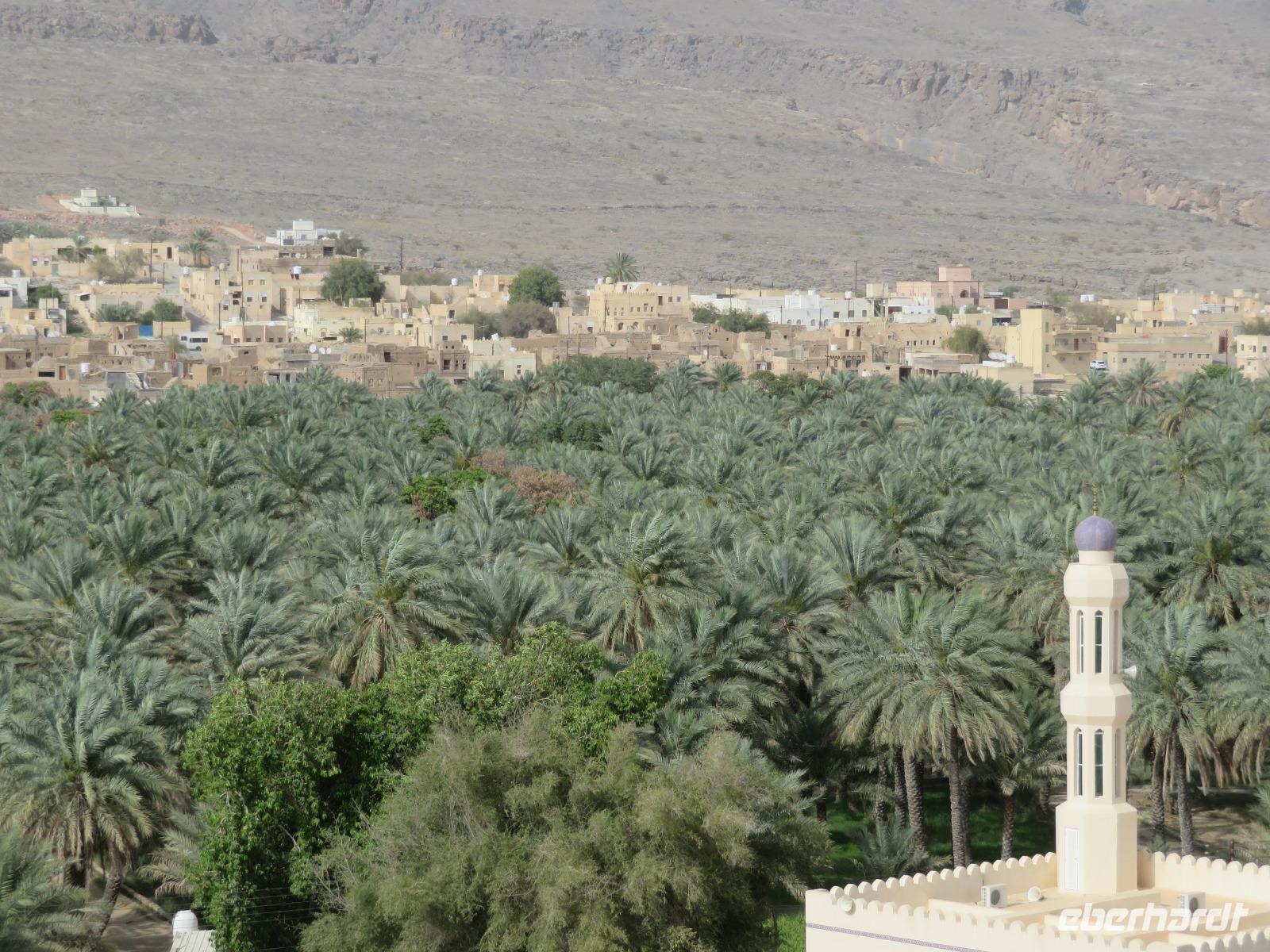 Nun beginnt unsere Fahrt durch die Bergwelt des Hajar Gebirges ins Landesinnere Richtung Nizwa. In Birkat Al Mauz sehen wir bei einem kurzen Spaziergang traditionelle alte Lehmbauten. Die bekannten alten Wasserkanalsysteme des Orte - Falaj Al-Khatmeen - gehören zum UNESCO Weltkulturerbe. Über 2.000 Jahre alte Bewässerungssysteme versorgen die Menschen mit Wasser aus den Bergen und ermöglichen den Anbau großer Dattel-Palmen-Haine.