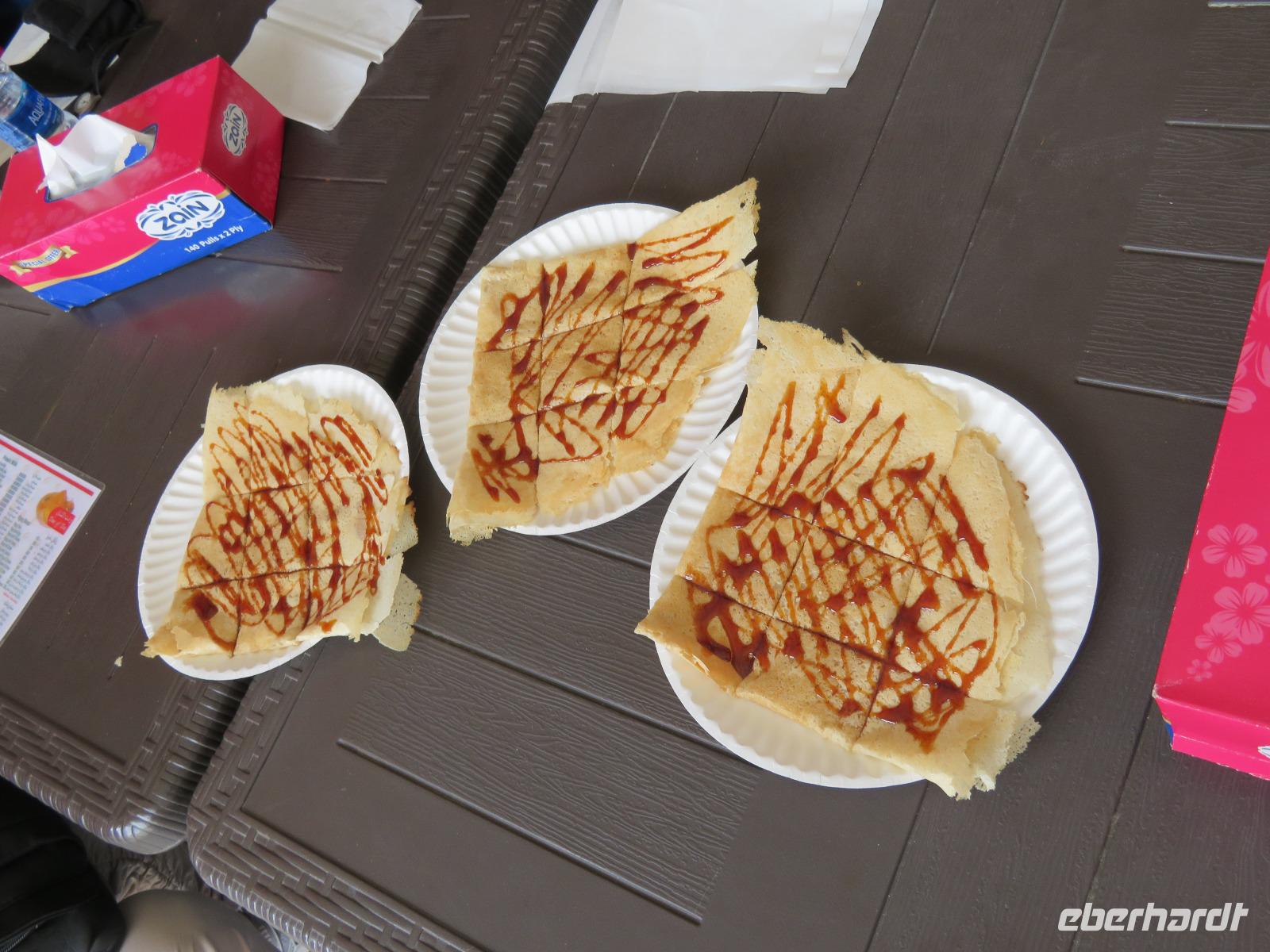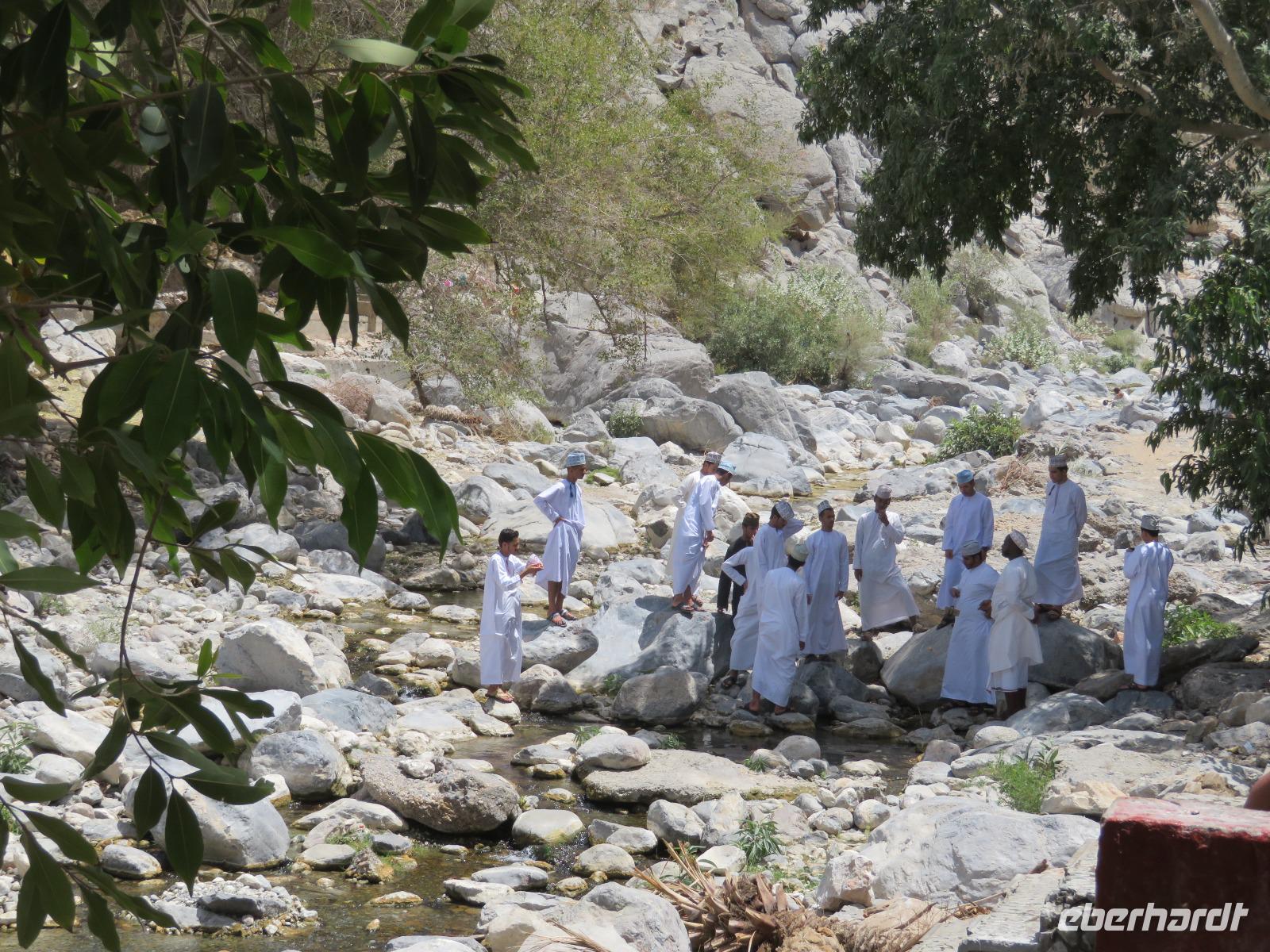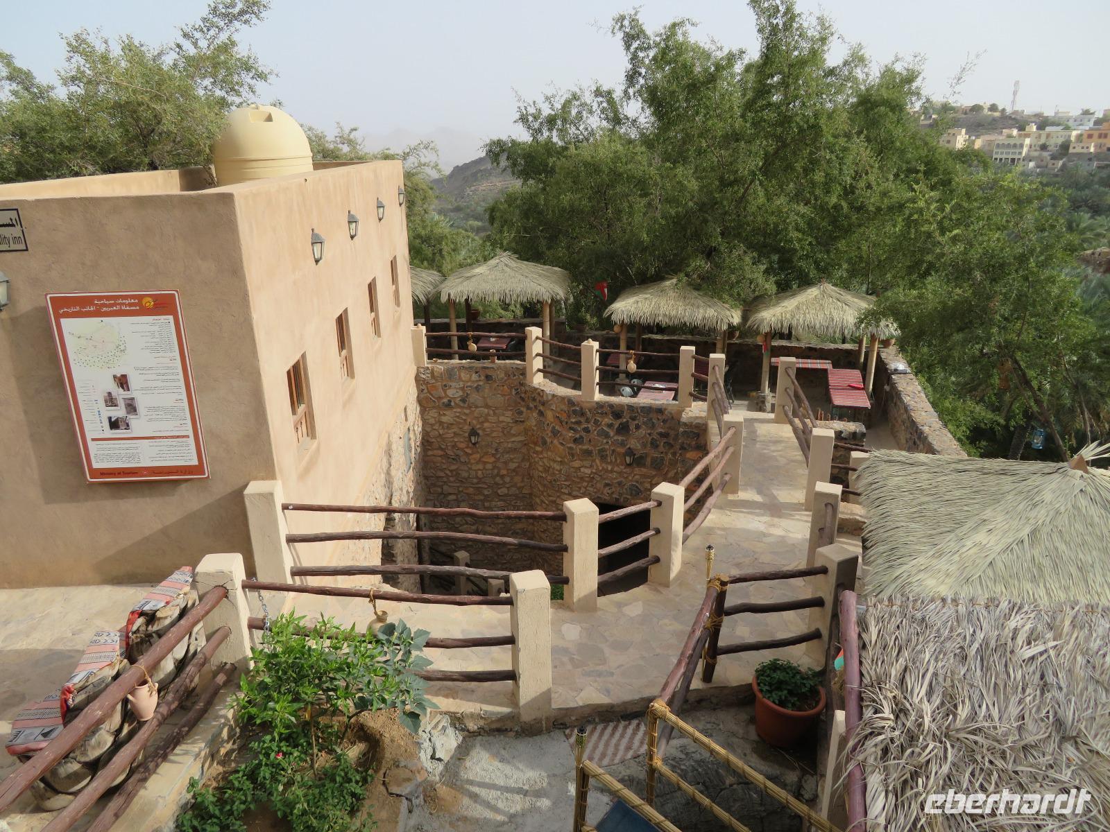 Es ist Mittagszeit und wir haben Hunger. Tafik steuert mit uns einen kleinen Coffeshop an. Da es zum draußensitzen bei 36 Grad viel zu heiss ist werden Tisch und Stühle einfach in den Shop gestellt. In gemütlicher Runde probieren wir typisch omanisches Brot. Aus Mehl, Wasser und Salz wir eine Art Crepes hergestellt. Wahlweise mit Käse, Ei oder Honig können diese gefüllt und verspeist werden. Leeeecker.... Nebenbei beobachten wir eine omanische Schulklasse nach Schulschluss. Eine kurze TOI Pause machen wir am Infopoint & Kontrollposten zur Weiterfahrt zum Jebel Akhadar - auch grüner Berg genannt. Die 2005 eröffnete steile auf ca. 2000m Höhe führende Serpentinenstraße, darf nur mit Allradfahrzeugen befahren werden. Völlig unerwartet erreicht man ein riesiges Plateau, das Saiq-Plateau mit dem gleichnamigen Ort. Von verschiedenen Aussichtspunkten eröffnen sich wunderbare Ausblicke über die einmalige Landschaft mit den Terrassengärten auf welchen Rosen und Granatäpfel angebaut werden.