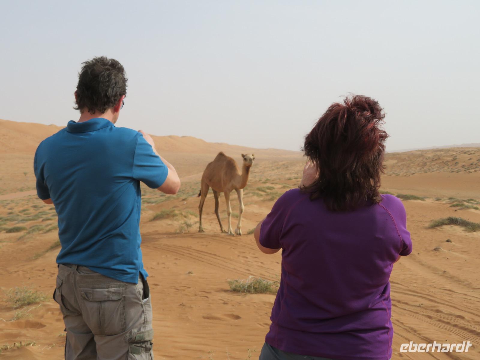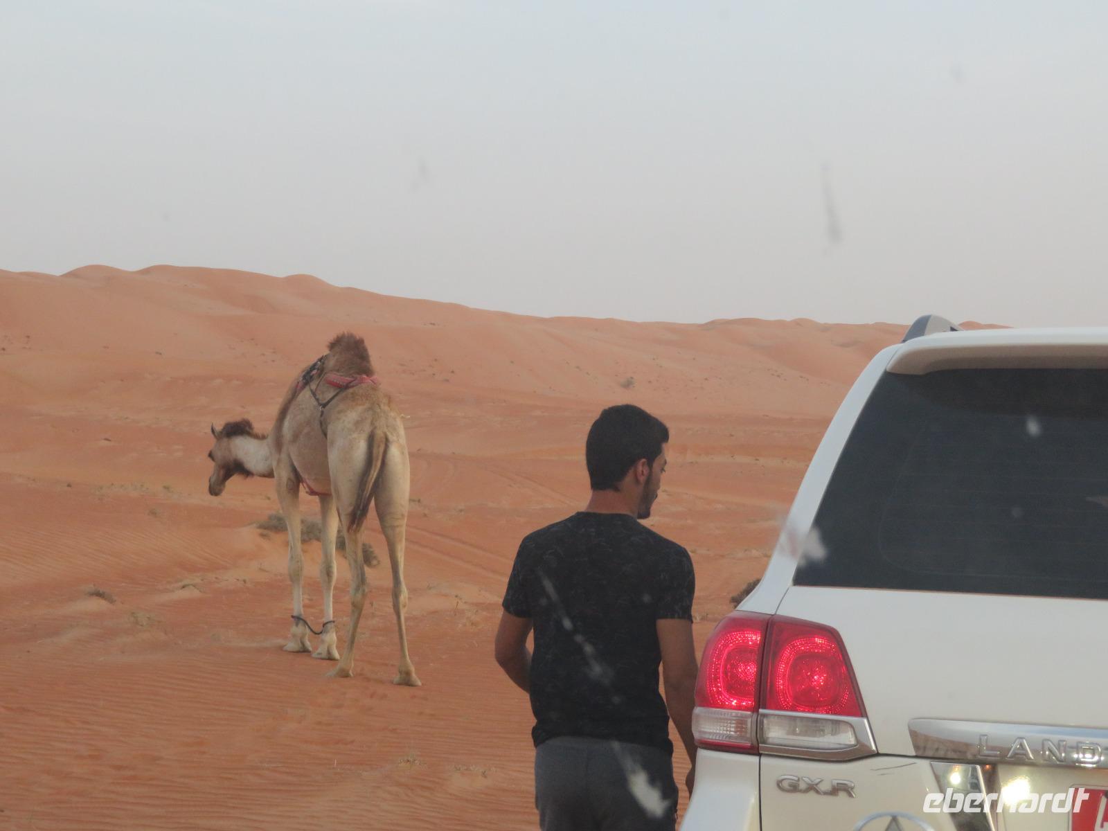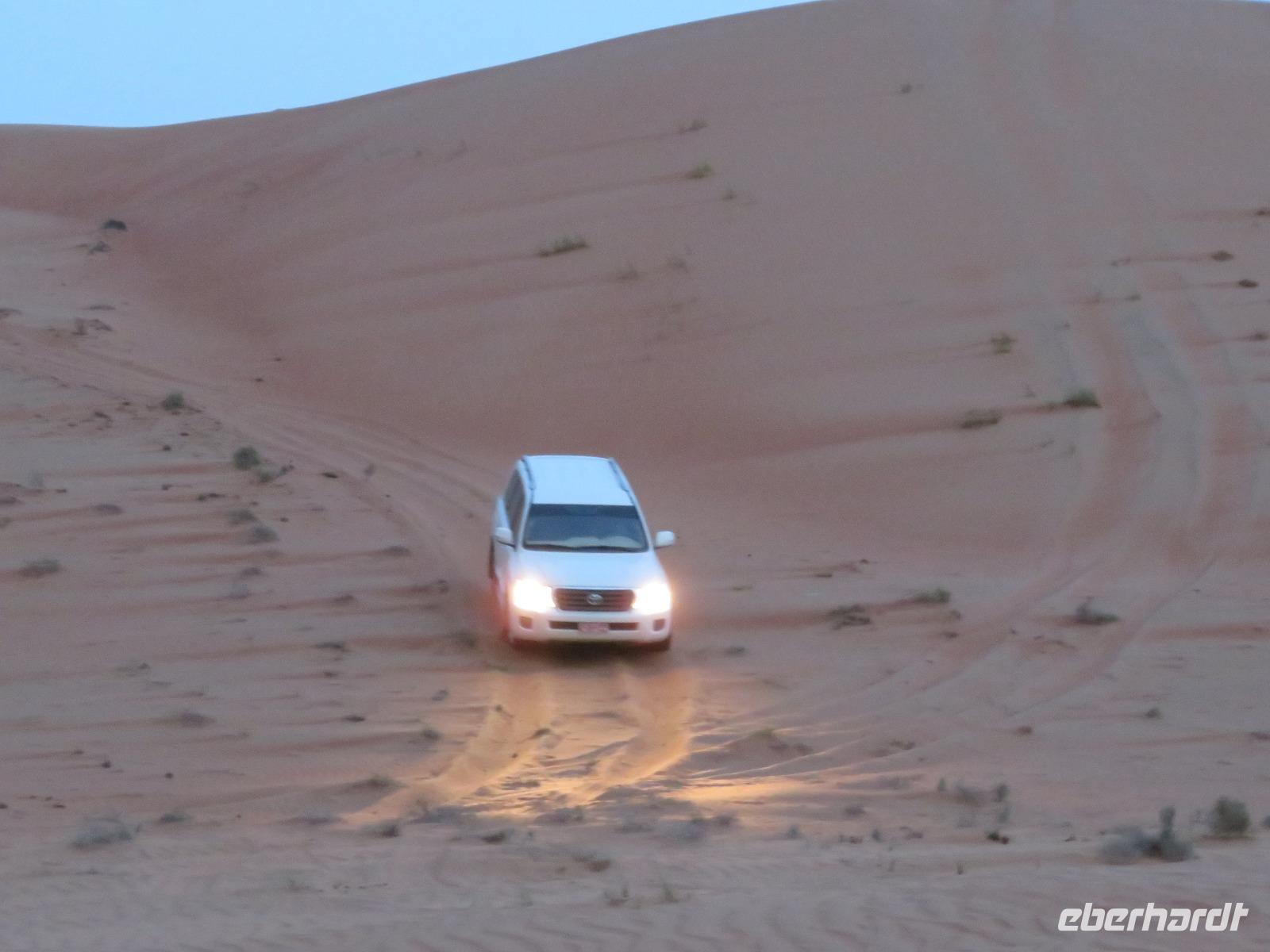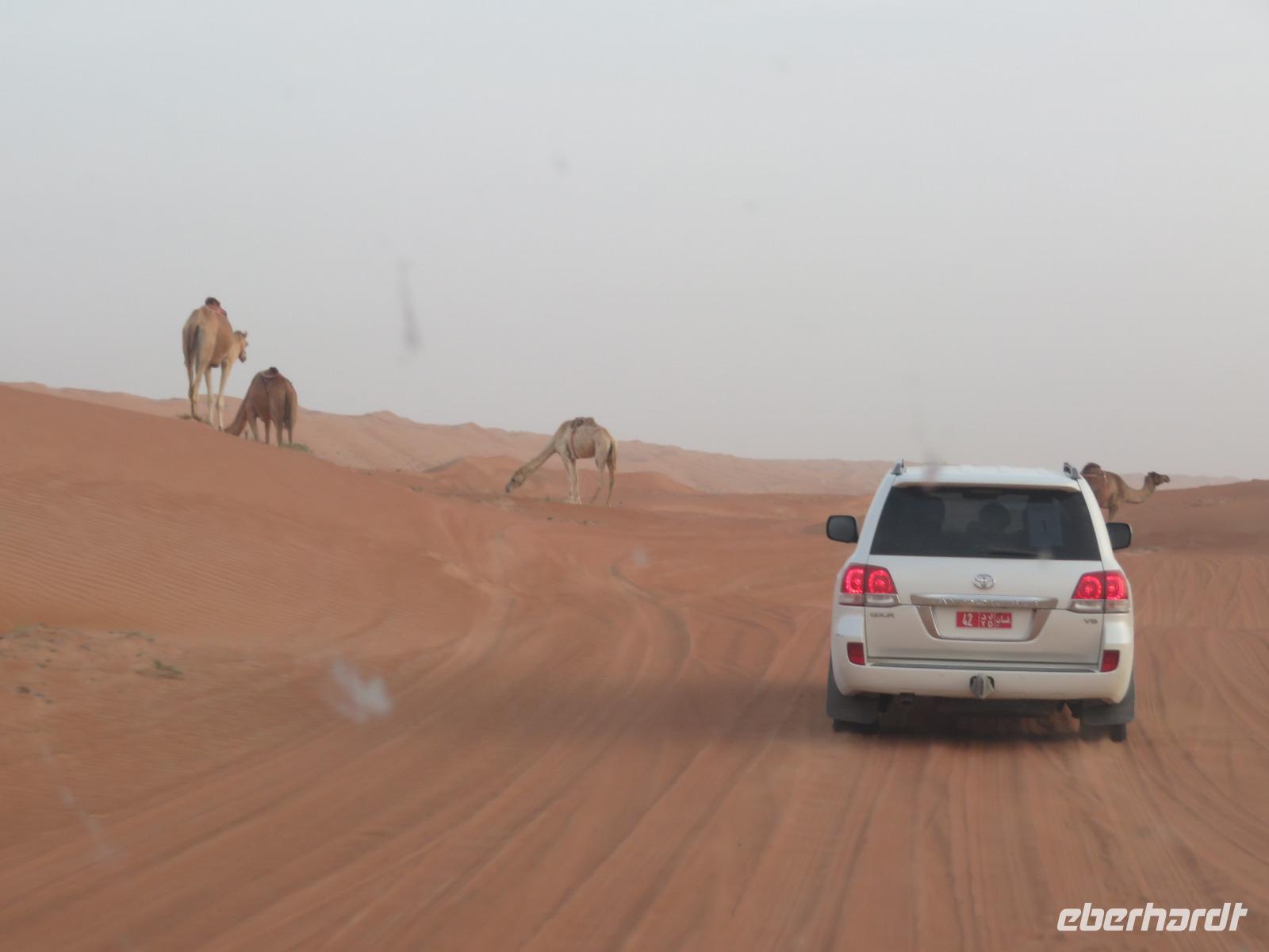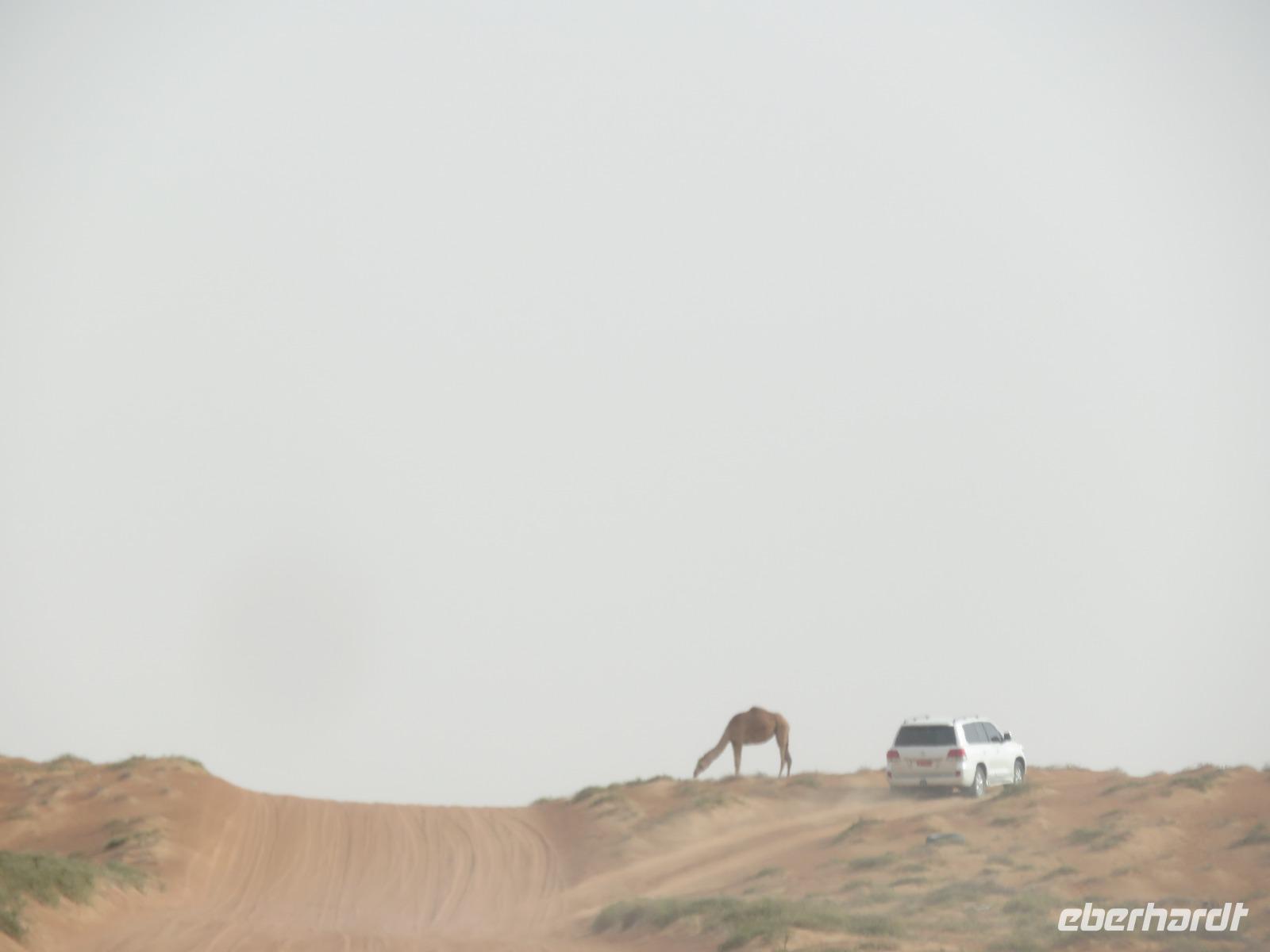 Und da sind Sie die ersten Wüstenschiffe - wie Kamele auch genannt werden. Geduldig lassen Sie das nun folgende Fotoshooting über sich ergehen. Nach kurzer Weiterfahrt erreichen wir unser Sama Al Wasil Camp. Mit Tee, omanischem Kaffee und natürlich Datteln werden wir herzlich begrüßt und beziehen einfach ausgestatteten Steinhäuschen. Nach einer kleinen Pause, geht es mit unseren Jeeps in die roten Sanddünen. Wir wundern uns das wir dafür andere Fahrer bekommen. Aber nein statt Dishdasha & Kummah tragen Amarr, Machmoud und Omar jetzt Jeans & TShirt. Wie bei einer kleinen Wüstenralley starten wir durch die Sanddünen, plötzlich war Jeep 2 verschwunden... steckengeblieben. Kein Problem er wurde durch Tawfik und die Fahrer schnell wieder aus dem Sand gebuddelt. Leider versteckte sich die Wüstensonne hinter dicken Wolken und es wurde nix mit dem geplanten Sundowner. Dafür verdunkelte sich der Himmel. Nun hiess es schnell zurück zum Camp. Wir schafften es gerade so bevor Sandsturm, Blitz & Donner über unser Camp hinwegfegten und gleich die Stromversorgung kappten. Abendessen im Schein von Laternen, Taschenlampen und Handylicht. Ein tolles Erlebnis...Kurz vom Schlafengehen ertönte ein kurzes Ahhhh durch das ganze Camp. Der Strom war wieder da, Licht zum duschen (die Bäder waren stockdunkel) und auch die Klimaanlagen nahmen Ihren Betrieb wieder auf. Nachtschwärmer konnten einen herrlichen Sternenhimmel in der Stille der Wüste bewundern.