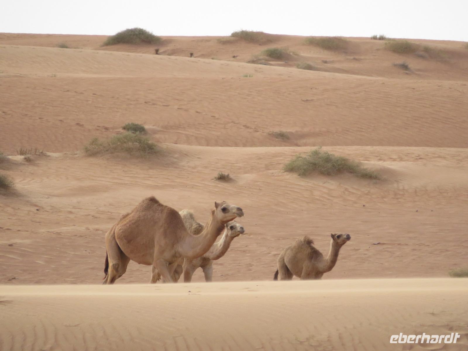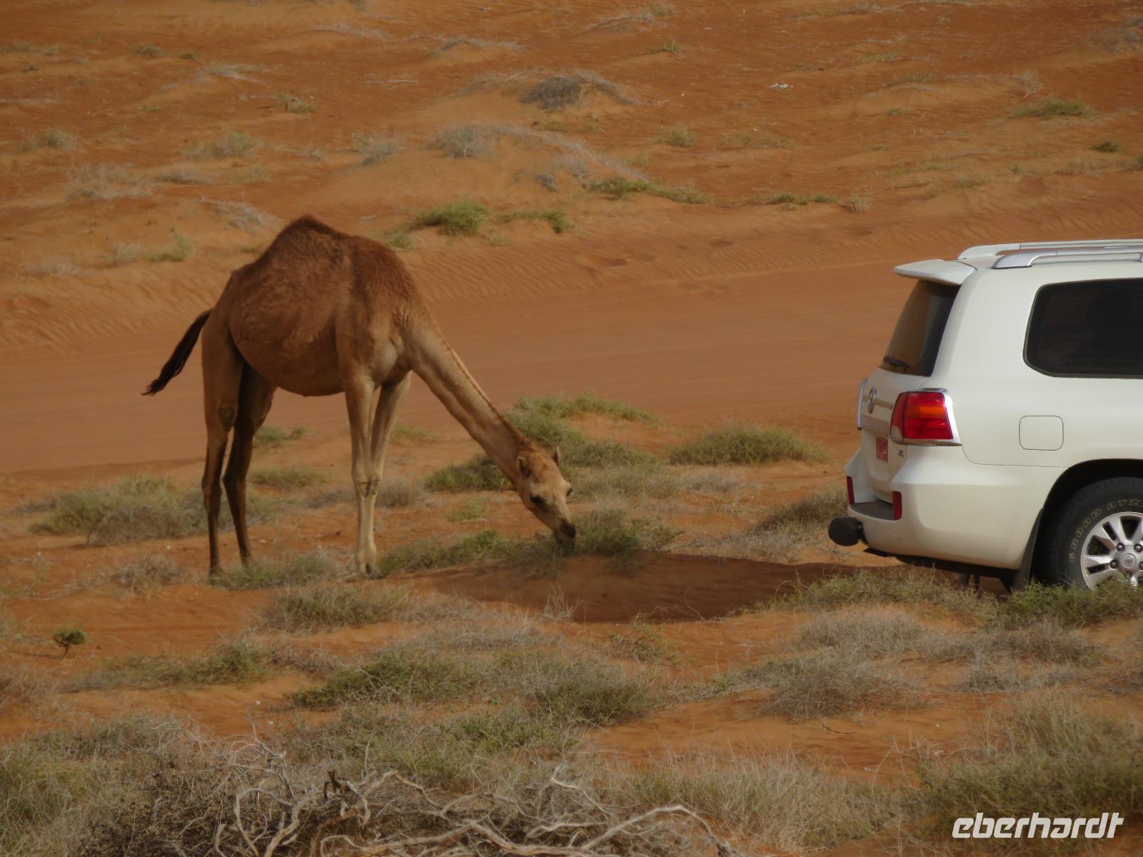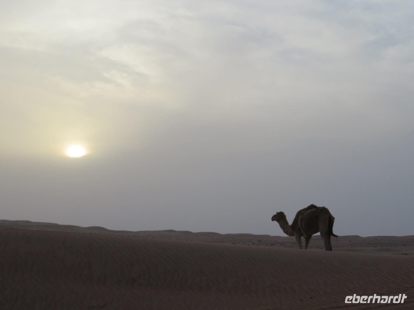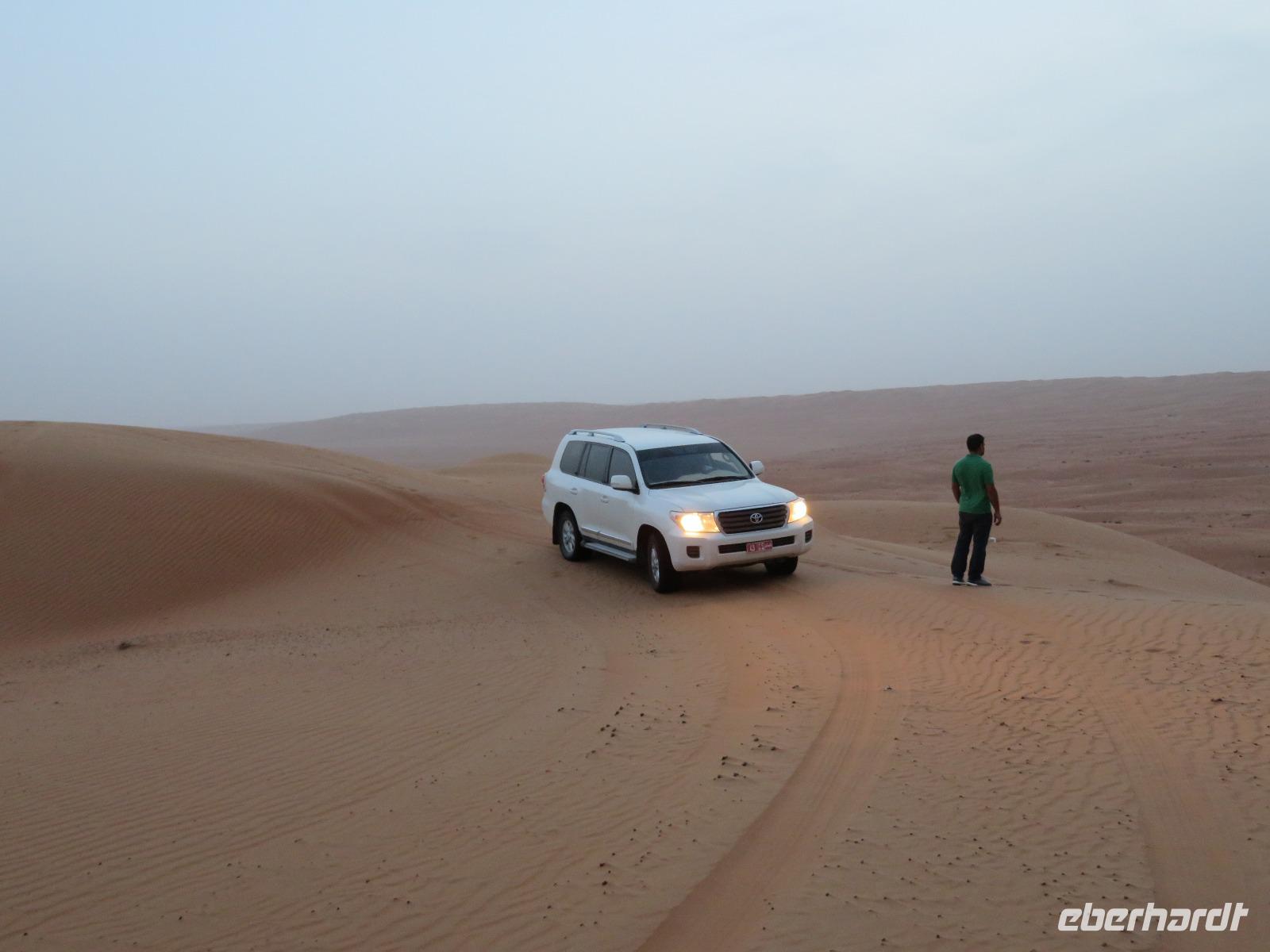 Und da sind Sie die ersten Wüstenschiffe - wie Kamele auch genannt werden. Geduldig lassen Sie das nun folgende Fotoshooting über sich ergehen. Nach kurzer Weiterfahrt erreichen wir unser Sama Al Wasil Camp. Mit Tee, omanischem Kaffee und natürlich Datteln werden wir herzlich begrüßt und beziehen einfach ausgestatteten Steinhäuschen. Nach einer kleinen Pause, geht es mit unseren Jeeps in die roten Sanddünen. Wir wundern uns das wir dafür andere Fahrer bekommen. Aber nein statt Dishdasha & Kummah tragen Amarr, Machmoud und Omar jetzt Jeans & TShirt. Wie bei einer kleinen Wüstenralley starten wir durch die Sanddünen, plötzlich war Jeep 2 verschwunden... steckengeblieben. Kein Problem er wurde durch Tawfik und die Fahrer schnell wieder aus dem Sand gebuddelt. Leider versteckte sich die Wüstensonne hinter dicken Wolken und es wurde nix mit dem geplanten Sundowner. Dafür verdunkelte sich der Himmel. Nun hiess es schnell zurück zum Camp. Wir schafften es gerade so bevor Sandsturm, Blitz & Donner über unser Camp hinwegfegten und gleich die Stromversorgung kappten. Abendessen im Schein von Laternen, Taschenlampen und Handylicht. Ein tolles Erlebnis...Kurz vom Schlafengehen ertönte ein kurzes Ahhhh durch das ganze Camp. Der Strom war wieder da, Licht zum duschen (die Bäder waren stockdunkel) und auch die Klimaanlagen nahmen Ihren Betrieb wieder auf. Nachtschwärmer konnten einen herrlichen Sternenhimmel in der Stille der Wüste bewundern.