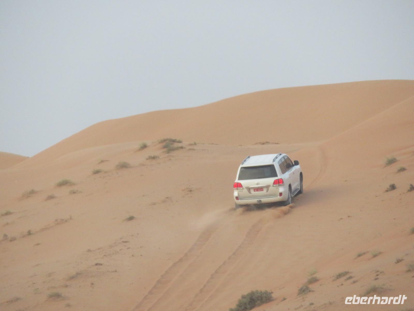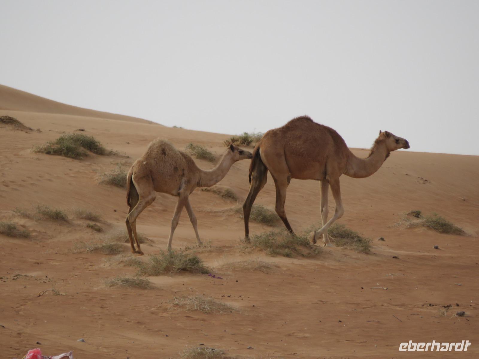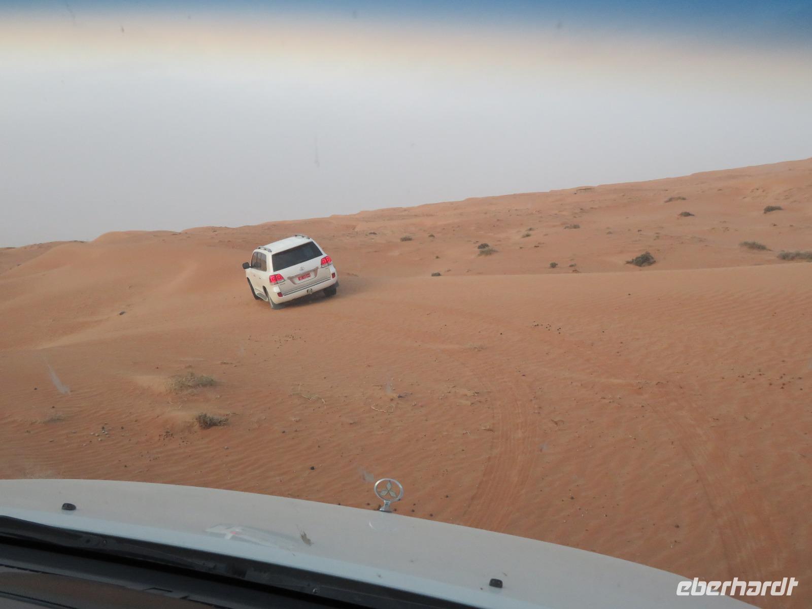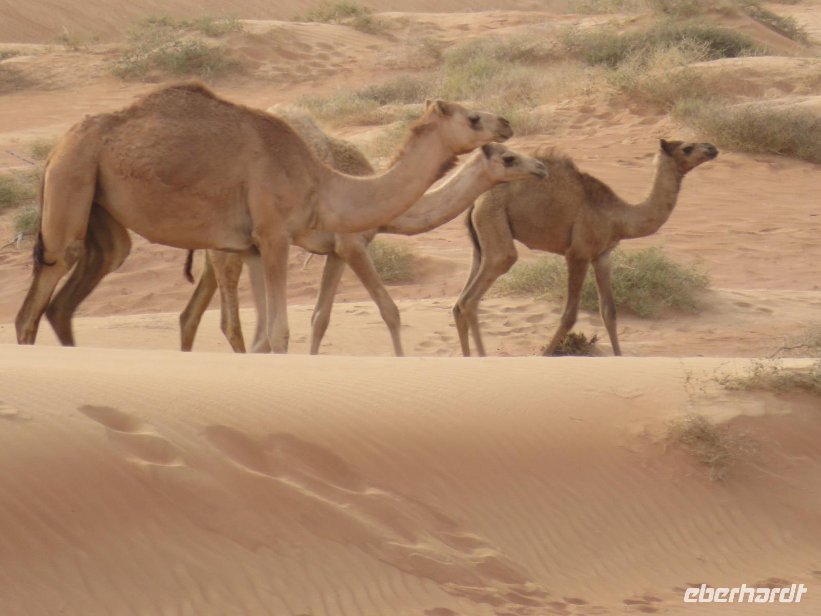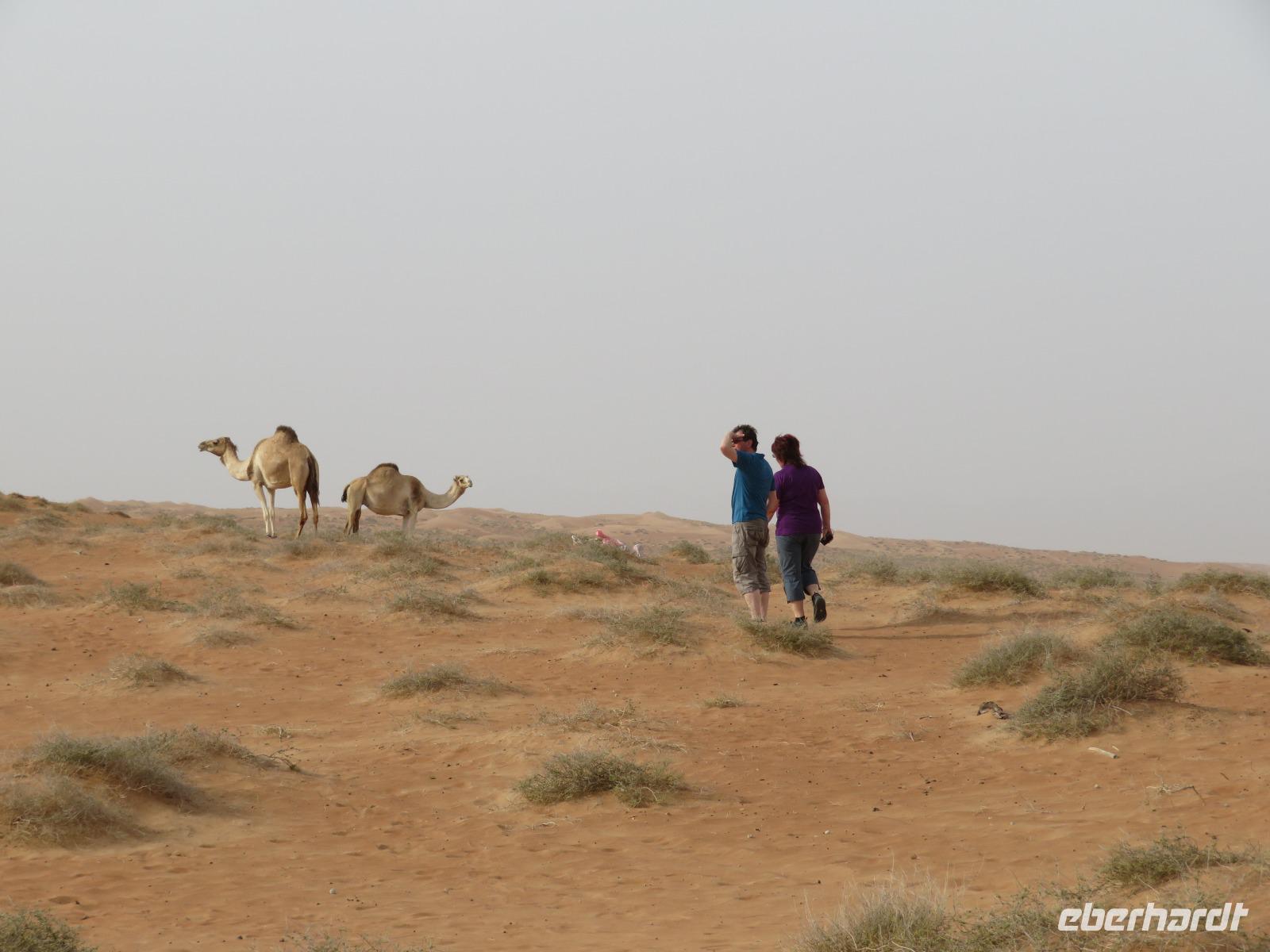 Und da sind Sie die ersten Wüstenschiffe - wie Kamele auch genannt werden. Geduldig lassen Sie das nun folgende Fotoshooting über sich ergehen. Nach kurzer Weiterfahrt erreichen wir unser Sama Al Wasil Camp. Mit Tee, omanischem Kaffee und natürlich Datteln werden wir herzlich begrüßt und beziehen einfach ausgestatteten Steinhäuschen. Nach einer kleinen Pause, geht es mit unseren Jeeps in die roten Sanddünen. Wir wundern uns das wir dafür andere Fahrer bekommen. Aber nein statt Dishdasha & Kummah tragen Amarr, Machmoud und Omar jetzt Jeans & TShirt. Wie bei einer kleinen Wüstenralley starten wir durch die Sanddünen, plötzlich war Jeep 2 verschwunden... steckengeblieben. Kein Problem er wurde durch Tawfik und die Fahrer schnell wieder aus dem Sand gebuddelt. Leider versteckte sich die Wüstensonne hinter dicken Wolken und es wurde nix mit dem geplanten Sundowner. Dafür verdunkelte sich der Himmel. Nun hiess es schnell zurück zum Camp. Wir schafften es gerade so bevor Sandsturm, Blitz & Donner über unser Camp hinwegfegten und gleich die Stromversorgung kappten. Abendessen im Schein von Laternen, Taschenlampen und Handylicht. Ein tolles Erlebnis...Kurz vom Schlafengehen ertönte ein kurzes Ahhhh durch das ganze Camp. Der Strom war wieder da, Licht zum duschen (die Bäder waren stockdunkel) und auch die Klimaanlagen nahmen Ihren Betrieb wieder auf. Nachtschwärmer konnten einen herrlichen Sternenhimmel in der Stille der Wüste bewundern.