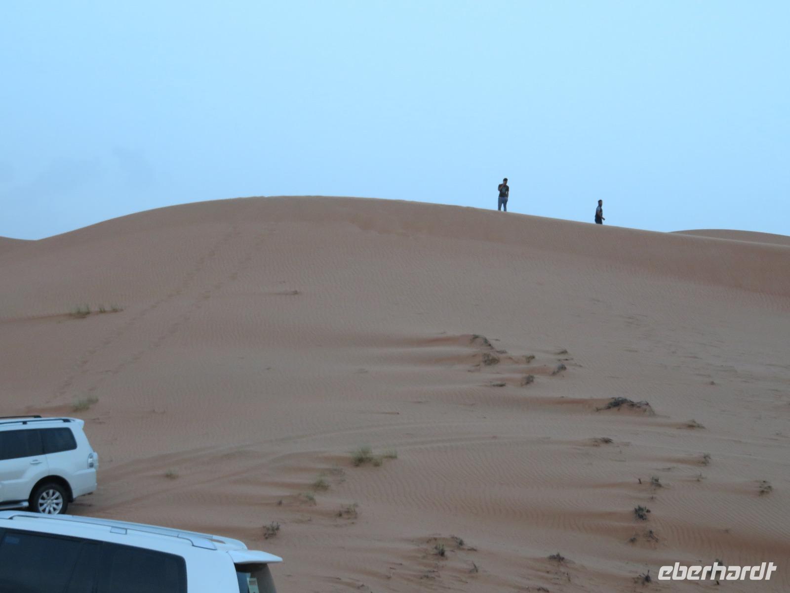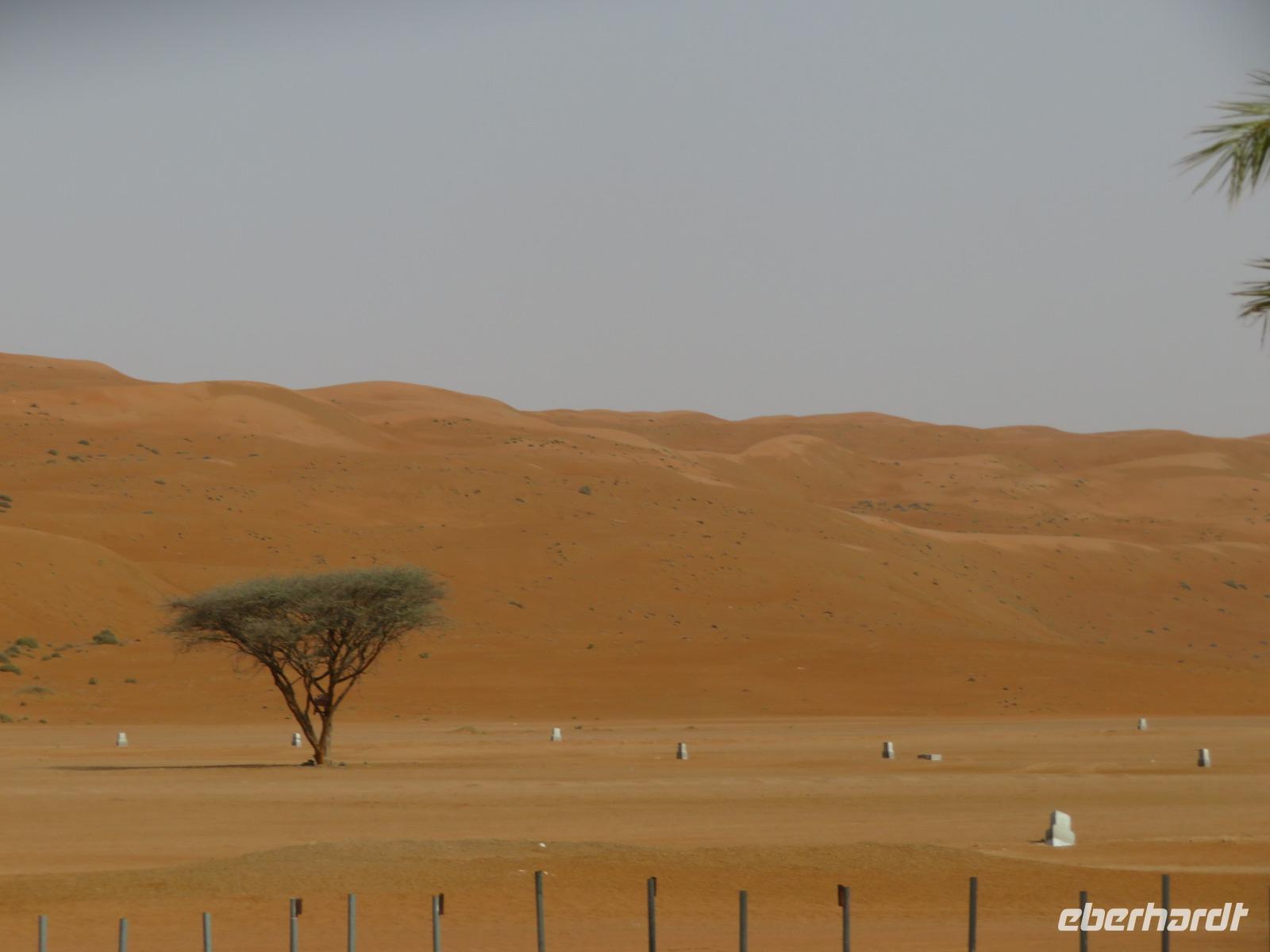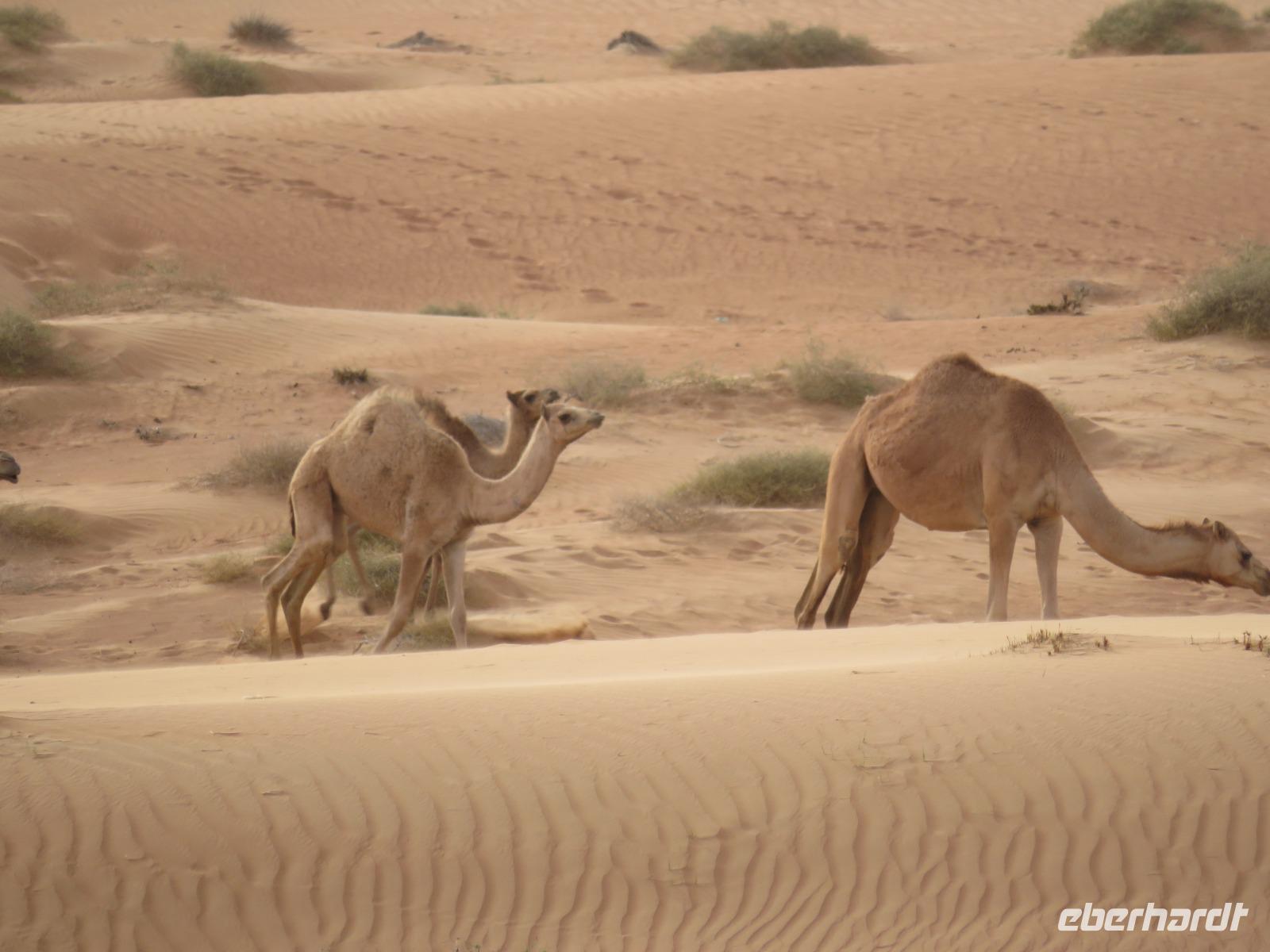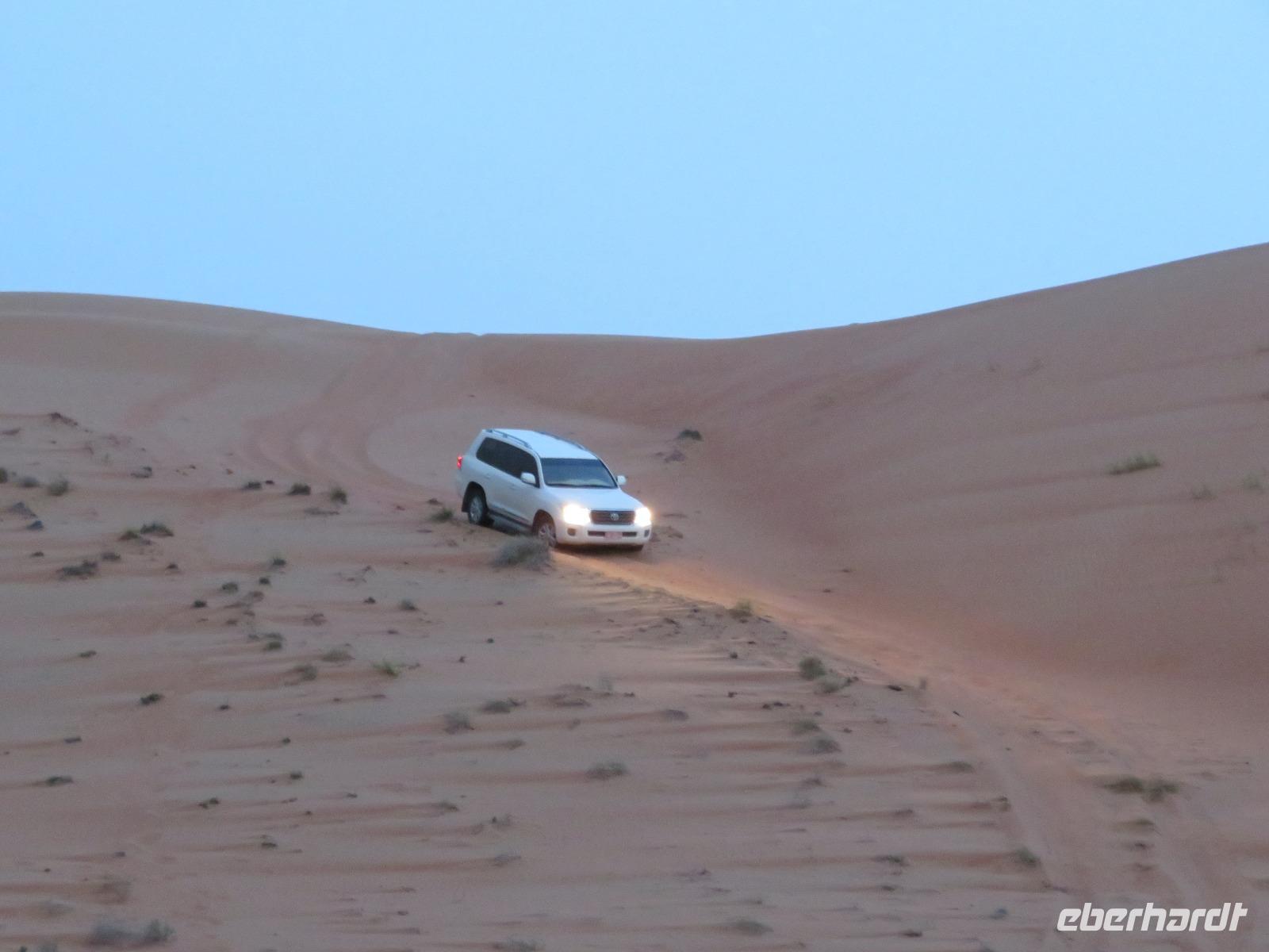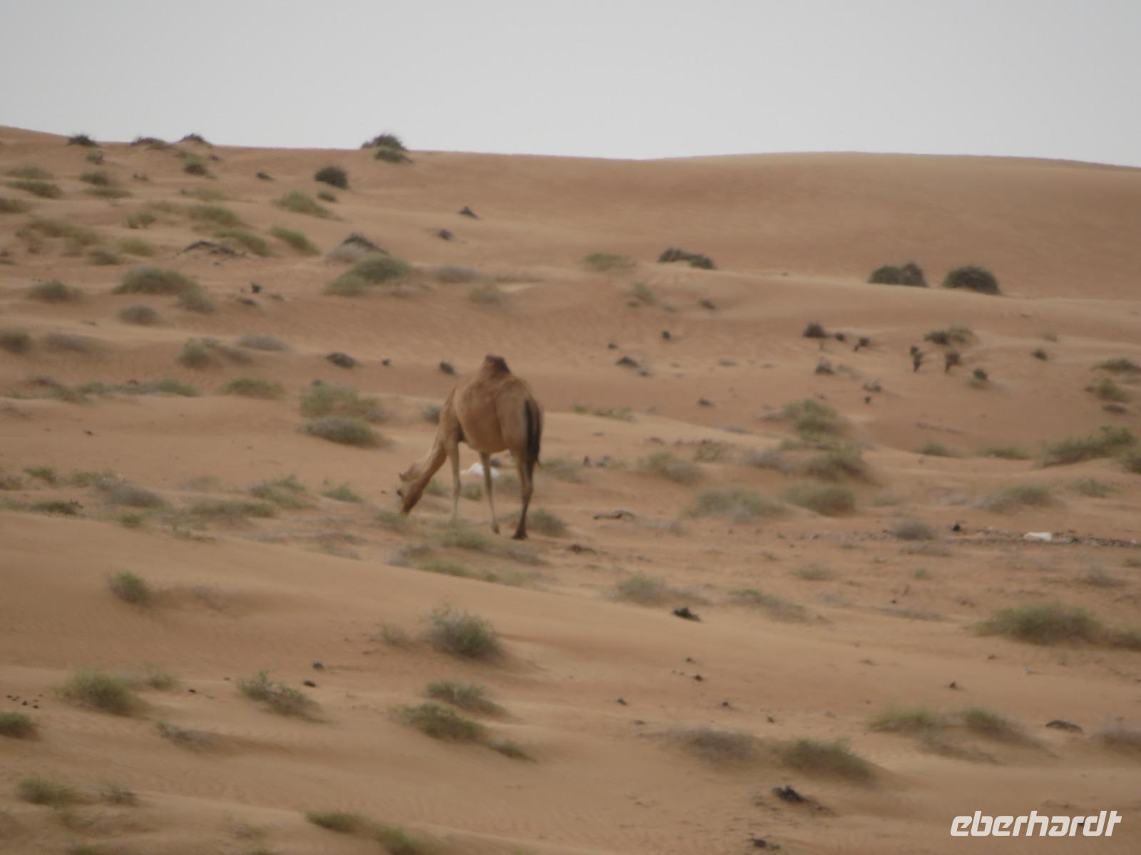 Und da sind Sie die ersten Wüstenschiffe - wie Kamele auch genannt werden. Geduldig lassen Sie das nun folgende Fotoshooting über sich ergehen. Nach kurzer Weiterfahrt erreichen wir unser Sama Al Wasil Camp. Mit Tee, omanischem Kaffee und natürlich Datteln werden wir herzlich begrüßt und beziehen einfach ausgestatteten Steinhäuschen. Nach einer kleinen Pause, geht es mit unseren Jeeps in die roten Sanddünen. Wir wundern uns das wir dafür andere Fahrer bekommen. Aber nein statt Dishdasha & Kummah tragen Amarr, Machmoud und Omar jetzt Jeans & TShirt. Wie bei einer kleinen Wüstenralley starten wir durch die Sanddünen, plötzlich war Jeep 2 verschwunden... steckengeblieben. Kein Problem er wurde durch Tawfik und die Fahrer schnell wieder aus dem Sand gebuddelt. Leider versteckte sich die Wüstensonne hinter dicken Wolken und es wurde nix mit dem geplanten Sundowner. Dafür verdunkelte sich der Himmel. Nun hiess es schnell zurück zum Camp. Wir schafften es gerade so bevor Sandsturm, Blitz & Donner über unser Camp hinwegfegten und gleich die Stromversorgung kappten. Abendessen im Schein von Laternen, Taschenlampen und Handylicht. Ein tolles Erlebnis...Kurz vom Schlafengehen ertönte ein kurzes Ahhhh durch das ganze Camp. Der Strom war wieder da, Licht zum duschen (die Bäder waren stockdunkel) und auch die Klimaanlagen nahmen Ihren Betrieb wieder auf. Nachtschwärmer konnten einen herrlichen Sternenhimmel in der Stille der Wüste bewundern.