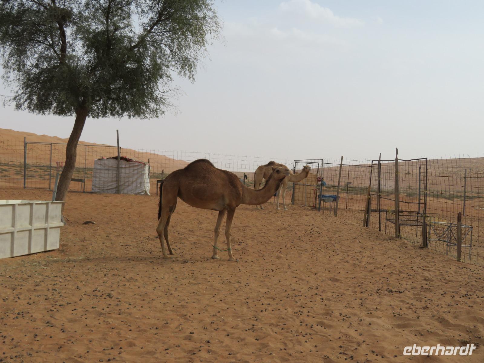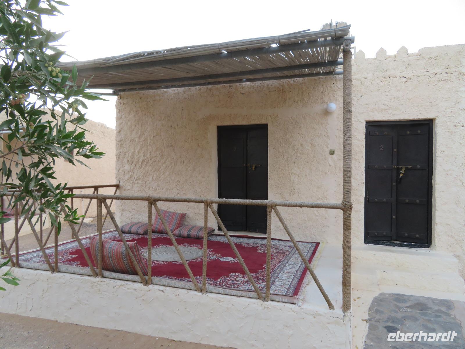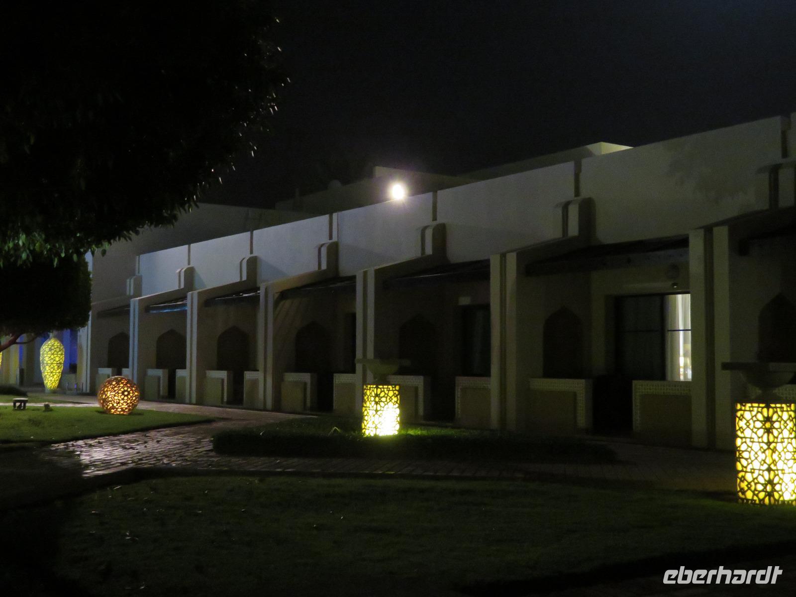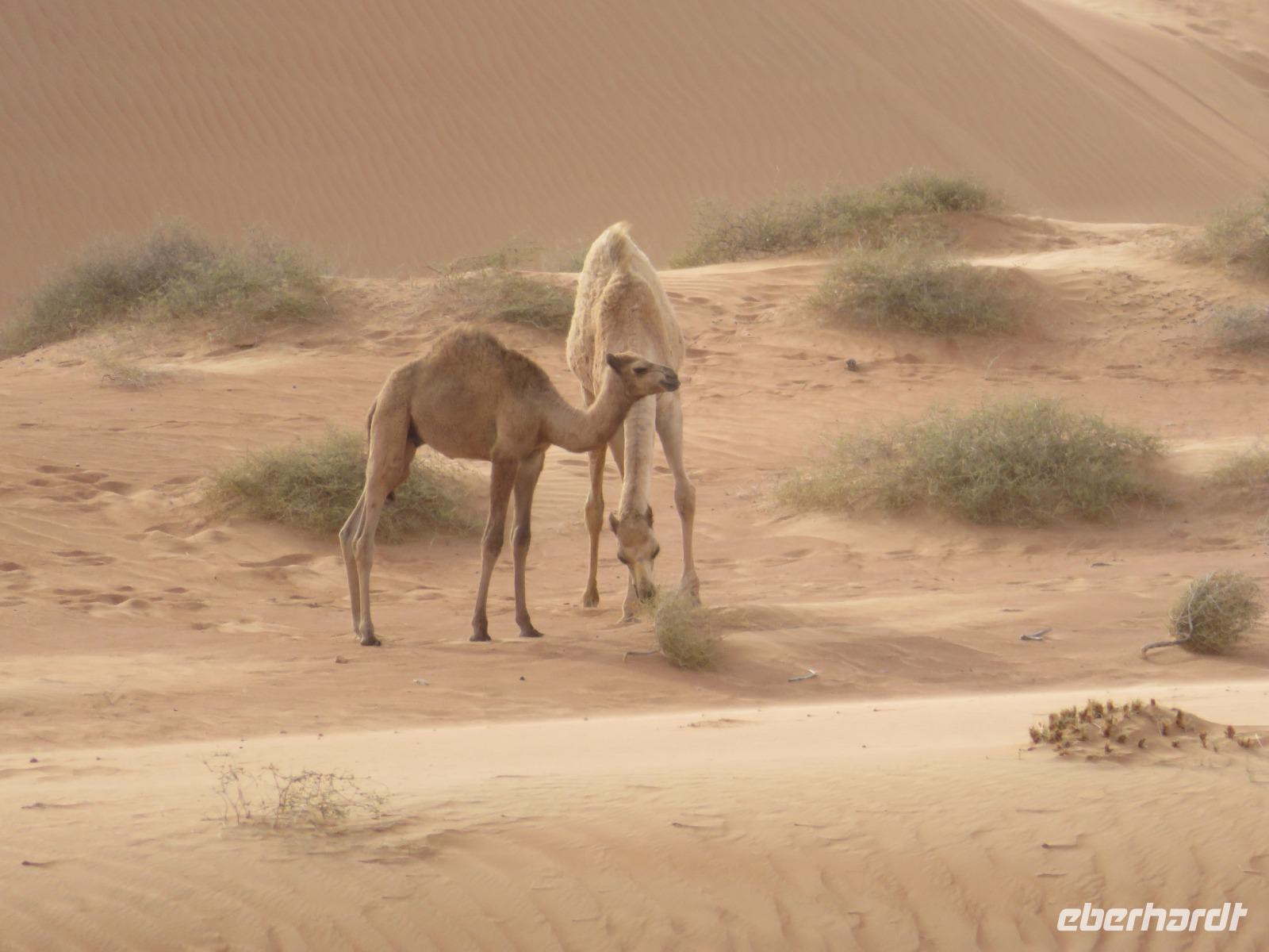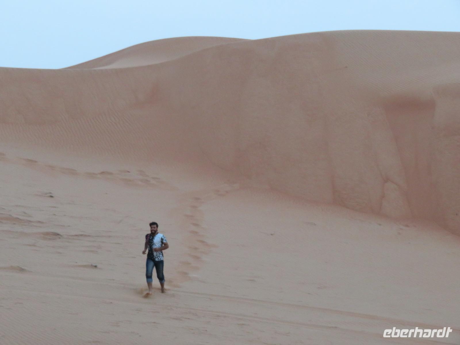 Und da sind Sie die ersten Wüstenschiffe - wie Kamele auch genannt werden. Geduldig lassen Sie das nun folgende Fotoshooting über sich ergehen. Nach kurzer Weiterfahrt erreichen wir unser Sama Al Wasil Camp. Mit Tee, omanischem Kaffee und natürlich Datteln werden wir herzlich begrüßt und beziehen einfach ausgestatteten Steinhäuschen. Nach einer kleinen Pause, geht es mit unseren Jeeps in die roten Sanddünen. Wir wundern uns das wir dafür andere Fahrer bekommen. Aber nein statt Dishdasha & Kummah tragen Amarr, Machmoud und Omar jetzt Jeans & TShirt. Wie bei einer kleinen Wüstenralley starten wir durch die Sanddünen, plötzlich war Jeep 2 verschwunden... steckengeblieben. Kein Problem er wurde durch Tawfik und die Fahrer schnell wieder aus dem Sand gebuddelt. Leider versteckte sich die Wüstensonne hinter dicken Wolken und es wurde nix mit dem geplanten Sundowner. Dafür verdunkelte sich der Himmel. Nun hiess es schnell zurück zum Camp. Wir schafften es gerade so bevor Sandsturm, Blitz & Donner über unser Camp hinwegfegten und gleich die Stromversorgung kappten. Abendessen im Schein von Laternen, Taschenlampen und Handylicht. Ein tolles Erlebnis...Kurz vom Schlafengehen ertönte ein kurzes Ahhhh durch das ganze Camp. Der Strom war wieder da, Licht zum duschen (die Bäder waren stockdunkel) und auch die Klimaanlagen nahmen Ihren Betrieb wieder auf. Nachtschwärmer konnten einen herrlichen Sternenhimmel in der Stille der Wüste bewundern.