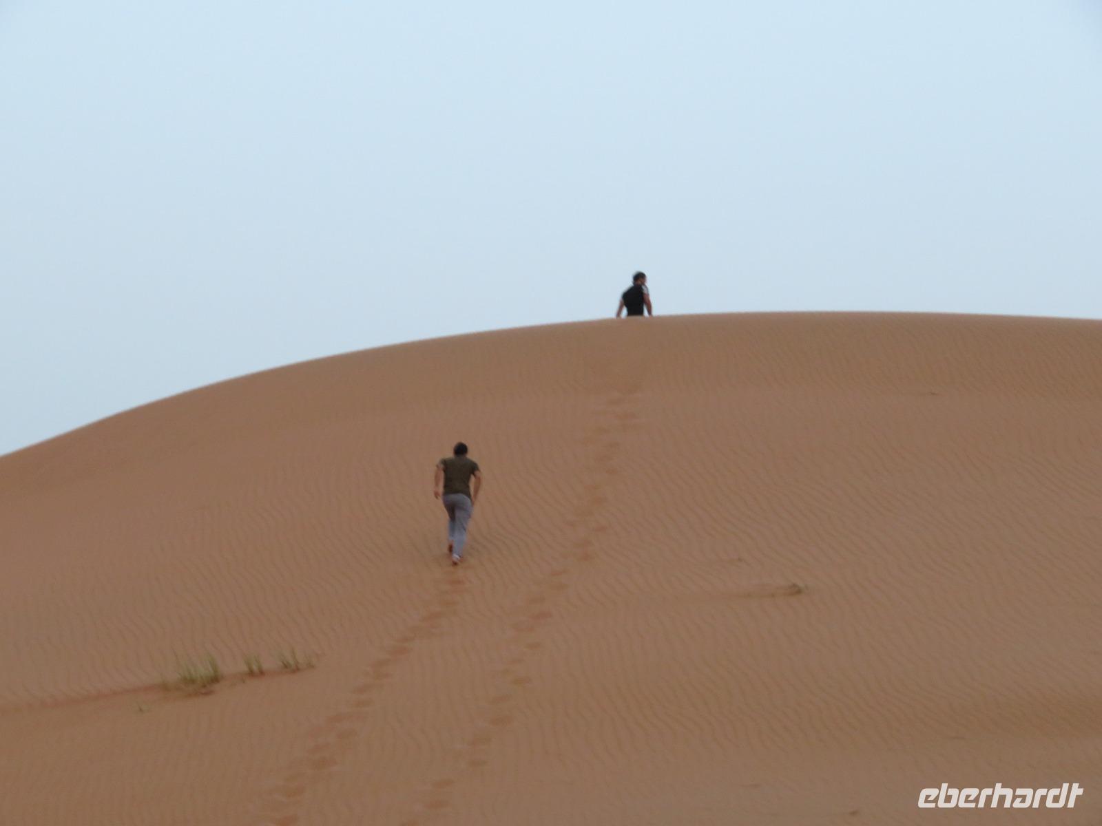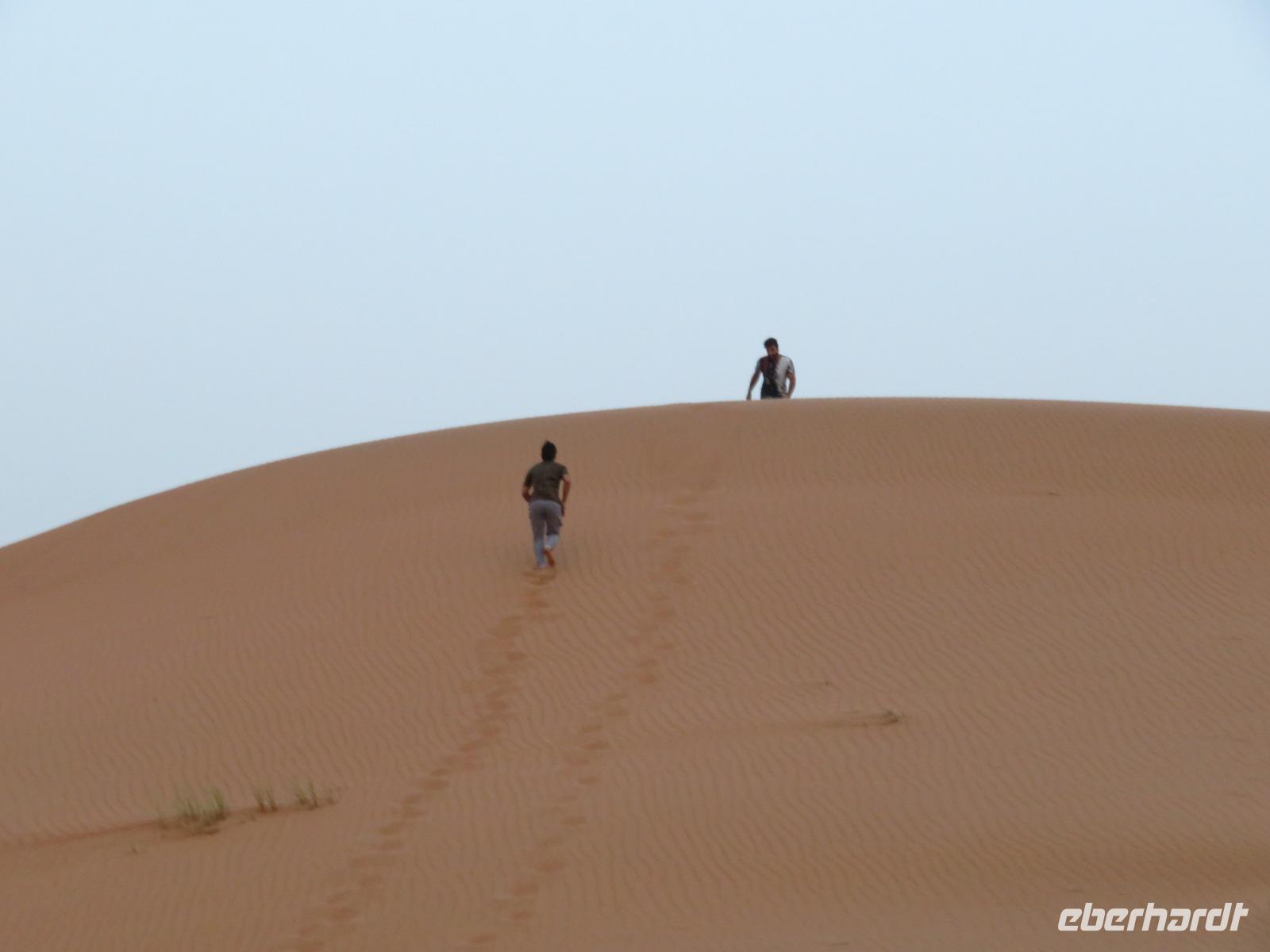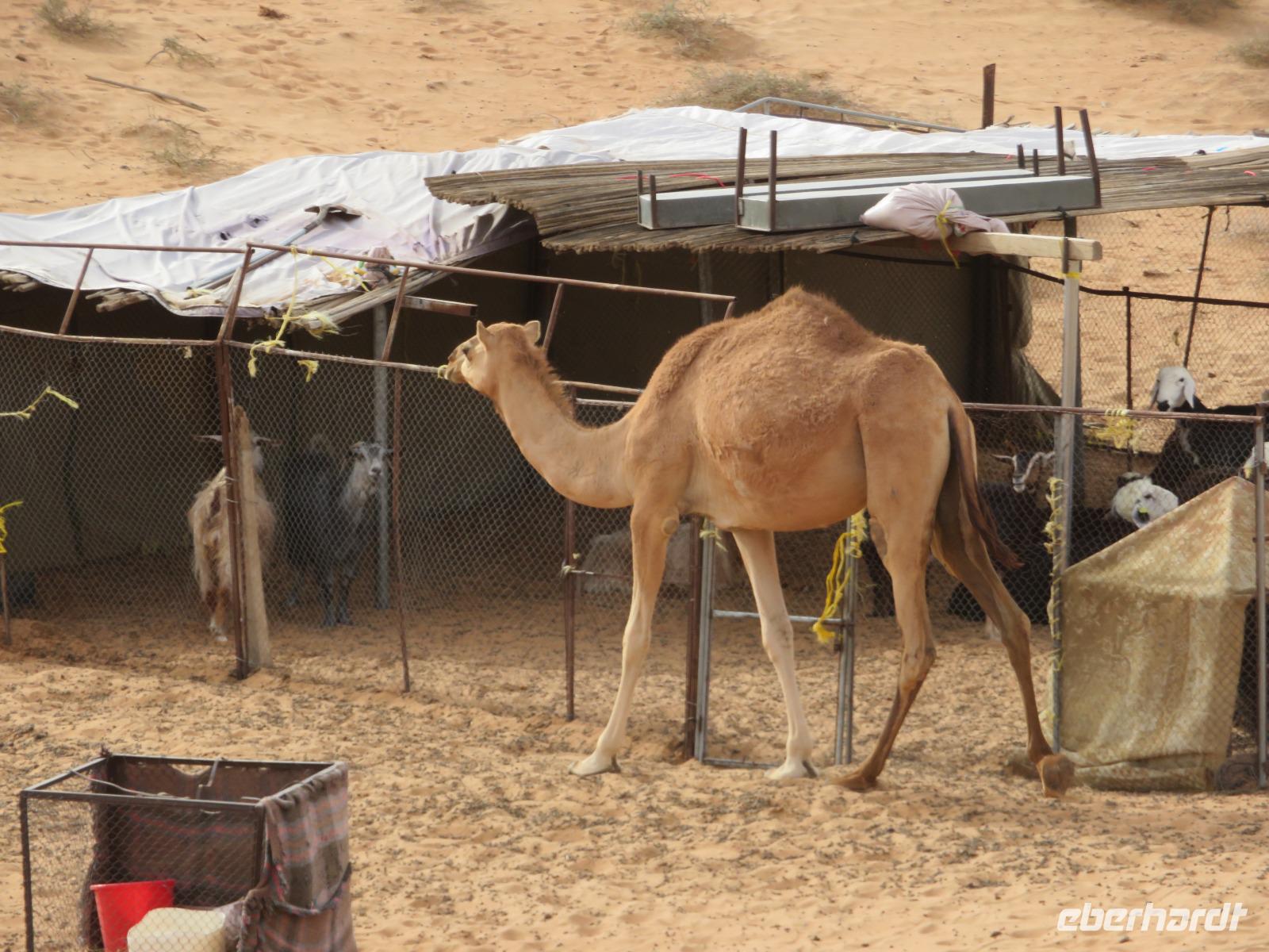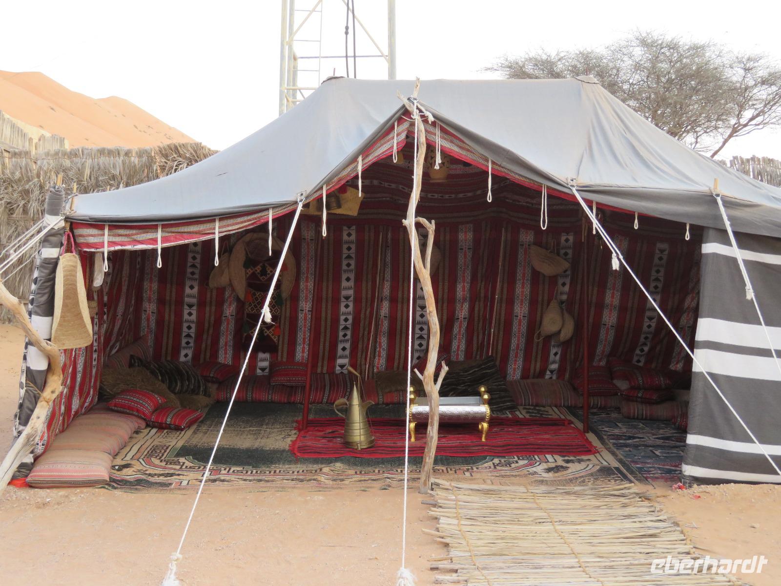 Und da sind Sie die ersten Wüstenschiffe - wie Kamele auch genannt werden. Geduldig lassen Sie das nun folgende Fotoshooting über sich ergehen. Nach kurzer Weiterfahrt erreichen wir unser Sama Al Wasil Camp. Mit Tee, omanischem Kaffee und natürlich Datteln werden wir herzlich begrüßt und beziehen einfach ausgestatteten Steinhäuschen. Nach einer kleinen Pause, geht es mit unseren Jeeps in die roten Sanddünen. Wir wundern uns das wir dafür andere Fahrer bekommen. Aber nein statt Dishdasha & Kummah tragen Amarr, Machmoud und Omar jetzt Jeans & TShirt. Wie bei einer kleinen Wüstenralley starten wir durch die Sanddünen, plötzlich war Jeep 2 verschwunden... steckengeblieben. Kein Problem er wurde durch Tawfik und die Fahrer schnell wieder aus dem Sand gebuddelt. Leider versteckte sich die Wüstensonne hinter dicken Wolken und es wurde nix mit dem geplanten Sundowner. Dafür verdunkelte sich der Himmel. Nun hiess es schnell zurück zum Camp. Wir schafften es gerade so bevor Sandsturm, Blitz & Donner über unser Camp hinwegfegten und gleich die Stromversorgung kappten. Abendessen im Schein von Laternen, Taschenlampen und Handylicht. Ein tolles Erlebnis...Kurz vom Schlafengehen ertönte ein kurzes Ahhhh durch das ganze Camp. Der Strom war wieder da, Licht zum duschen (die Bäder waren stockdunkel) und auch die Klimaanlagen nahmen Ihren Betrieb wieder auf. Nachtschwärmer konnten einen herrlichen Sternenhimmel in der Stille der Wüste bewundern.