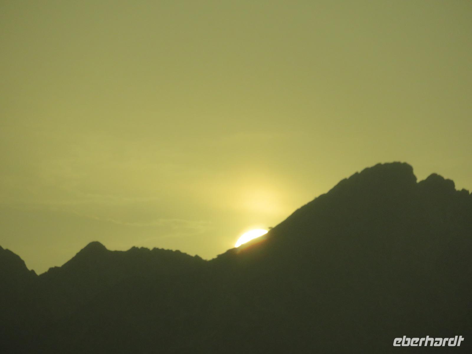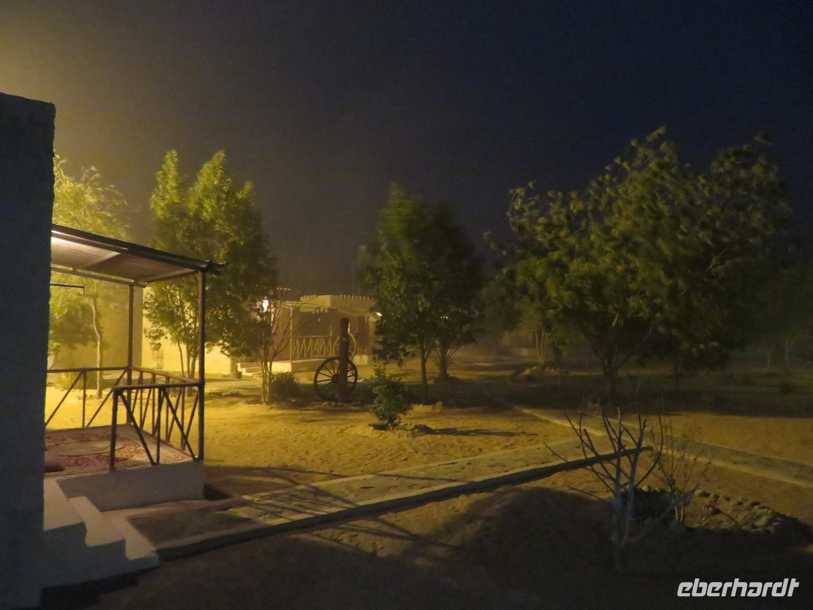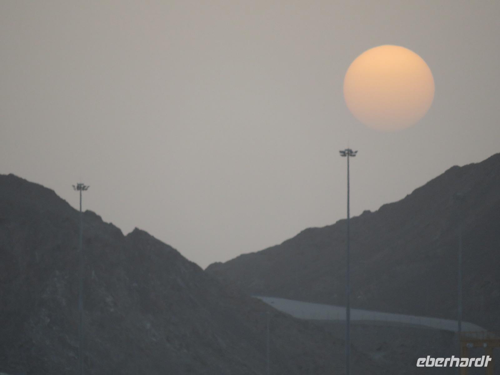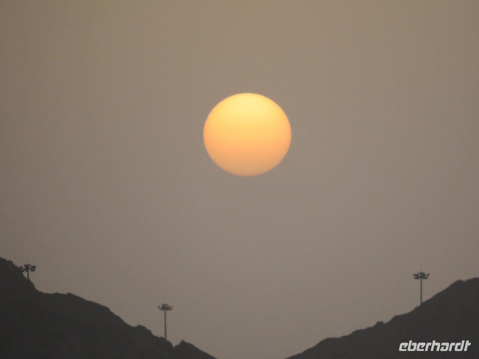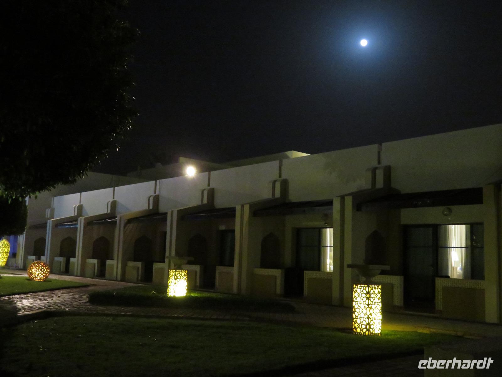 Und da sind Sie die ersten Wüstenschiffe - wie Kamele auch genannt werden. Geduldig lassen Sie das nun folgende Fotoshooting über sich ergehen. Nach kurzer Weiterfahrt erreichen wir unser Sama Al Wasil Camp. Mit Tee, omanischem Kaffee und natürlich Datteln werden wir herzlich begrüßt und beziehen einfach ausgestatteten Steinhäuschen. Nach einer kleinen Pause, geht es mit unseren Jeeps in die roten Sanddünen. Wir wundern uns das wir dafür andere Fahrer bekommen. Aber nein statt Dishdasha & Kummah tragen Amarr, Machmoud und Omar jetzt Jeans & TShirt. Wie bei einer kleinen Wüstenralley starten wir durch die Sanddünen, plötzlich war Jeep 2 verschwunden... steckengeblieben. Kein Problem er wurde durch Tawfik und die Fahrer schnell wieder aus dem Sand gebuddelt. Leider versteckte sich die Wüstensonne hinter dicken Wolken und es wurde nix mit dem geplanten Sundowner. Dafür verdunkelte sich der Himmel. Nun hiess es schnell zurück zum Camp. Wir schafften es gerade so bevor Sandsturm, Blitz & Donner über unser Camp hinwegfegten und gleich die Stromversorgung kappten. Abendessen im Schein von Laternen, Taschenlampen und Handylicht. Ein tolles Erlebnis...Kurz vom Schlafengehen ertönte ein kurzes Ahhhh durch das ganze Camp. Der Strom war wieder da, Licht zum duschen (die Bäder waren stockdunkel) und auch die Klimaanlagen nahmen Ihren Betrieb wieder auf. Nachtschwärmer konnten einen herrlichen Sternenhimmel in der Stille der Wüste bewundern.