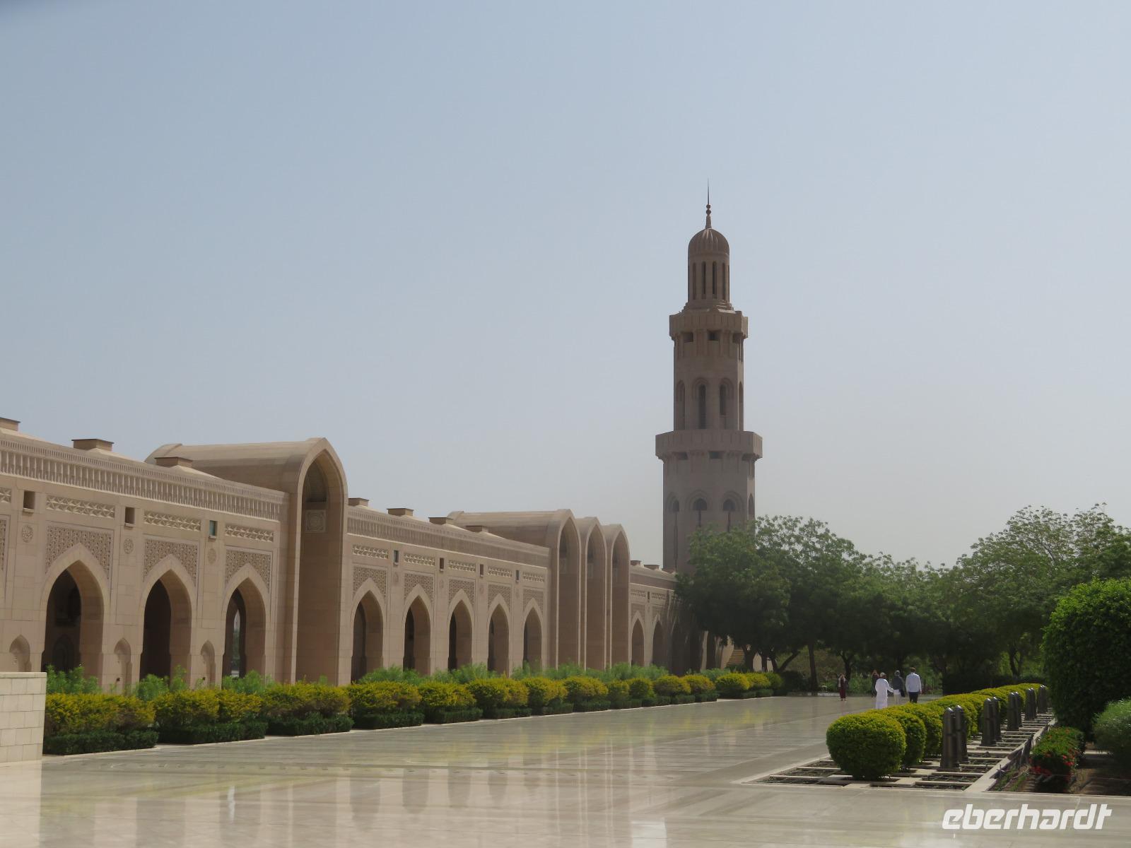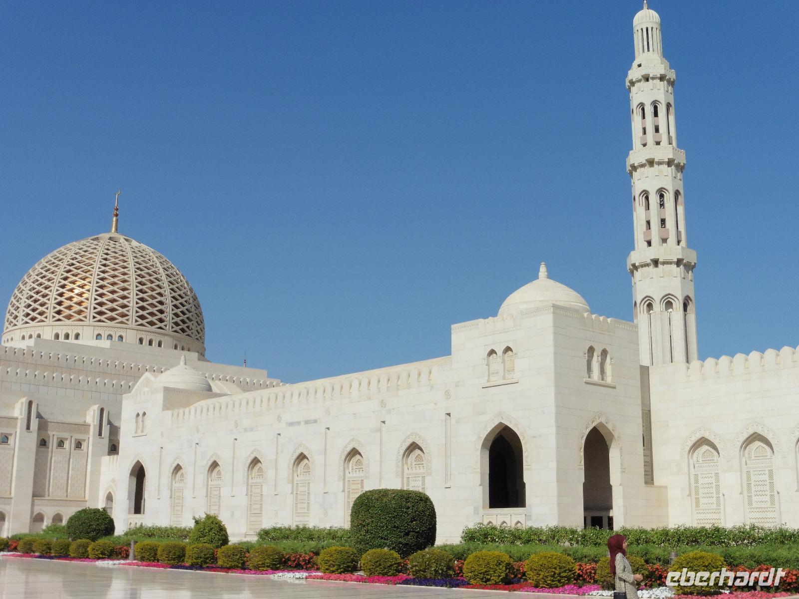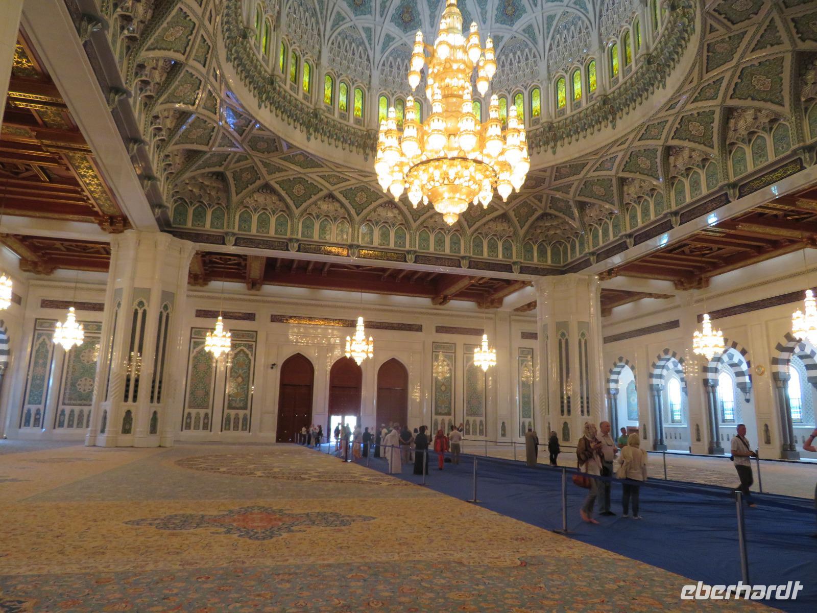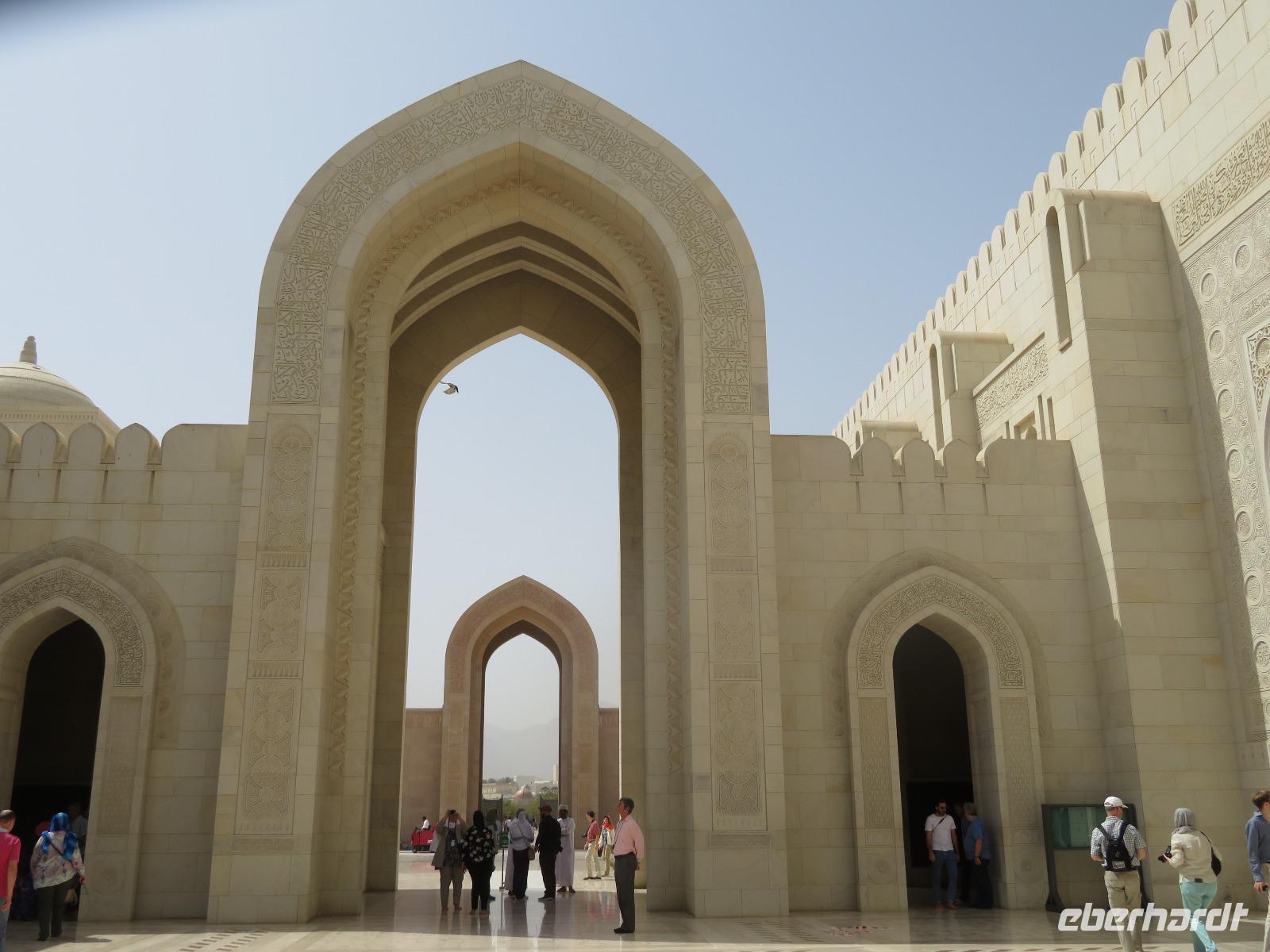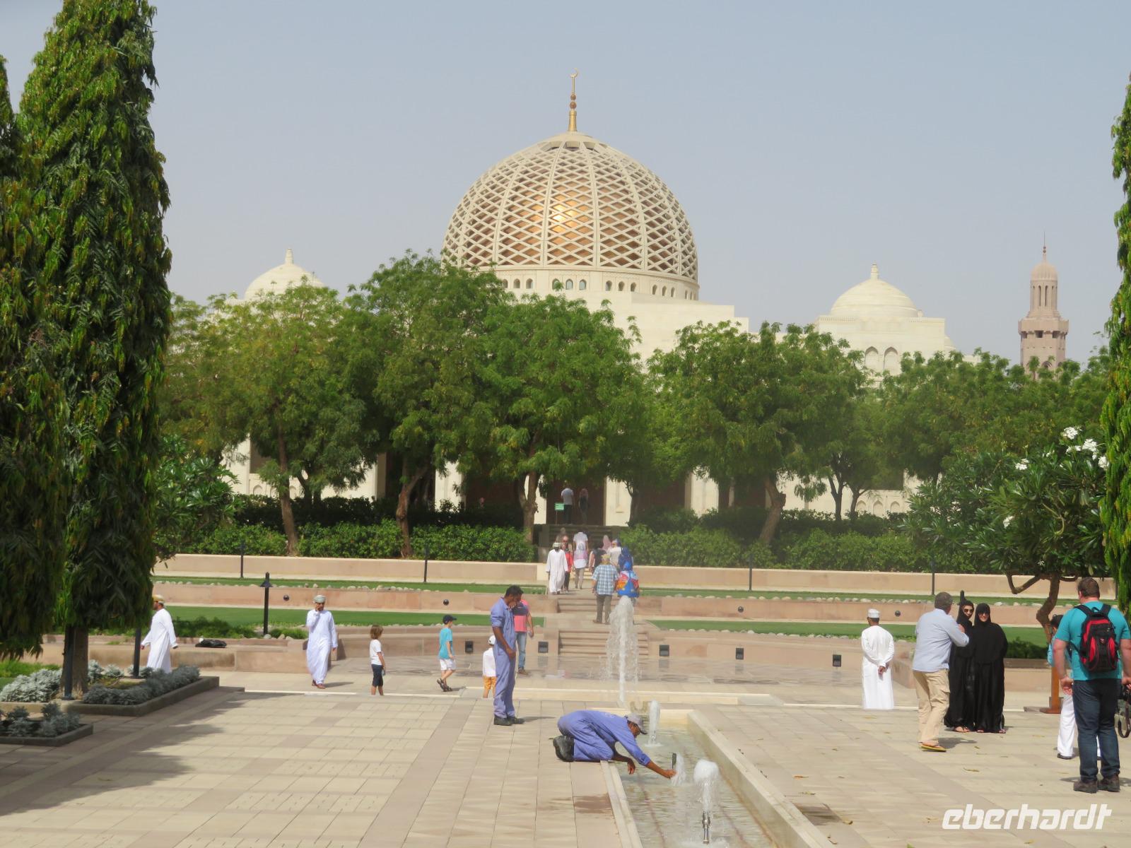Heute stand die Erkundung der omanischen Hauptstadt Muskat auf dem Programm. Zuerst war ein Besuch der 5 größten Moschee der Welt geplant, der berühmten Sultan Qaboos Moschee (Grand Moschee). Wunderschön in einem Park gelegen gehört die von 1995 bis 2001 erbaute Moschee zu den prächtigsten Bauten des Sultanats. Nach Kontrolle der ordnungsgemäßen Verschleierung der weiblichen Besucher ließen uns die Wächter passieren. Fast ehrfürchtig betreten wir die große Gebetshalle, in der 6.600 Gläubige Platz finden. Der knapp 4.300 m² große Teppich persicher Webkunst wurde von ca. 600 iranischen Frauen über 3 Jahre lang geknüpft und wiegt 47 Tonnen! In der Mitte der 34 m hohen Kuppel hängt ein 8 Tonnen schwerer Leuchter aus Swarovski-Kristall. Hier fühlt man sich klein. Tawfiq führt uns durch die Moschee, erklärt uns Sitten und Gebräuche und liest uns aus dem Koran vor.