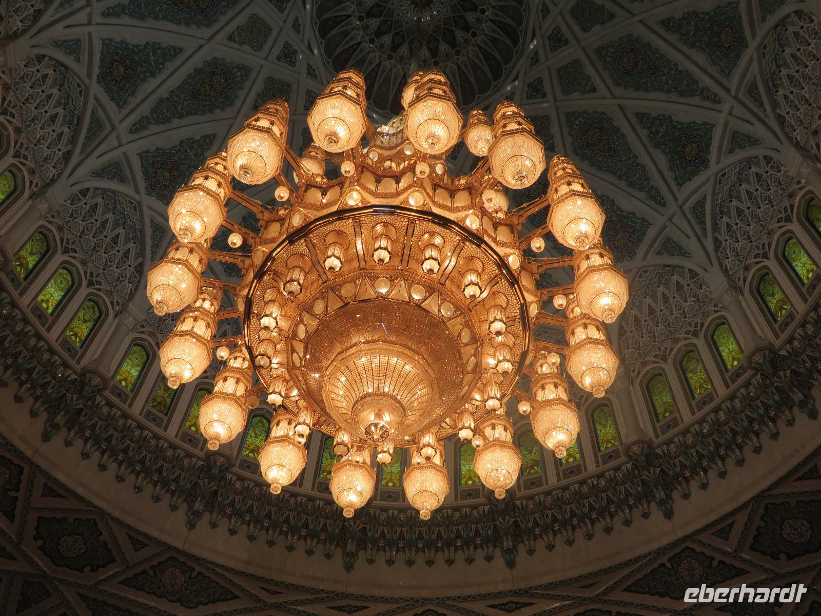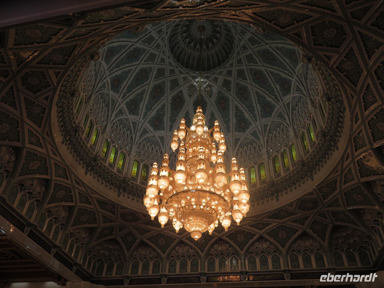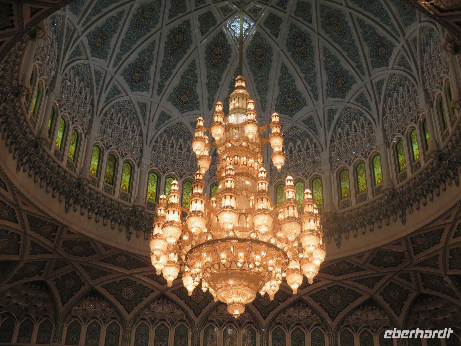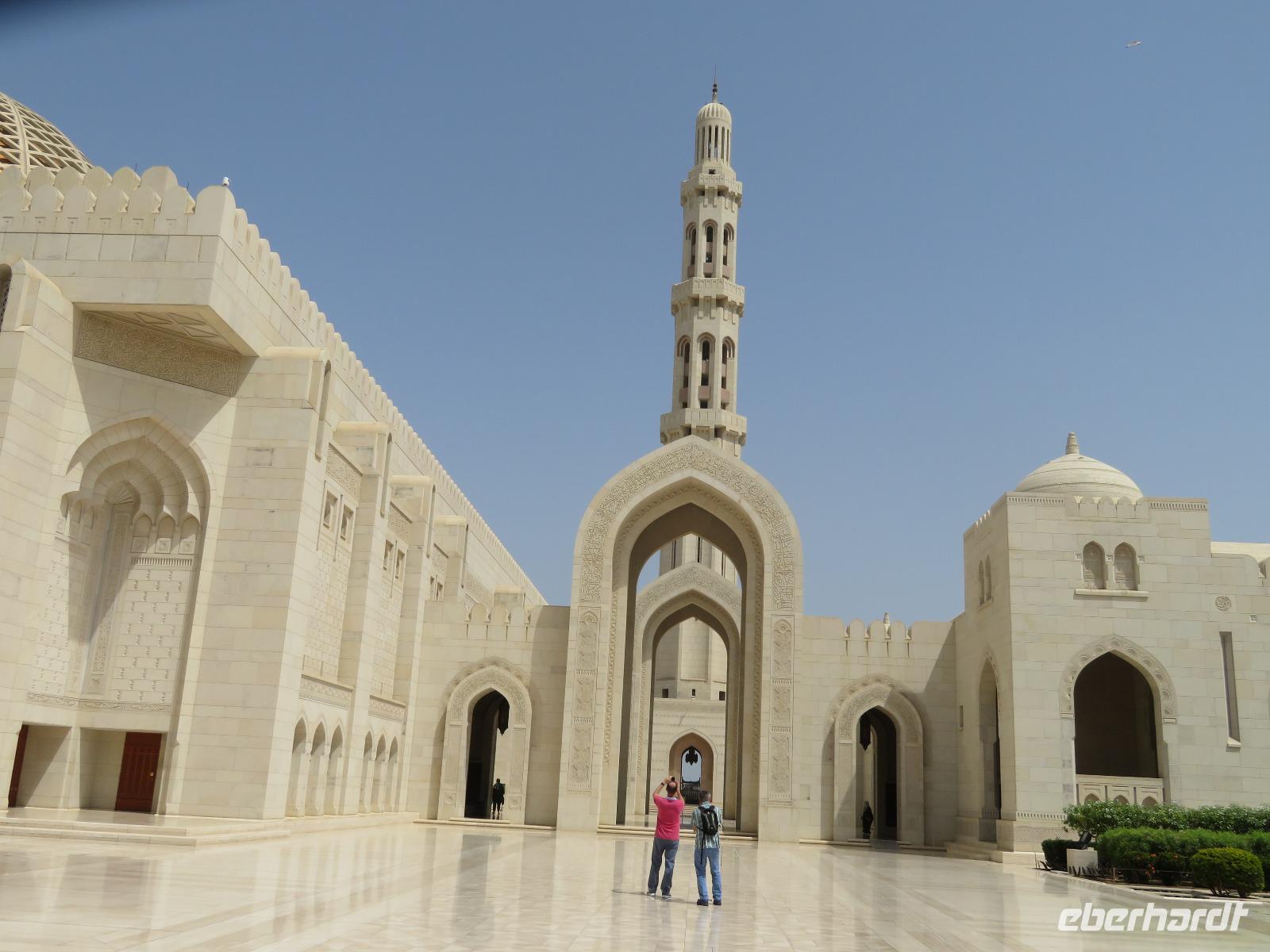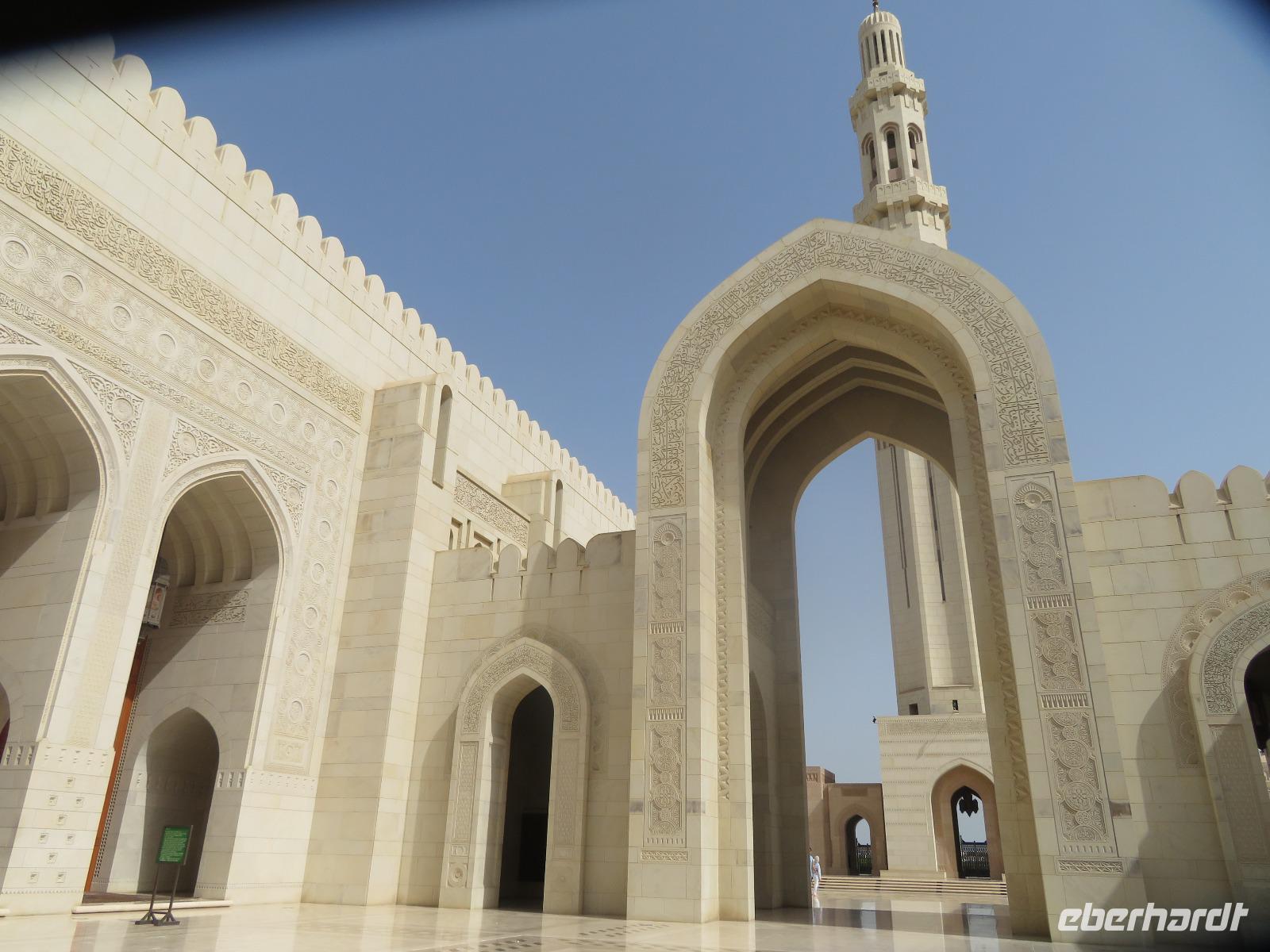 Heute stand die Erkundung der omanischen Hauptstadt Muskat auf dem Programm. Zuerst war ein Besuch der 5 größten Moschee der Welt geplant, der berühmten Sultan Qaboos Moschee (Grand Moschee). Wunderschön in einem Park gelegen gehört die von 1995 bis 2001 erbaute Moschee zu den prächtigsten Bauten des Sultanats. Nach Kontrolle der ordnungsgemäßen Verschleierung der weiblichen Besucher ließen uns die Wächter passieren. Fast ehrfürchtig betreten wir die große Gebetshalle, in der 6.600 Gläubige Platz finden. Der knapp 4.300 m² große Teppich persicher Webkunst wurde von ca. 600 iranischen Frauen über 3 Jahre lang geknüpft und wiegt 47 Tonnen! In der Mitte der 34 m hohen Kuppel hängt ein 8 Tonnen schwerer Leuchter aus Swarovski-Kristall. Hier fühlt man sich klein. Tawfiq führt uns durch die Moschee, erklärt uns Sitten und Gebräuche und liest uns aus dem Koran vor.