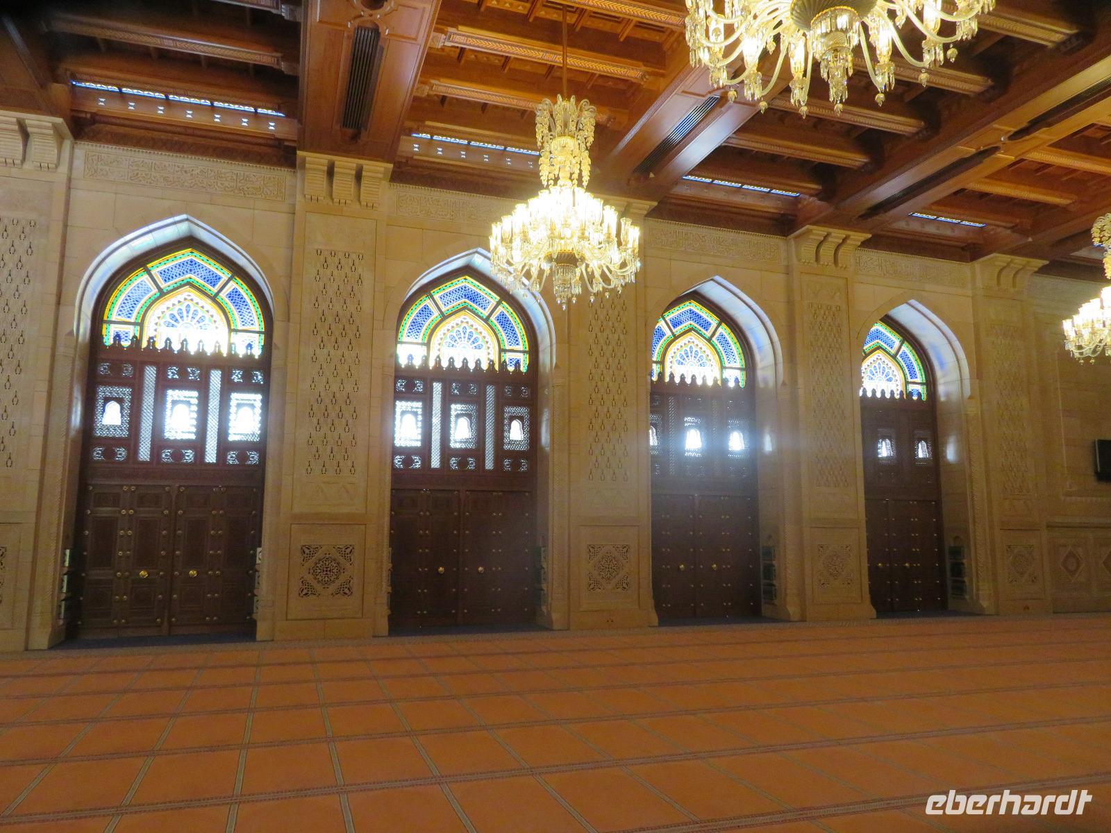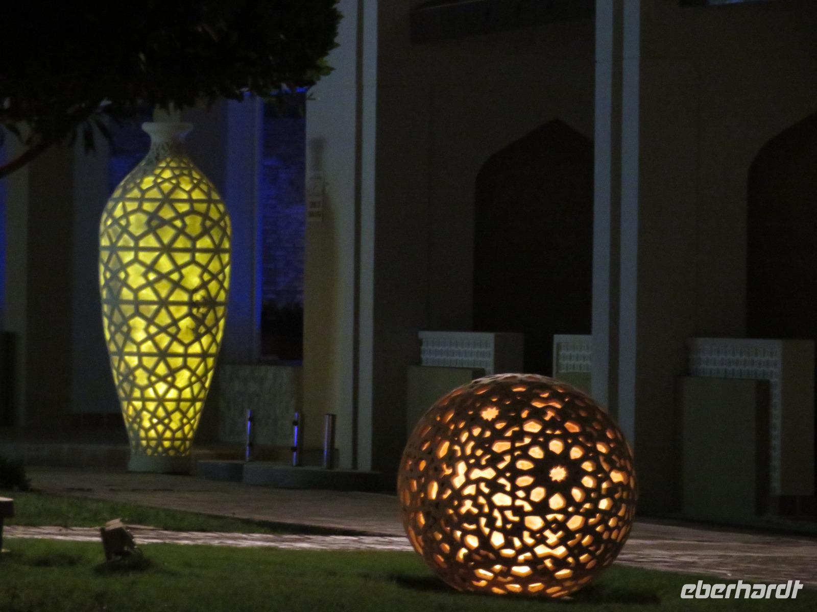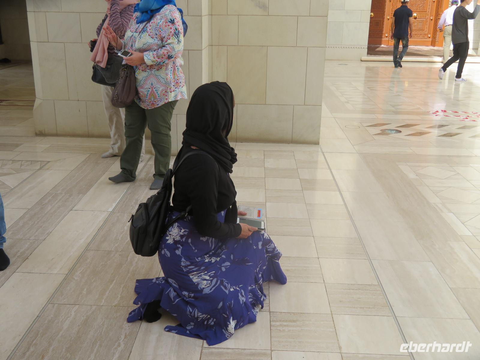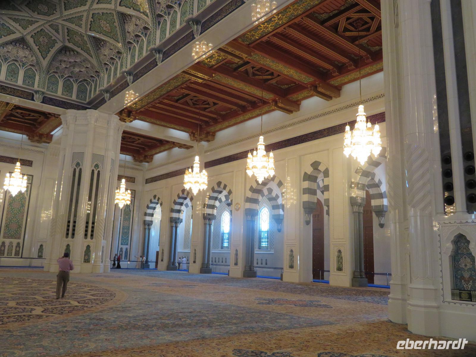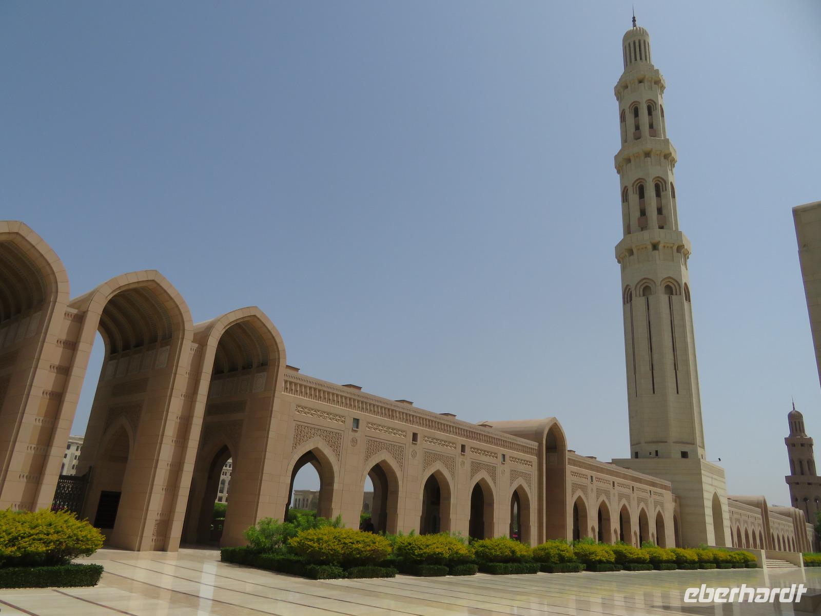 Heute stand die Erkundung der omanischen Hauptstadt Muskat auf dem Programm. Zuerst war ein Besuch der 5 größten Moschee der Welt geplant, der berühmten Sultan Qaboos Moschee (Grand Moschee). Wunderschön in einem Park gelegen gehört die von 1995 bis 2001 erbaute Moschee zu den prächtigsten Bauten des Sultanats. Nach Kontrolle der ordnungsgemäßen Verschleierung der weiblichen Besucher ließen uns die Wächter passieren. Fast ehrfürchtig betreten wir die große Gebetshalle, in der 6.600 Gläubige Platz finden. Der knapp 4.300 m² große Teppich persicher Webkunst wurde von ca. 600 iranischen Frauen über 3 Jahre lang geknüpft und wiegt 47 Tonnen! In der Mitte der 34 m hohen Kuppel hängt ein 8 Tonnen schwerer Leuchter aus Swarovski-Kristall. Hier fühlt man sich klein. Tawfiq führt uns durch die Moschee, erklärt uns Sitten und Gebräuche und liest uns aus dem Koran vor.