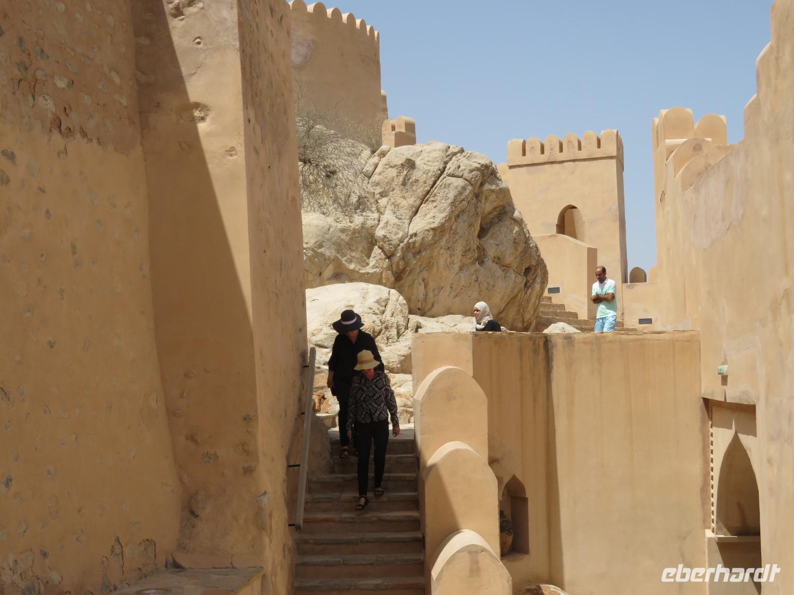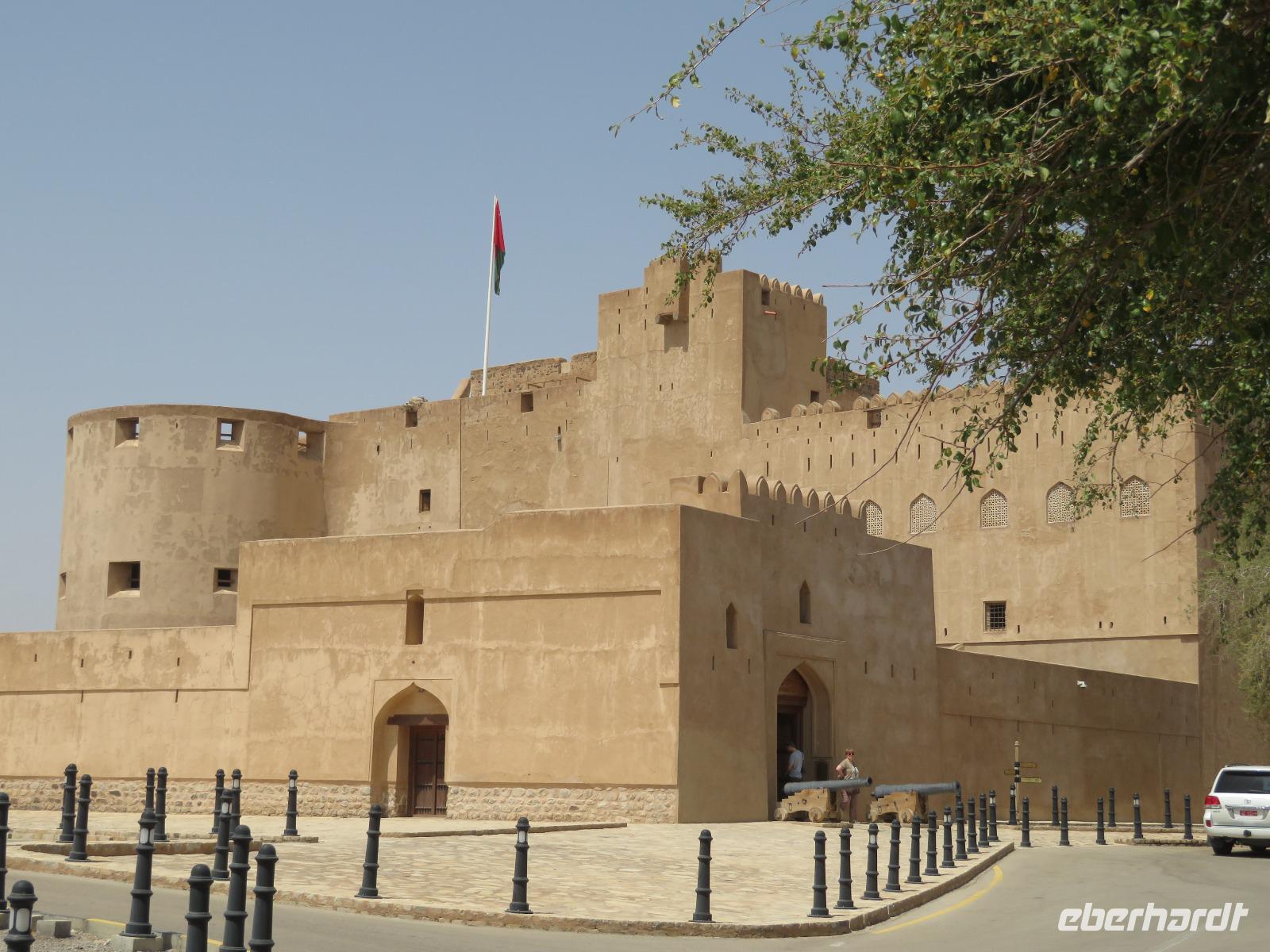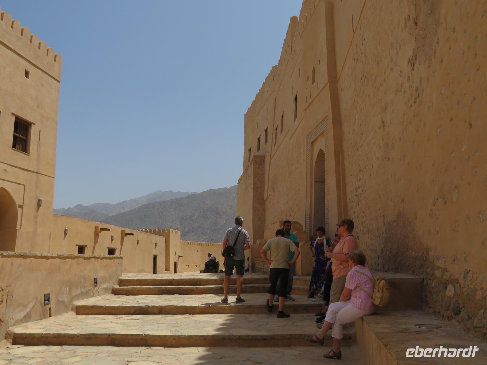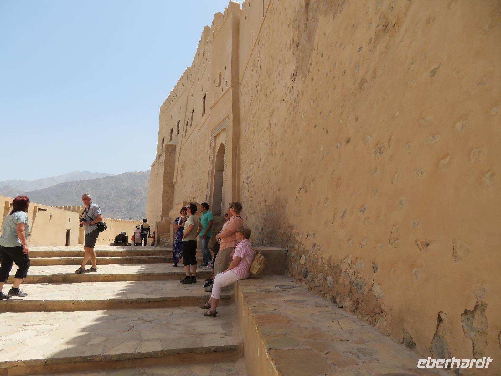 Bei strahlendem Sonnenschein starteten wir zu Schloss Jabrin. Das wie eine Festung wirkende Schloss wurde 1670 unter Bil'arub bin Sultan al- Ya'aruba erbaut, der auch 1688 zum Iman gewählt wurde. Er verlegte die Hauptstadt des Omans nach Nizwa und residierte auf Jarbin. Mit viel Liebe zum Detail wurde es im 20. Jahrhundert restauriert. Das Schloss zeugt von einer hohen handwerklichen Baukunst der damaligen Erbauer, fasziniert durch reiche Ausstattung der Räume mit prachtvoll geschnitzten und bemalten Deckenverzierungen, maurischen Bögen und zeitgenössischem Mobiliar.