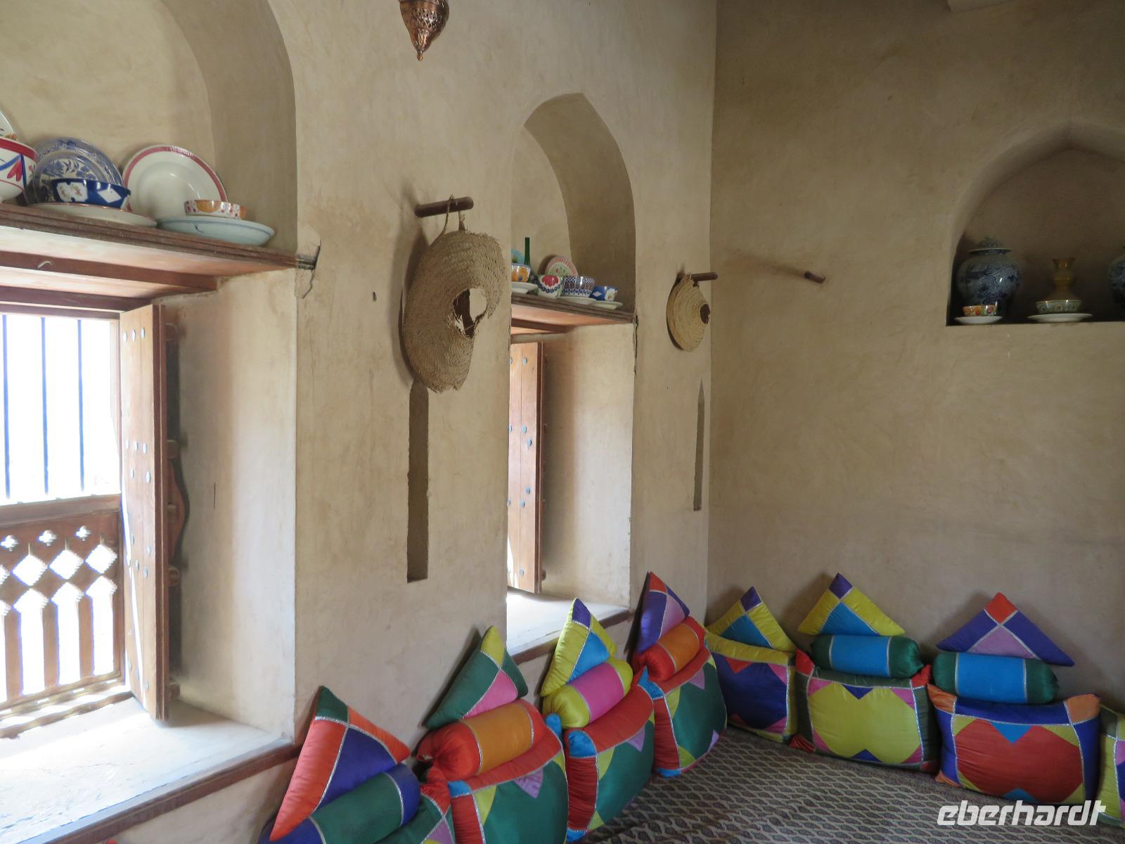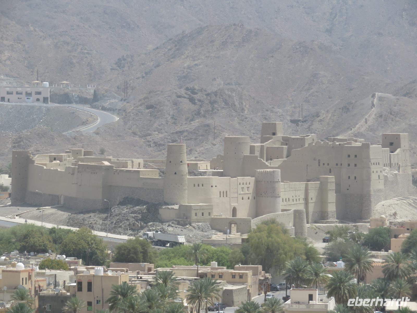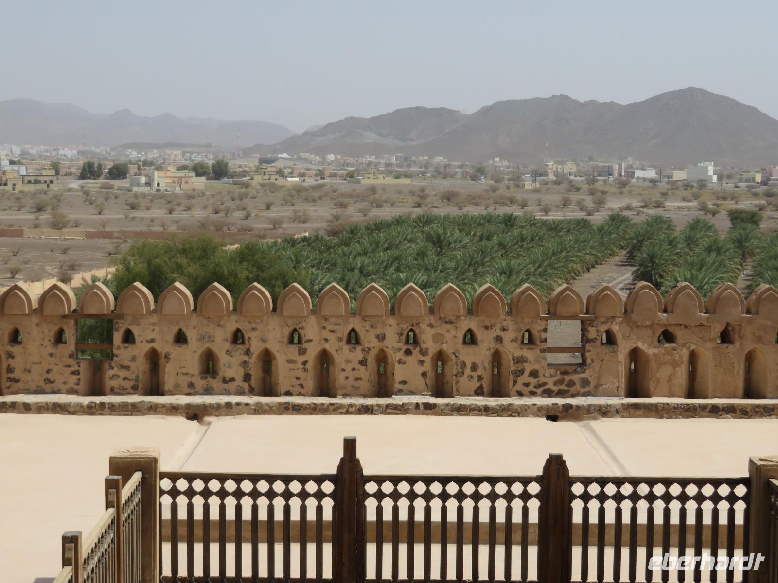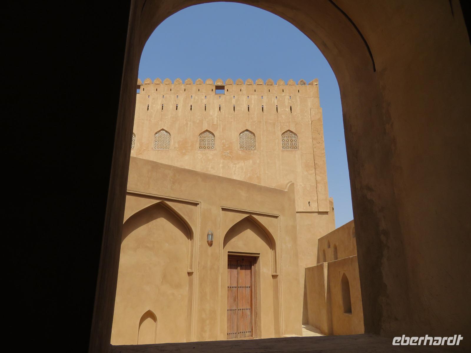 Bei strahlendem Sonnenschein starteten wir zu Schloss Jabrin. Das wie eine Festung wirkende Schloss wurde 1670 unter Bil'arub bin Sultan al- Ya'aruba erbaut, der auch 1688 zum Iman gewählt wurde. Er verlegte die Hauptstadt des Omans nach Nizwa und residierte auf Jarbin. Mit viel Liebe zum Detail wurde es im 20. Jahrhundert restauriert. Das Schloss zeugt von einer hohen handwerklichen Baukunst der damaligen Erbauer, fasziniert durch reiche Ausstattung der Räume mit prachtvoll geschnitzten und bemalten Deckenverzierungen, maurischen Bögen und zeitgenössischem Mobiliar.