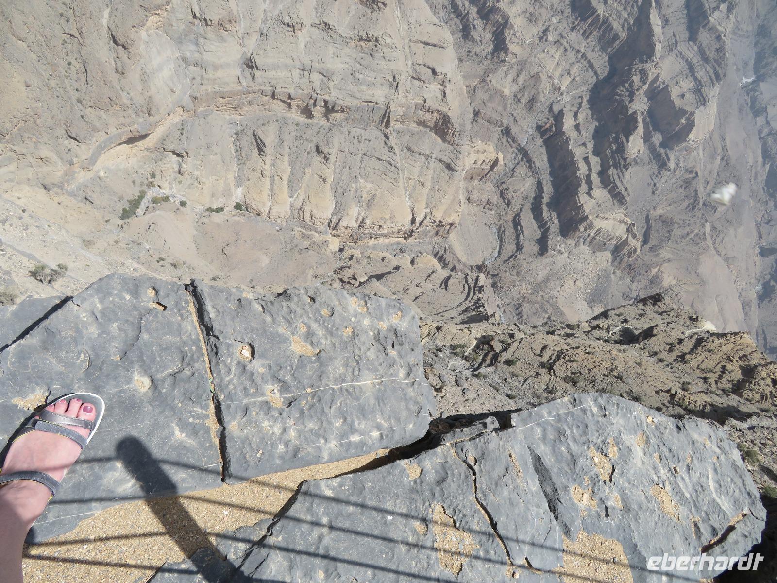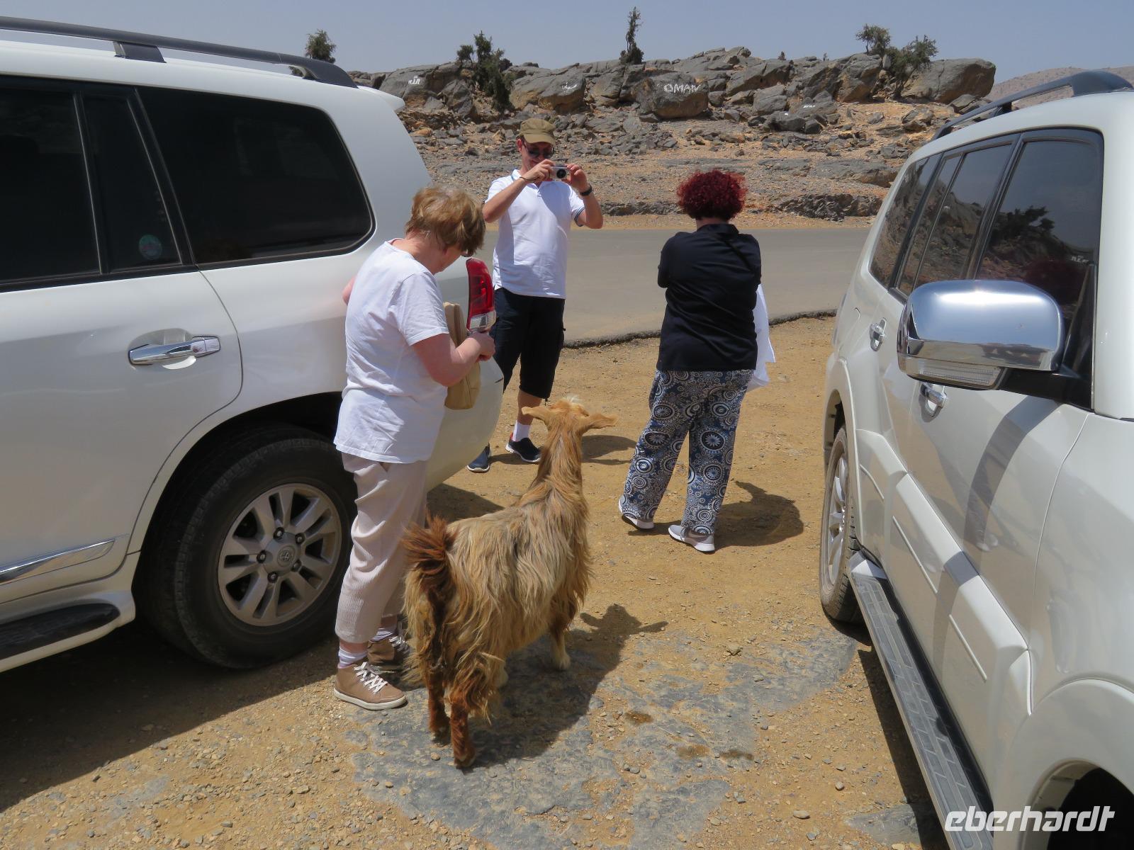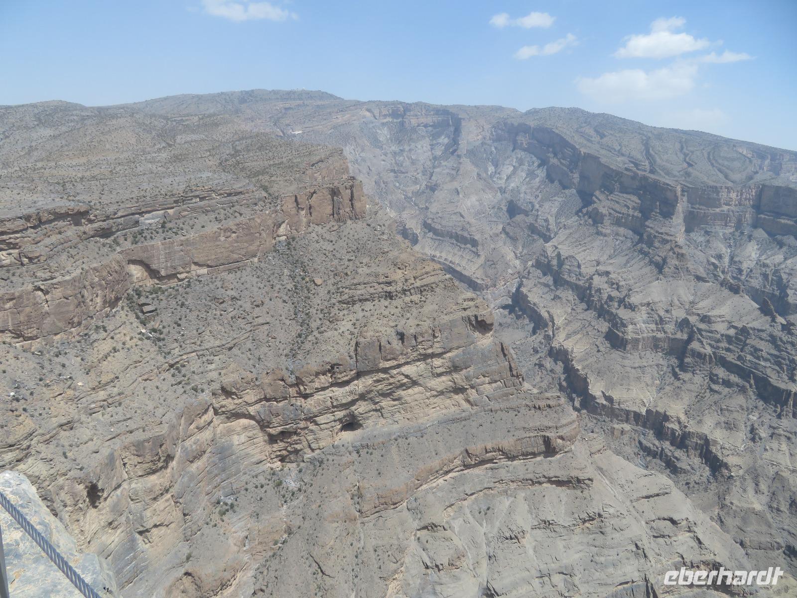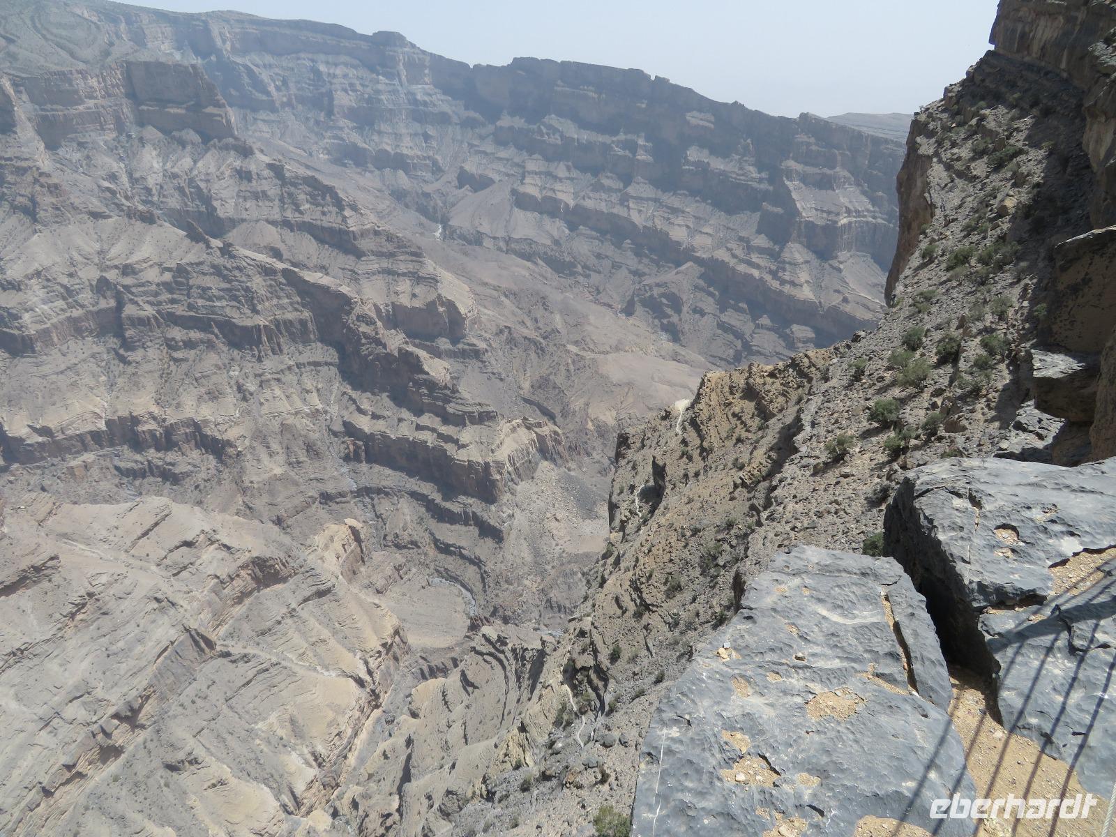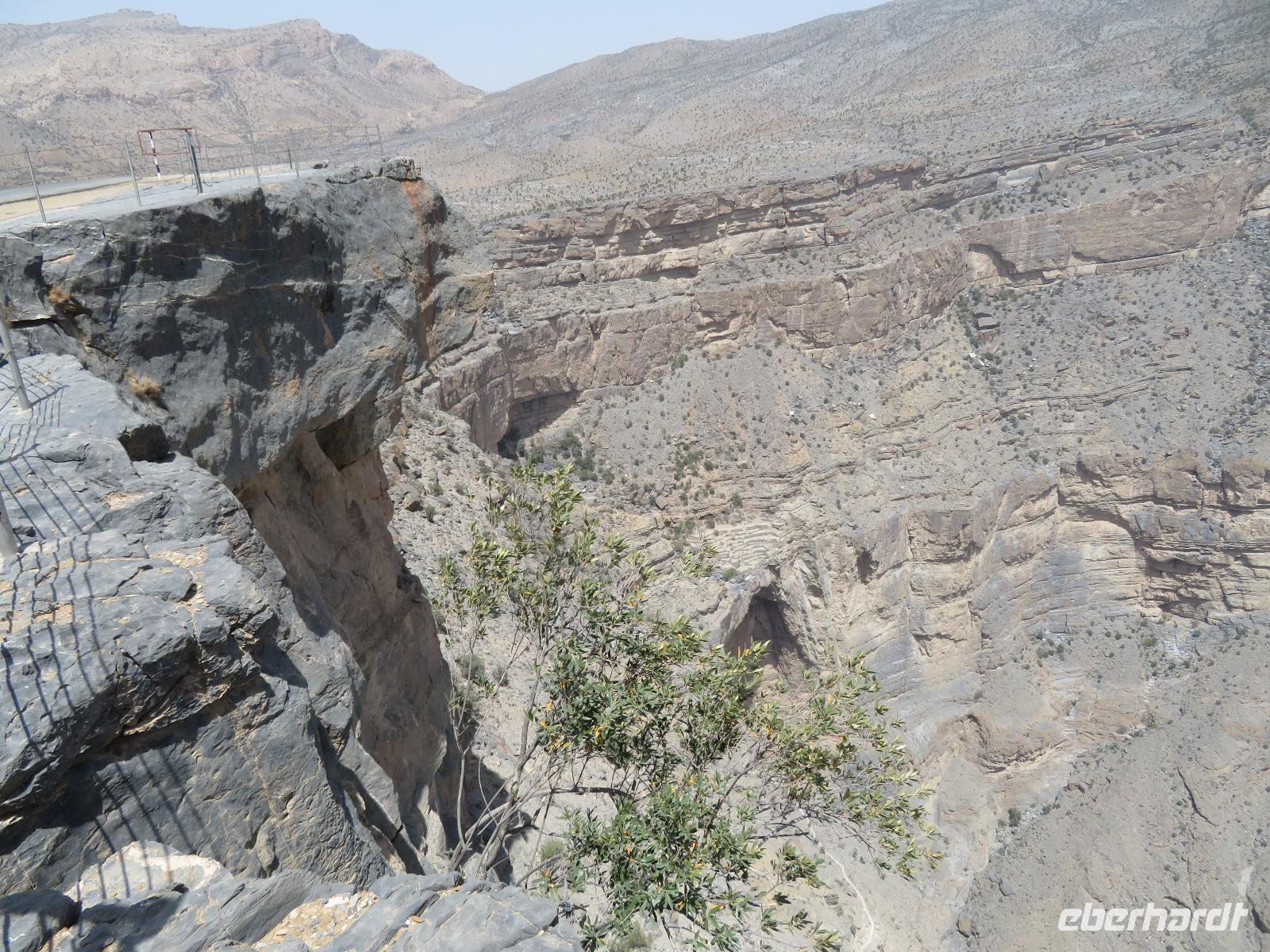 Weiter geht es off Road weiter bis auf 2.200 Meter zu einem Hochplateau an dessen Rand die Felsen zu einer zerklüfteten Schlucht abbrechen. Vom Aussichtspunkt eröffnet sich ein grandioser Blick in den fast 1000 Meter tiefen Grand Canyon - Jebel Shams mit 3009m der höchste Berg Omans. Nachdem wir ausgiebig fotografiert, alle herumlaufende Ziegen gefüttert und leider den lt. GPS vorhandenen GeoCash mit vereinten Kräften leider nicht gefunden haben, treten wir die Rückfahrt in Richtung Al Hamra an.