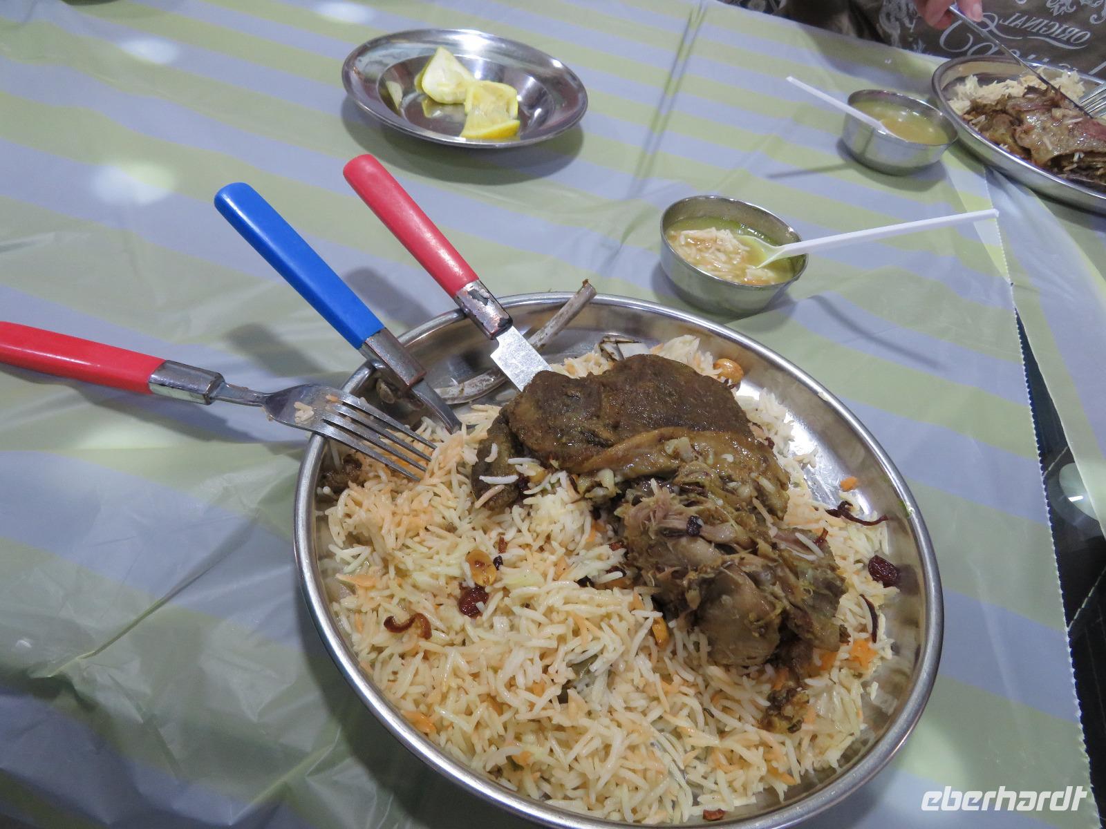 Unsere Mittagspause verbringen wir in einem typischen omanischen Restaurant. Tawfiq hat uns empfohlen, unbedingt Ziege auf omanische Art zu probieren.