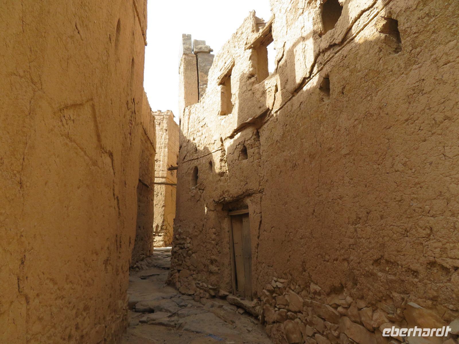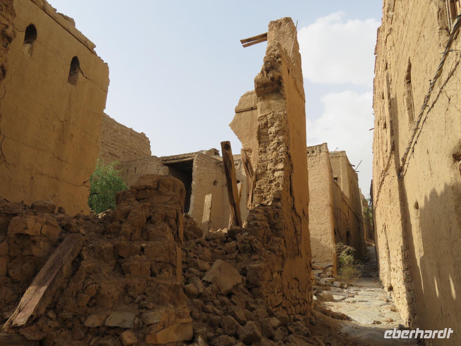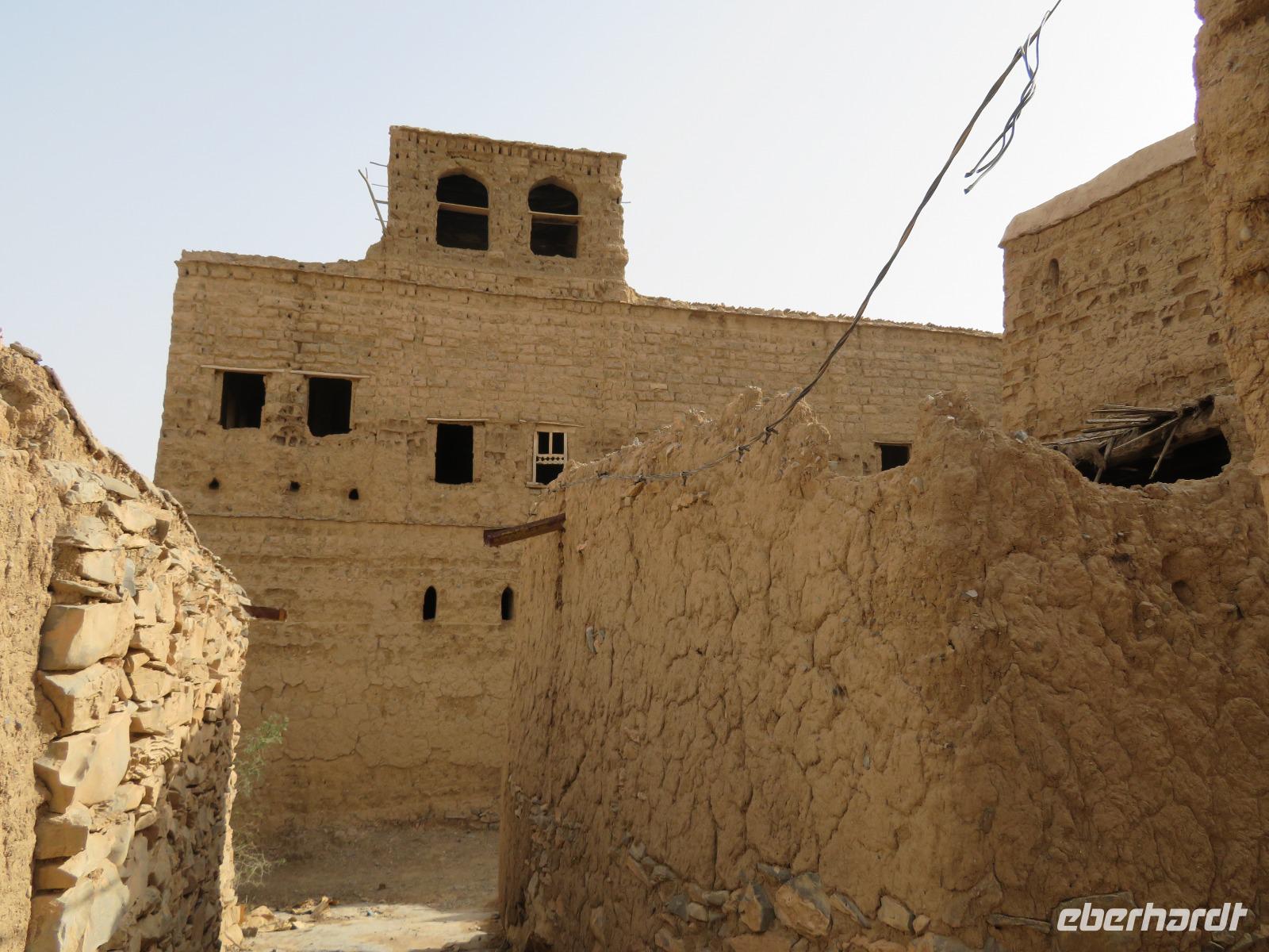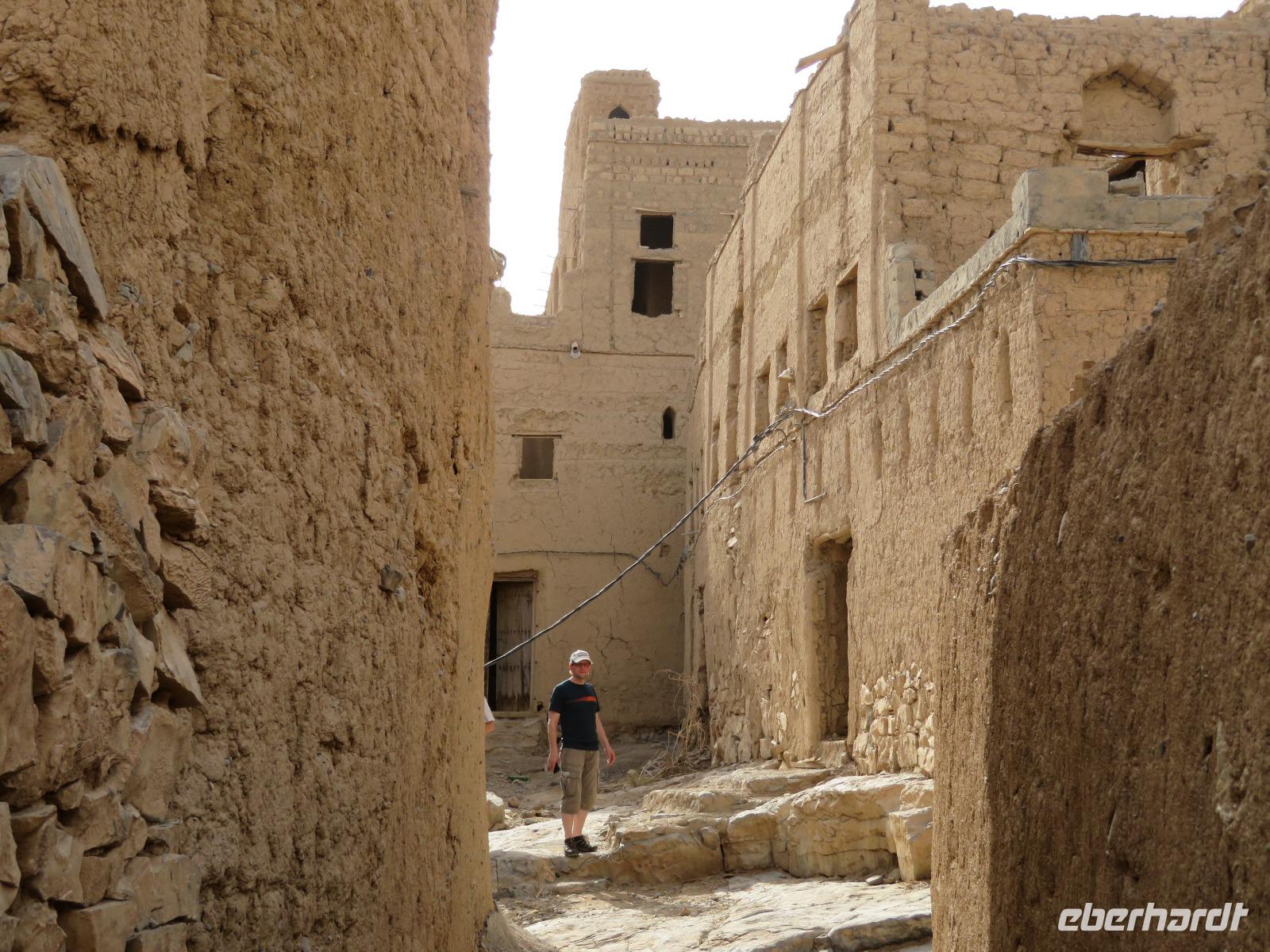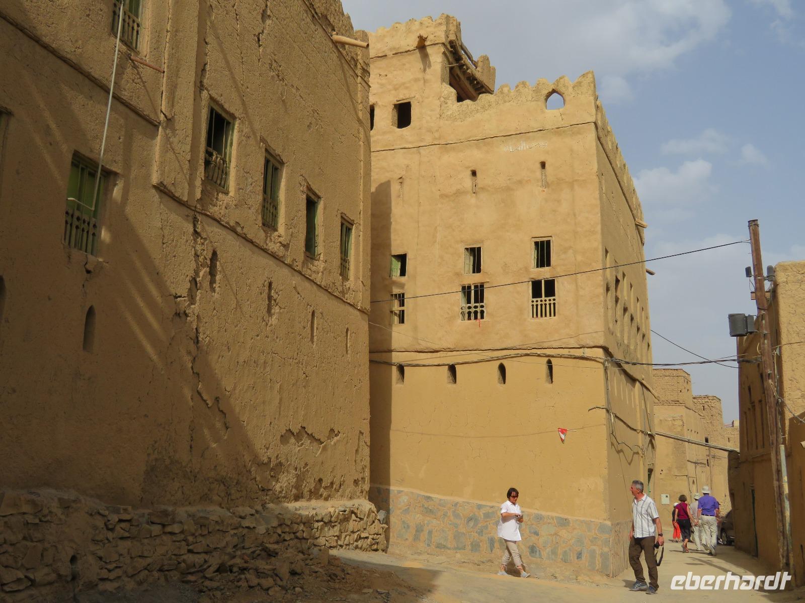 Gut gestärkt jeepen ;-) wir weiter in Richtung Al Hamra. An einem Aussichtspunkt oberhalb des Ortes haben wir einen tollen Blick auf die alte Stadt umgeben von Palmenhainen. Anschließend spazieren wir durch die engen Gassen Al Hamras mit den teilweise bis zu vierhundert Jahre alten Lehmhäusern. Interessant sind die verschiedenen Bauweisen der Häuser, viele leider nur noch als Ruinen vorhanden, mit teilweise reichen Verzierungen und unterschiedlich kunstvoll gestalteten Fenstern und Türen. Bis 2003 war der Ort noch bewohnt, heute ist das Dorf leider dem Verfall preisgegeben.