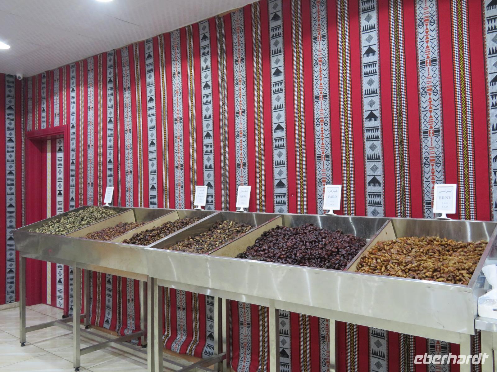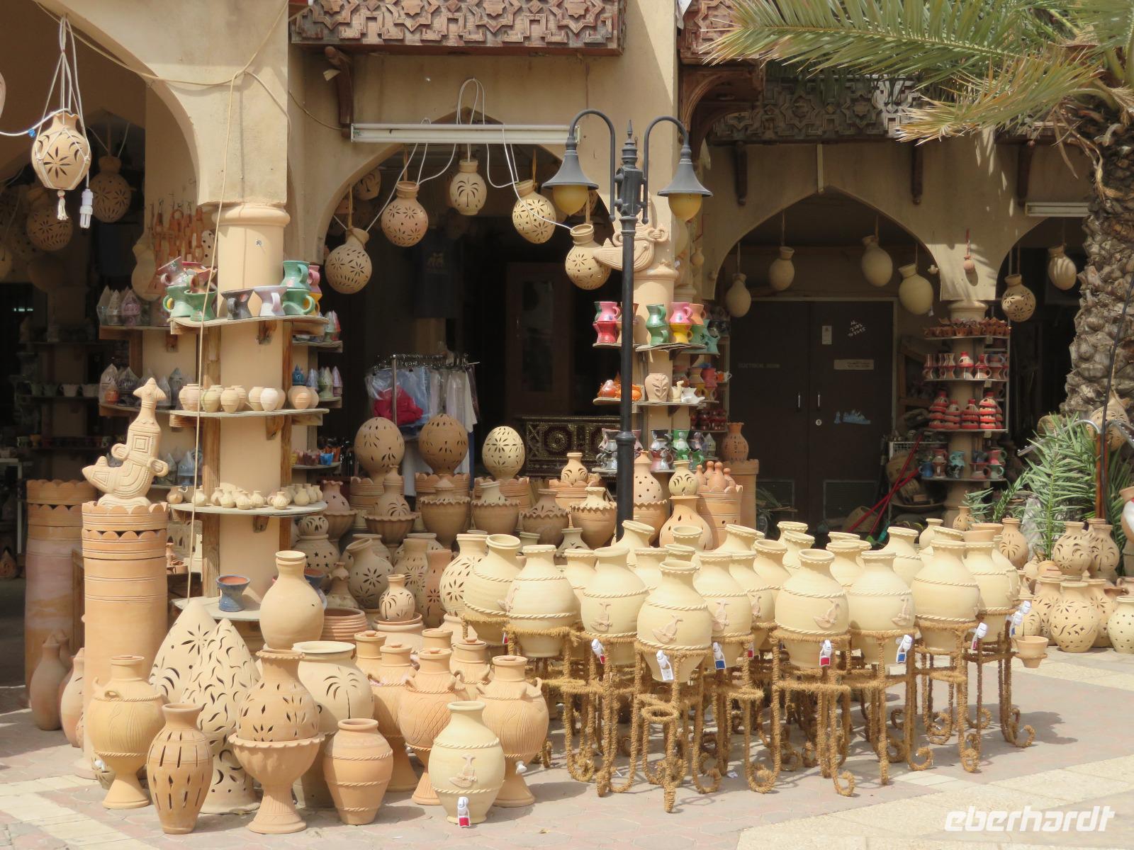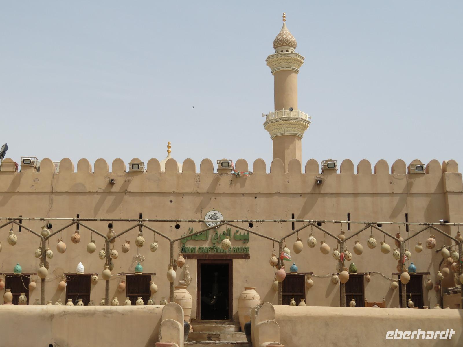 Nachdem alle Koffer in unseren Jeeps verstaut sind besuchen wir die alte Hauptstadt des Omans Nizwa. Schon von Weitem sehen wir die blau-goldene Kuppel der Moschee. Mit Tawfiq bummelten wir zuerst durch den Souk, der in verschiedene Bereiche aufgeteilt ist. Jeden Freitag früh findet hier ein große Viehmarkt statt. Aus den Erzählungen können wir nur erahnen, was für ein Trubel an diesem Tag herrscht. Beim Dattelverkäufer verkosteten wir leckere Datteln verschiedenster Sorten und Dattelhonig, erfuhren interessantes über die Zubereichtung von Halwa (DER Süßspeise im Oman) und schnupperten am Rosenwasser. Nizwa ist auch Hochburg der Silberschmiede und Töpferkunst. Um Weihrauchbrenner, Krummdolche und andere Souvenirs wurde gehandelt.