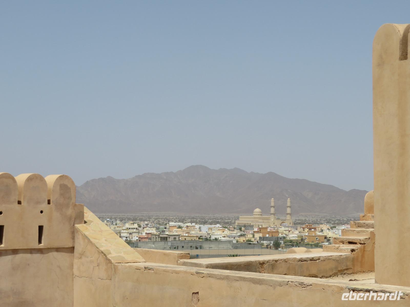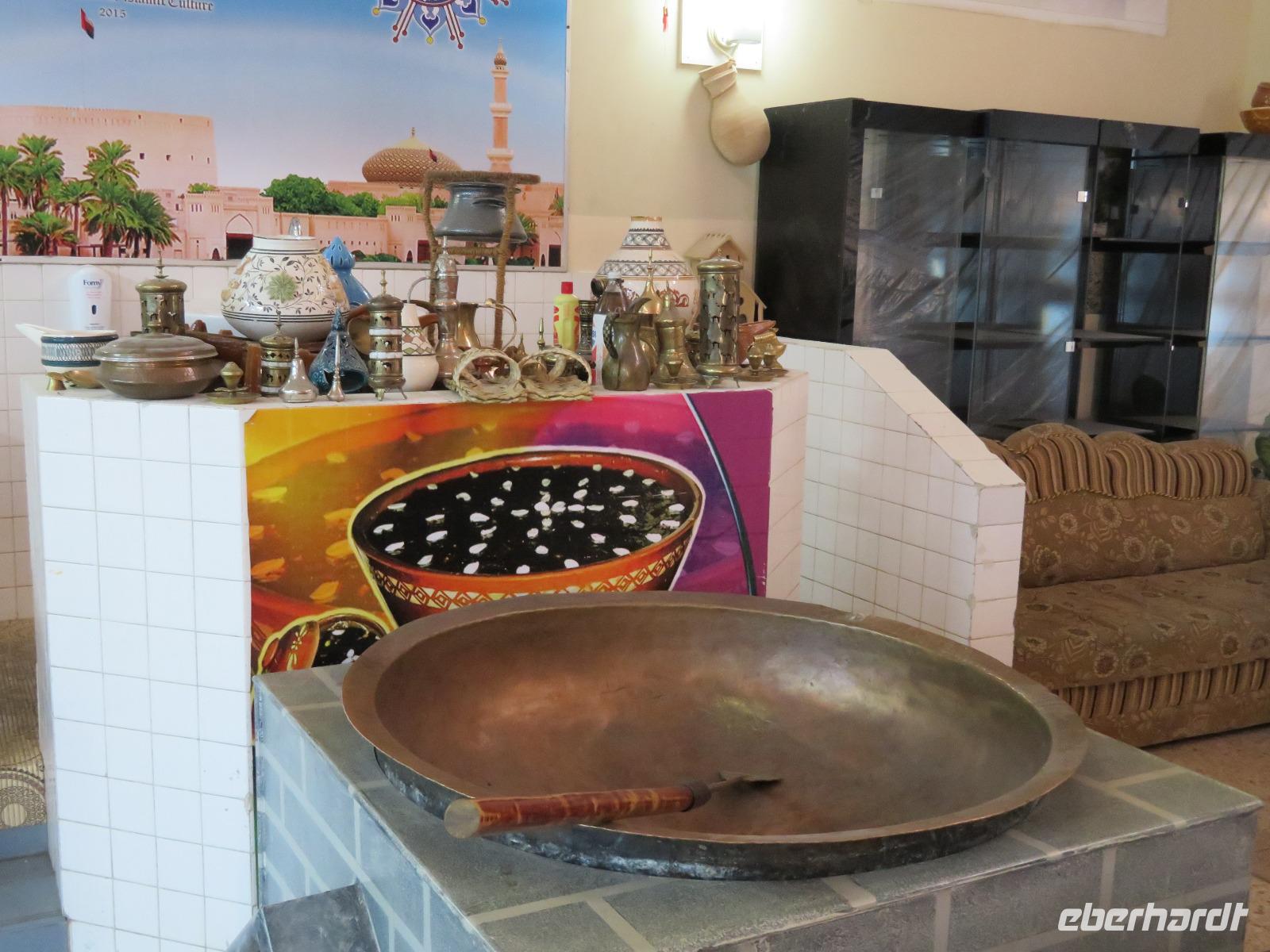 Wir erklimmen durch das interessante mehrfach verwinkelte Treppenhaus den großen Turm. Von hier oben bietet sich uns ein herrlicher Blick über die Stadt, die Moschee & das nahe gelegenen Hadjar Gebirge. Im kleinen Museum bekommen wir Einblicke in die Geschichte der Stadt und das Leben der Omanis in Nizwa früherer Zeit. Auf dem Hof zeigen uns einheimische Frauen, wie das traditionelle Omanische Brot gebacken wird.