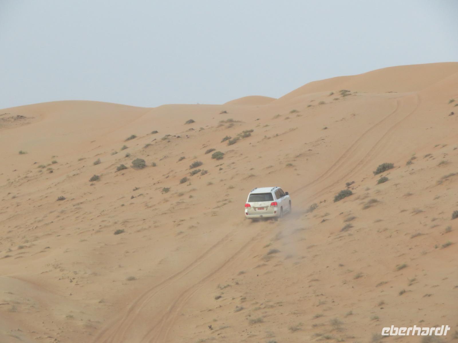 Jetzt heisst es ab in die Wüste - aber noch liegen ca. 3 Stunden Fahrt in unseren Jeeps vor uns. In Ibra legen wir in einem türkischen Restauran eine kleine Mittagspause ein und probieren uns durch die verschiedensten regionalen Gerichte. Am Eingang der Wüste wird von den Reifen unserer Jeeps der Druck reduziert und ab gehts auf lange Sandpisten.