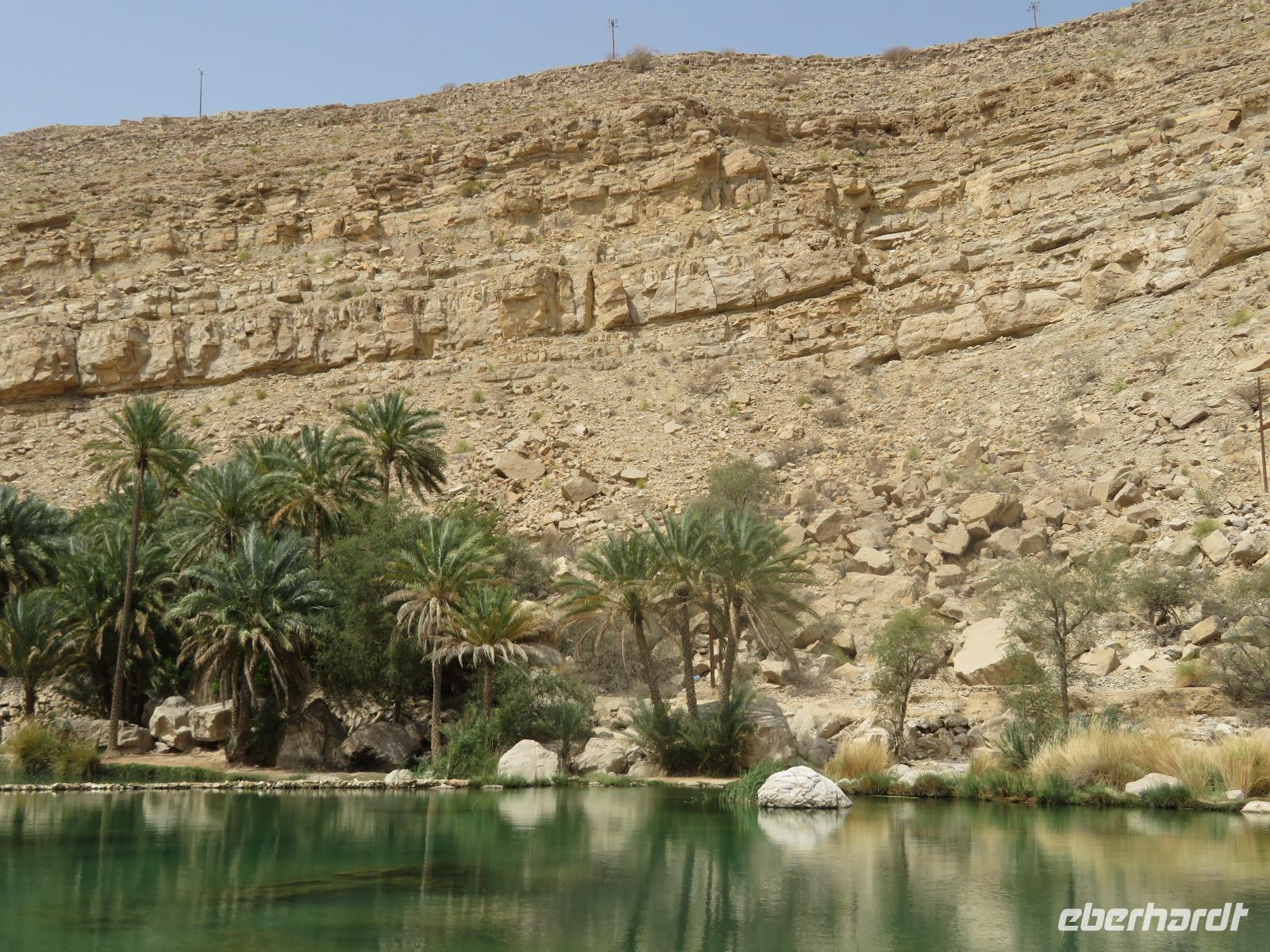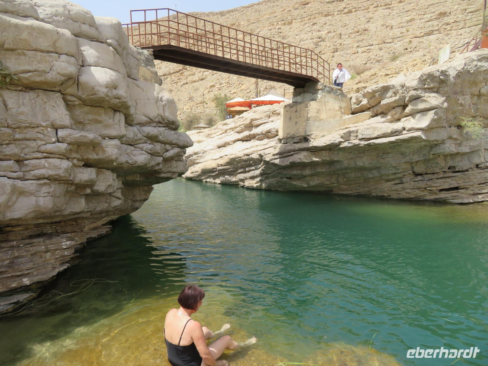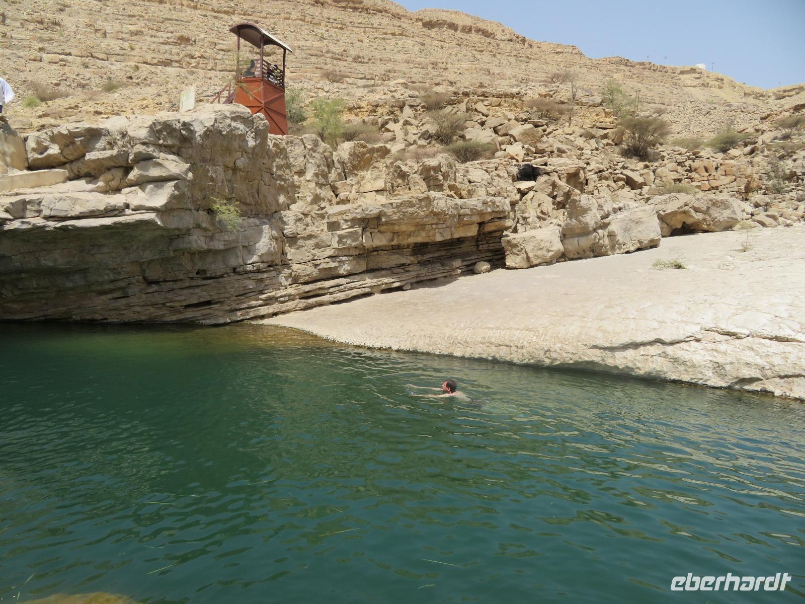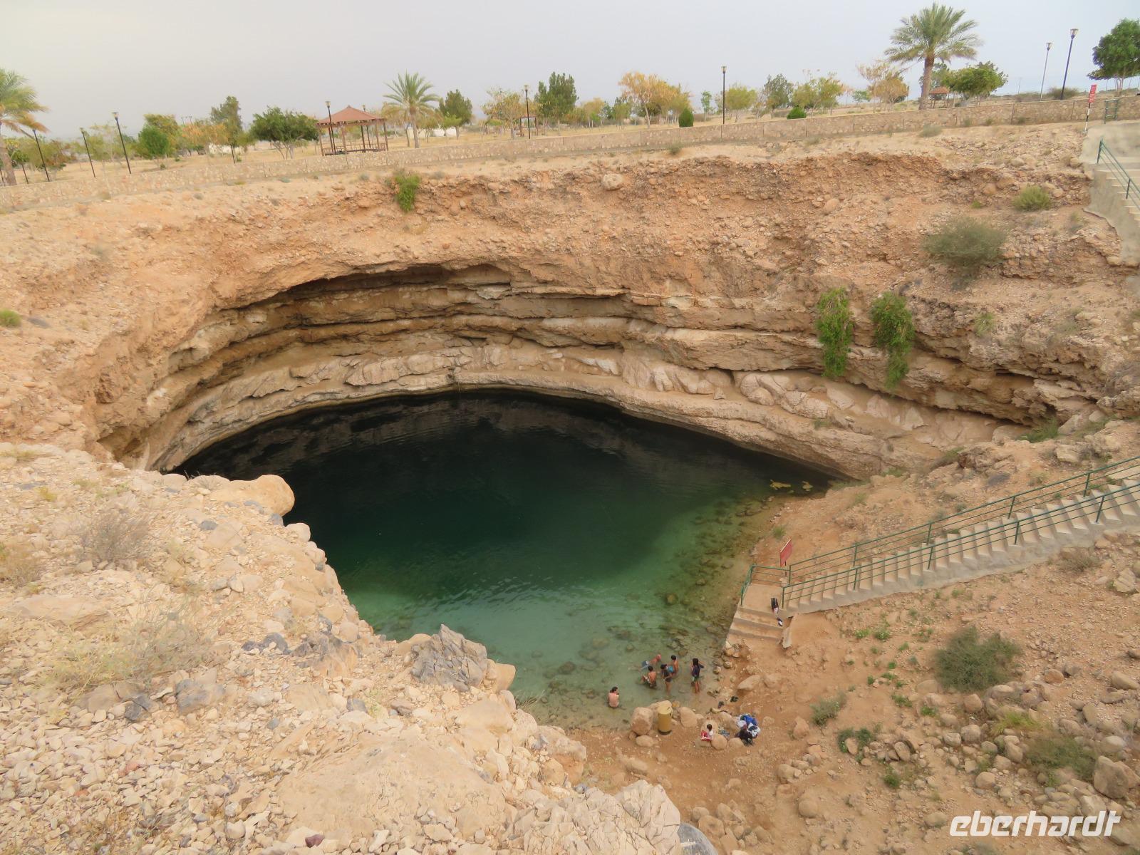 Das Wadi Bani Khalid war unser nächstes Ziel und wir freuten uns auf die Möglichkeit zum Baden. Allein der Fußweg zum Whadi vom Parkplatz entlang der Bewässerungskanäle war beeindruckend. Entgegen der Kargheit auf der Fahrt dorthin war plötzlich alles grün - Balsam für unsere Augen ! Wadi Bani Khalid ist das größte, bekannteste und auch schönste Wadi der Region Sharqiyah. Wasser gibt es während des ganzen Jahres. Die als Pools bezeichneten Becken beziehen ihr kristallklares Wasser von unterirdischen Quellen und Bächen, die im Laufe der Zeit Höhlen und verzweigte Kanalsysteme in den Fels eingruben. Wir nutzten begeistert den Sprung ins kühle Nass und liesen uns von den Putzerfischen an den Füßen herumknabbern. Erfrischt starteten wir in Richtung Sur, der früheren Hochburg des Dhau-Bau's . Davon zeugt noch manch eindrucksvolles Überbleibsel der legendären Schiffsbaukunst. Wir besuchen zunächst das Außengelände des hiesigen Dhau-Museums. Eine lebendige Vorstellung von traditionellen Großseglern bekamen wir beim Anblick der 300 Tonnen schweren „Fatah-Al-Khair", die vor dem Museum aufgedockt wurde. Die fast 100 Jahre alte Ghanja - Ghanjas waren schlanker und länger gebaut als andere Dhautypen - hat eine Länge von 20 Meter. 1920 gebaut ist Sie eine der letzten hochseetauglichen Dhaus. Lange Zeit im Jemen im Einsatz, entdeckte sie 1993 ein omanischer Kapitän und brachte sie in ihren Heimathafen zurück. Kleinere Dhaus, die hauptsächlich zum Fischen und Transportieren von Gütern gebraucht wurden, befinden sich ebenfalls vor dem Museum. Eine Stippvisite in der benachbarten Dhau-Werft durfte ebenfalls nicht fehlen. Die Bauzeit für eine Dhaubeträgt bis zu einem Jahr. Für den Bau gibt es keine vorliegenden Baupläne, sondern man ist ausschließlich auf die Erfahrung des Baumeisters angewiesen - Handarbeit ist natürlich vorherrschend. Das verwendete Holz ist Teak-Holz und kommt überwiegend aus Indien und Myanmar. Eines der prächtigen traditionellen Holzschiffe kostet heute, je nach Ausstattung, den stolzen Preis von 600.000 - 900.000 €. An der Chorniche, der kleinen Strandpromenade von Sur legen wir eine kurze Mittagspause ein und verkosteten omanische Spezialitäten an einem Imbissstand. Auf tollen modernen Autobahnen entlang der omanischen Küste führt uns unsere Fahrt zum Wadi Tiwi, einem der schönsten Wadis. Er zieht sich über eine Länge von ca. 65 Kilometer durch die Berge. Mit unseren Jeeps schlängeln wir uns ein Stück hinein und sind überwältigt von den riesigen, hoch aufragenden Felswänden. Am Ufer des kleinen Flusses, der ganzjährig Wasser führt, gedeihen wunderschöne Palmen. Im Wadi selbst gibt es mehrere Dörfer. Nach einem Fotostopp fahren wir zurück an die Küste. Auf unserem weiteren Programm steht Besichtigung des Sinkhole bei Bamah. Der riesige Krater im Kalkstein entstand durch das Meerwasser und steht in Verbindung mit dem Meer. Nach dem Fotostopp führt uns die Route nun wiederum durch eine einmalige Landschaft mit beeindruckenden Gebirgsformationen nach Muscat zurück. In den Bergen vor der Stadt legen wir einen Stopp ein und uns bietet sich ein traumhafter Ausblick über die beleuchtete Hauptstadt. Über imposante Serpentinen stadteinwärts erreichen wir wieder das Ramada Hotel, Ausgangspunkt unserer kleinen Jeepsafari. Nun heisst es Abschied nehmen von unseren tollen Jeepfahrern, die uns 4 Tage sicher durch die Bergregionen im Oman gefahren haben.