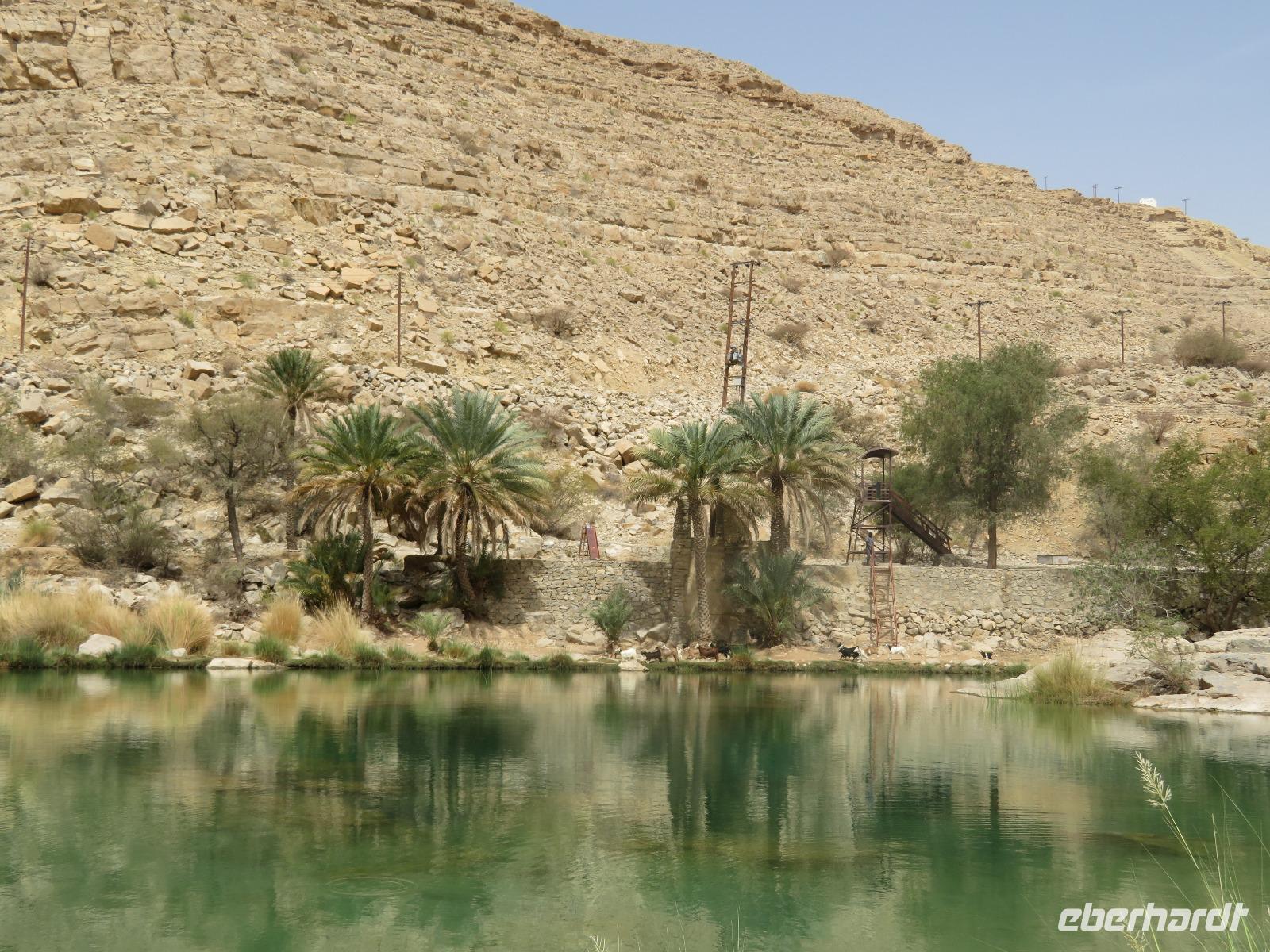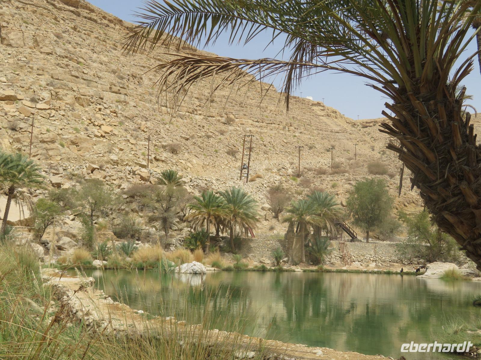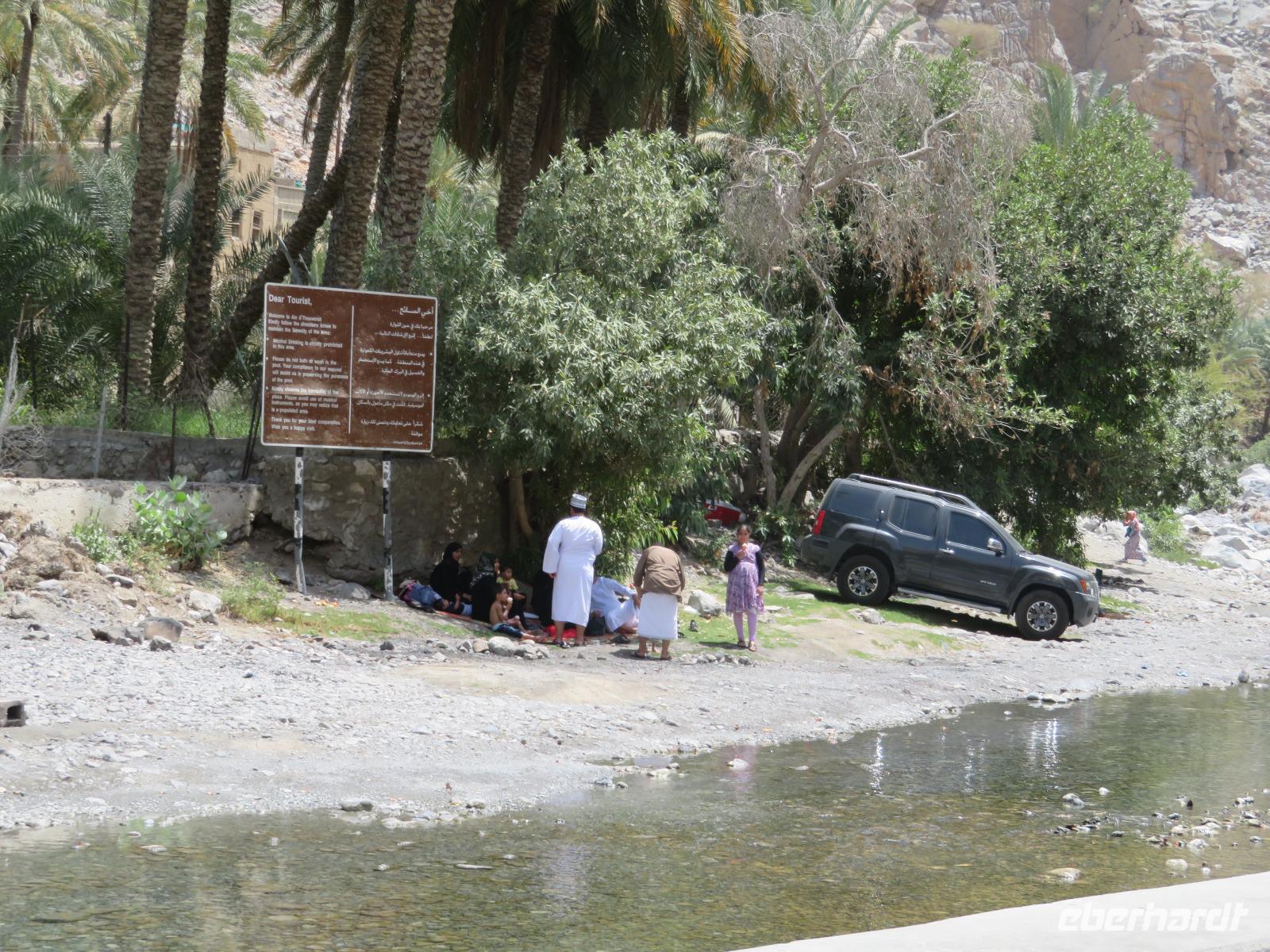 Das Wadi Bani Khalid war unser nächstes Ziel und wir freuten uns auf die Möglichkeit zum Baden. Allein der Fußweg zum Whadi vom Parkplatz entlang der Bewässerungskanäle war beeindruckend. Entgegen der Kargheit auf der Fahrt dorthin war plötzlich alles grün - Balsam für unsere Augen ! Wadi Bani Khalid ist das größte, bekannteste und auch schönste Wadi der Region Sharqiyah. Wasser gibt es während des ganzen Jahres. Die als Pools bezeichneten Becken beziehen ihr kristallklares Wasser von unterirdischen Quellen und Bächen, die im Laufe der Zeit Höhlen und verzweigte Kanalsysteme in den Fels eingruben. Wir nutzten begeistert den Sprung ins kühle Nass und liesen uns von den Putzerfischen an den Füßen herumknabbern. Erfrischt starteten wir in Richtung Sur, der früheren Hochburg des Dhau-Bau's . Davon zeugt noch manch eindrucksvolles Überbleibsel der legendären Schiffsbaukunst. Wir besuchen zunächst das Außengelände des hiesigen Dhau-Museums. Eine lebendige Vorstellung von traditionellen Großseglern bekamen wir beim Anblick der 300 Tonnen schweren „Fatah-Al-Khair", die vor dem Museum aufgedockt wurde. Die fast 100 Jahre alte Ghanja - Ghanjas waren schlanker und länger gebaut als andere Dhautypen - hat eine Länge von 20 Meter. 1920 gebaut ist Sie eine der letzten hochseetauglichen Dhaus. Lange Zeit im Jemen im Einsatz, entdeckte sie 1993 ein omanischer Kapitän und brachte sie in ihren Heimathafen zurück. Kleinere Dhaus, die hauptsächlich zum Fischen und Transportieren von Gütern gebraucht wurden, befinden sich ebenfalls vor dem Museum. Eine Stippvisite in der benachbarten Dhau-Werft durfte ebenfalls nicht fehlen. Die Bauzeit für eine Dhaubeträgt bis zu einem Jahr. Für den Bau gibt es keine vorliegenden Baupläne, sondern man ist ausschließlich auf die Erfahrung des Baumeisters angewiesen - Handarbeit ist natürlich vorherrschend. Das verwendete Holz ist Teak-Holz und kommt überwiegend aus Indien und Myanmar. Eines der prächtigen traditionellen Holzschiffe kostet heute, je nach Ausstattung, den stolzen Preis von 600.000 - 900.000 €. An der Chorniche, der kleinen Strandpromenade von Sur legen wir eine kurze Mittagspause ein und verkosteten omanische Spezialitäten an einem Imbissstand. Auf tollen modernen Autobahnen entlang der omanischen Küste führt uns unsere Fahrt zum Wadi Tiwi, einem der schönsten Wadis. Er zieht sich über eine Länge von ca. 65 Kilometer durch die Berge. Mit unseren Jeeps schlängeln wir uns ein Stück hinein und sind überwältigt von den riesigen, hoch aufragenden Felswänden. Am Ufer des kleinen Flusses, der ganzjährig Wasser führt, gedeihen wunderschöne Palmen. Im Wadi selbst gibt es mehrere Dörfer. Nach einem Fotostopp fahren wir zurück an die Küste. Auf unserem weiteren Programm steht Besichtigung des Sinkhole bei Bamah. Der riesige Krater im Kalkstein entstand durch das Meerwasser und steht in Verbindung mit dem Meer. Nach dem Fotostopp führt uns die Route nun wiederum durch eine einmalige Landschaft mit beeindruckenden Gebirgsformationen nach Muscat zurück. In den Bergen vor der Stadt legen wir einen Stopp ein und uns bietet sich ein traumhafter Ausblick über die beleuchtete Hauptstadt. Über imposante Serpentinen stadteinwärts erreichen wir wieder das Ramada Hotel, Ausgangspunkt unserer kleinen Jeepsafari. Nun heisst es Abschied nehmen von unseren tollen Jeepfahrern, die uns 4 Tage sicher durch die Bergregionen im Oman gefahren haben.