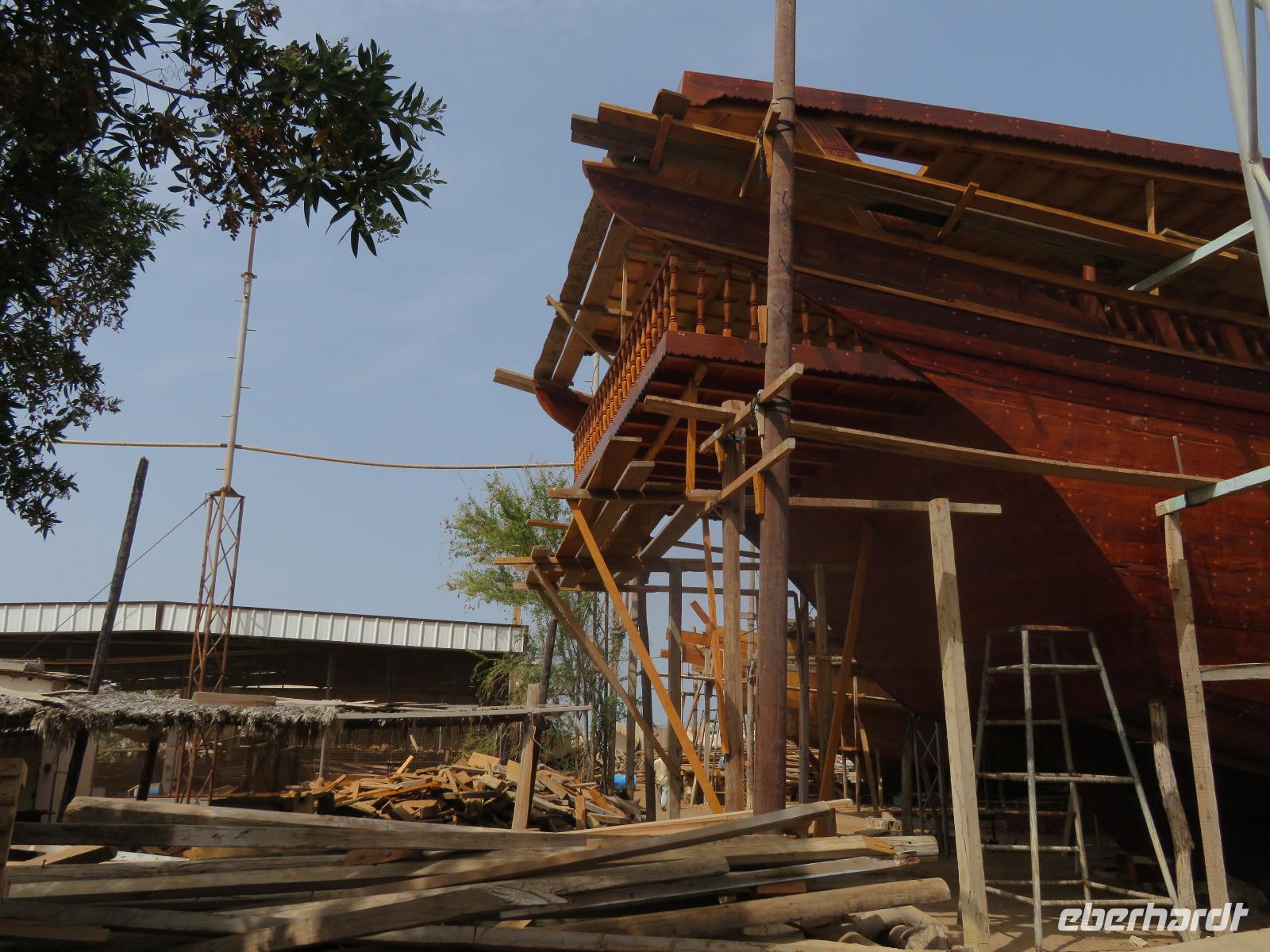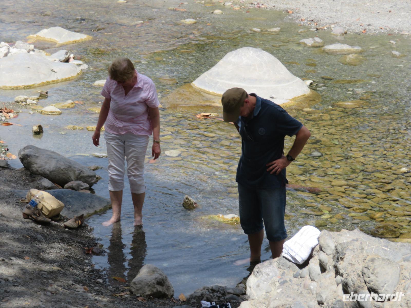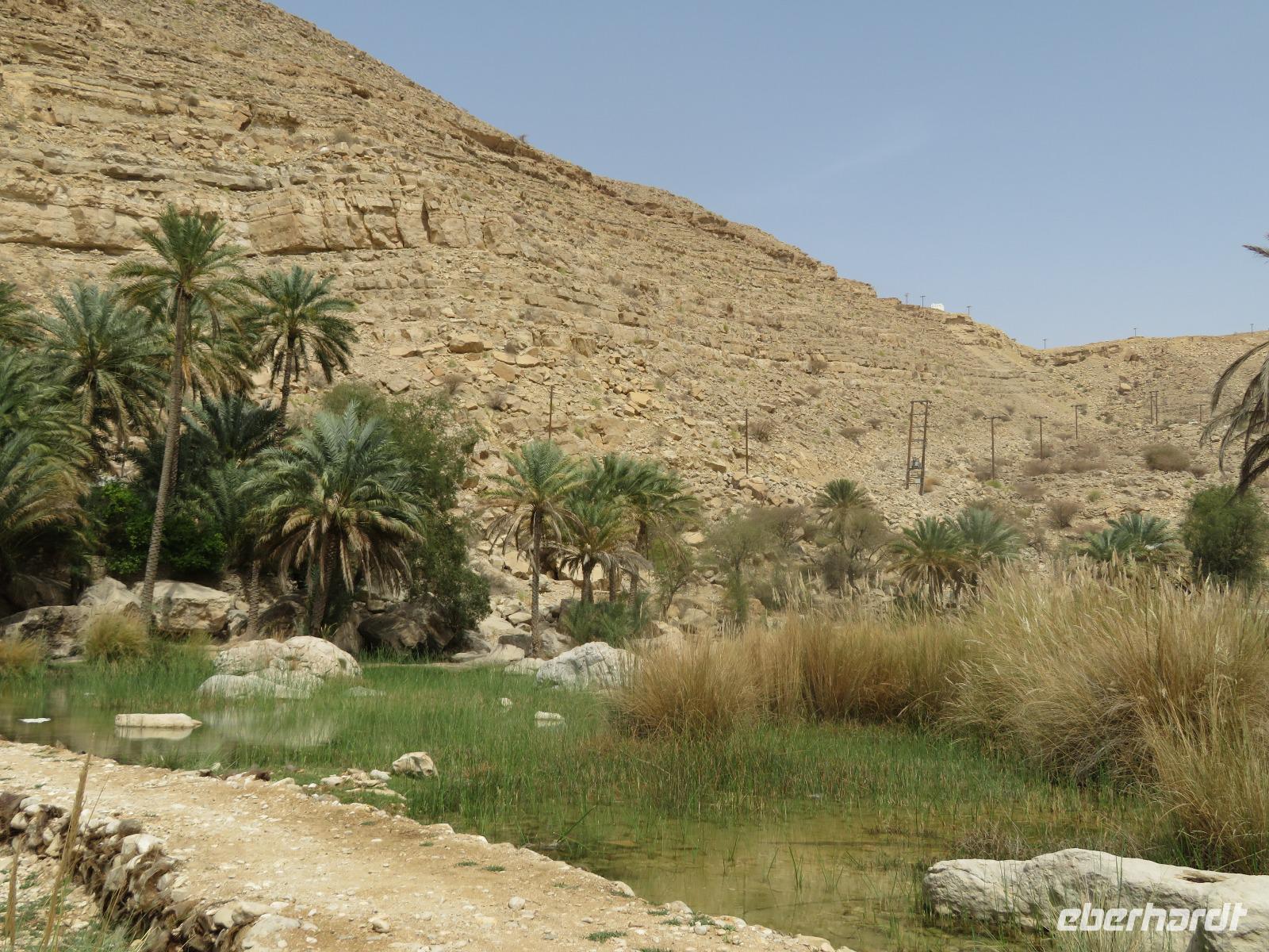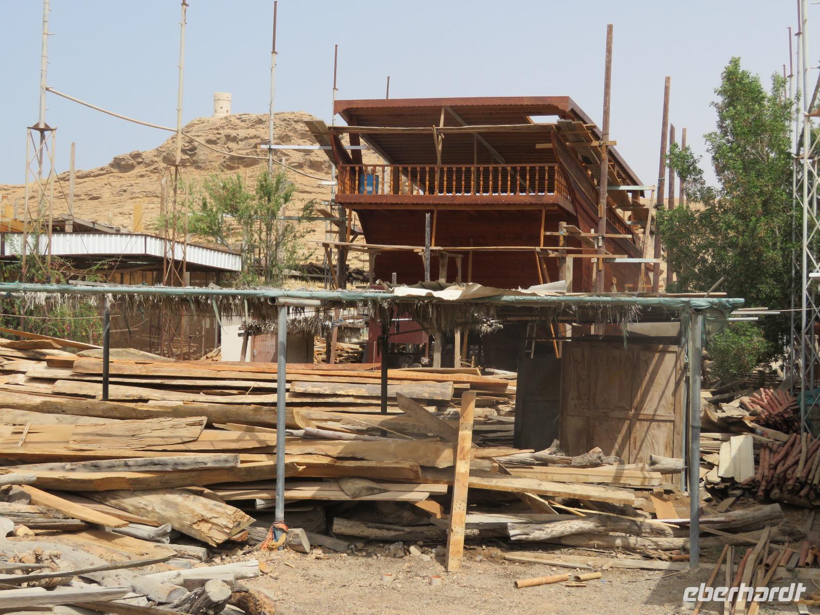 Das Wadi Bani Khalid war unser nächstes Ziel und wir freuten uns auf die Möglichkeit zum Baden. Allein der Fußweg zum Whadi vom Parkplatz entlang der Bewässerungskanäle war beeindruckend. Entgegen der Kargheit auf der Fahrt dorthin war plötzlich alles grün - Balsam für unsere Augen ! Wadi Bani Khalid ist das größte, bekannteste und auch schönste Wadi der Region Sharqiyah. Wasser gibt es während des ganzen Jahres. Die als Pools bezeichneten Becken beziehen ihr kristallklares Wasser von unterirdischen Quellen und Bächen, die im Laufe der Zeit Höhlen und verzweigte Kanalsysteme in den Fels eingruben. Wir nutzten begeistert den Sprung ins kühle Nass und liesen uns von den Putzerfischen an den Füßen herumknabbern. Erfrischt starteten wir in Richtung Sur, der früheren Hochburg des Dhau-Bau's . Davon zeugt noch manch eindrucksvolles Überbleibsel der legendären Schiffsbaukunst. Wir besuchen zunächst das Außengelände des hiesigen Dhau-Museums. Eine lebendige Vorstellung von traditionellen Großseglern bekamen wir beim Anblick der 300 Tonnen schweren „Fatah-Al-Khair", die vor dem Museum aufgedockt wurde. Die fast 100 Jahre alte Ghanja - Ghanjas waren schlanker und länger gebaut als andere Dhautypen - hat eine Länge von 20 Meter. 1920 gebaut ist Sie eine der letzten hochseetauglichen Dhaus. Lange Zeit im Jemen im Einsatz, entdeckte sie 1993 ein omanischer Kapitän und brachte sie in ihren Heimathafen zurück. Kleinere Dhaus, die hauptsächlich zum Fischen und Transportieren von Gütern gebraucht wurden, befinden sich ebenfalls vor dem Museum. Eine Stippvisite in der benachbarten Dhau-Werft durfte ebenfalls nicht fehlen. Die Bauzeit für eine Dhaubeträgt bis zu einem Jahr. Für den Bau gibt es keine vorliegenden Baupläne, sondern man ist ausschließlich auf die Erfahrung des Baumeisters angewiesen - Handarbeit ist natürlich vorherrschend. Das verwendete Holz ist Teak-Holz und kommt überwiegend aus Indien und Myanmar. Eines der prächtigen traditionellen Holzschiffe kostet heute, je nach Ausstattung, den stolzen Preis von 600.000 - 900.000 €. An der Chorniche, der kleinen Strandpromenade von Sur legen wir eine kurze Mittagspause ein und verkosteten omanische Spezialitäten an einem Imbissstand. Auf tollen modernen Autobahnen entlang der omanischen Küste führt uns unsere Fahrt zum Wadi Tiwi, einem der schönsten Wadis. Er zieht sich über eine Länge von ca. 65 Kilometer durch die Berge. Mit unseren Jeeps schlängeln wir uns ein Stück hinein und sind überwältigt von den riesigen, hoch aufragenden Felswänden. Am Ufer des kleinen Flusses, der ganzjährig Wasser führt, gedeihen wunderschöne Palmen. Im Wadi selbst gibt es mehrere Dörfer. Nach einem Fotostopp fahren wir zurück an die Küste. Auf unserem weiteren Programm steht Besichtigung des Sinkhole bei Bamah. Der riesige Krater im Kalkstein entstand durch das Meerwasser und steht in Verbindung mit dem Meer. Nach dem Fotostopp führt uns die Route nun wiederum durch eine einmalige Landschaft mit beeindruckenden Gebirgsformationen nach Muscat zurück. In den Bergen vor der Stadt legen wir einen Stopp ein und uns bietet sich ein traumhafter Ausblick über die beleuchtete Hauptstadt. Über imposante Serpentinen stadteinwärts erreichen wir wieder das Ramada Hotel, Ausgangspunkt unserer kleinen Jeepsafari. Nun heisst es Abschied nehmen von unseren tollen Jeepfahrern, die uns 4 Tage sicher durch die Bergregionen im Oman gefahren haben.