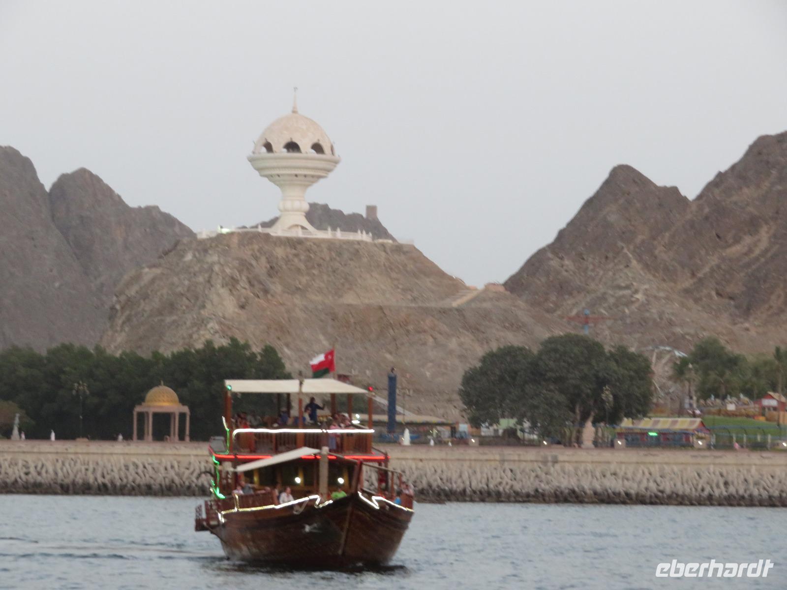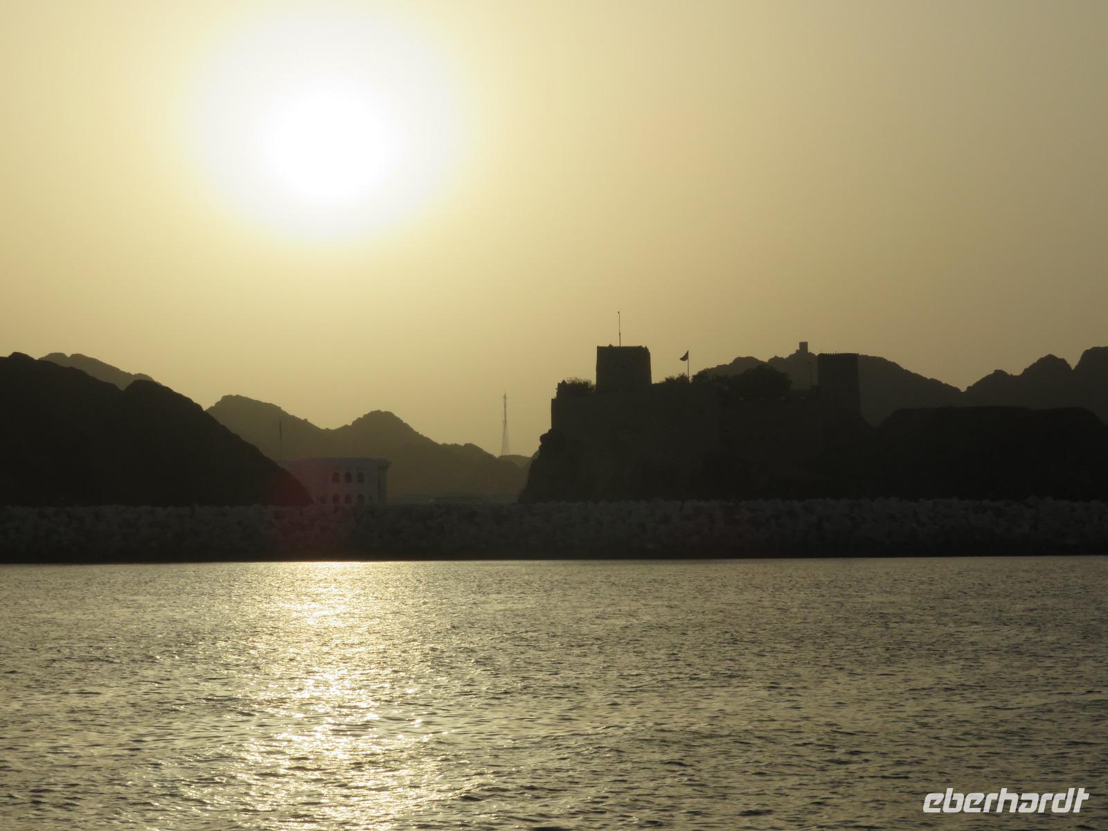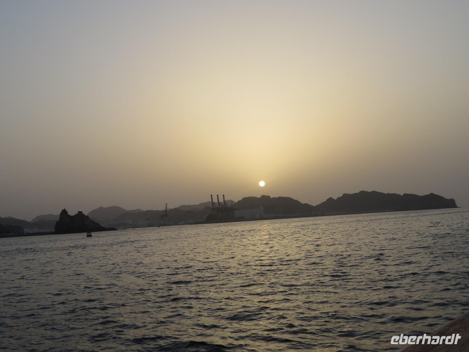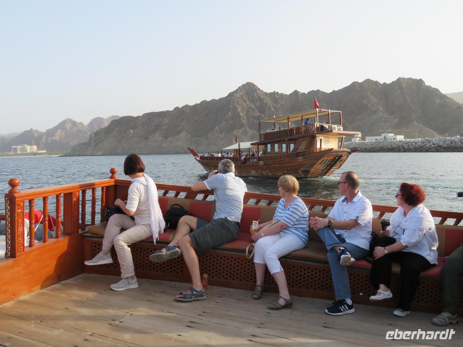 Am späten Nachmittag führt unser Weg in die Marina von Muscat. Wir besteigen eine alte traditionelle Dhau. Auf ihr erleben wir eine wunderschöne Fahrt entlang der Küste zum Sonnenuntergang. Wir sehen die alten Forts der Portugiesen, den Sultanspalast und die Yachten des Sultans vor der Altstadt. Während der gemütlichen Tour genießen wir das Meer, einen fantastischen Sonnenuntergang, knabbern Datteln und schlürfen omanischen Kaffee.