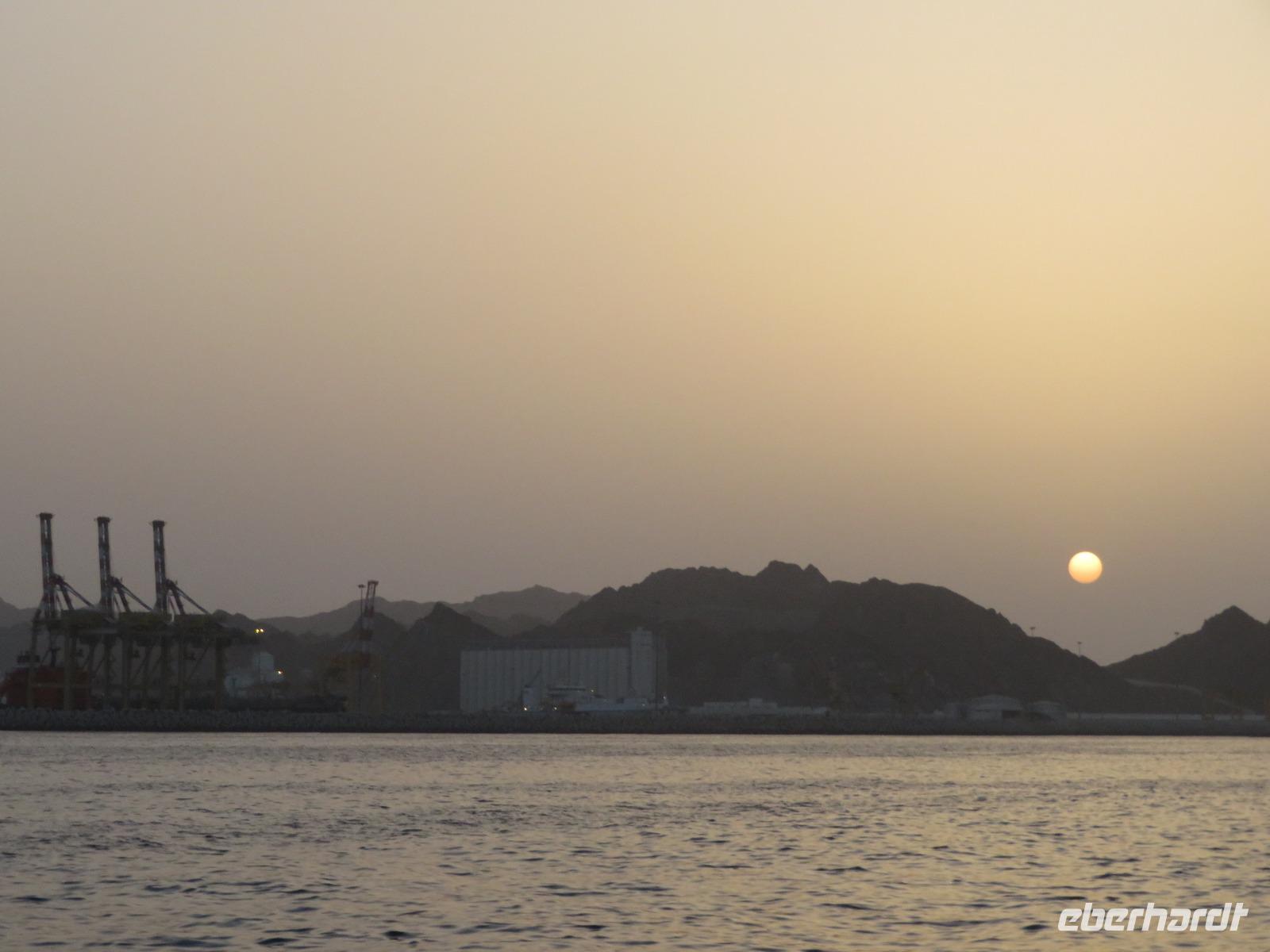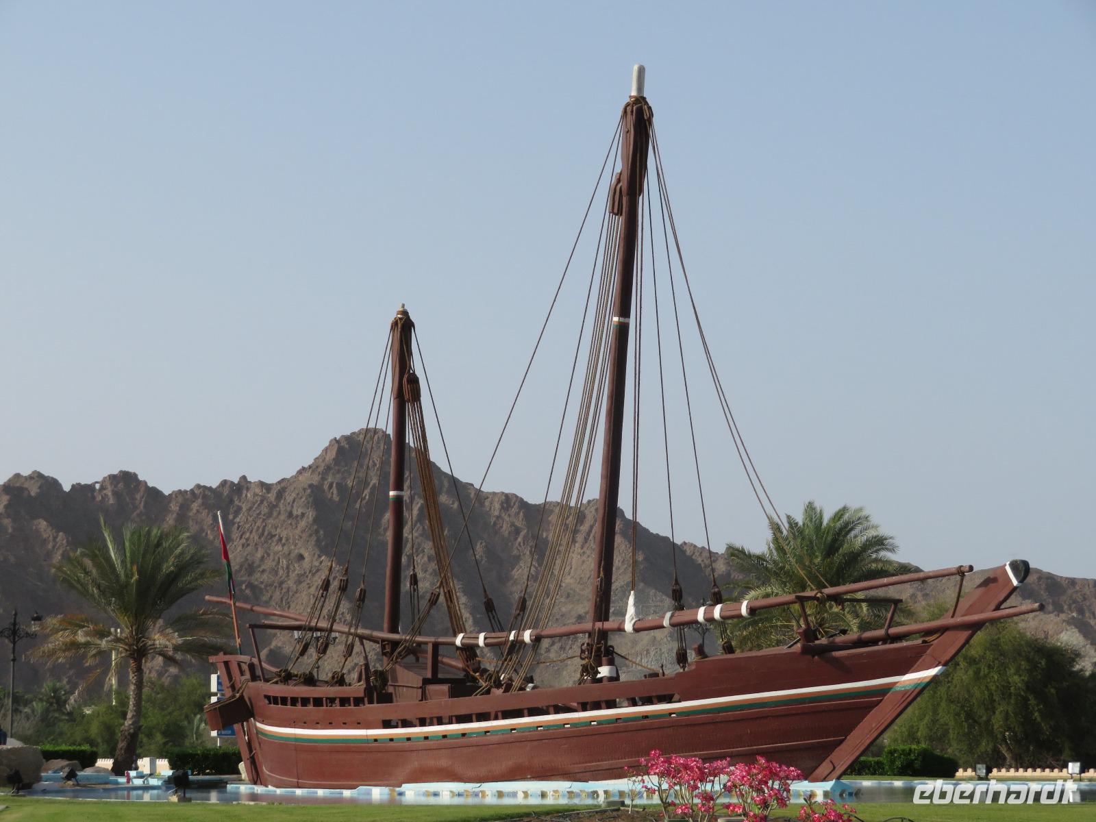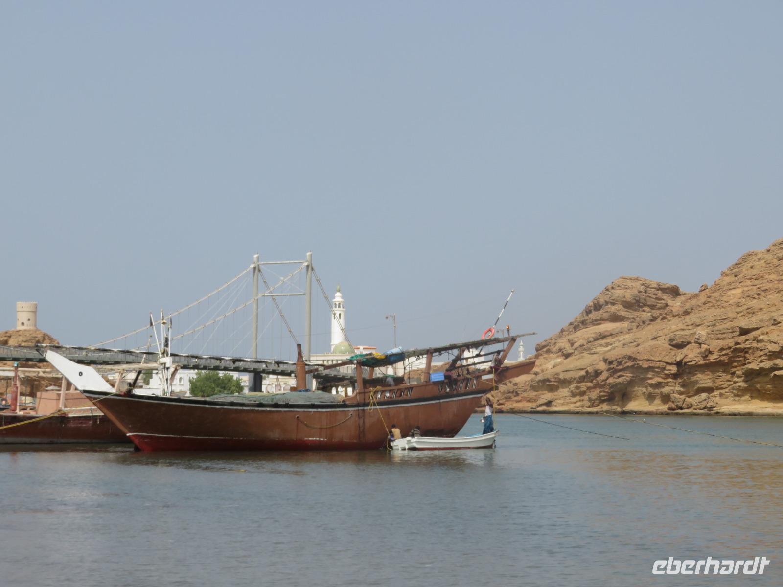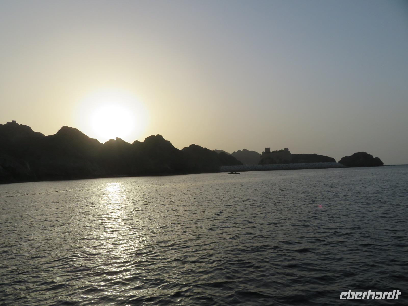 Am späten Nachmittag führt unser Weg in die Marina von Muscat. Wir besteigen eine alte traditionelle Dhau. Auf ihr erleben wir eine wunderschöne Fahrt entlang der Küste zum Sonnenuntergang. Wir sehen die alten Forts der Portugiesen, den Sultanspalast und die Yachten des Sultans vor der Altstadt. Während der gemütlichen Tour genießen wir das Meer, einen fantastischen Sonnenuntergang, knabbern Datteln und schlürfen omanischen Kaffee.