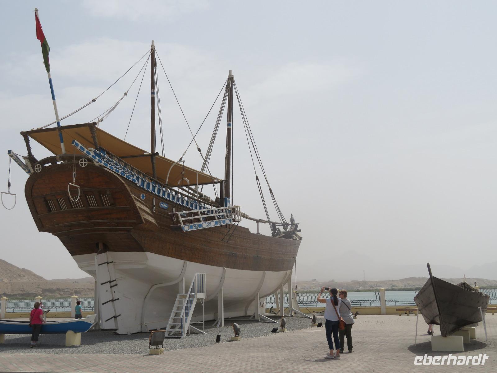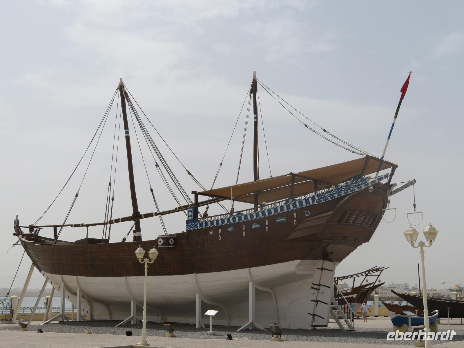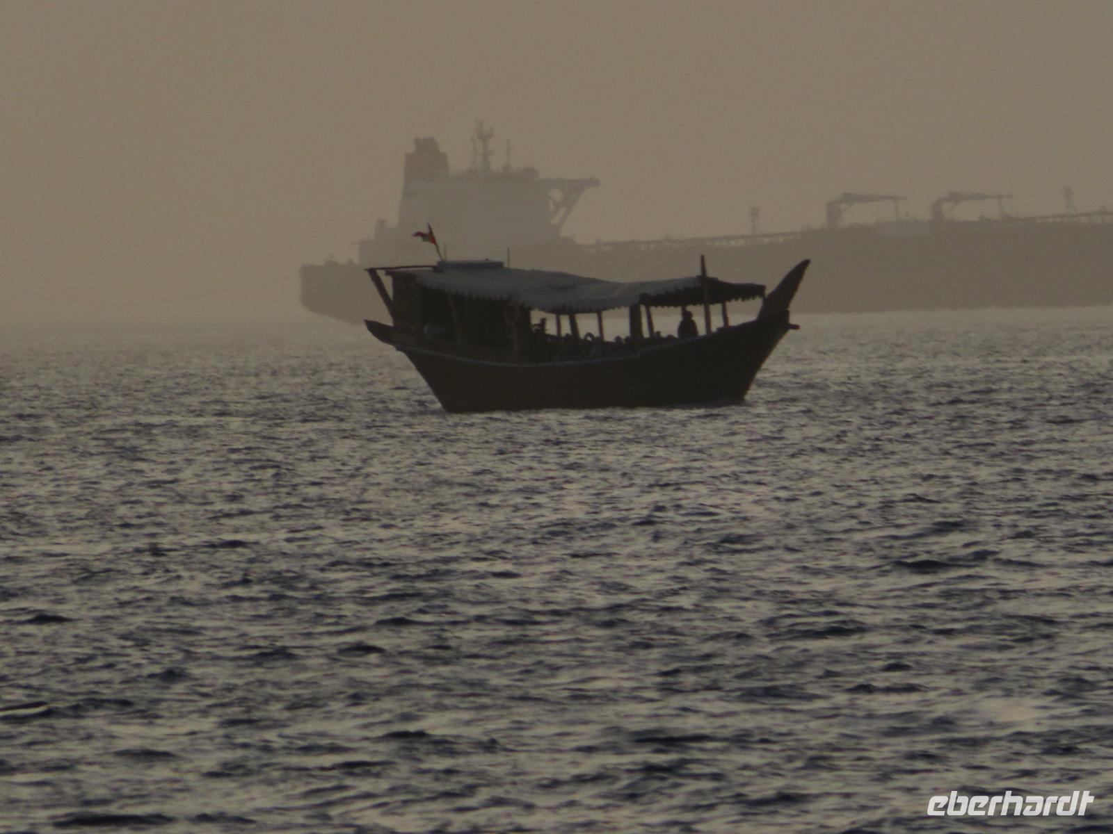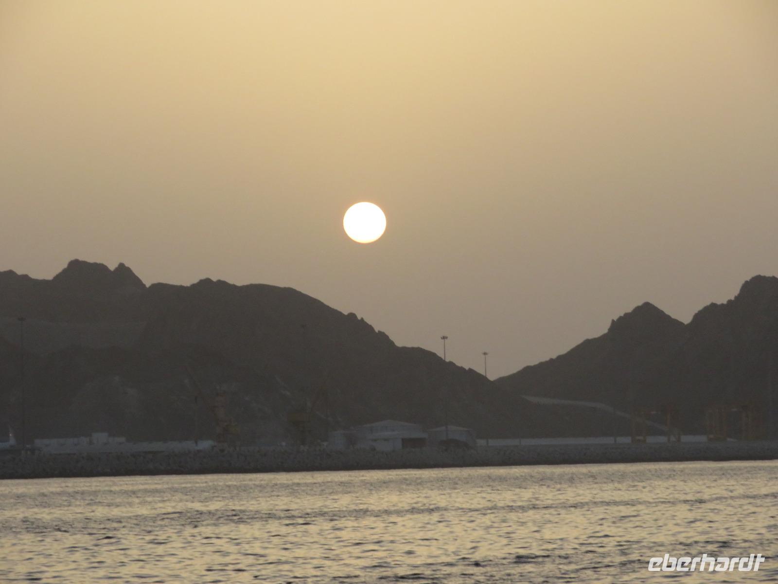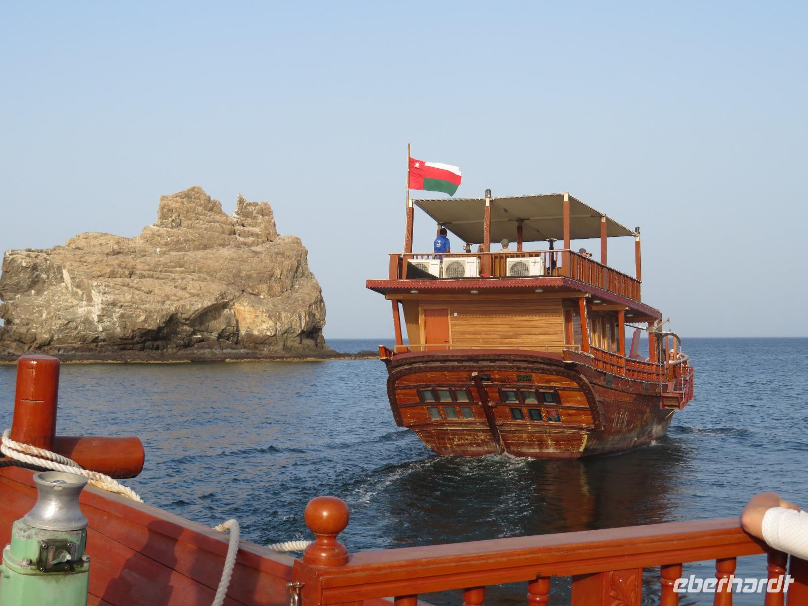 Am späten Nachmittag führt unser Weg in die Marina von Muscat. Wir besteigen eine alte traditionelle Dhau. Auf ihr erleben wir eine wunderschöne Fahrt entlang der Küste zum Sonnenuntergang. Wir sehen die alten Forts der Portugiesen, den Sultanspalast und die Yachten des Sultans vor der Altstadt. Während der gemütlichen Tour genießen wir das Meer, einen fantastischen Sonnenuntergang, knabbern Datteln und schlürfen omanischen Kaffee.