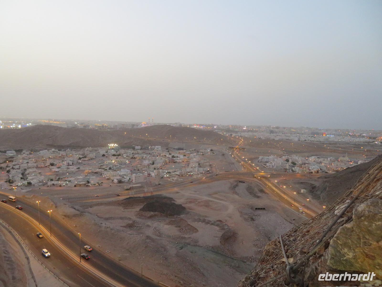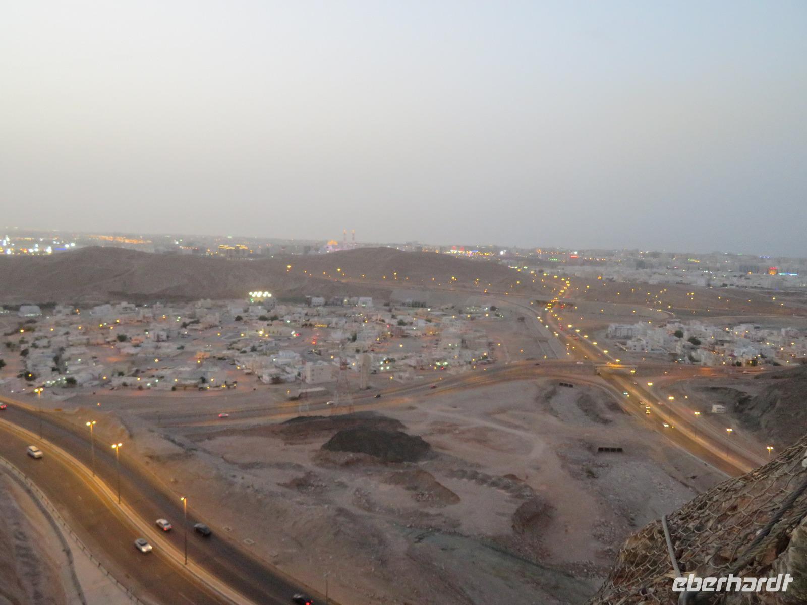 Auf der gegenüberliegenden Seite des Tales befindet sich „Dianas Viewpoint"- ein Aussichtspunkt, den Prinzessin Diana besonders geliebt hat. Nach einer kleinen Pause bei Kaffee & Saft im Hotel Mountain Nights geht es die Straße wieder hinab ins Tal. Am späten Nachmittag erreichen wir das Golden Tulip Hotel in Nizwa und geniessen das Abendessen bei Mondschein im Garten des Hotels.