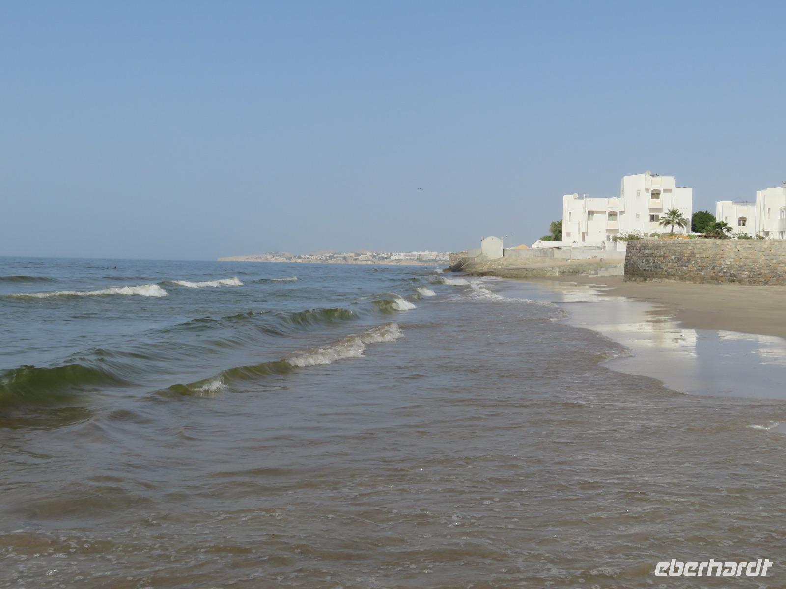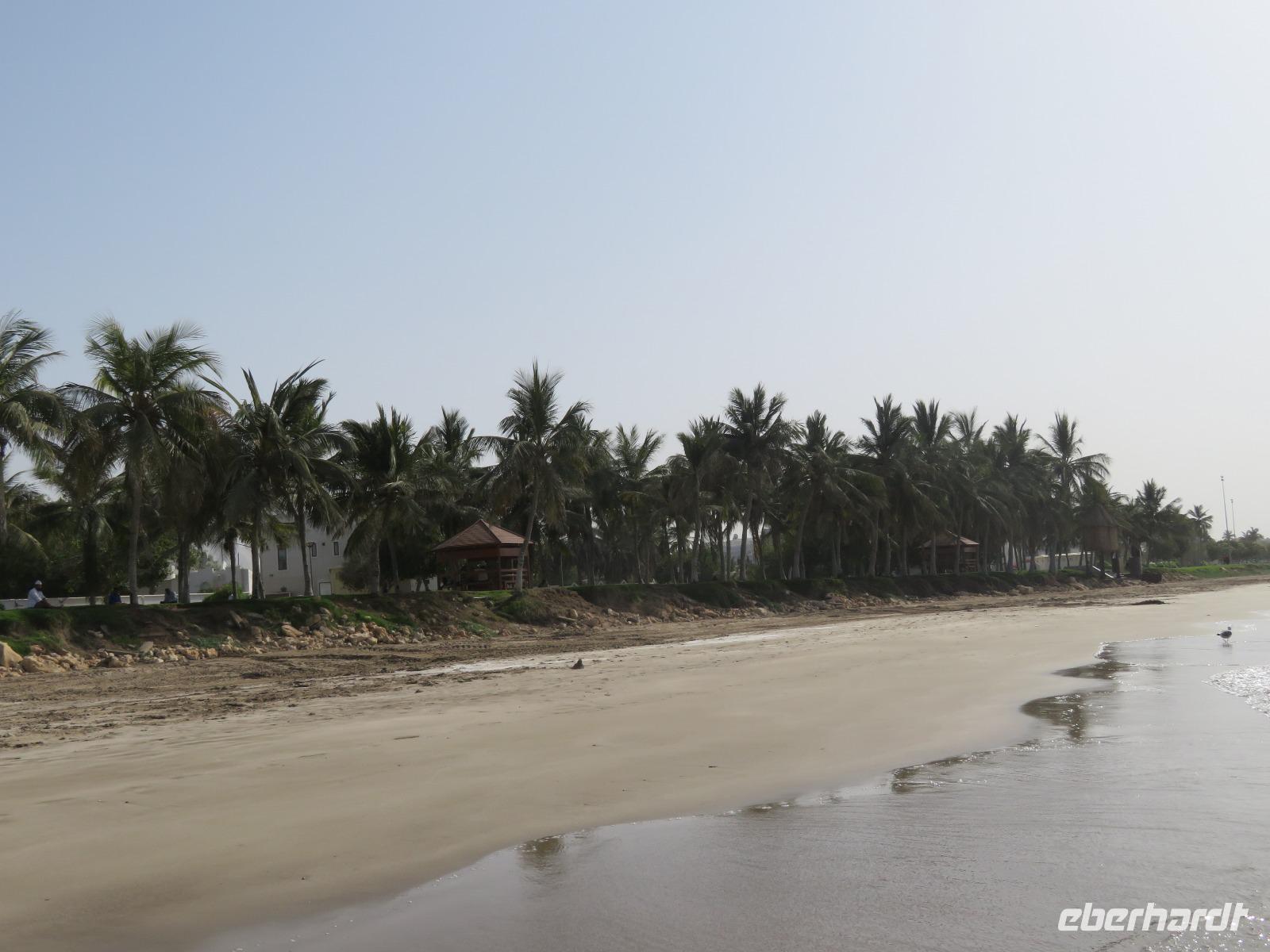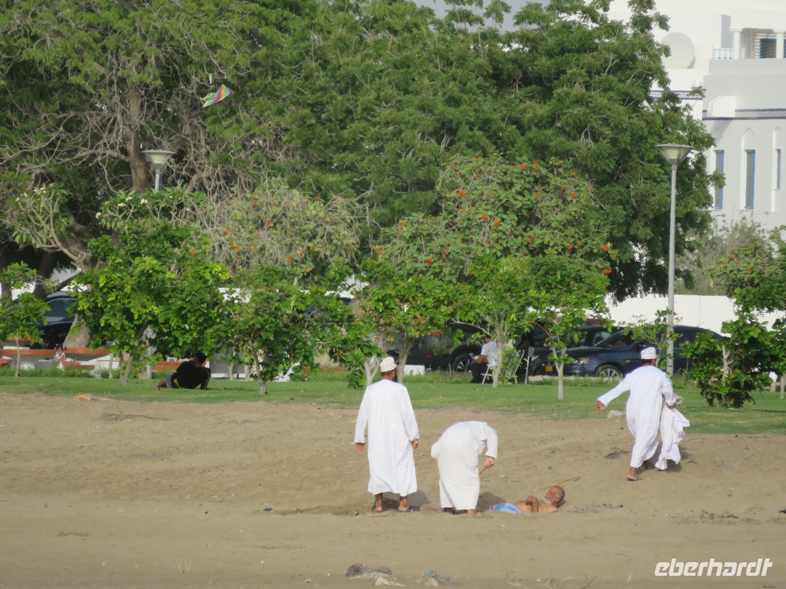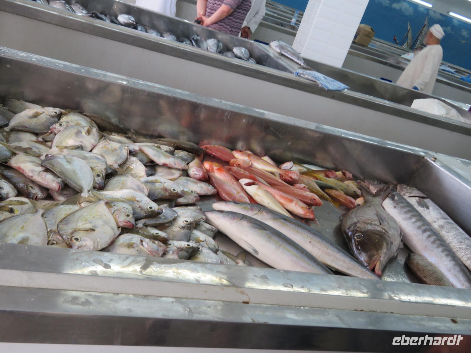 Bei strahlendem Sonnenschein besuchen wir zunächst den Fischmarkt in Barka. Jeden Morgen kommen die Fischer mit ihrem Fang auf den Markt zum Verkauf. Außerdem findet eine Auktion für die besten Fische statt. Beim Bummel entdecken wir große Thunfische, Sepias, Baraccudas, verschiedene Hechte, kleine Haie, Rochen und Fische zum Fritieren. Unser nächstes Ziel ist das Fort Nakahl. Es wurde 1990 aufwendig restauriert und diente dem Imam Said bin Sultan im 19. Jahrhundert als Wohnresidenz. Die Ursprünge der Anlage gehen bis ins 17. Jahrhundert zurück. Einige Räume sind wie zur Zeit des Imam eingerichtet. Vom Turm haben wir einen schönen Blick über die Landschaft mit Palmenhainen und Dörfern. An der warmen Quelle Ain Al Thowarah legen wir einen weiteren Stopp ein. Aus der Quelle tritt das Wasser mit einer Temperatur von etwa 40°C aus der Erde und fließt in einen kleinen Wadi. Im Fluss leben kleine Putzerfische, die die Hornhaut von den Füßen knappern. Die mutigen unter uns halten die Füße ins warme Wasser und lassen sich von den Fischen kitzeln. Am frühen Nachmittag kehren wir zum Hotel nach Muscat zurück. Es bleibt Zeit für einen Spaziergang zum Meer, bevor uns Tawfiq zum Abendessen in einem typischen omanischen Restaurant abholt. In einem netten Garten des Restaurants Kargeen werden wir mit arabischen Köstlichkeiten verwöhnt. Es gibt gegrilltes Lamm und Hühnchen, Hummus, arabischen Salat und natürlich Fladenbrot. Statt Wein oder Bier stießen wir mit Tawfiq auf die schöne Reise mit einer super leckeren Lemon-Minze-Limonade an und sagen Danke für seine tolle Begleitung und die interessanten Erklärungen zum Oman. Ein schöner Abschluss unserer gemeinsamen Entdeckungreise im Norden des Omans.