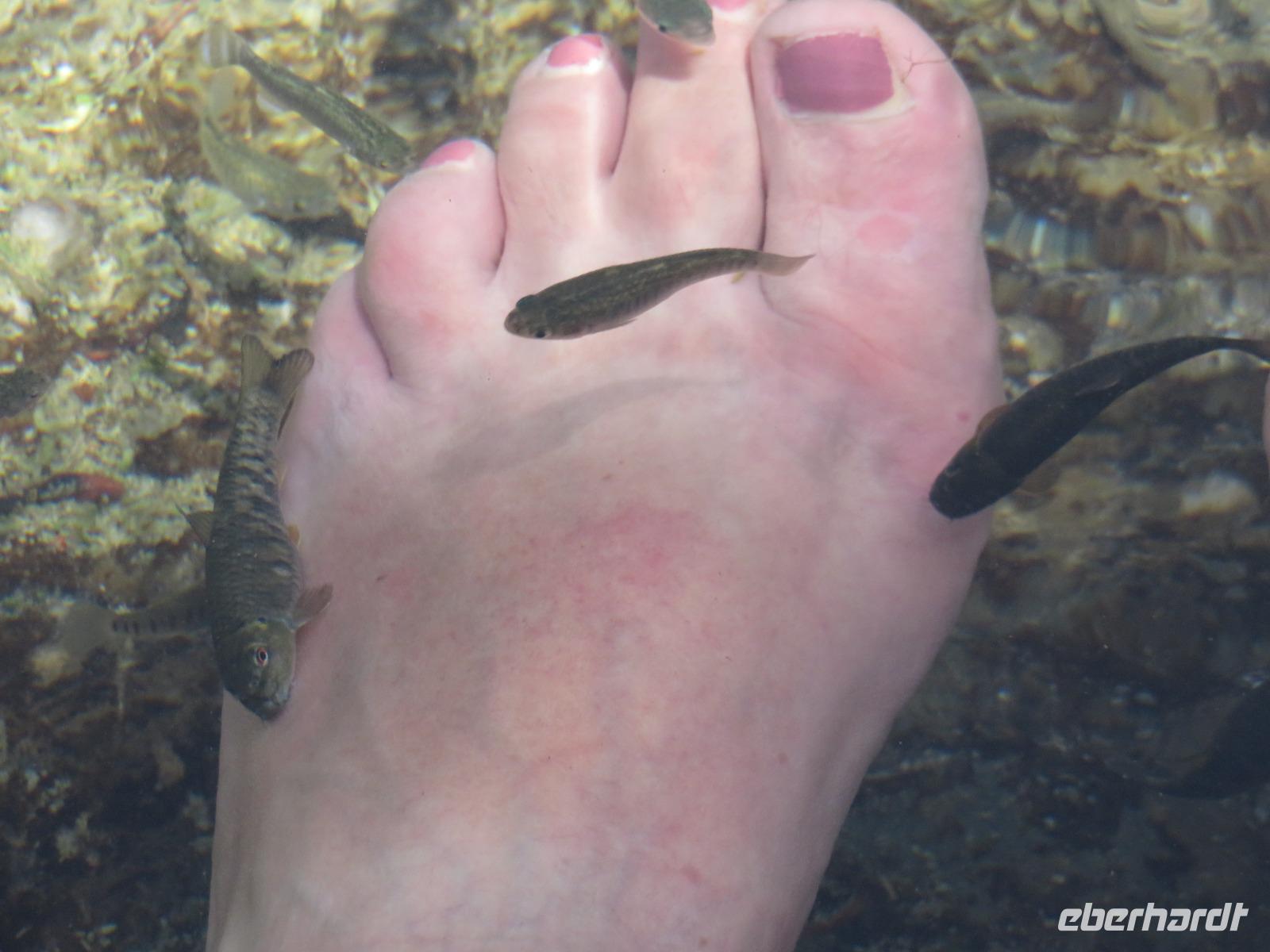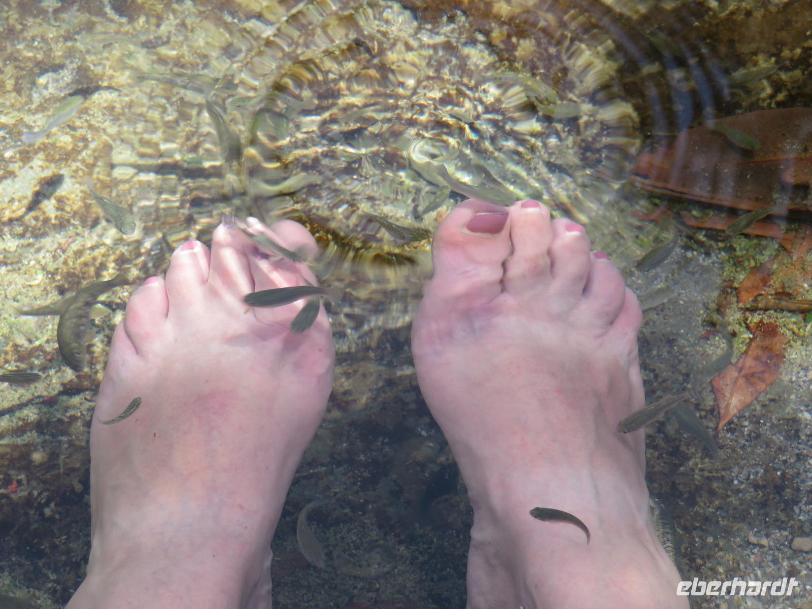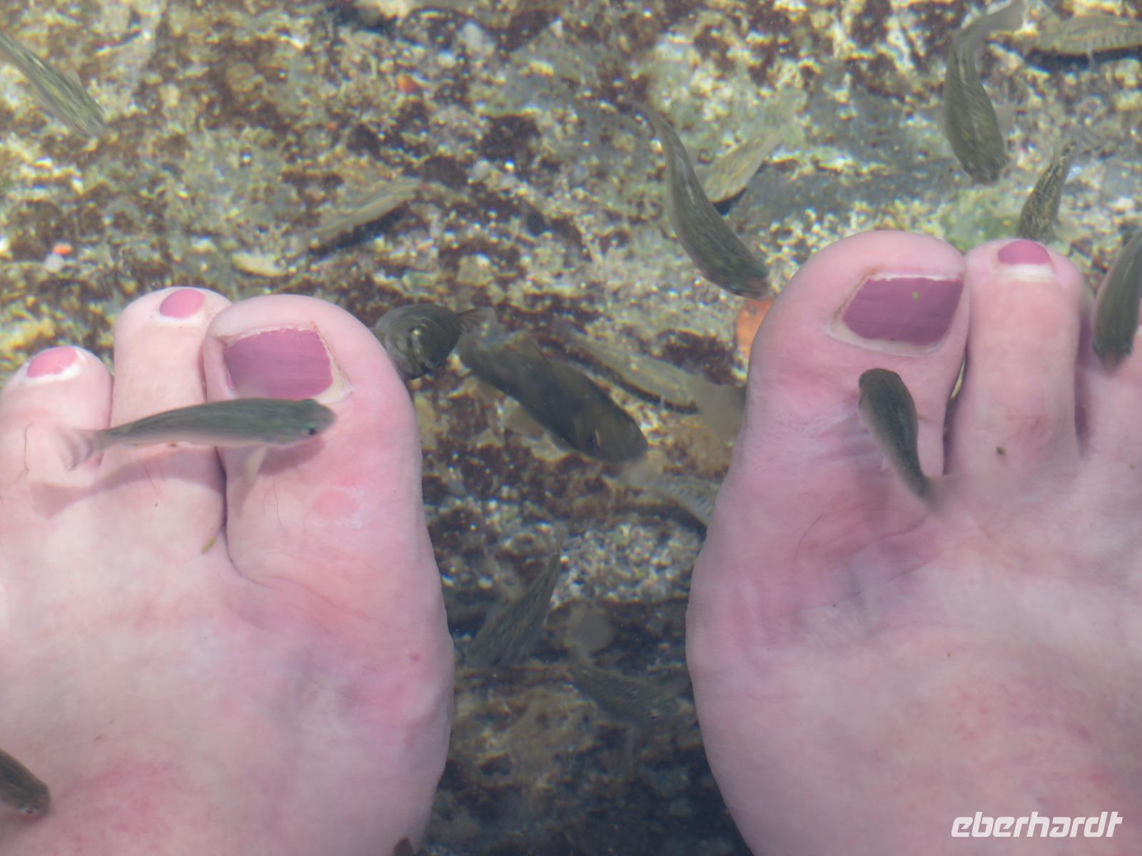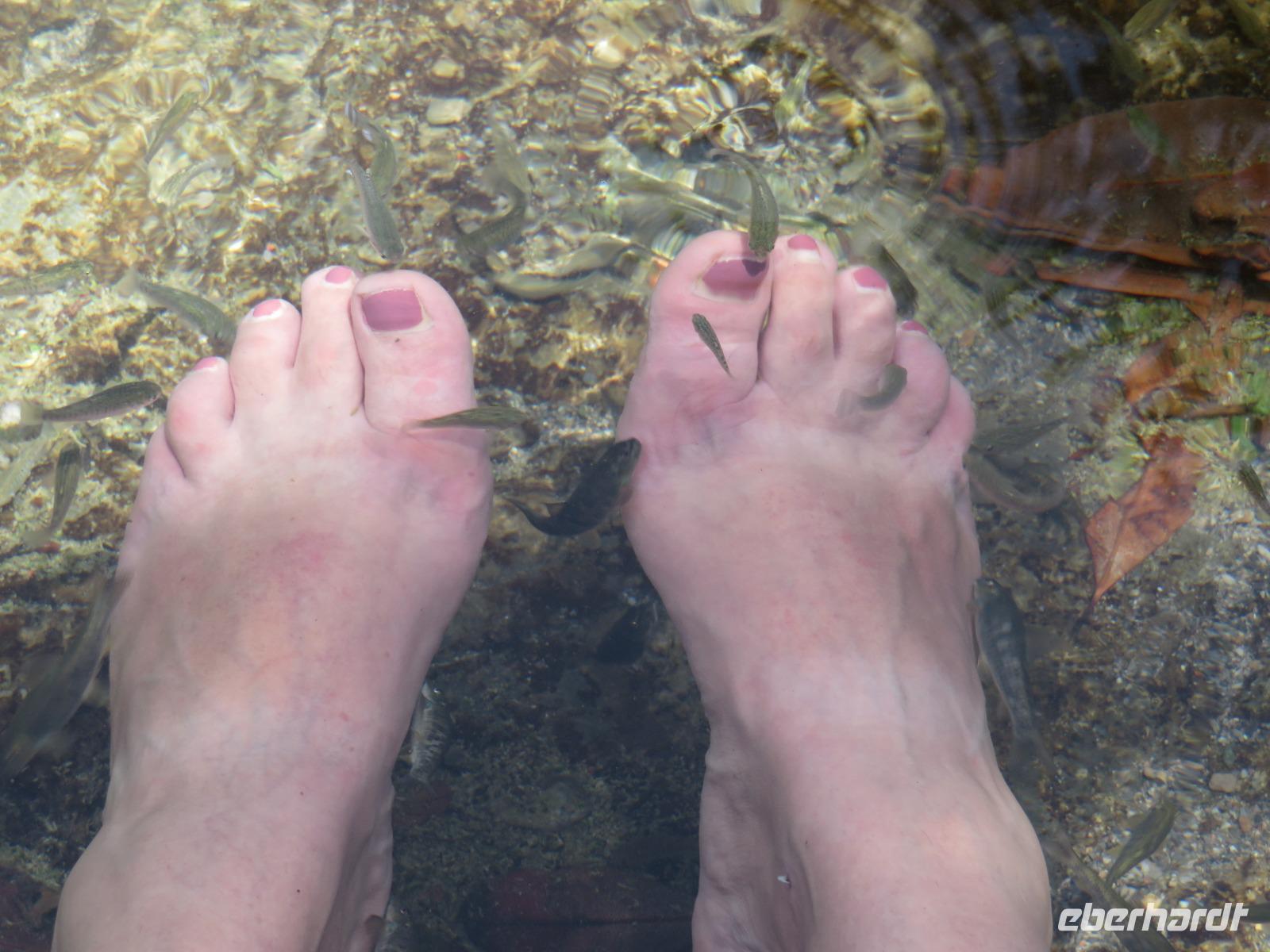 Bei strahlendem Sonnenschein besuchen wir zunächst den Fischmarkt in Barka. Jeden Morgen kommen die Fischer mit ihrem Fang auf den Markt zum Verkauf. Außerdem findet eine Auktion für die besten Fische statt. Beim Bummel entdecken wir große Thunfische, Sepias, Baraccudas, verschiedene Hechte, kleine Haie, Rochen und Fische zum Fritieren. Unser nächstes Ziel ist das Fort Nakahl. Es wurde 1990 aufwendig restauriert und diente dem Imam Said bin Sultan im 19. Jahrhundert als Wohnresidenz. Die Ursprünge der Anlage gehen bis ins 17. Jahrhundert zurück. Einige Räume sind wie zur Zeit des Imam eingerichtet. Vom Turm haben wir einen schönen Blick über die Landschaft mit Palmenhainen und Dörfern. An der warmen Quelle Ain Al Thowarah legen wir einen weiteren Stopp ein. Aus der Quelle tritt das Wasser mit einer Temperatur von etwa 40°C aus der Erde und fließt in einen kleinen Wadi. Im Fluss leben kleine Putzerfische, die die Hornhaut von den Füßen knappern. Die mutigen unter uns halten die Füße ins warme Wasser und lassen sich von den Fischen kitzeln. Am frühen Nachmittag kehren wir zum Hotel nach Muscat zurück. Es bleibt Zeit für einen Spaziergang zum Meer, bevor uns Tawfiq zum Abendessen in einem typischen omanischen Restaurant abholt. In einem netten Garten des Restaurants Kargeen werden wir mit arabischen Köstlichkeiten verwöhnt. Es gibt gegrilltes Lamm und Hühnchen, Hummus, arabischen Salat und natürlich Fladenbrot. Statt Wein oder Bier stießen wir mit Tawfiq auf die schöne Reise mit einer super leckeren Lemon-Minze-Limonade an und sagen Danke für seine tolle Begleitung und die interessanten Erklärungen zum Oman. Ein schöner Abschluss unserer gemeinsamen Entdeckungreise im Norden des Omans.