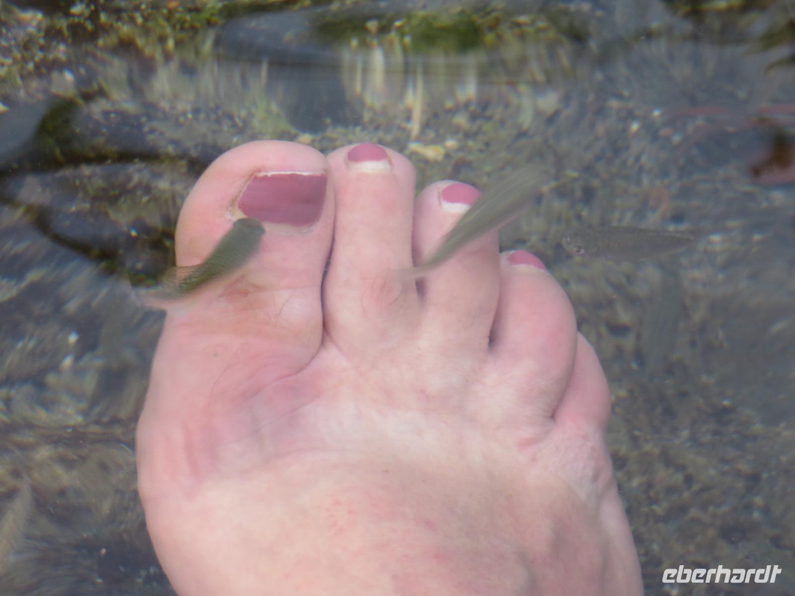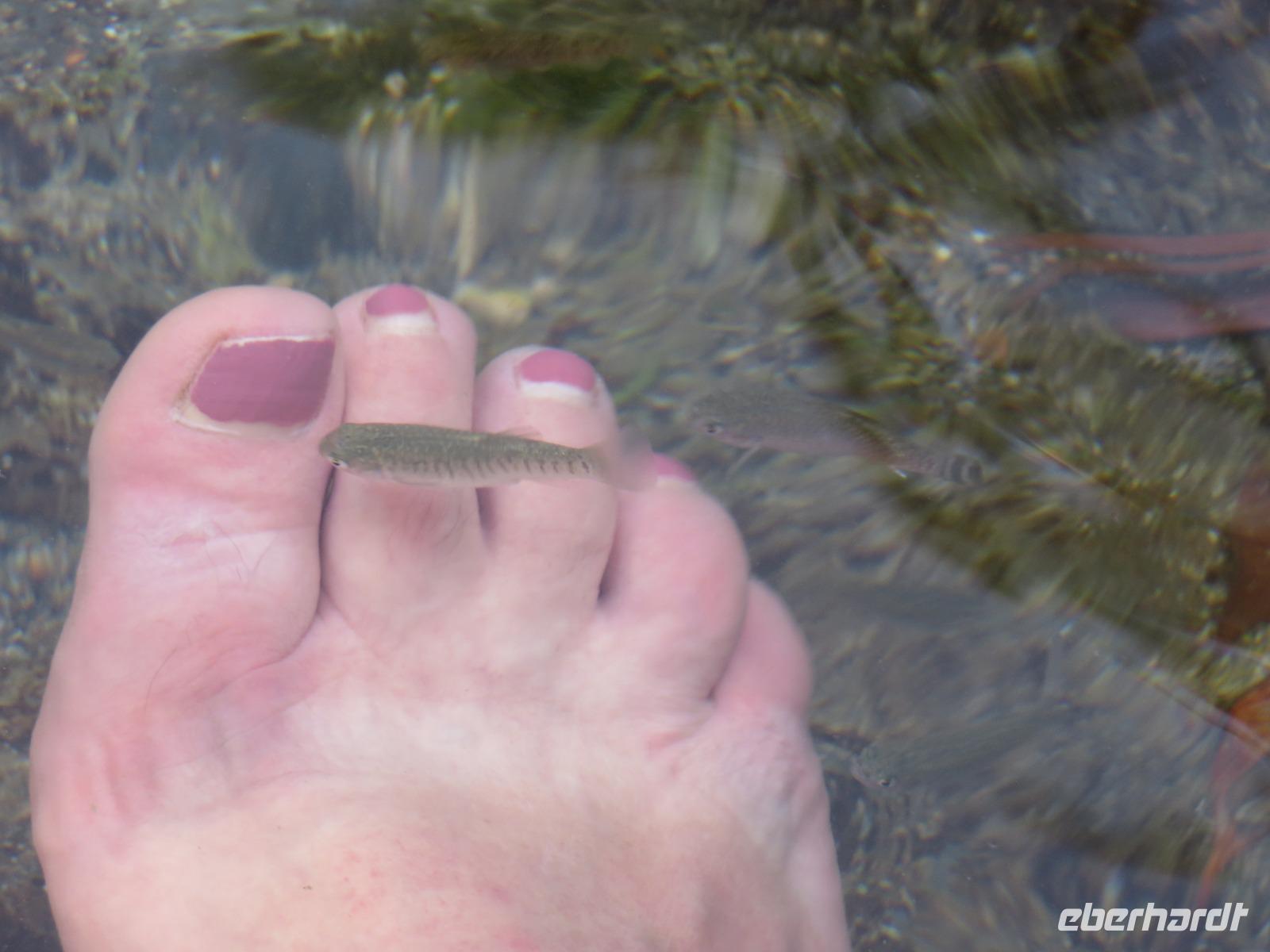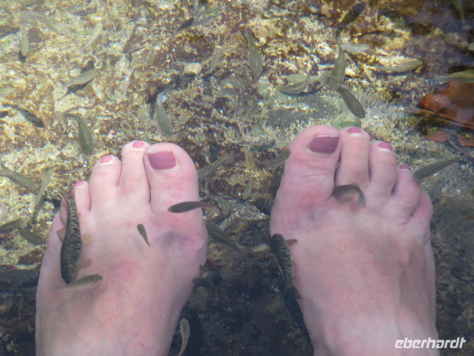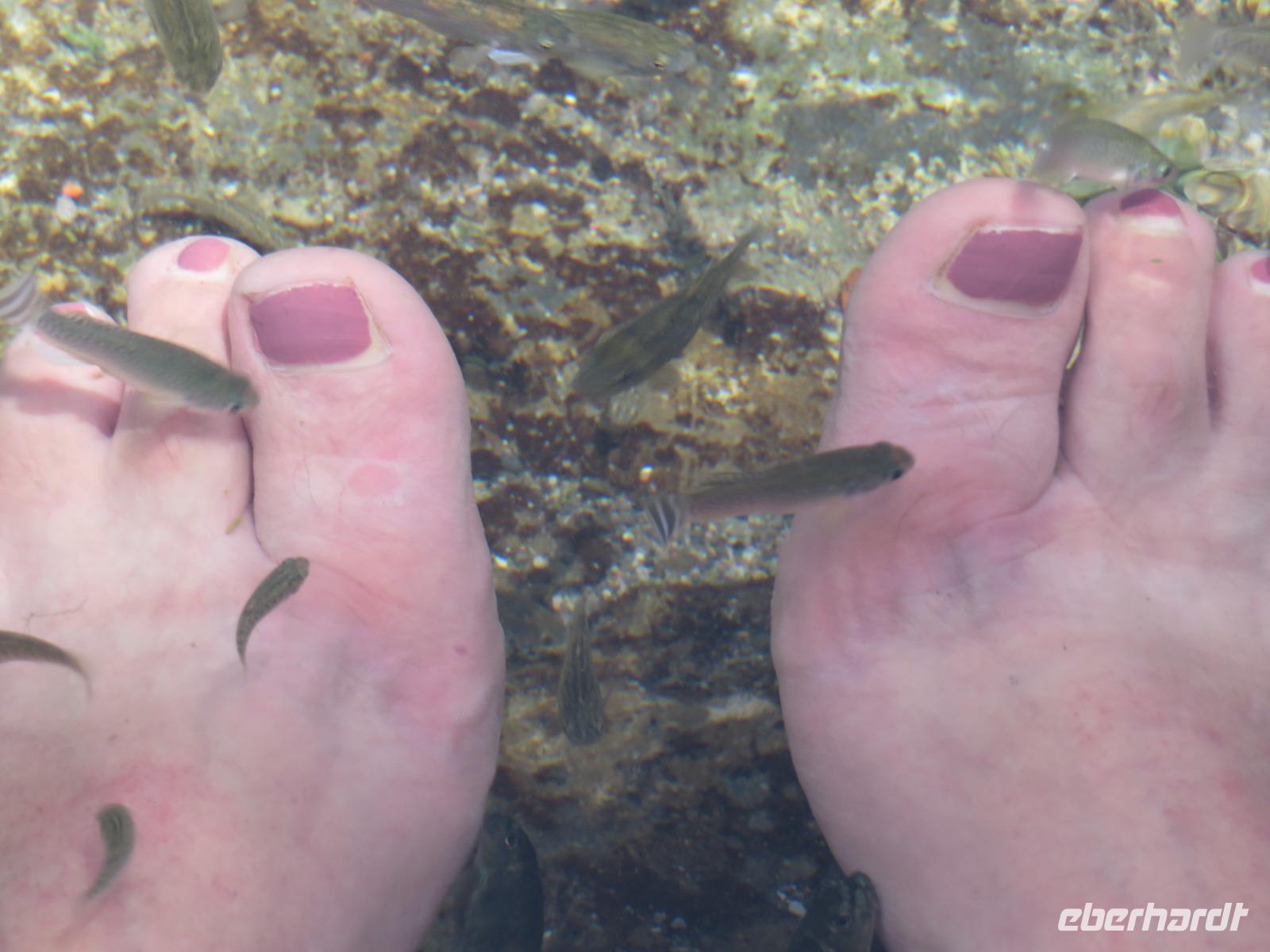Bei strahlendem Sonnenschein besuchen wir zunächst den Fischmarkt in Barka. Jeden Morgen kommen die Fischer mit ihrem Fang auf den Markt zum Verkauf. Außerdem findet eine Auktion für die besten Fische statt. Beim Bummel entdecken wir große Thunfische, Sepias, Baraccudas, verschiedene Hechte, kleine Haie, Rochen und Fische zum Fritieren. Unser nächstes Ziel ist das Fort Nakahl. Es wurde 1990 aufwendig restauriert und diente dem Imam Said bin Sultan im 19. Jahrhundert als Wohnresidenz. Die Ursprünge der Anlage gehen bis ins 17. Jahrhundert zurück. Einige Räume sind wie zur Zeit des Imam eingerichtet. Vom Turm haben wir einen schönen Blick über die Landschaft mit Palmenhainen und Dörfern. An der warmen Quelle Ain Al Thowarah legen wir einen weiteren Stopp ein. Aus der Quelle tritt das Wasser mit einer Temperatur von etwa 40°C aus der Erde und fließt in einen kleinen Wadi. Im Fluss leben kleine Putzerfische, die die Hornhaut von den Füßen knappern. Die mutigen unter uns halten die Füße ins warme Wasser und lassen sich von den Fischen kitzeln. Am frühen Nachmittag kehren wir zum Hotel nach Muscat zurück. Es bleibt Zeit für einen Spaziergang zum Meer, bevor uns Tawfiq zum Abendessen in einem typischen omanischen Restaurant abholt. In einem netten Garten des Restaurants Kargeen werden wir mit arabischen Köstlichkeiten verwöhnt. Es gibt gegrilltes Lamm und Hühnchen, Hummus, arabischen Salat und natürlich Fladenbrot. Statt Wein oder Bier stießen wir mit Tawfiq auf die schöne Reise mit einer super leckeren Lemon-Minze-Limonade an und sagen Danke für seine tolle Begleitung und die interessanten Erklärungen zum Oman. Ein schöner Abschluss unserer gemeinsamen Entdeckungreise im Norden des Omans.