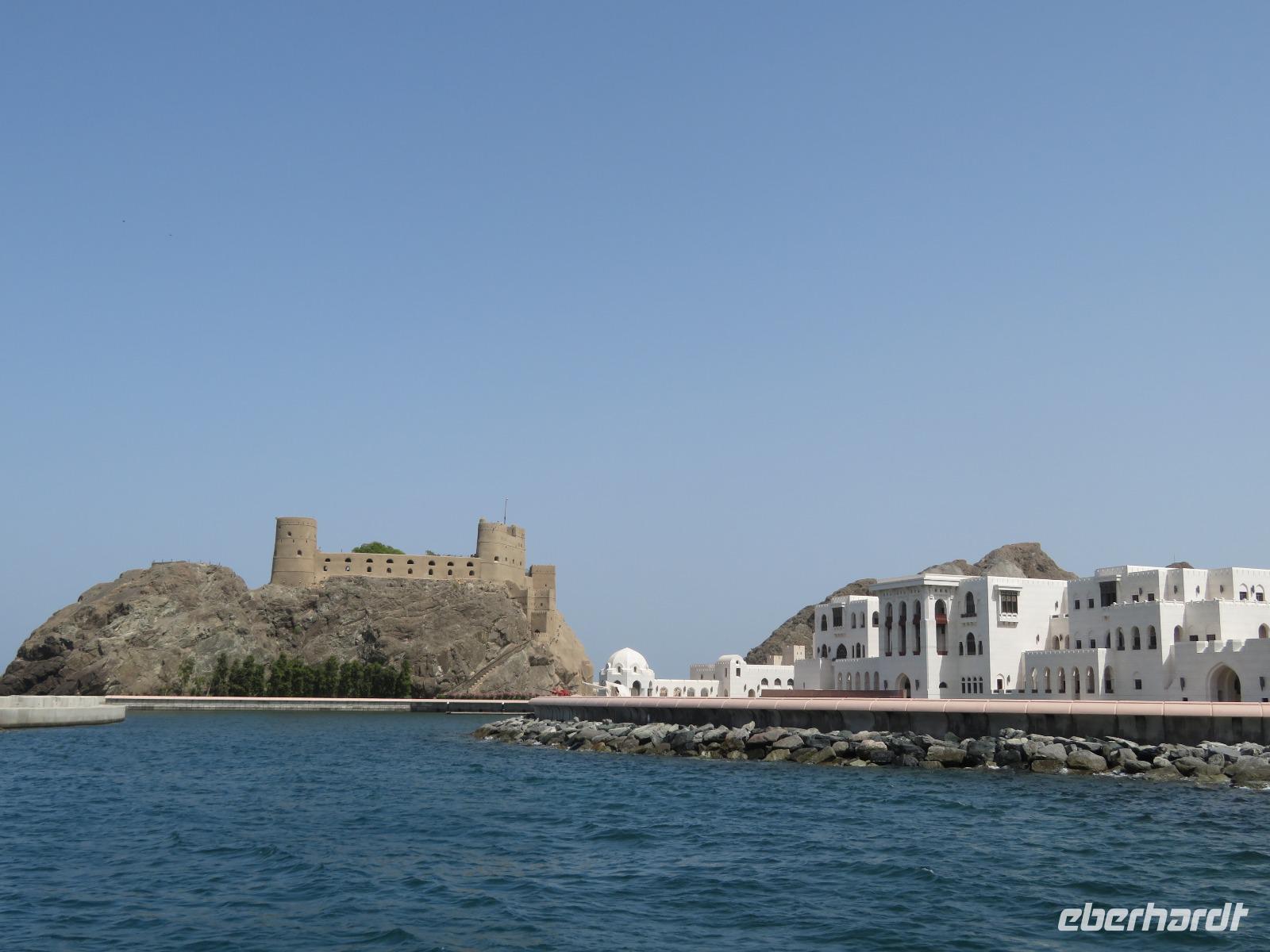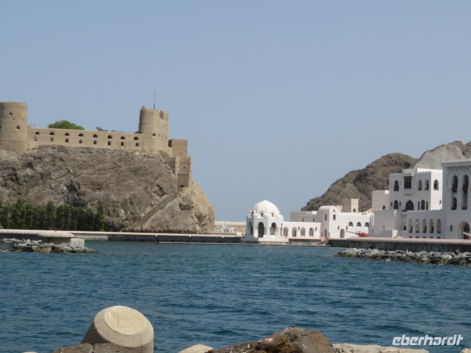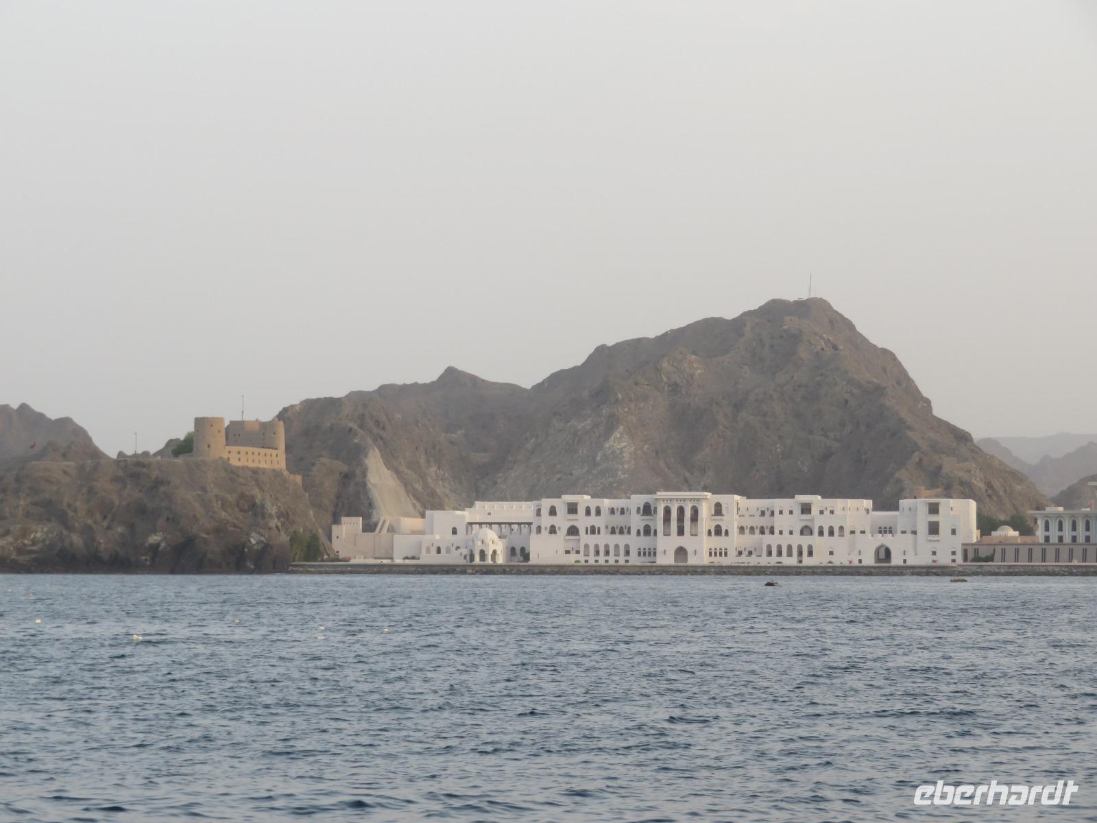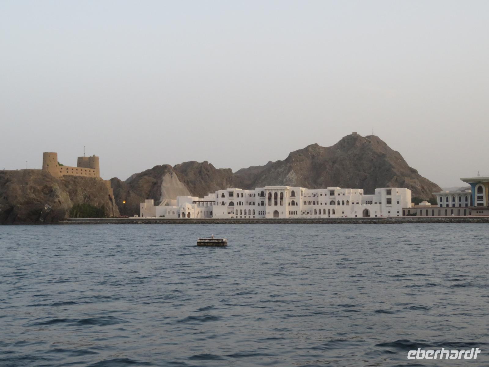 beiden, kleinen Kreuzfahrtschiffen ähnelnde Yachten des Sultans und den großen Weihrauchbrenner, ein Wahrzeichen der Stadt sehen. Anschließend bringt uns der Bus in das alte Muscat. Wir besuchen das Bait Al Zubair Museum, eine private Sammlung über das Leben der Omanis mit vielen Ausstellungsstücken wie Schmuck, traditioneller Kleidung, Dolchen und anderen Alltagsgegenständen. Weiter führt unsere Tour zum Sultanspalast Qasr al-Alam. Den prunkvollen Palast ließ Sultan Qaboos von Oman in den frühen 1970er Jahren auf der Stelle erweitern, wo die Al-Bu-Said-Regenten seit dem 19. Jahrhundert ihre Residenzen hatten. Der Palast dient heute für offizielle Anlässe und dem Empfang von Staatsgästen.Durch das schmiedeeisener Tor mit dem goldenen Staatswappen schauen wir auf das beeindruckende Gebäude, umgeben von bunten Natur-Blumenteppichen. Rechts und links wird das Gelände von zwei großen Festungen, Al Jalali und Al Mirani umgeben. Beide Burgen stammen aus der Zeit der portugiesischen Besatzung. Nach einem Fotostopp am beeindruckenden Opernhaus von Muscat, welches erst 2011 eröffnet wurde, fuhren wir zurück zum Hotel Ramada wir die kurze Verschnaufpause zu einem Strandspaziergang oder zu einem kurzen Schläfchen nutzten.