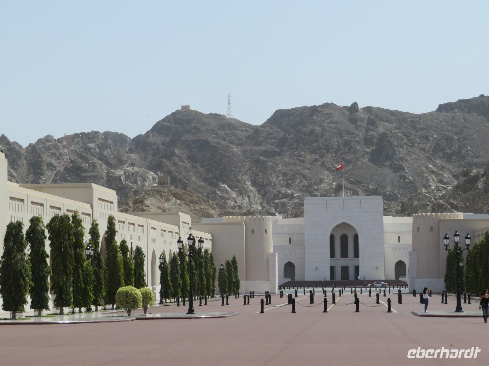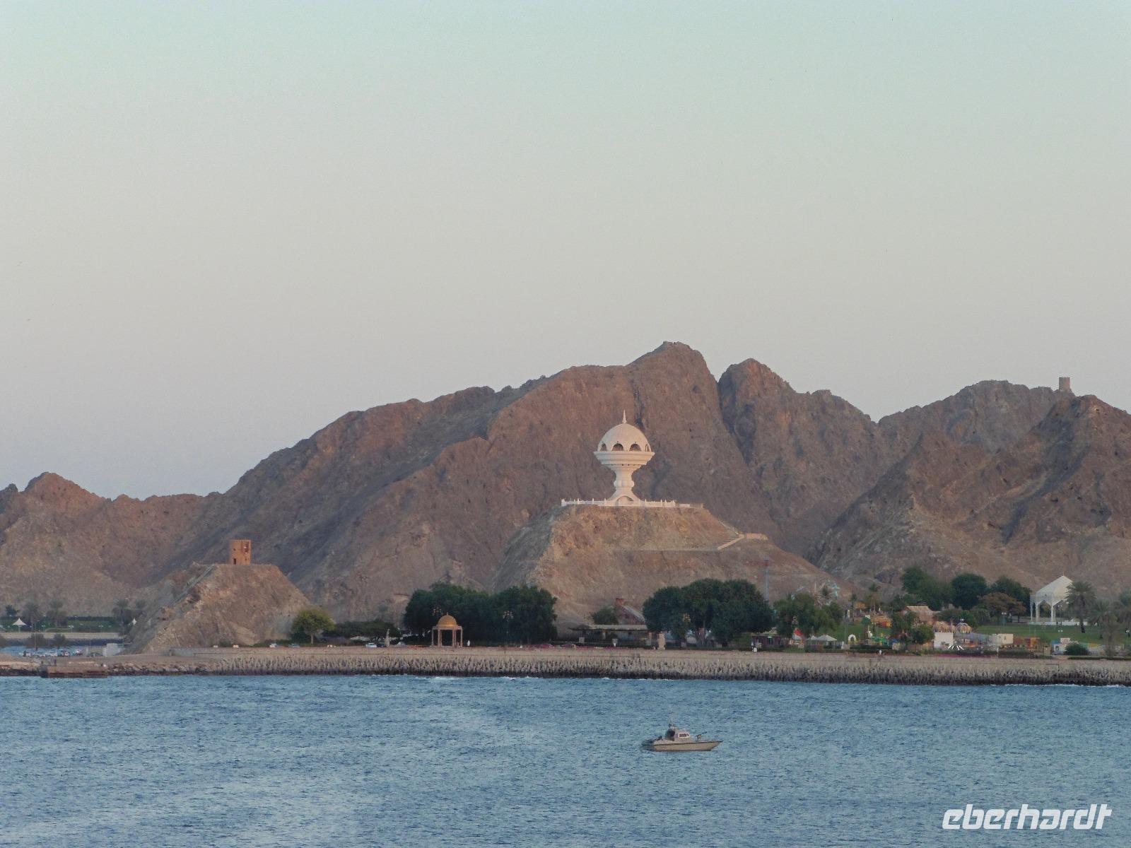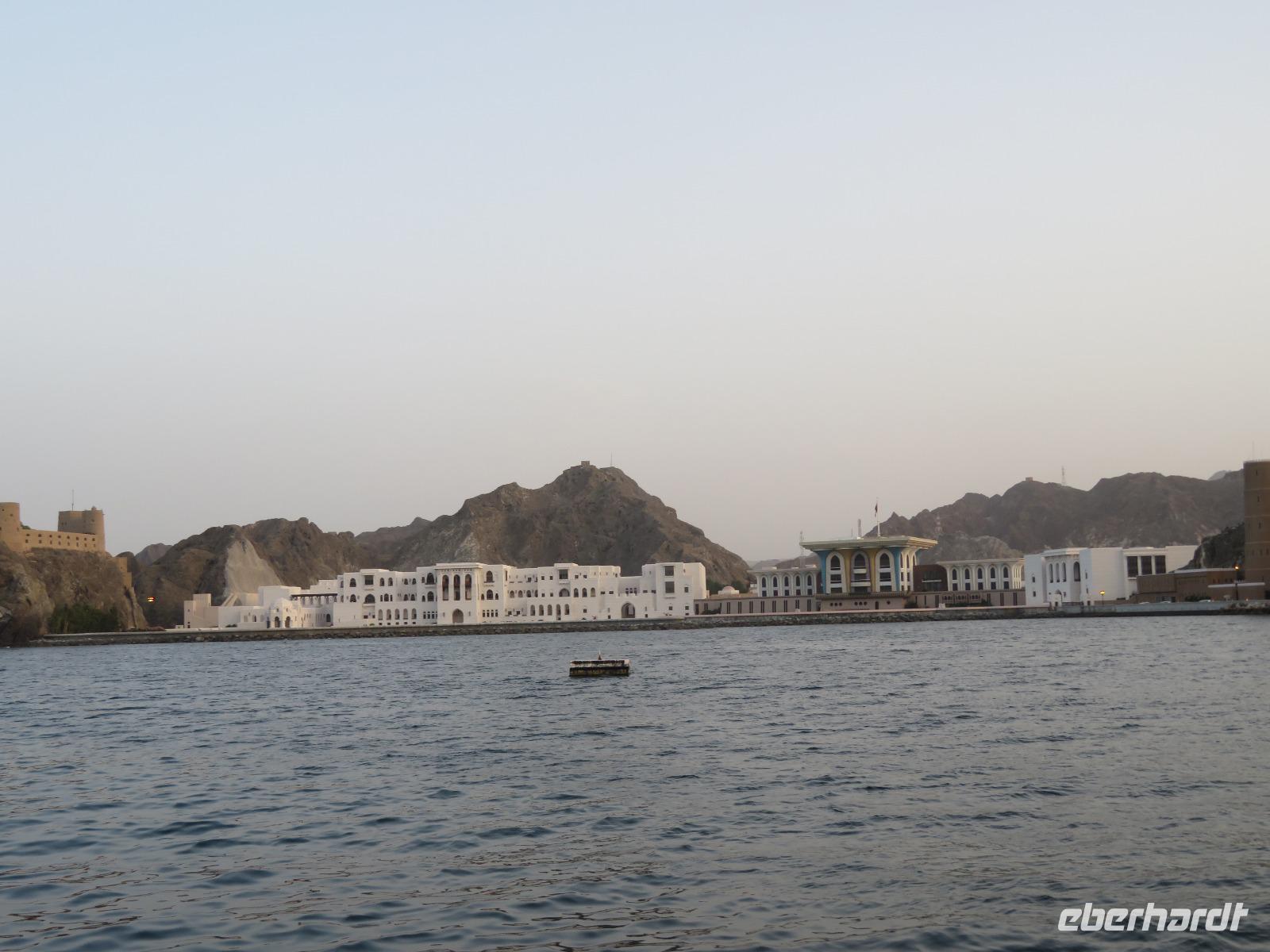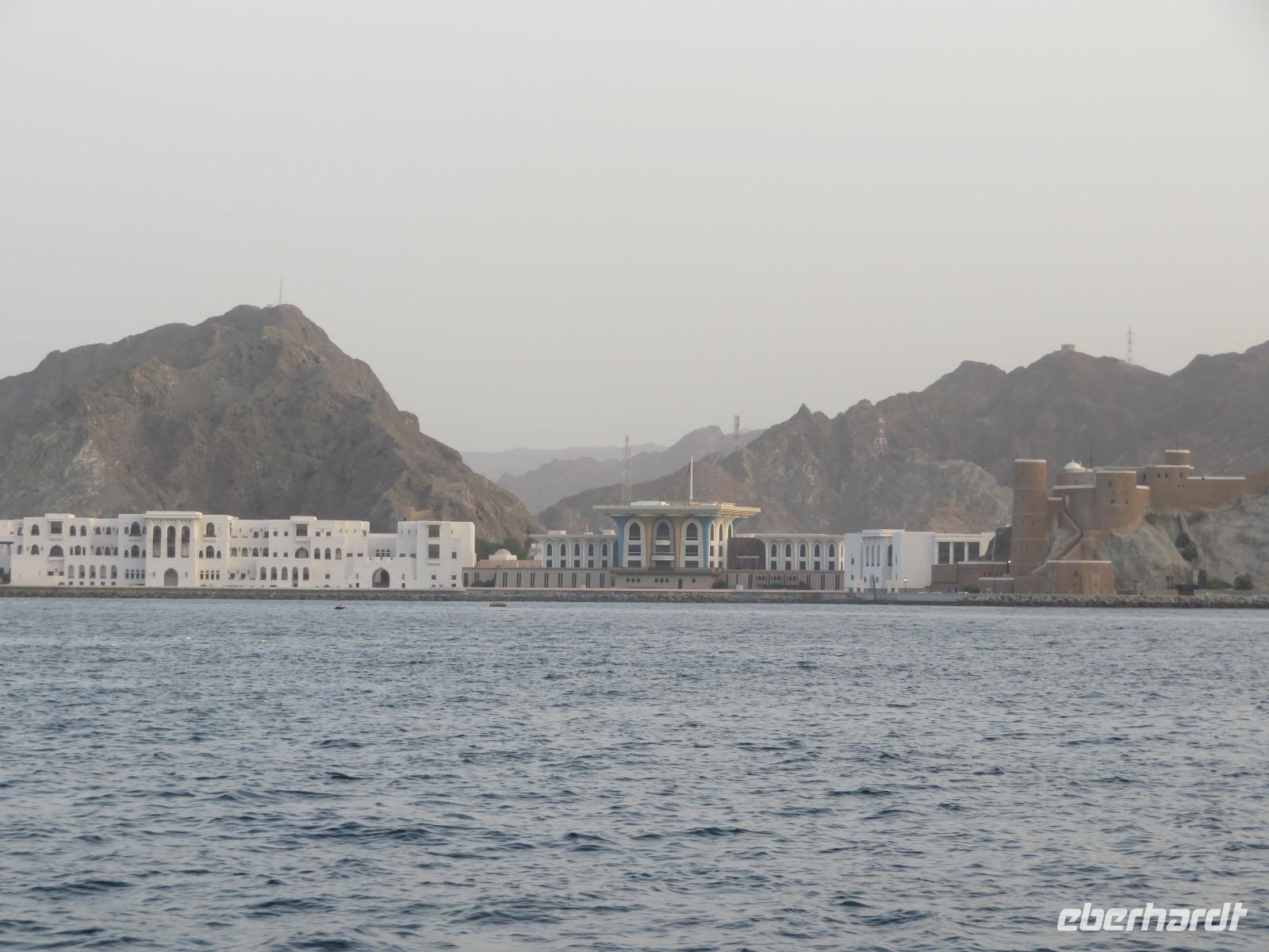 beiden, kleinen Kreuzfahrtschiffen ähnelnde Yachten des Sultans und den großen Weihrauchbrenner, ein Wahrzeichen der Stadt sehen. Anschließend bringt uns der Bus in das alte Muscat. Wir besuchen das Bait Al Zubair Museum, eine private Sammlung über das Leben der Omanis mit vielen Ausstellungsstücken wie Schmuck, traditioneller Kleidung, Dolchen und anderen Alltagsgegenständen. Weiter führt unsere Tour zum Sultanspalast Qasr al-Alam. Den prunkvollen Palast ließ Sultan Qaboos von Oman in den frühen 1970er Jahren auf der Stelle erweitern, wo die Al-Bu-Said-Regenten seit dem 19. Jahrhundert ihre Residenzen hatten. Der Palast dient heute für offizielle Anlässe und dem Empfang von Staatsgästen.Durch das schmiedeeisener Tor mit dem goldenen Staatswappen schauen wir auf das beeindruckende Gebäude, umgeben von bunten Natur-Blumenteppichen. Rechts und links wird das Gelände von zwei großen Festungen, Al Jalali und Al Mirani umgeben. Beide Burgen stammen aus der Zeit der portugiesischen Besatzung. Nach einem Fotostopp am beeindruckenden Opernhaus von Muscat, welches erst 2011 eröffnet wurde, fuhren wir zurück zum Hotel Ramada wir die kurze Verschnaufpause zu einem Strandspaziergang oder zu einem kurzen Schläfchen nutzten.
