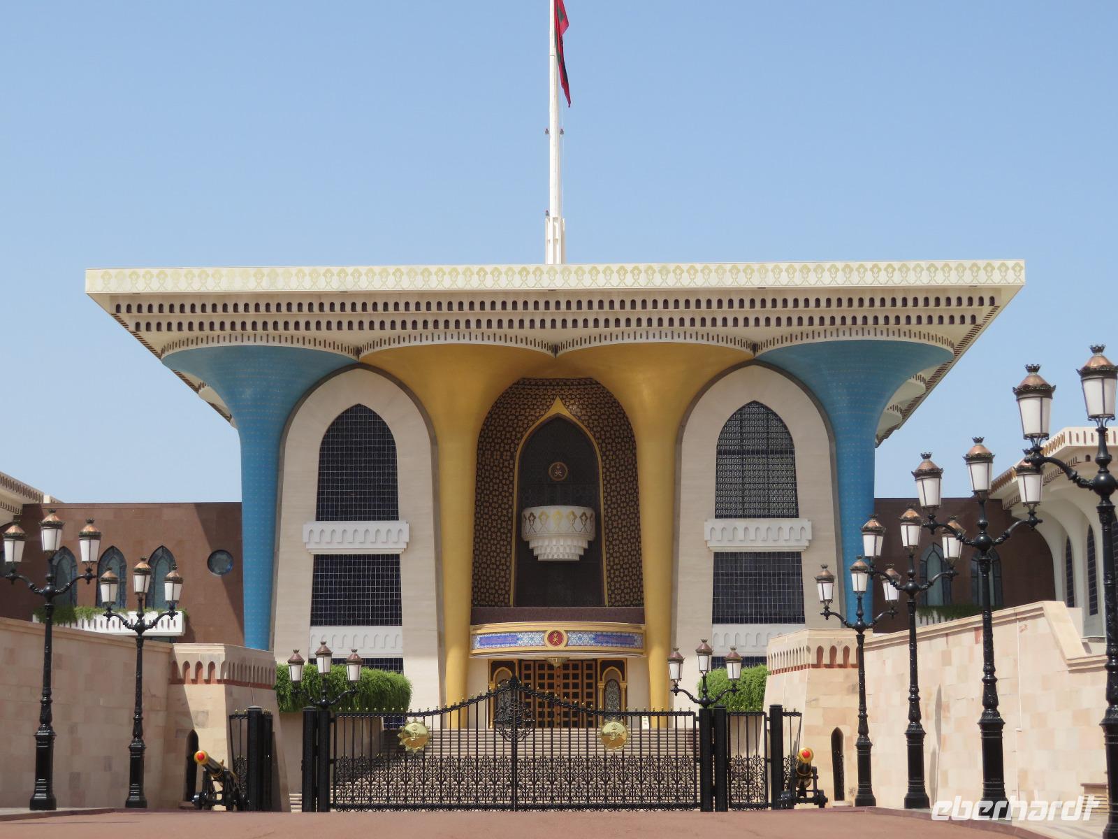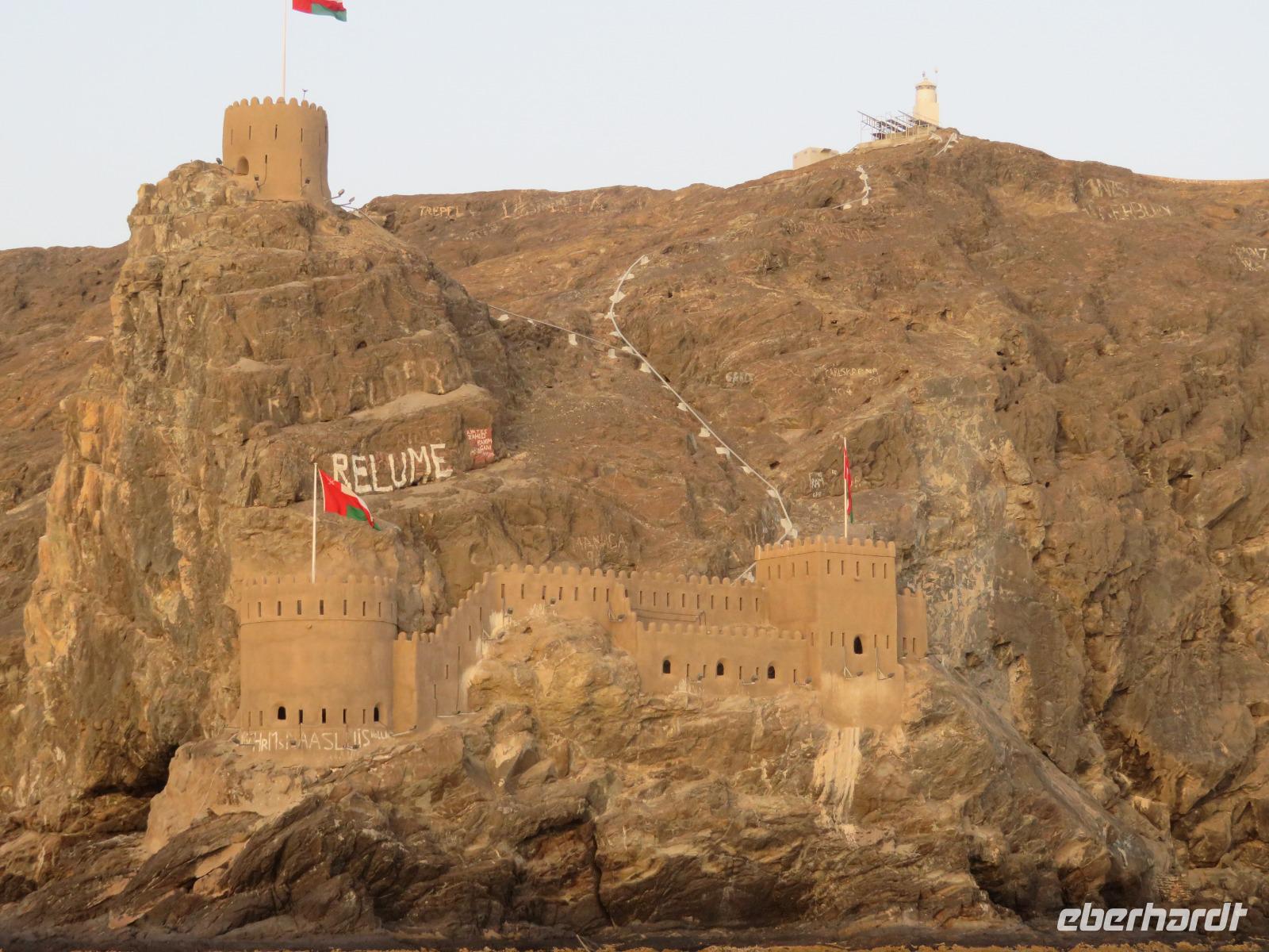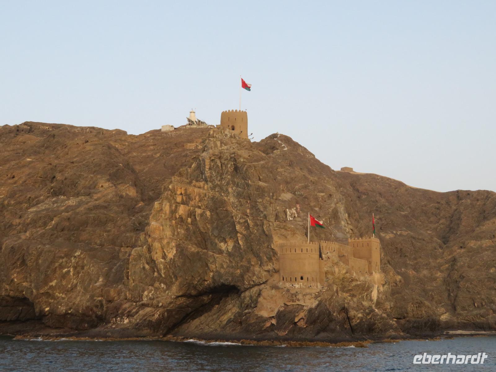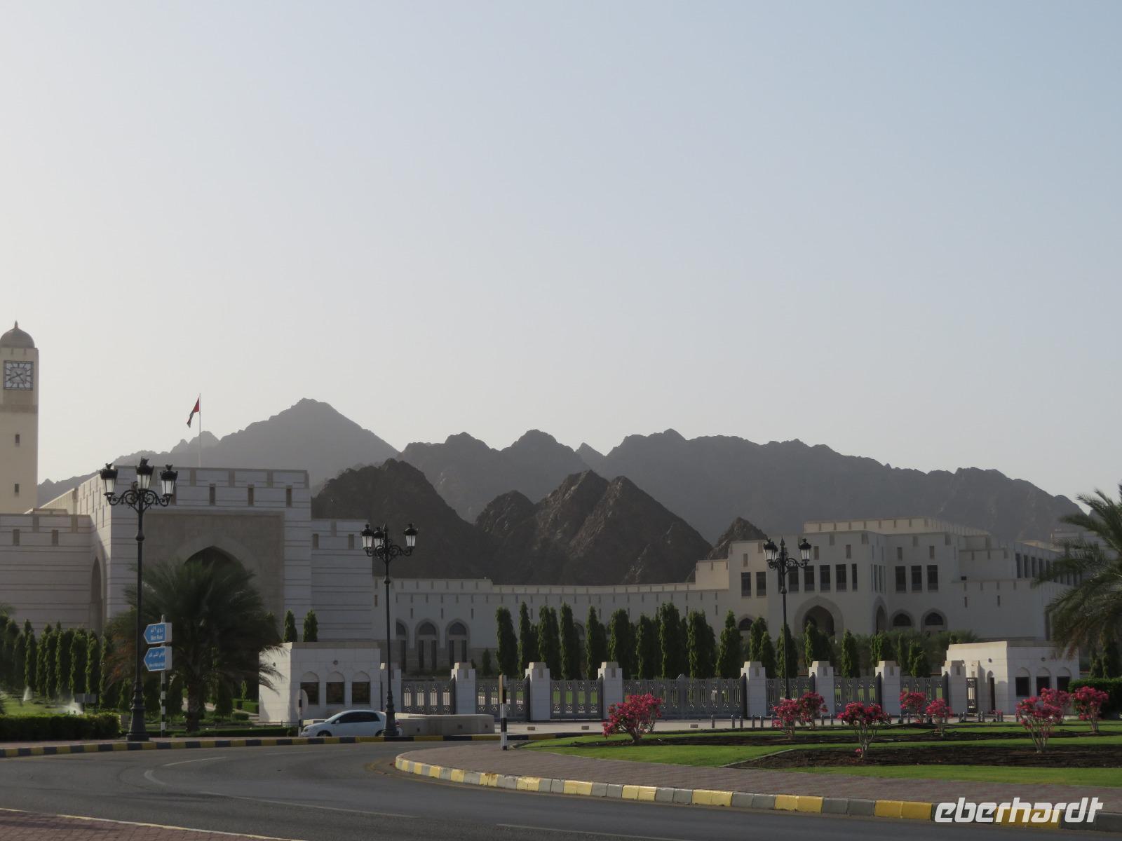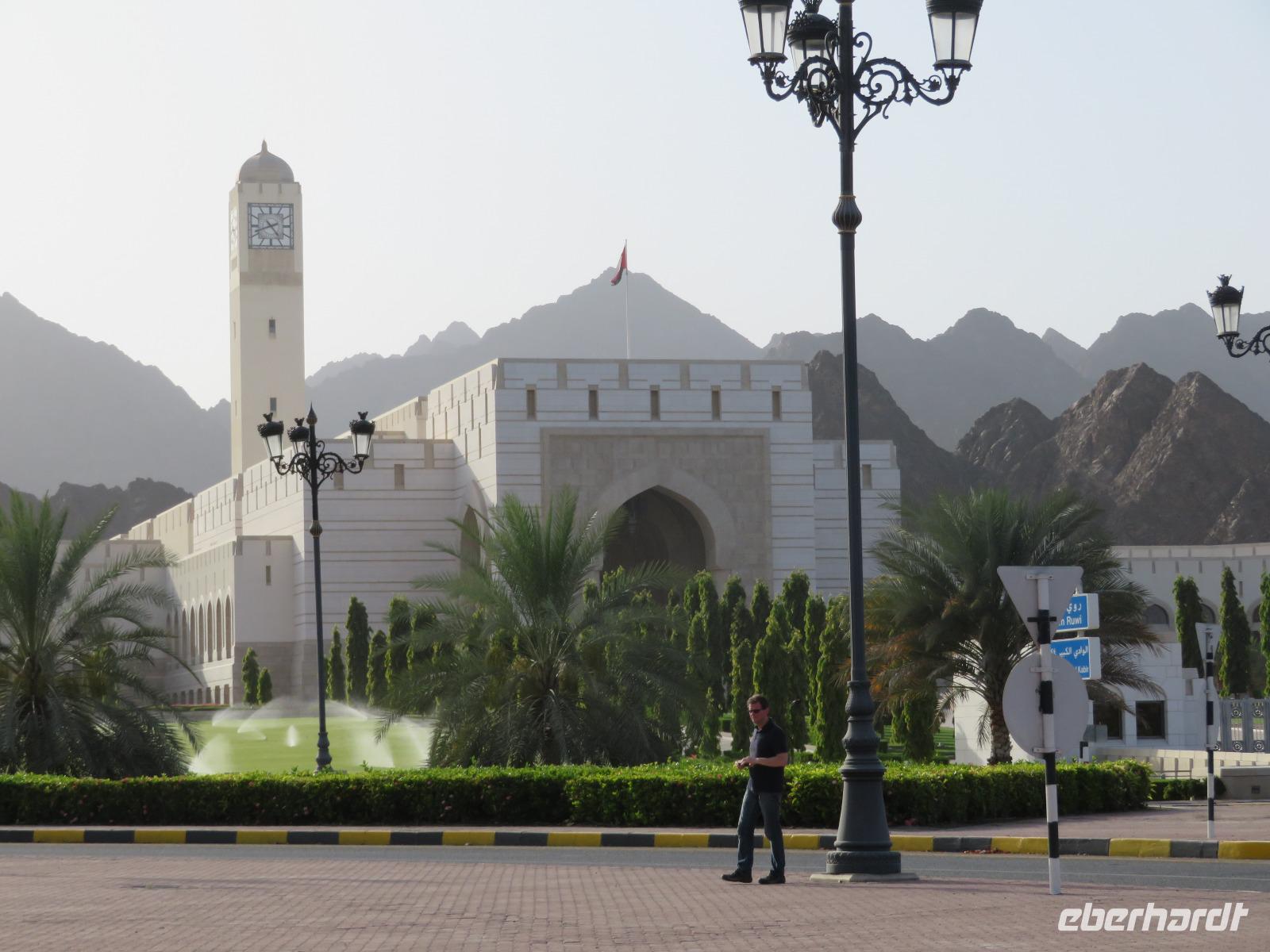 beiden, kleinen Kreuzfahrtschiffen ähnelnde Yachten des Sultans und den großen Weihrauchbrenner, ein Wahrzeichen der Stadt sehen. Anschließend bringt uns der Bus in das alte Muscat. Wir besuchen das Bait Al Zubair Museum, eine private Sammlung über das Leben der Omanis mit vielen Ausstellungsstücken wie Schmuck, traditioneller Kleidung, Dolchen und anderen Alltagsgegenständen. Weiter führt unsere Tour zum Sultanspalast Qasr al-Alam. Den prunkvollen Palast ließ Sultan Qaboos von Oman in den frühen 1970er Jahren auf der Stelle erweitern, wo die Al-Bu-Said-Regenten seit dem 19. Jahrhundert ihre Residenzen hatten. Der Palast dient heute für offizielle Anlässe und dem Empfang von Staatsgästen.Durch das schmiedeeisener Tor mit dem goldenen Staatswappen schauen wir auf das beeindruckende Gebäude, umgeben von bunten Natur-Blumenteppichen. Rechts und links wird das Gelände von zwei großen Festungen, Al Jalali und Al Mirani umgeben. Beide Burgen stammen aus der Zeit der portugiesischen Besatzung. Nach einem Fotostopp am beeindruckenden Opernhaus von Muscat, welches erst 2011 eröffnet wurde, fuhren wir zurück zum Hotel Ramada wir die kurze Verschnaufpause zu einem Strandspaziergang oder zu einem kurzen Schläfchen nutzten.