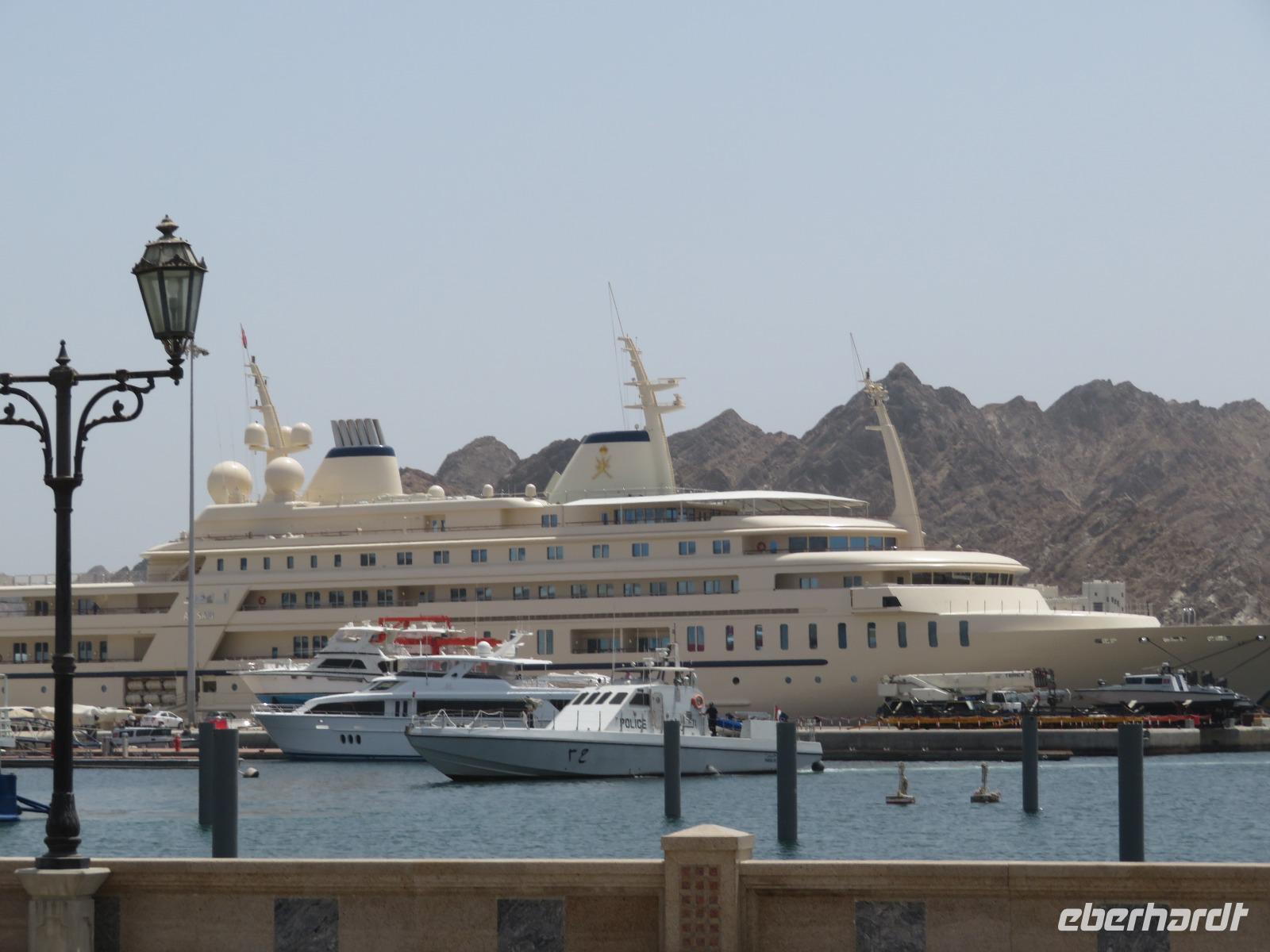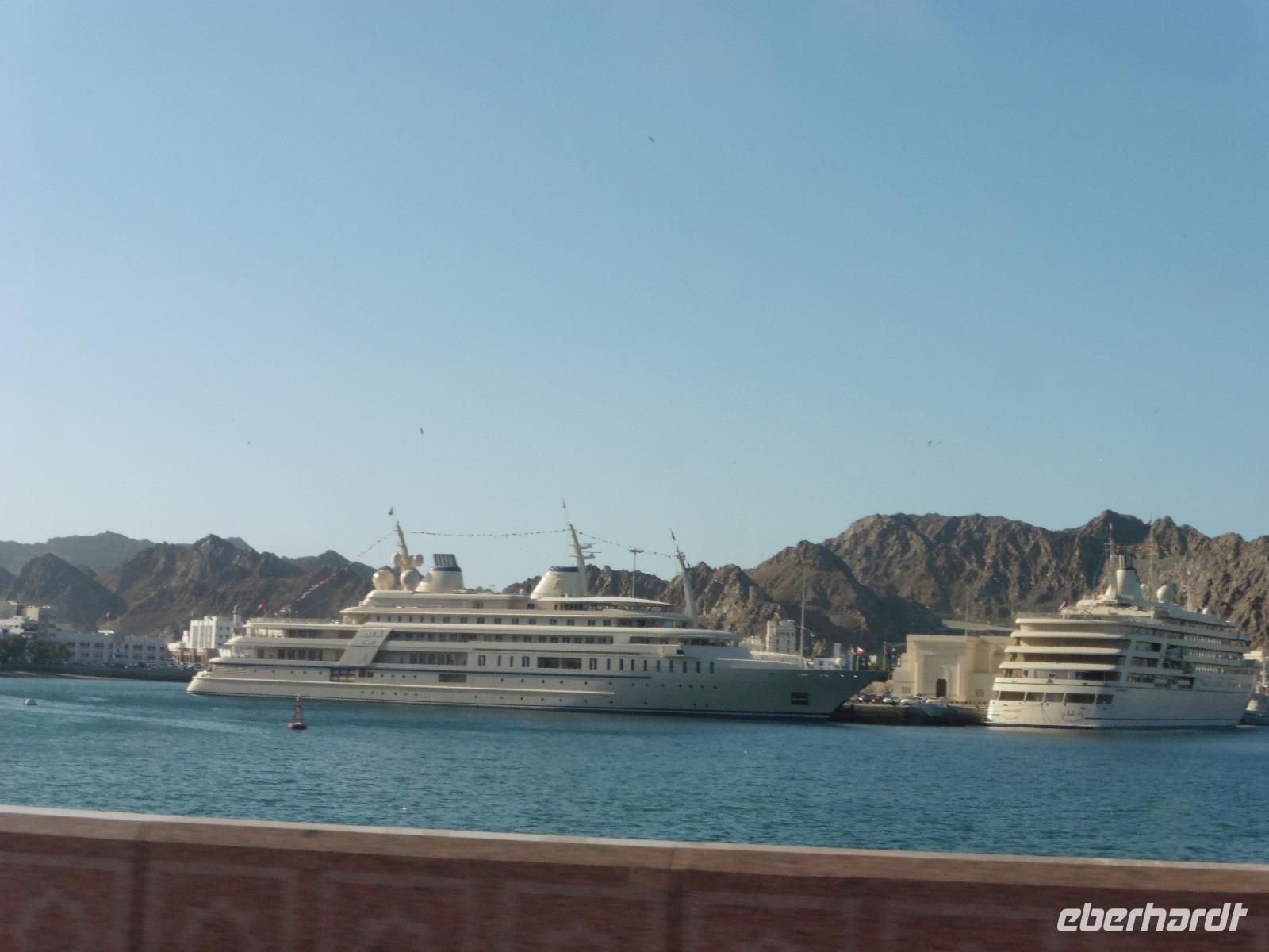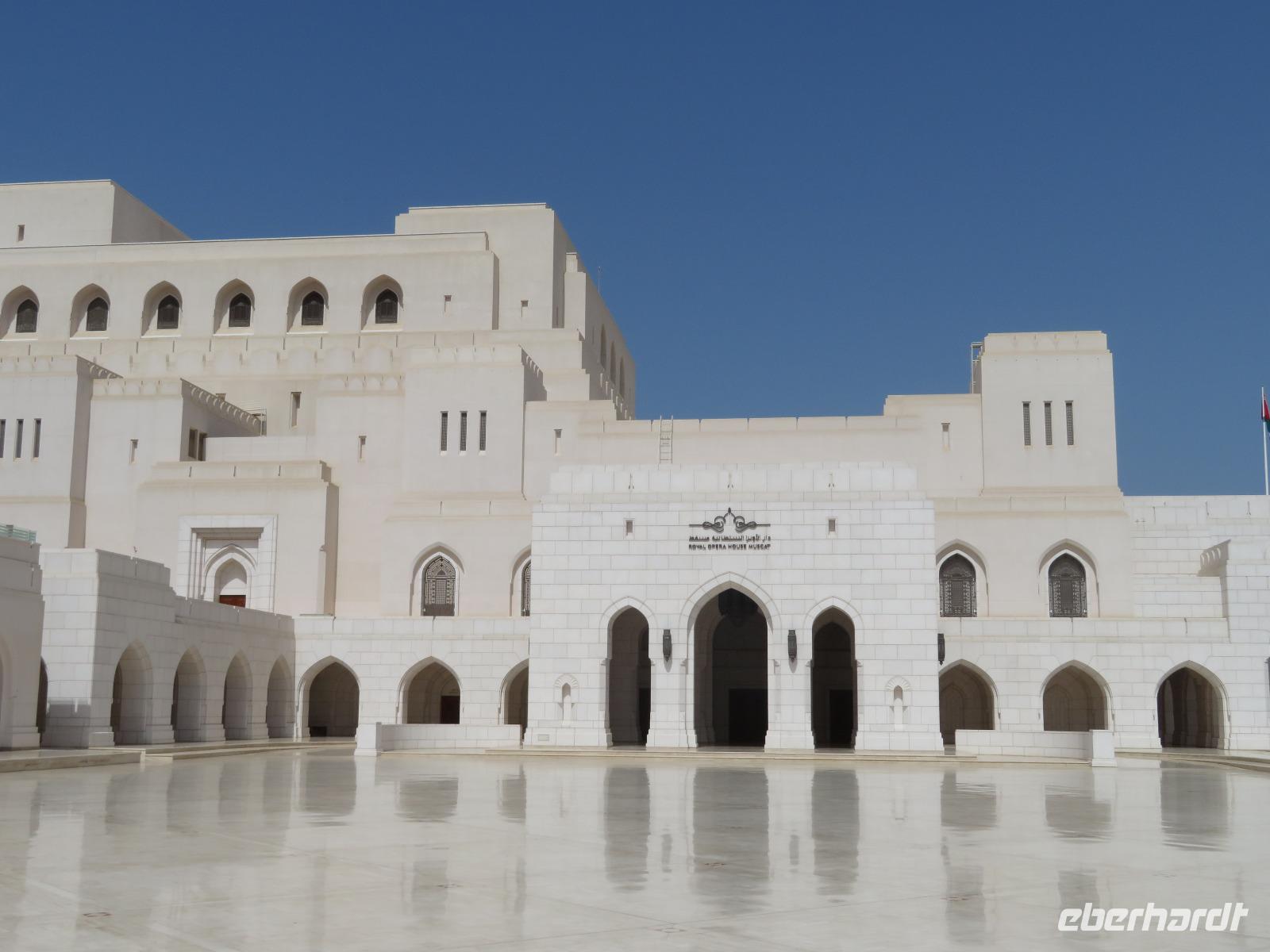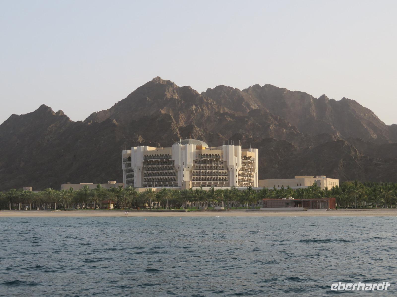 beiden, kleinen Kreuzfahrtschiffen ähnelnde Yachten des Sultans und den großen Weihrauchbrenner, ein Wahrzeichen der Stadt sehen. Anschließend bringt uns der Bus in das alte Muscat. Wir besuchen das Bait Al Zubair Museum, eine private Sammlung über das Leben der Omanis mit vielen Ausstellungsstücken wie Schmuck, traditioneller Kleidung, Dolchen und anderen Alltagsgegenständen. Weiter führt unsere Tour zum Sultanspalast Qasr al-Alam. Den prunkvollen Palast ließ Sultan Qaboos von Oman in den frühen 1970er Jahren auf der Stelle erweitern, wo die Al-Bu-Said-Regenten seit dem 19. Jahrhundert ihre Residenzen hatten. Der Palast dient heute für offizielle Anlässe und dem Empfang von Staatsgästen.Durch das schmiedeeisener Tor mit dem goldenen Staatswappen schauen wir auf das beeindruckende Gebäude, umgeben von bunten Natur-Blumenteppichen. Rechts und links wird das Gelände von zwei großen Festungen, Al Jalali und Al Mirani umgeben. Beide Burgen stammen aus der Zeit der portugiesischen Besatzung. Nach einem Fotostopp am beeindruckenden Opernhaus von Muscat, welches erst 2011 eröffnet wurde, fuhren wir zurück zum Hotel Ramada wir die kurze Verschnaufpause zu einem Strandspaziergang oder zu einem kurzen Schläfchen nutzten.