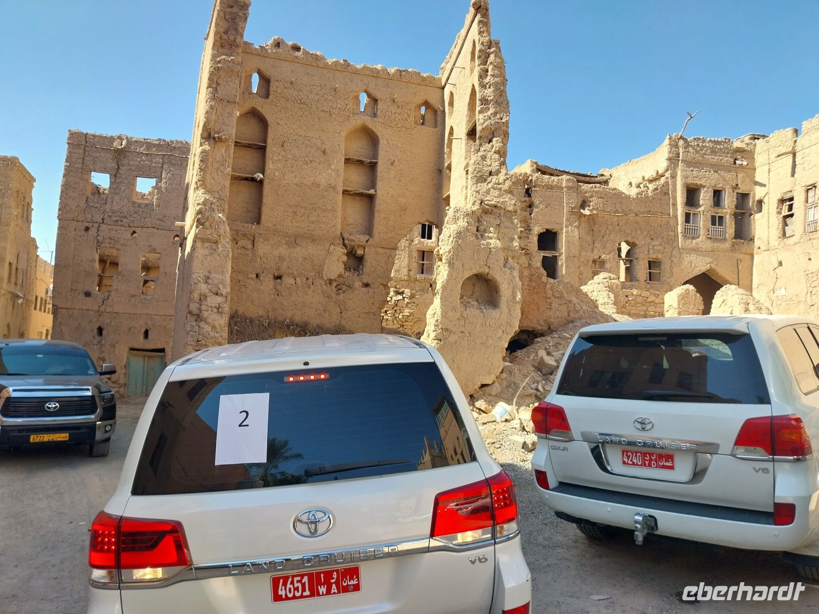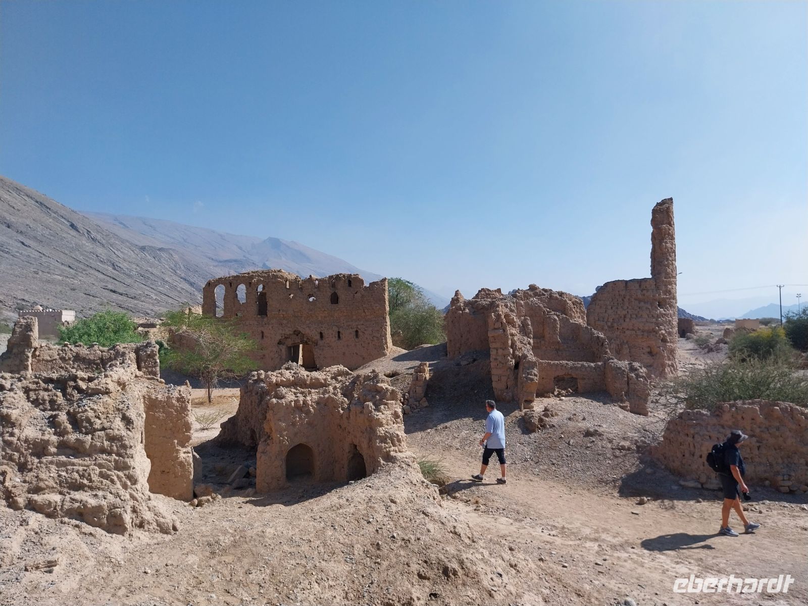 Schon bald erreichen wir Nizwa, am Fuße der höchsten Berge des Oman gelegen. Wir beginnen unser Besichtigungsprogramm mit einem Halt am Wadi Tanuf. Das Dorf Tanuf wurde in den 1950er Jahren von der alliierten britischen Luftwaffe bombardiert. Es wurde nicht mehr aufgebaut. Übrig geblieben ist eine bizarre Ruinenstadt aus Lehm.
