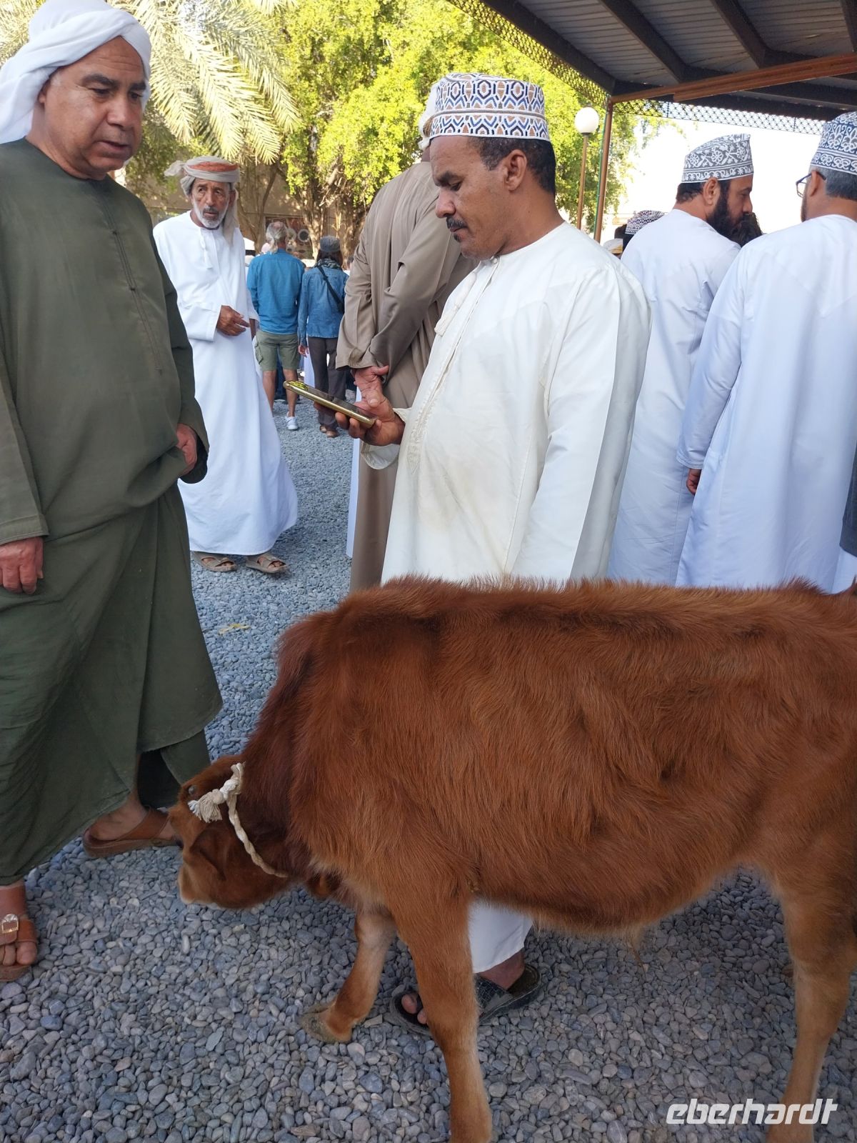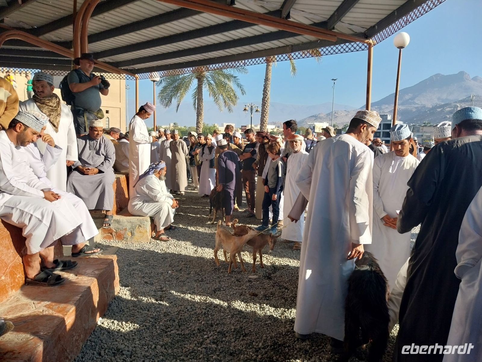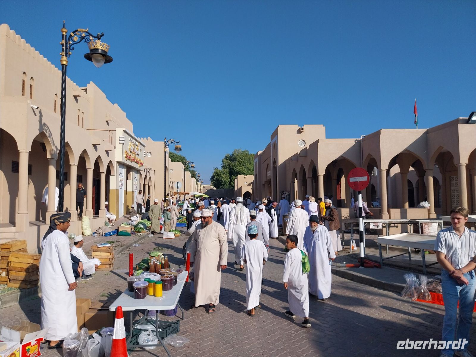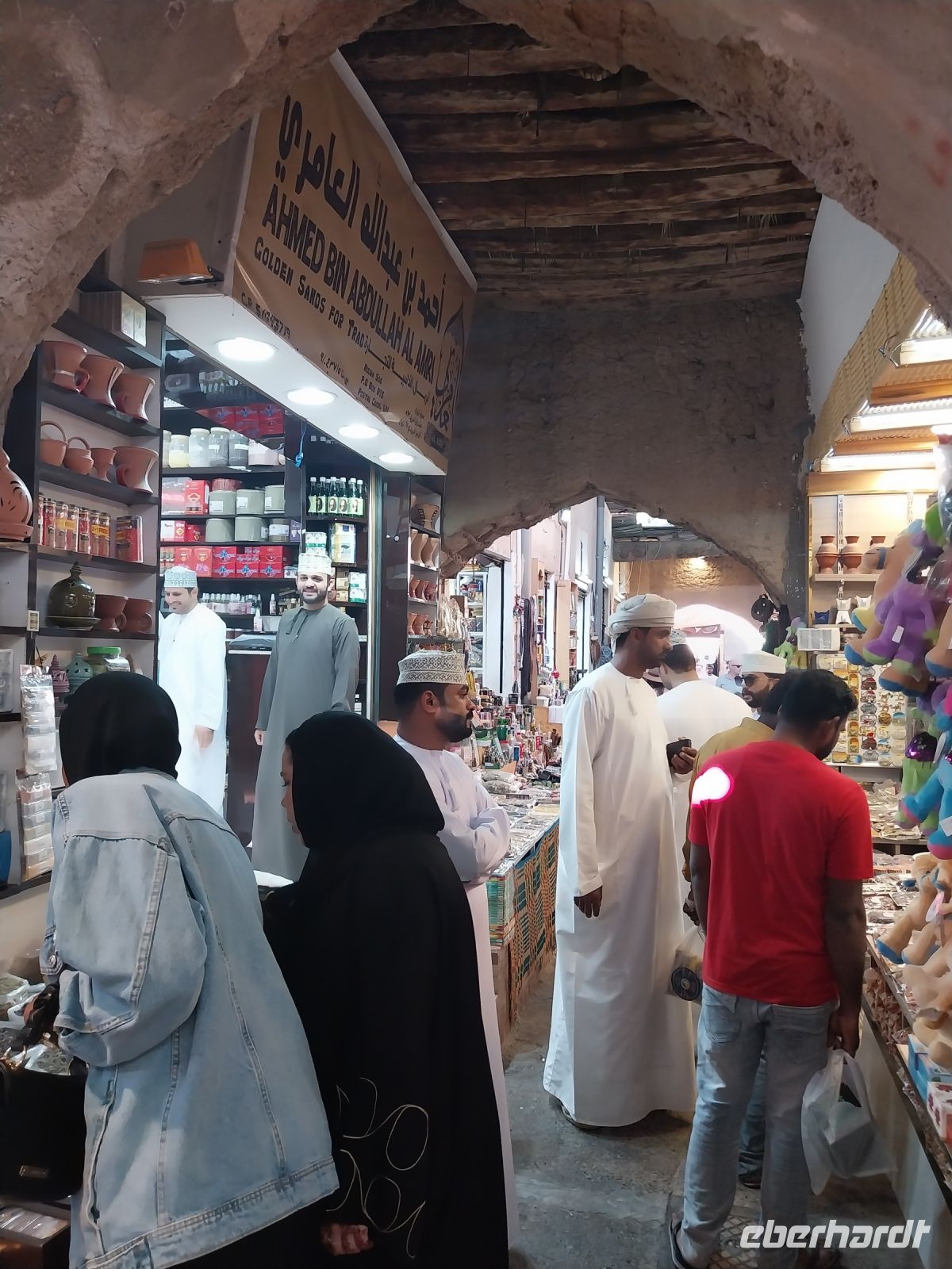 Wir beginnen heute mit dem Besuch der Altstadt von Nizwa. Es ist Freitag, das bedeutet es ist der wichtigste Markttag der Woche. Es ist eine Szenerie wie sie sich seit hunderten von Jahren abspielt – der Viehmarkt von Nizwa. Neben der Stadtmauer führen die Verkäufer ihre Ziegen, Schafe und Kühe im Kreis und feilschen dabei mit den Kaufinteressenten um den Preis. Nebenan, innerhalb der Stadtmauer, befinden sich in den gut besuchten Gassen viele Straßenstände mit Obst, Gemüse, Dattelhonig… Es folgen Geschäfte mit Töpferwaren und der East Souk, ein kleiner Gewürzmarkt in einer überdachten Gasse. In der mächtigen Festung von Nizwa begeben wir uns in den mächtigen Kanonenturm. Dieser bietet eine prächtige Aussicht auf Nizwa und auf die umliegenden Berge.