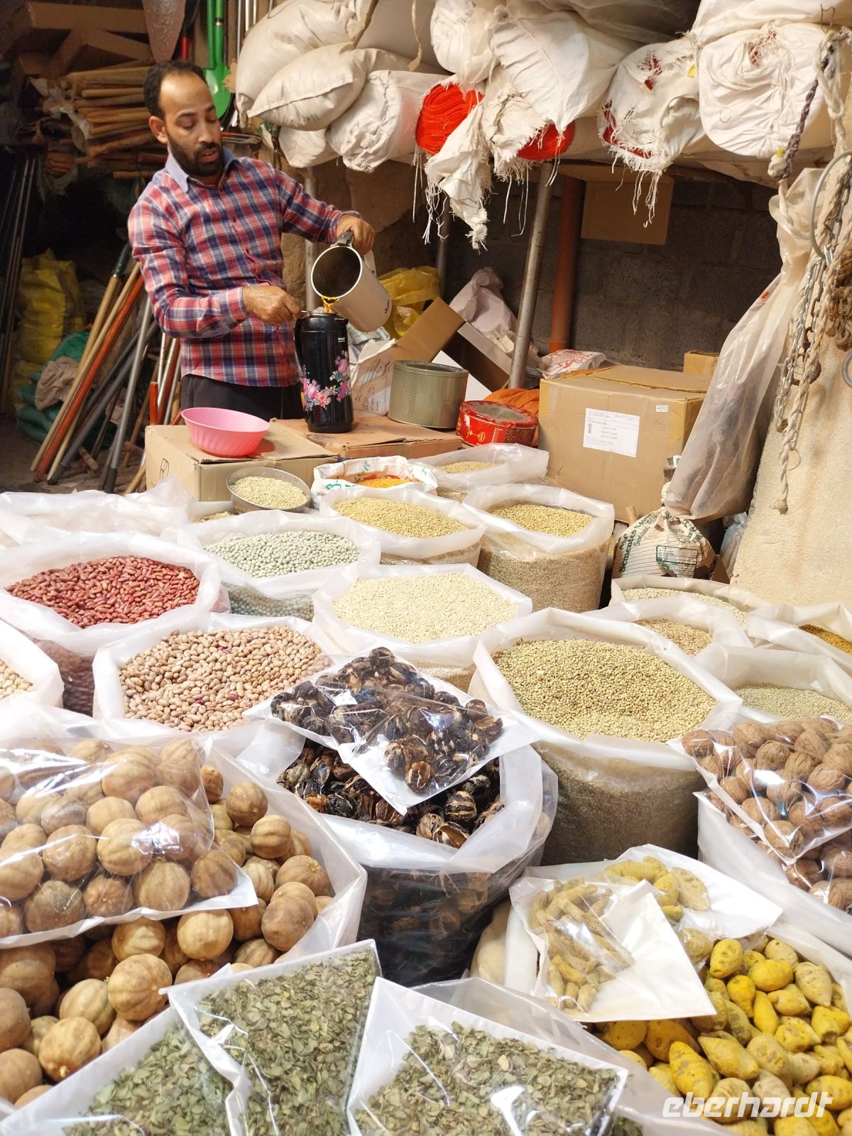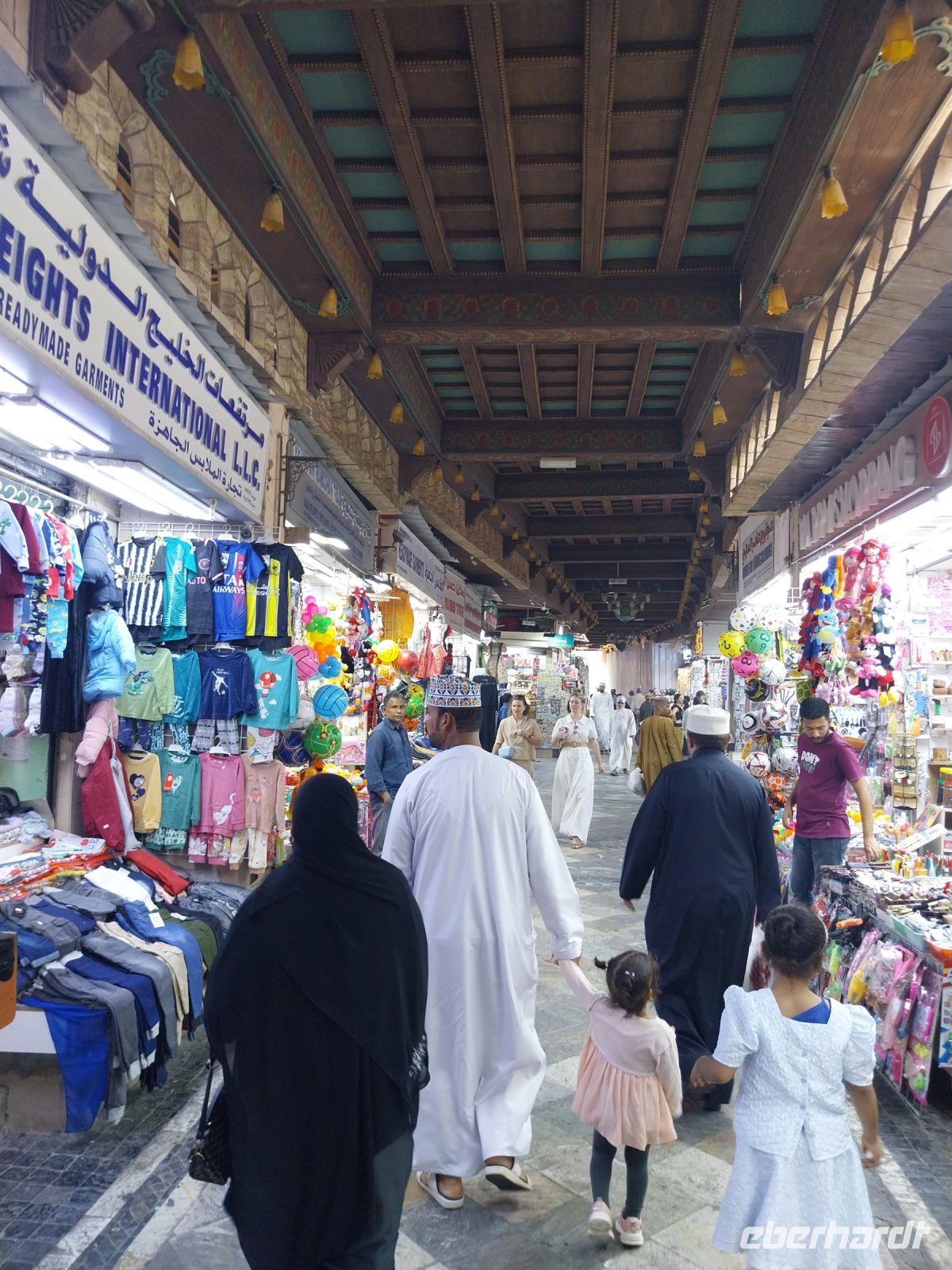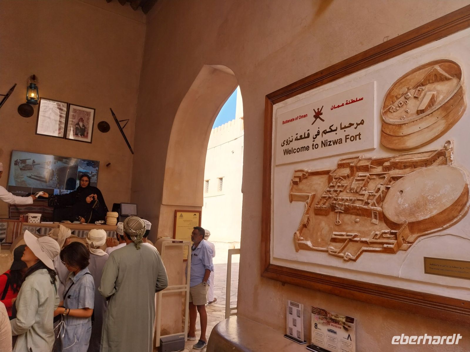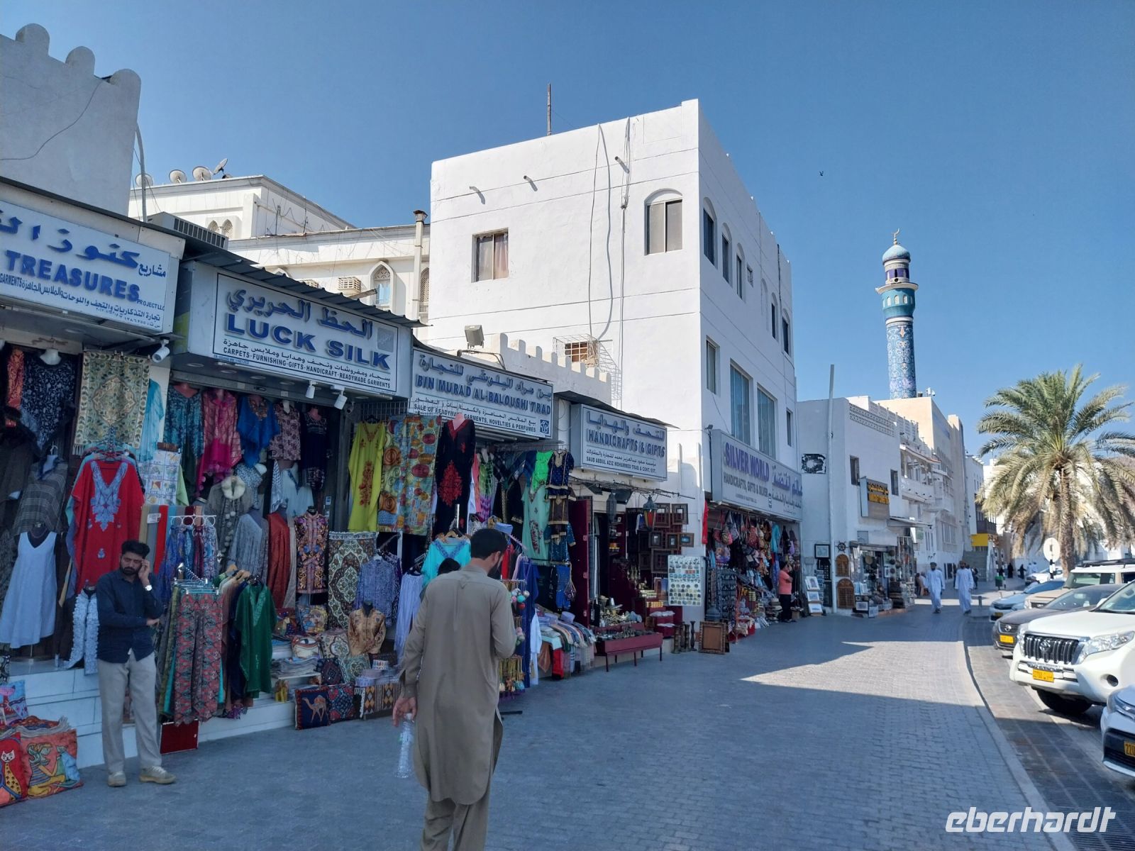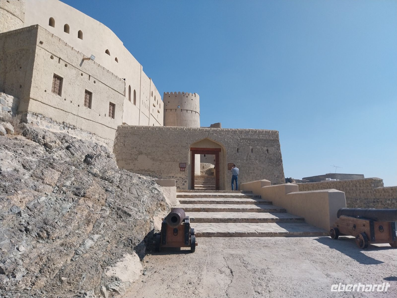 Wir beginnen heute mit dem Besuch der Altstadt von Nizwa. Es ist Freitag, das bedeutet es ist der wichtigste Markttag der Woche. Es ist eine Szenerie wie sie sich seit hunderten von Jahren abspielt – der Viehmarkt von Nizwa. Neben der Stadtmauer führen die Verkäufer ihre Ziegen, Schafe und Kühe im Kreis und feilschen dabei mit den Kaufinteressenten um den Preis. Nebenan, innerhalb der Stadtmauer, befinden sich in den gut besuchten Gassen viele Straßenstände mit Obst, Gemüse, Dattelhonig… Es folgen Geschäfte mit Töpferwaren und der East Souk, ein kleiner Gewürzmarkt in einer überdachten Gasse. In der mächtigen Festung von Nizwa begeben wir uns in den mächtigen Kanonenturm. Dieser bietet eine prächtige Aussicht auf Nizwa und auf die umliegenden Berge.