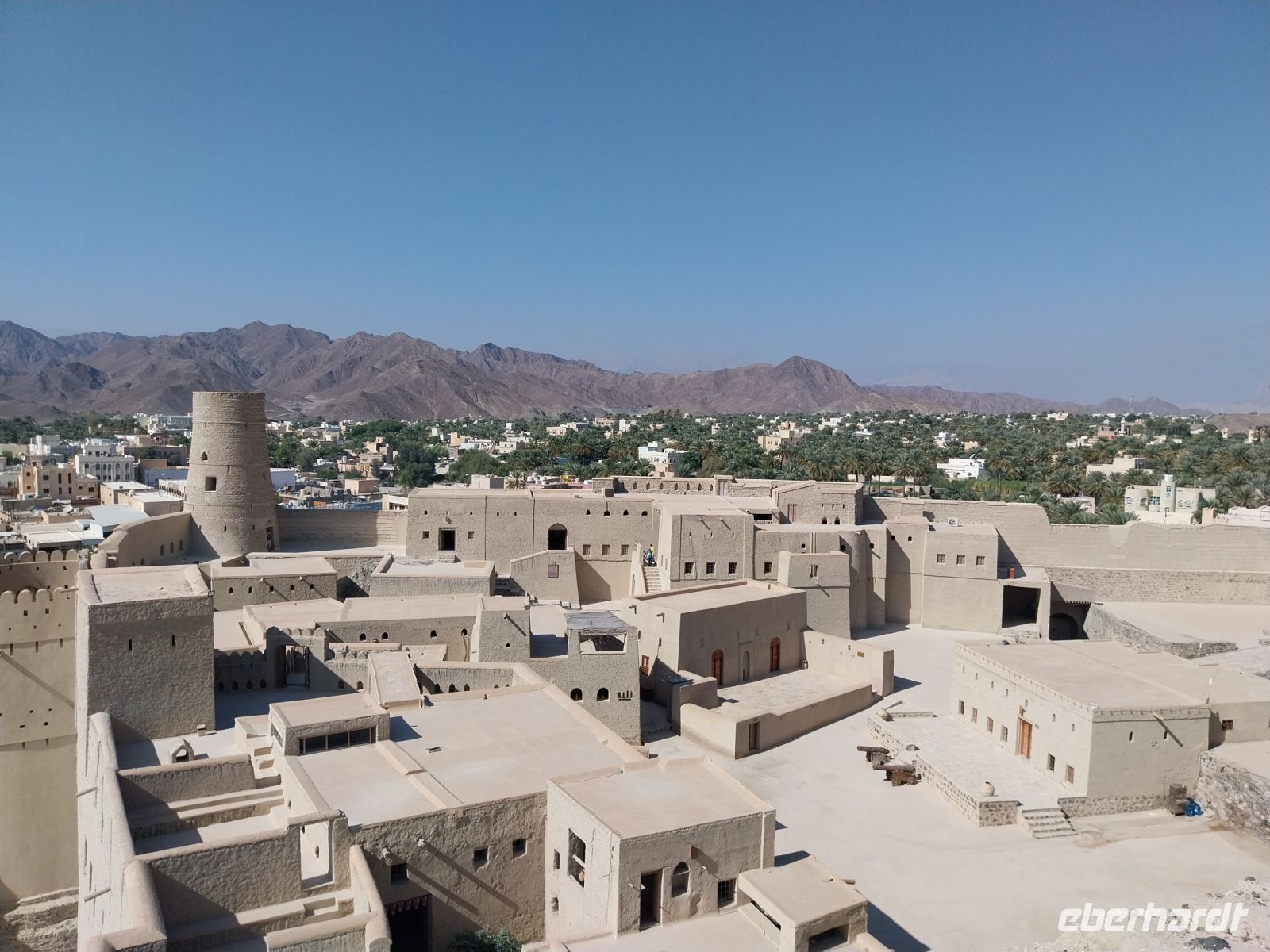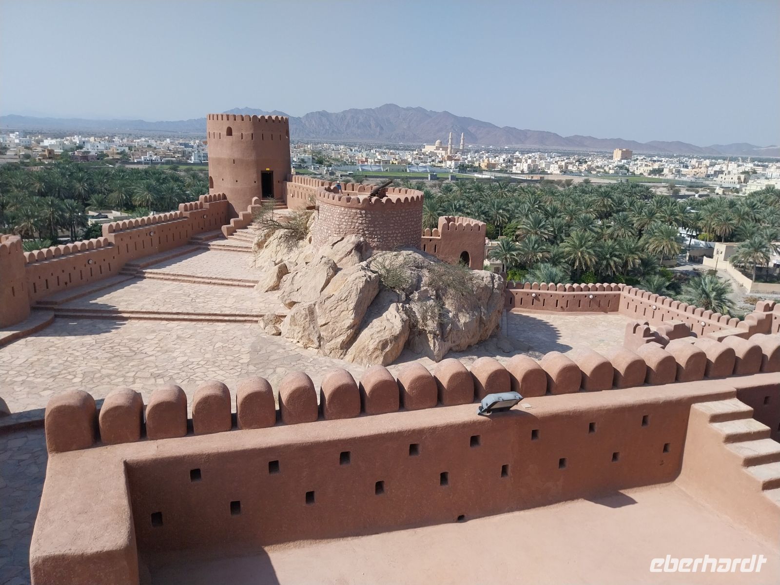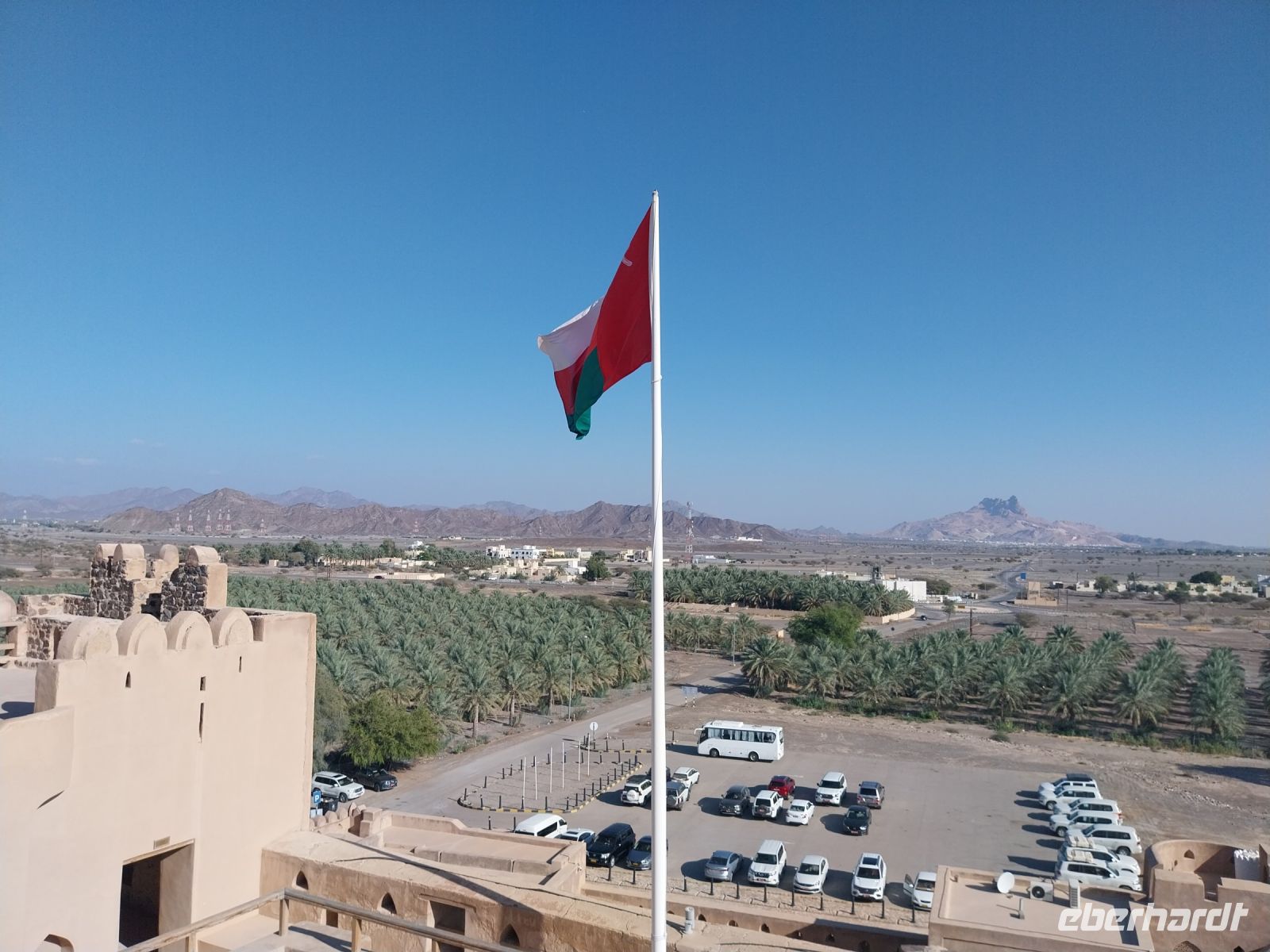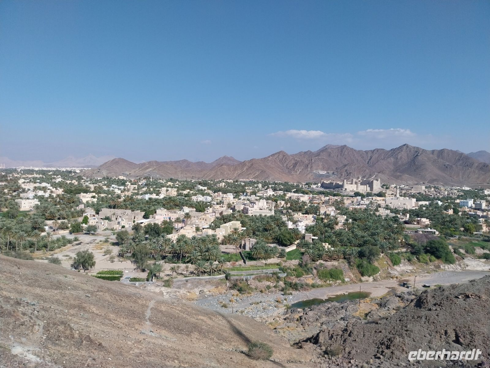 Es folgt die Besichtigung des Bahla-Forts am Rande der Oasenstadt Bahla. Die riesige Festung aus Lehm ist die größte im Land und steht seit 1987 als Musterbeispiel einer omanischen Verteidigungsanlage auf der UNESCO-Weltkulturerbeliste. Von der aufwendig restaurierten Anlage ergeben sich schöne Ausblicke auf die Oase und die umliegenden Berge. Einen dieser Berge nutzen wir anschließend als Aussichtspunkt, wo wir bei strahlendem Sonnenschein eine anders schöne Perspektive auf Festung und Oase genießen können.