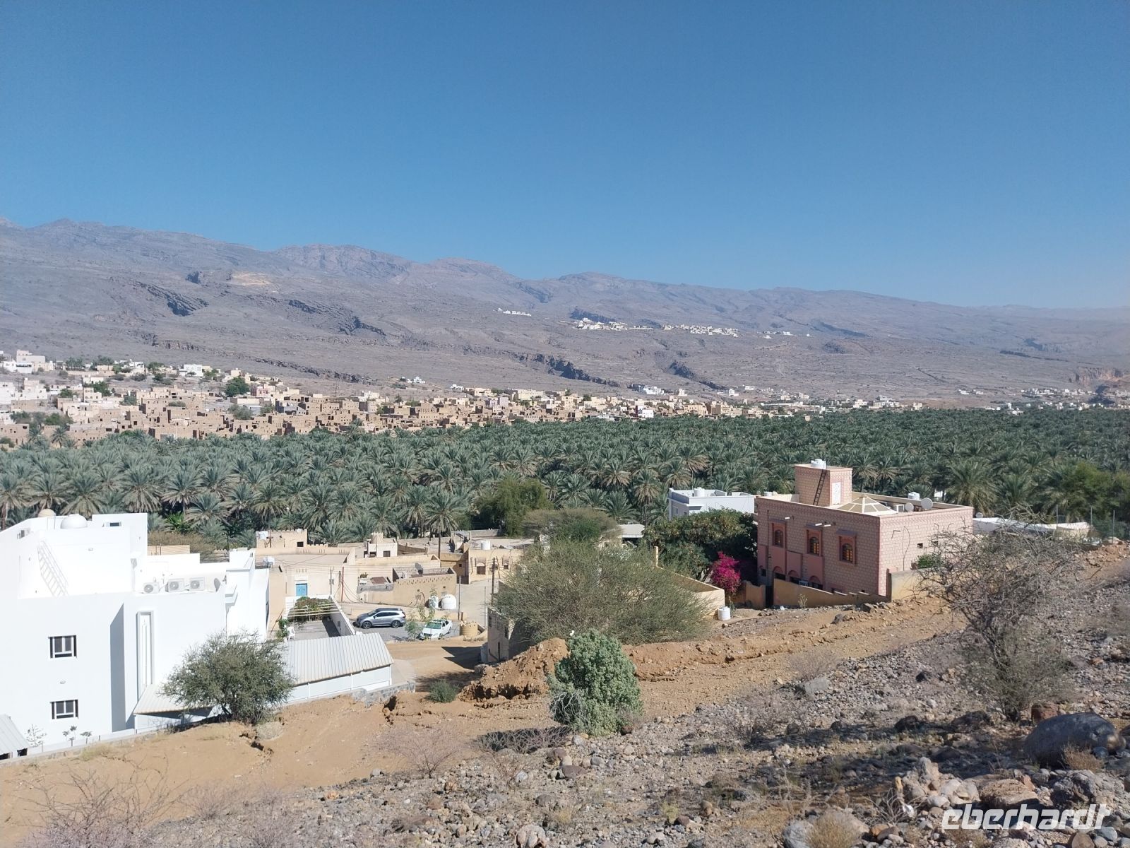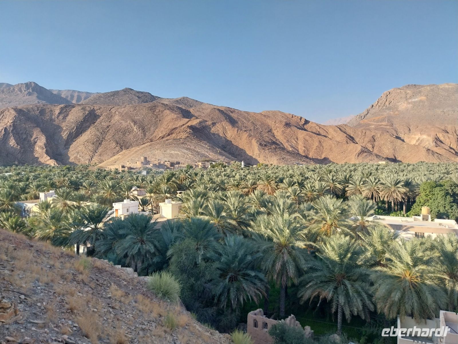 Zu guter Letzt besuchen wir heute noch die Oase Birkat al Mauz. Nach einem Fotostopp am Aussichtsberg folgt ein Spaziergang durch die grüne Oase, durch einen Wald von Dattelpalmen, vorbei an Lehmruinen und Wasserkanälen.