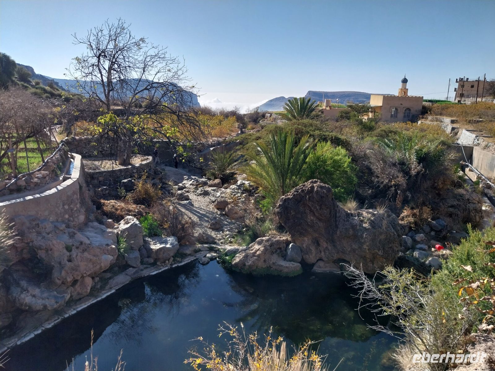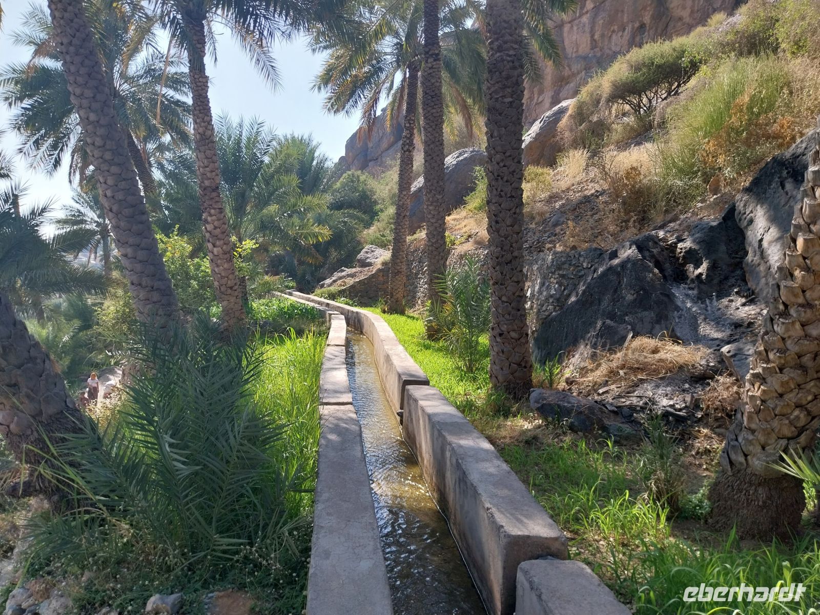 Während unserer kleinen Wanderung ergeben sich immer wieder tolle Perspektiven auf das Bergpanorama der „Grünen Berge“, arabisch „Jebel Al Akhdar“. Unterwegs entdecken wir hier im Hochgebirge im Stein eingeschlossene fossile Meerestiere. Wenn man so will, laufen wir praktisch auf gehobenem Meeresboden. Der letzte Abschnitt unserer Wanderung führt neben den Terrassenfeldern entlang auf einem schmalen Falaj (Wasserkanal). Das hatten wir ha gestern schon mal geübt.