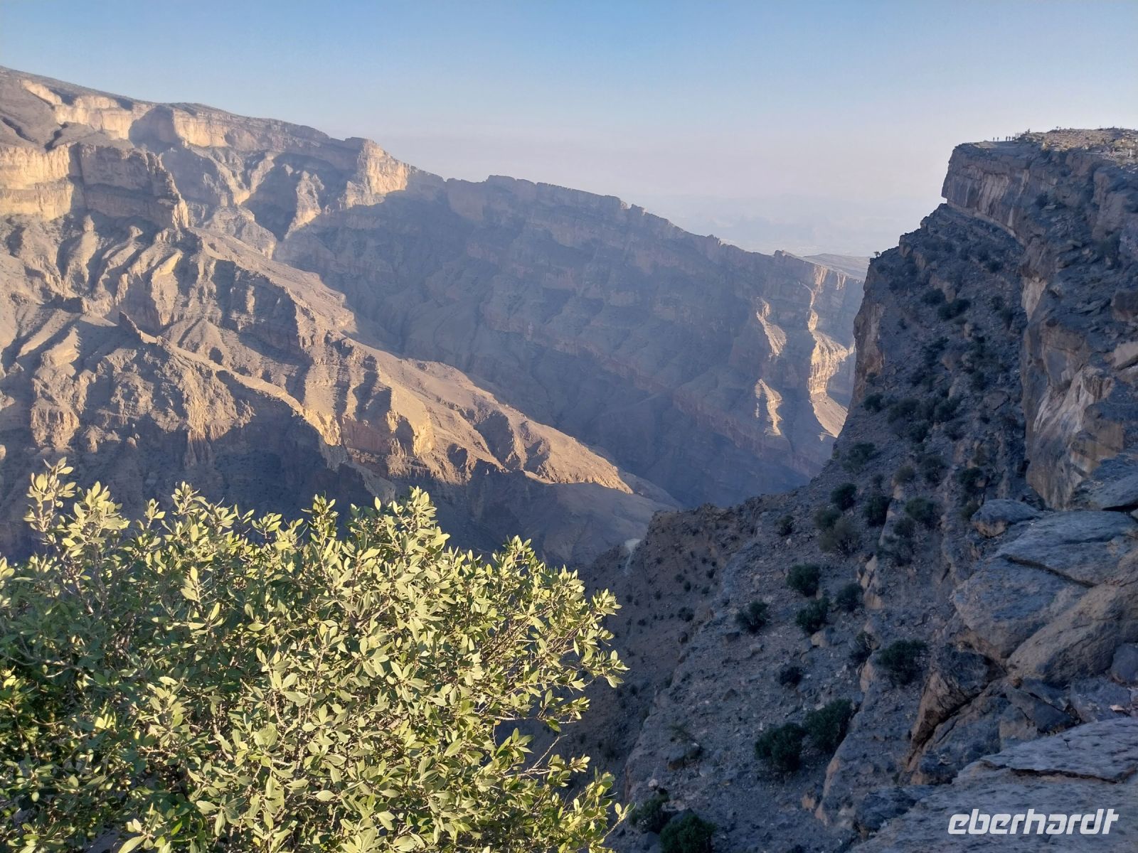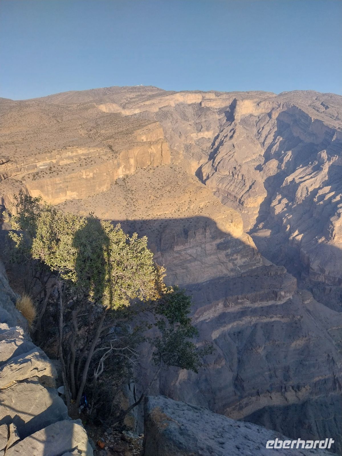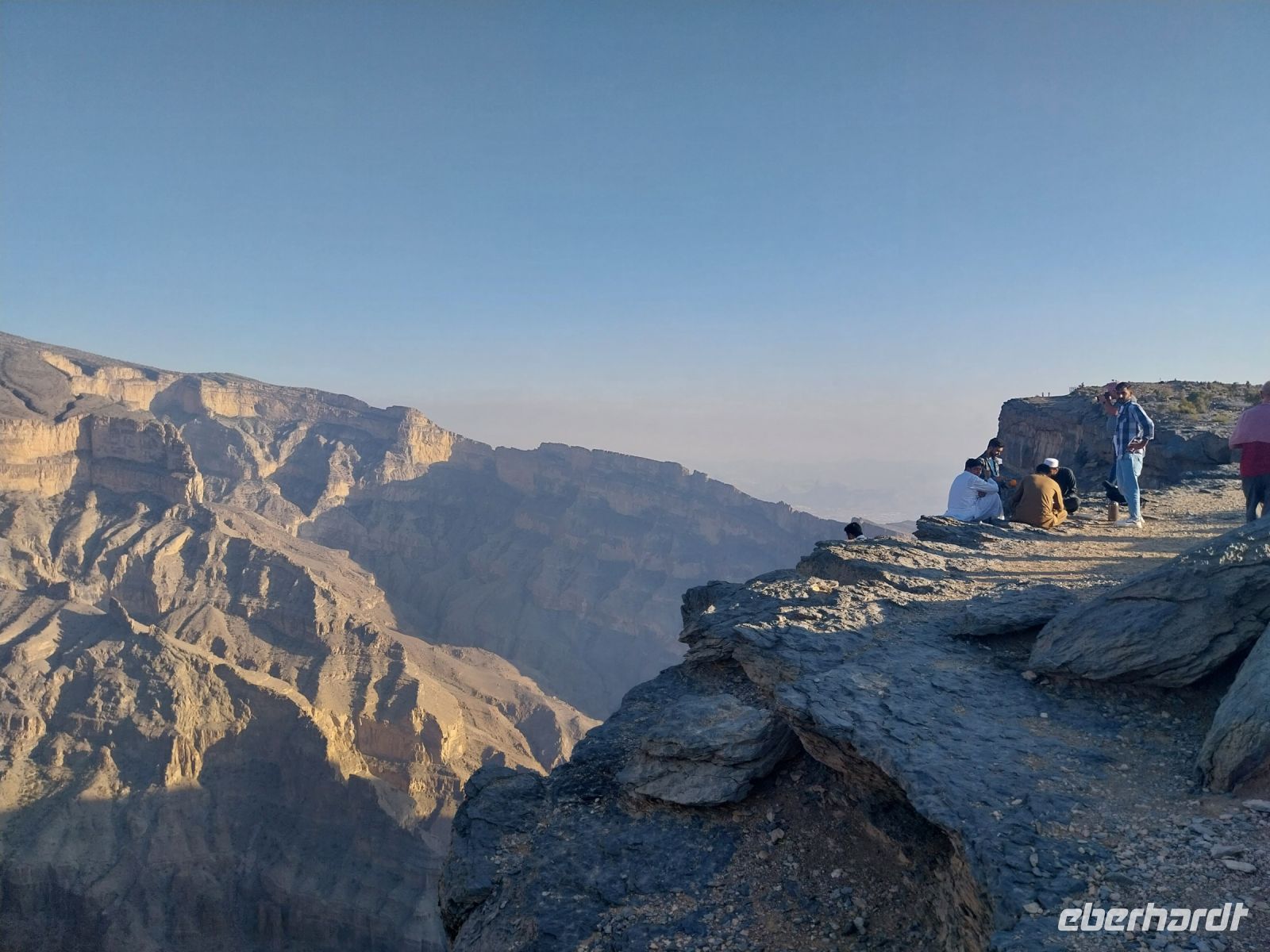 Anschließend haben wir noch eine ca. einstündige Fahrt tief hinein in die Bergwelt bis zum Grand Canyon von Oman. Auf einer Höhe von rund 2.000 Meter erreichen wir unser Ziel. Als wir aussteigen, haben wir mit 16 Grad etwa 10 Grad weniger als im Tal. Wir befinden uns an einem der weltgrößten Canyons, der hier fast 1.000 Meter senkrecht abfällt. Im Hintergrund befindet sich der höchste Berg des Oman, der 3009 Meter hohe Jebel Shams. Der Gipfel ist militärisches Sperrgebiet und deshalb nicht zugänglich.