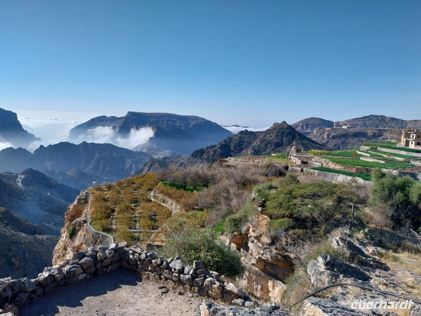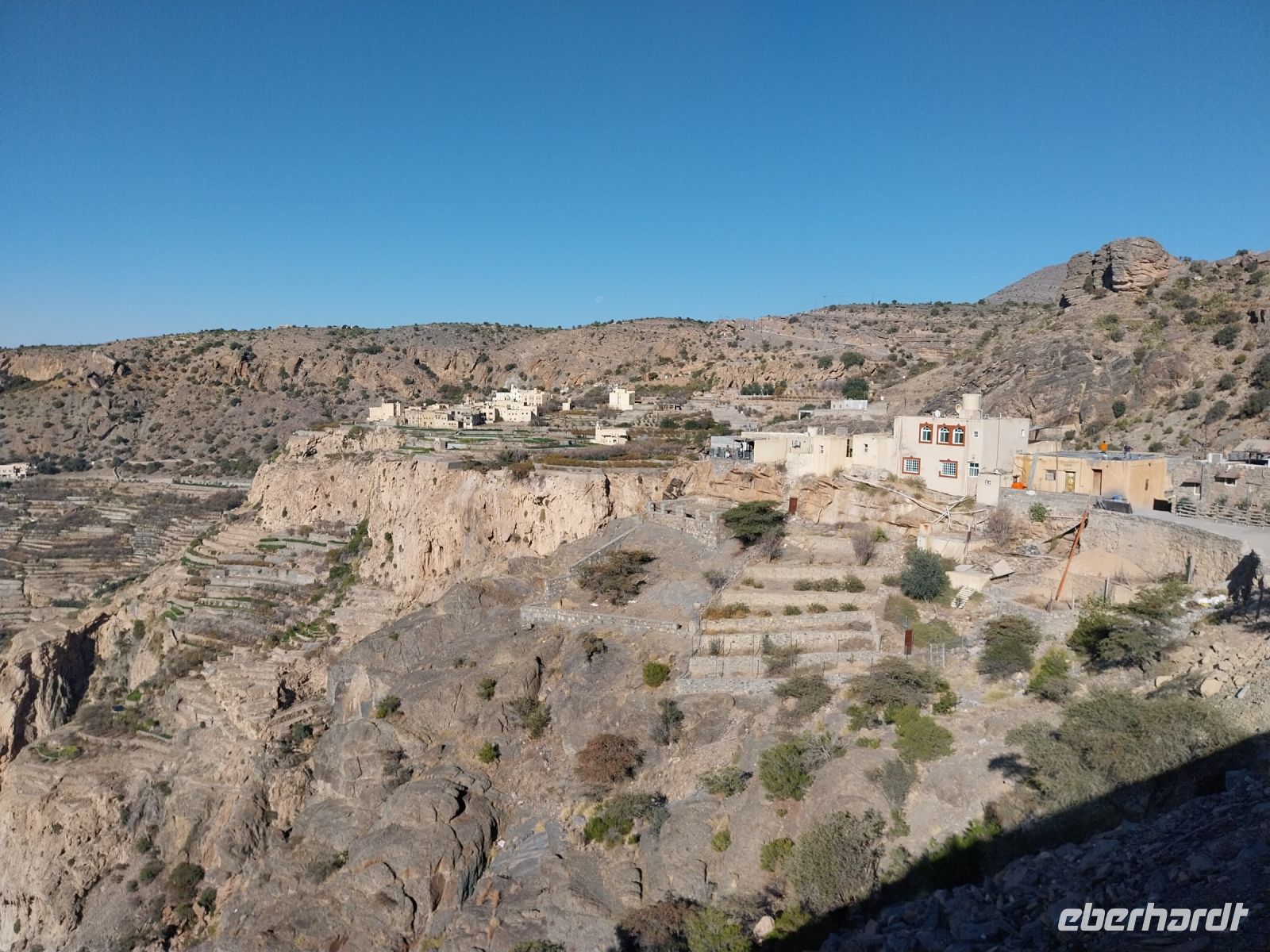 Am Morgen wollen wir eine Wanderung im Jebel Akhdar Gebirge unternehmen. Bei der Abfahrt schaue ich skeptisch zum Himmel, denn in den Bergen hängen dunkle Wolken. Doch während der Fahrt auf der sehr gut ausgebaute Serpentinenstraße lassen wir die Wolken unter uns. Oben auf dem Saiq Plateau in ca. 2.000 Meter Höhe strahlt die Sonne vom blauen Himmel. Wir halten an Dianas Viewpoint, wo unsere kleine Wanderung vom Dorf Al Ain nach Al Aqur beginnt. Lady Diana kam gern in den Oman und liebte diesen Platz in den Bergen. Auch dem Emir von Qatar gefällt es. Er hat hier einen Ferienpalast.